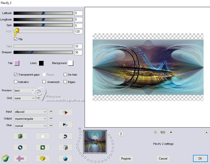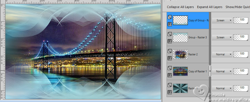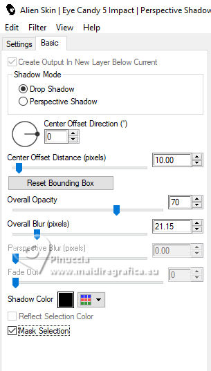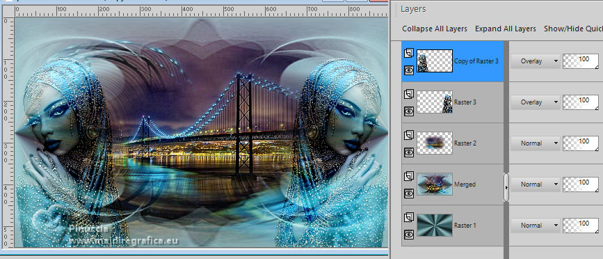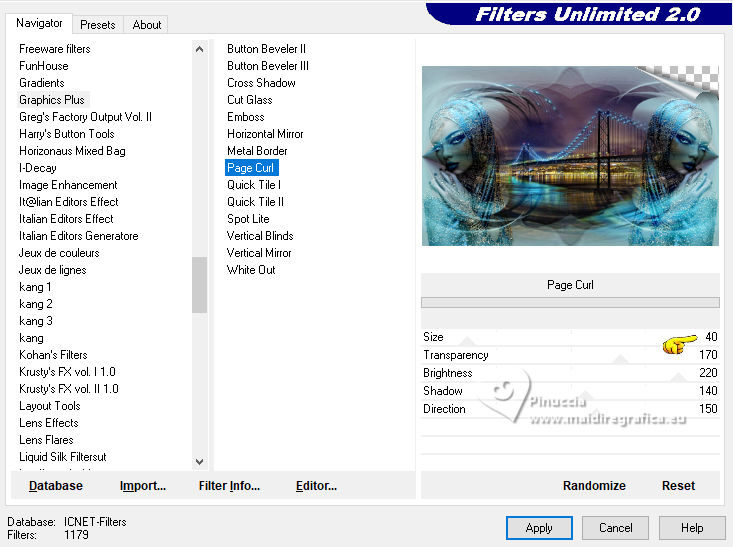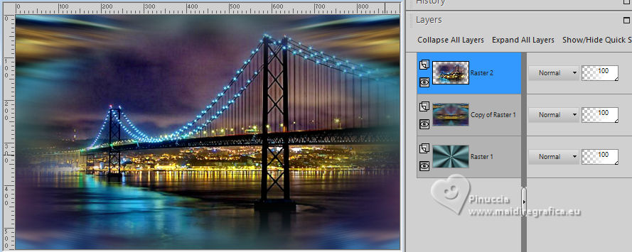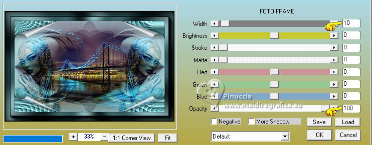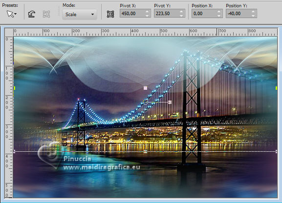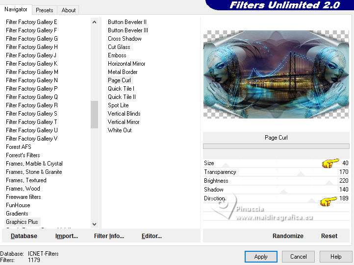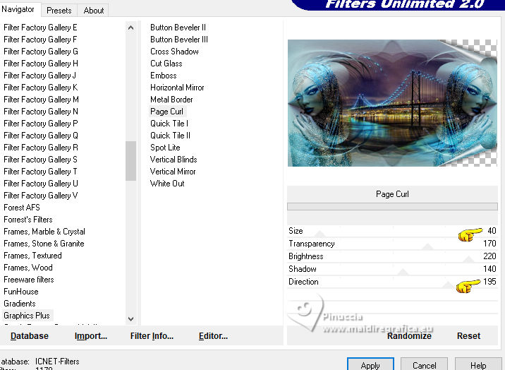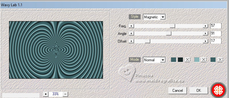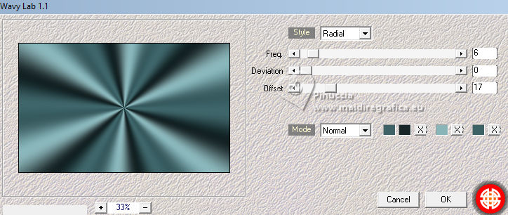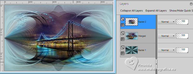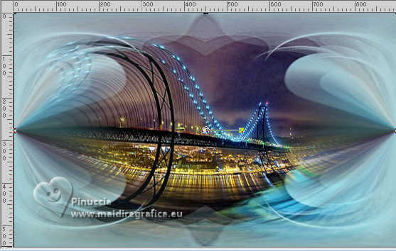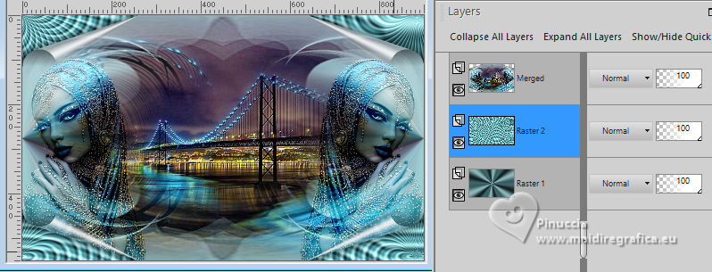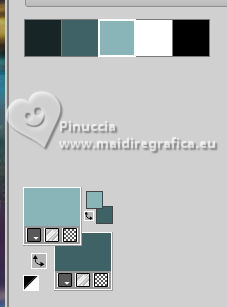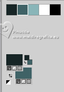 For this tutorial, you will need: ![]() Thanks for the tube and the mask Eugenia Clo and Narah. The rest of the material is by Lady Tess. (you find here the links to the material authors' sites) ![]() consult, if necessary, my filter section here Filters Unlimited 2.0 here &<Bkg Kaleidoscope> - Zandflower (to import in Unlimited) here Mehdi - Wavy Lab 1.1. here FM Tile Tools - Blend Emboss here Flaming Pear - Flexify 2 here Simple - Left Right Wrap here Graphics Plus - Page Curl here AAA Frames - Foto Frame here Alien Skin Eye Candy 5 Impact - Perspective Shadow here Filters Simple and Graphics Plus can be used alone or imported into Filters Unlimited. (How do, you see here) If a plugin supplied appears with this icon ![]() You can change Blend Modes according to your colors. ![]() Copy the selection in the Selections Folder. Colors ![]() 1. Set your foreground color to #182628, and your background color to #3c6266. ![]() color 3 #89b5b9 other colors: white and black 2. Open a new transparent image 900 x 550 pixels. Effects>Plugins>Mehdi - Wavy Lab 1.1 This filter creates gradients with the colors of your Materials palette. The first is your background color, the second is your foreground color. Change the last two colors created by the filter: the third color with #89b5b9 and the fourth with your background color #3c6266. ![]() Layers>Duplicate. Adjust>Blur>Gaussian Blur - radius 30. ![]() Layers>New Raster Layer. 3. Selections>Select All. Open MistedPaesaggio135_byClo ![]() Edit>Copy. Go back to your work and go to Edit>Paste into Selection. Selections>Select None. 4. Layers>Merge>Merge Down. Effects>Image Effects>Seamless Tiling, default settings. ![]() Adjust>Blur>Motion Blur. ![]() Edit>Repeat Motion Blur. 5. Effects>Reflection Effects>Rotating Mirror, default settings. ![]() Edit>Paste as new layer - the tube MistedPaesaggio134_byClo is still in memory. Image>Resize, to 80%, resize all layers not checked. 6. We have this ![]() 7. Effects>Plugins>FM Tile Tools - Blend Emboss, default settings ![]() Set your foreground color to color 3 #89b5b9 ![]() Layers>New Raster Layer. Flood Fill the layer with your foreground color #89b5b9.Layers>New Mask layer>From image Open the menu under the source window and you'll see all the files open. Select the mask Narah_mask_03333. ![]() Layers>Merge>Merge Group. Change the Blend Mode of this layer to Screen. Effects>Edge Effects>Enhance. 8. K key to activate your Pick Tool ![]() Position X: 0,00 - Position Y: -40,00. ![]() M key to deselect the Tool. Effects>Plugins>Simple - Left Right Wrap. Layers>Duplicate. Image>Mirror>Mirror Vertical (Image>Flip). We have this ![]() 9. Close the layer Raster 1. Layers>Merge>Merge visible. Effects>Plugins>Flaming Pear - Flexify 2. ![]() Open the layer Raster 1. K key to activate your Pick Tool ![]() Position X: 0,00 - Position Y: -4,00. ![]() Mode Scale ![]() pull the central node down until the border ![]() 10. The tube mistedPaesaggio135_byClo is still in memory: Edit>Paste as new layer. Image>Resize, to 50%, resize all layers not checked. Effects>Plugins>FM Tile Tools - Blend Emboss, default settings. 11. We have this ![]() 12. Open Woman2964_byClo ![]() Edit>Copy. Go back to your work and go to Edit>Paste as new layer. Image>Resize, to 50%, resize all layers not checked. Adjust>Sharpness>Sharpen More. Objects>Align>Right. Objects>Align>Bottom. 13. Change the Blend Mode of this layer to Overlay. Layers>Duplicate. Image>Mirror>Mirror Horizontal. 14. We have this ![]() 15. Close the layer Raster 1. Activate the layer above. Layers>Merge>Merge visible. Effects>Plugins>Filters Unlimited 2.0 - Graphics Plus - Page Curl. ![]() 16. Again: Effects>Plugins>Filters Unlimited 2.0 - Graphics Plus - Page Curl. ![]() Again: Effects>Plugins>Filters Unlimited 2.0 - Graphics Plus - Page Curl. ![]() 17. Again: Effects>Plugins>Filters Unlimited 2.0 - Graphics Plus - Page Curl. ![]() Open and activate the layer Raster 1. Layers>New Raster Layer. 18. Before the next filter, set again your foreground color to #182628. ![]() Effects>Plugins>Mehdi - Wavy Lab 1.1. ![]() Effects>Plugins>Filters Unlimited 2.0 - &<Bkg Kaleidoscope> - Zandflower, default settings ![]() 19. We have this ![]() 20. Activate the layer Raster 1. Edit>Copy. Edit>Paste as new image. Minimize this image for the moment. Go back to your work. Image>Add Borders, 1 pixel, symmetric, color #000000. Selections>Select All. Image>Add Borders, 55 pixels, symmetric, color #ffffff. Selections>Invert. 21. Edit>Paste into Selection - the image of step 20 is in memory. Effects>Plugins>AAA Frames - Foto Frame. ![]() Again Effects>Plugins>AAA Frames - Foto Frame. ![]() Selections>Select None. 22. Open Man34_byClo ![]() Edit>Copy. Go back to your work and go to Edit>Paste as new layer. Image>Resize, to 80%, resize all layers not checked. K key to activate your Pick Tool ![]() Position X: 184,00 - Position Y: -3,00. ![]() M key to deselect the Tool. 23. Effects>Plugins>Alien Skin Eye Candy 5 Impact - Perspective Shadow preset Drop Shadow Lowest, with these settings ![]() Open LTDStudio_Alain_Texto ![]() Edit>Copy. Go back to your work and go to Edit>Paste as new layer. Move the tube to your liking.24. Sign your work on a new layer. Add the watermarks of the author and of the translator. Layers>Merge>Merge All and save as jpg. Version with my tubes; for the man's tube thanks Lady Valella. ![]() ![]() Your versions. Thanks![]() If you have problems or doubts, or you find a not worked link, or only for tell me that you enjoyed this tutorial, write to me. 7 October 2025 |