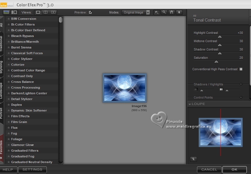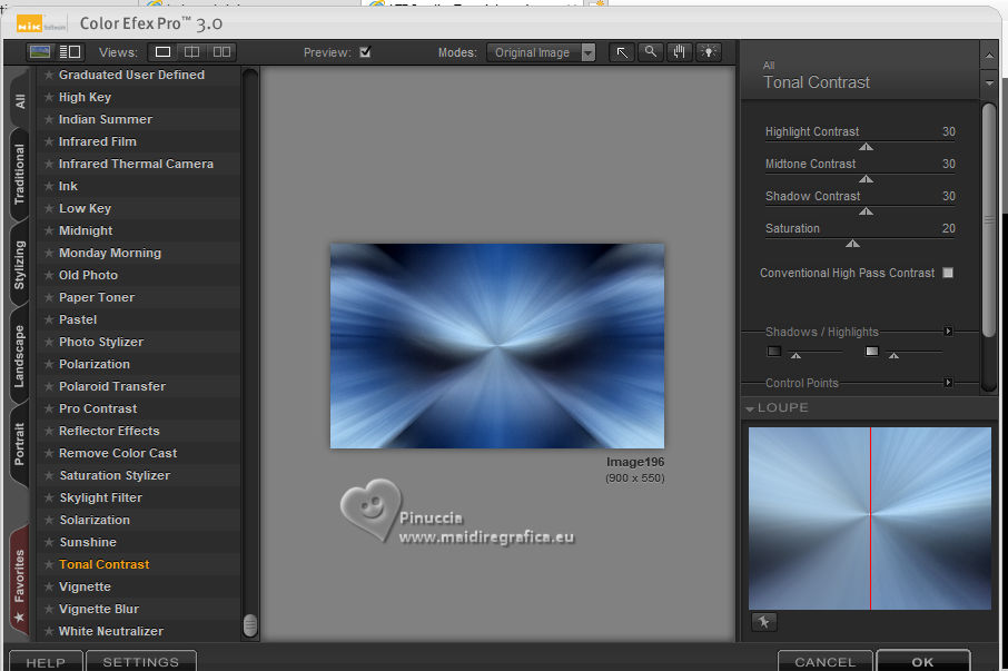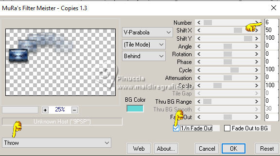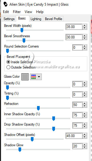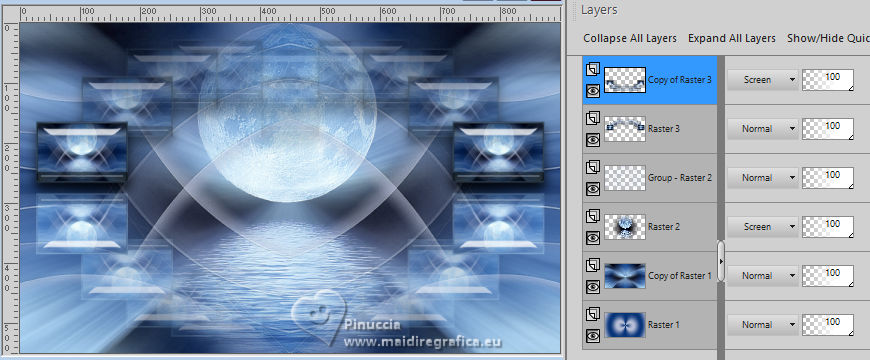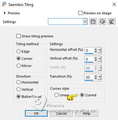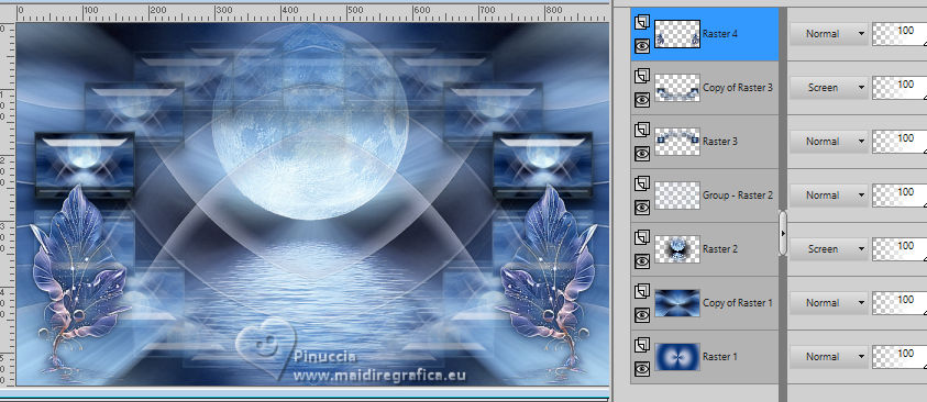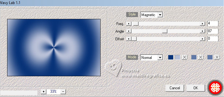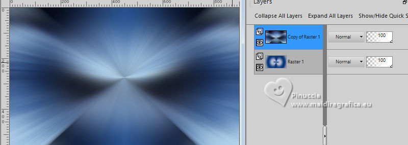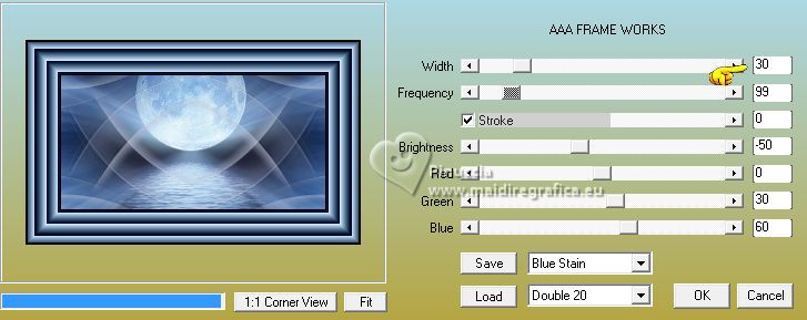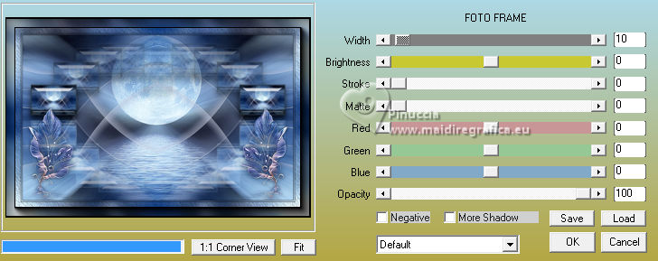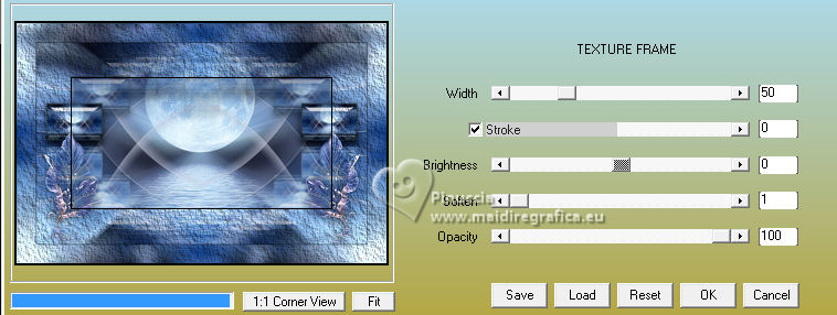 For this tutorial, you will need: ![]() Thanks for the tubes and the mask Drevers, Silvie and Narah. The rest of the material is by Lady Tess. (you find here the links to the material authors' sites) ![]() consult, if necessary, my filter section here Mehdi - Wavy Lab 1.1. here Nik Software - Color Efex Pro here Mura's Meister - Copies here AAA Frames - Frame Works - Foto Frame here Alien Skin Eye Candy 5 Impact - Glass here ![]() You can change Blend Modes according to your colors. ![]() Copy the selections in the Selections Folder. Open the mask in PSP and minimize it with the rest of the material. Colors ![]() 1. Set your foreground color to #b8c0d7 and your background color to #083378. ![]() color 3 #6079a7 color 4 #041a3e other colors: white #ffffff and black #000000 2. Open a new transparent image 900 x 550 pixels. Effects>Plugins>Mehdi - Wavy Lab 1.1 This filter creates gradients with the colors of your Materials palette. The first is your background color, the second is your foreground color. Change the last two colors both with color 3 #6079a7. ![]() Layers>Duplicate. Adjust>Blur>Gaussian Blur - radius 35. ![]() Layers>New Raster Layer. 3. Selections>Select All. Open Misted_moon ![]() Edit>Copy. Go back to your work and go to Edit>Paste into Selection. Selections>Select None. Effects>Image Effects>Seamless Tiling, default settings. ![]() Layers>Merge>Merge Down. Adjust>Blur>Radial Blur. ![]() 4. We have this ![]() 5. Effects>Plugins>Nik Software - Color Efex Pro - Tonal Contrast ![]() Layers>New Raster Layer. Flood Fill the layer with your foreground color #b8c0d7.Layers>New Mask layer>From image Open the menu under the source window and you'll see all the files open. Select the mask NarahsMasks_1645. ![]() Layers>Merge>Merge Group. 6. Effects>Image Effects>Seamless Tiling. ![]() Effects>Edge Effects>Enhance. Layers>Duplicate. Image>Mirror>Mirror Vertical (Image>Flip). Layers>Merge>Merge Down. Effects>Reflection Effects>Rotating Mirror, default settings. ![]() 7. Activate the layer below, Copy of Raster 1. Edit>Paste as new layer - the tube Misted_moon is still in memory. Image>Resize, to 95%, resize all layers not checked. Change the Blend Mode of this layer to Screen. 8. Adjust>Sharpness>Sharpen More. Edit>Copy Special>Copy Merged. Edit>Paste as new image - and stay on this image. Effects>Plugins>AAA Frames - Frame Works ![]() Edit>Copy 9. Go back to your work. Activate your top layer. Layers>New Raster Layer Selections>Load/Save Selection>Load Selection from Disk. Look for and load the selection Brigitte_sel_1 ![]() 10. Edit>Paste into Selection - the image in memory of step 8. Effects>Plugins>Nik Software - Color Efex Pro - Tonal Contrast ![]() 11. Effects>Plugins>Alien Skin Eye Candy 5 Impact - Glass. Preset Clear with these settings. ![]() Selections>Select None. Layers>New Raster Layer. Selections>Load/Save Selection>Load Selection from Disk. Look for and load the selection Brigitte_sel_2 ![]() Flood Fill with your background color #083378.Effects>Plugins>Alien Skin Eye Candy 5 Impact - Glass - Clear, last settings. Selections>Select None. 12. Layers>Merge>Merge Down. Effects>Plugins>Mura's Meister - Copies. ![]() Effects>Reflection Effects>Rotating Mirror ![]() Layers>Duplicate. Image>Mirror>Mirror Vertical (Image>Flip). Change the Blend Mode of this layer to Screen. 13. We have this ![]() 14. Open Blue_Transparent_Flowers52X_Silvie_27.01.2025 ![]() Edit>Copy. Go back to your work and go to Edit>Paste as new layer. Image>Resize, 1 time to 50% and 1 time to 70%, resize all layers not checked. Objects>Align>Left. Objects>Align>Bottom. 15. Effects>3D Effects>Drop shadow, color #041a3e. ![]() Effects>Plugins>Nik Software - Color Efex Pro - Tonal Contrast, last settings. ![]() Effects>Reflection Effects>Rotating Mirror ![]() Adjust>Sharpness>Sharpen More. 16. We have this. ![]() 17. Activate the layer Raster 1. Edit>Copy Edit>Paste as new image - and minimize this image. Go back to your work. Image>Add Borders, 1 pixel, symmetric, color #000000. Selections>Select All. 18. Image>Add Borders, 55 pixels, symmetric, color #ffffff. Selections>Invert. Edit>Paste into Selection - the image in memory of step 17. 19. Again Selections>Invert. Effects>Image Effects>Seamless Tiling, default settings. ![]() Selections>Invert. Adjust>Blur>Gaussian Blur - radius 15. ![]() 20. Effects>Plugins>AAA Frames - Texture Frame. ![]() Effects>Plugins>AAA Frames - Foto Frame. ![]() Selections>Select None. 21. Open Drevers_misted_woman_245 ![]() Edit>Copy Go back to your work and go to Edit>Paste as new layer. K key to activate your Pick Tool ![]() Position X: 1534,00 - Position Y: 31,00. ![]() M key to deselect the Tool. Adjust>Sharpness>Sharpen More. Layers>Duplicate. Activate the layer below of the original. 22. Effects>Distortion Effects>Twirl. ![]() Change the Blend Mode of this layer to Luminance (L) and reduce the opacity to 44%. Activate your top layer. Open LTDStudio_Brigitte_Texto ![]() Edit>Copy. Go back to your work and go to Edit>Paste as new layer. Move the tube to your liking.23. Sign your work on a new layer. Add the watermarks of the author and of the translator. Layers>Merge>Merge All. 24. Save as jpg. Version with my tubes from images by Pinterest; for the flower tube thanks Silvie. ![]() ![]() Your versions. Thanks![]() If you have problems or doubts, or you find a not worked link, or only for tell me that you enjoyed this tutorial, write to me. |