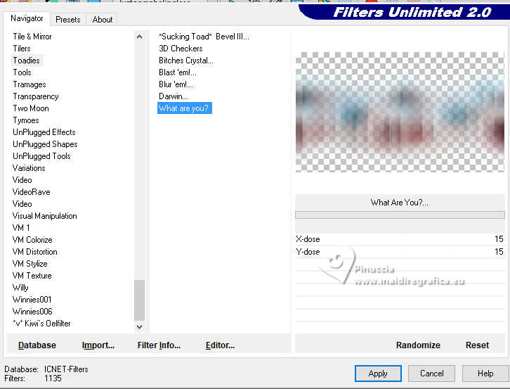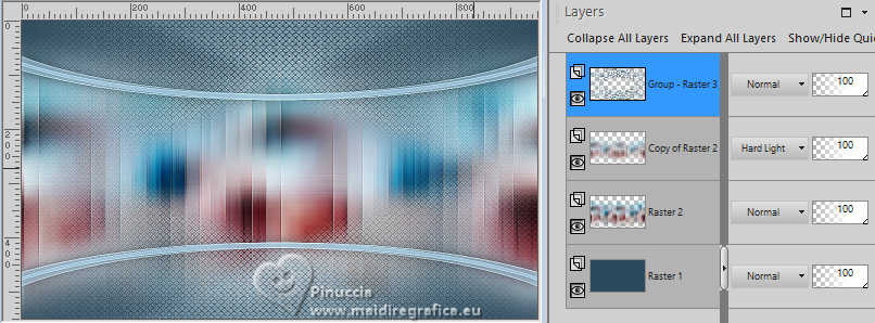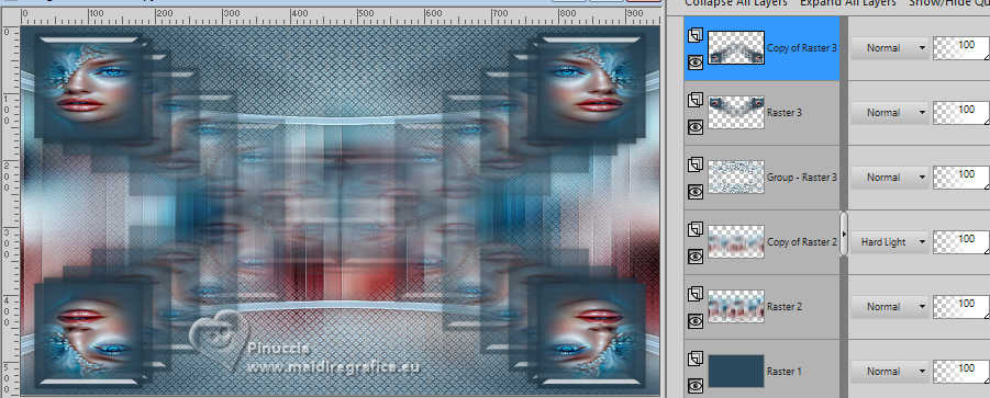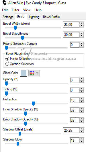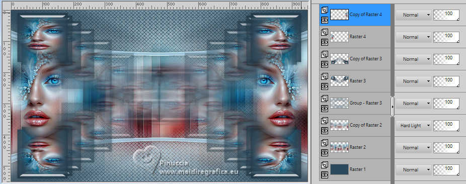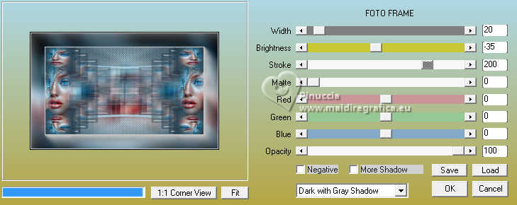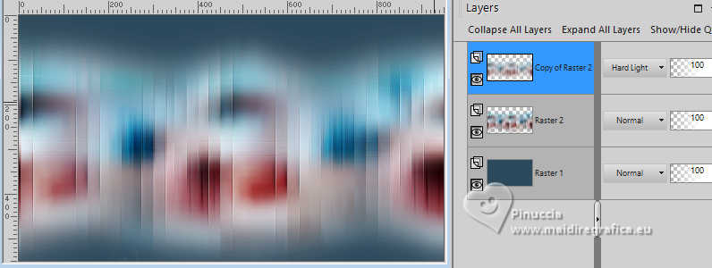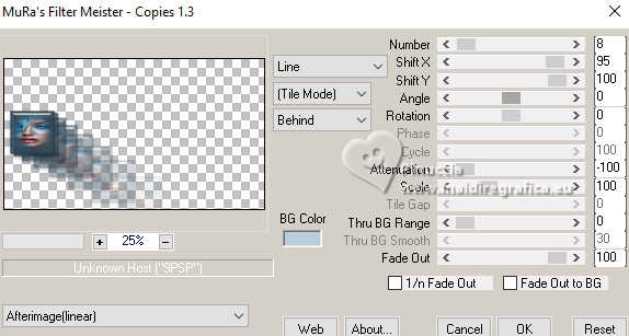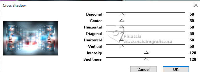 For this tutorial, you will need: ![]() Thanks for the tubes and the mask Clo and Narah. The rest of the material is by Lady Tess. (you find here the links to the material authors' sites) ![]() consult, if necessary, my filter section here Filters Unlimited 2.0 here Mehdi - Sorting Tiles here Toadies - What are you here Graphics Plus - Cross Shadow here FM Tile Tools - Saturation Emboss here Alien Skin Eye Candy 5 Impact - Glass here Mura's Meister - Copies here AAA Frames - Foto Frame here Filters Toadies and Graphics Plus can be used alone or imported into Filters Unlimited. (How do, you see here) If a plugin supplied appears with this icon ![]() You can change Blend Modes according to your colors. ![]() Copy the selection in the Selections Folder. Open the masks in PSP and minimize them with the rest of the material. Colors ![]() 1. Set your foreground color to #2e4a5c, and your background color to #b8cedc. ![]() color 3: #111a21 color 4: #ffffff color 5: #000000 2. Open a new transparent image 950 x 550 pixels. Flood Fill the transparent image with your foreground color #2e4a5c.Selections>Select All. Layers>New Raster Layer. 3. Open Misted_Woman2048_byClo ![]() Edit>Copy. Go back to your work and go to Edit>Paste into Selection. Selections>Select None. 4. Effects>Plugins>Mehdi - Sorting Tiles. ![]() Effects>Edge Effects>Enhance. Effects>Image Effects>Seamless Tiling, side by side. ![]() 5. Adjust>Blur>Motion Blur. ![]() Layers>Duplicate. Effects>Plugins>Filters Unlimited 2.0 - Toadies - What are you ![]() Change the Blend Mode of this layer to Hard Light. Effects>Edge Effects>Enhance. 6. We have this ![]() 7. Layers>New Raster Layer. Flood Fill with your background color #b8cedc.Layers>New Mask layer>From image Open the menu under the source window and you'll see all the files open. Select the mask NarahsMask_1790 ![]() Effects>Edge Effects>Enhance. Layers>Merge>Merge Group. 9. Effects>Plugins>FM Tile Tools - Saturation Emboss, default settings. ![]() Layers>Duplicate. Image>Mirror>Mirror horizontal. 10. Layers>Merge>Merge Down. Effects>3D Effects>Drop Shadow, color #111a21. ![]() Adjust>Sharpness>Sharpen More. 11. We have this ![]() 12. Layers>New Raster Layer. Selections>Load/Save Selection>Load Selection from Disk. Look for and load the selection Extasy_sel_1 ![]() Reduce the opacity of your Flood Fill Tool to 60%. Flood Fill the selection with your foreground color #2e4a5c.Layers>New Raster Layer. 13. The tube Misted_Woman2048_byClo is still in memory: Edit>Paste into Selection. Adjust>Sharpness>Sharpen More. Layers>Merge>Merge Down. Layers>Duplicate. Layers>Merge>Merge Down. Effects>Plugins>Alien Skin Eye Candy 5 Impact - Glass Select the preset Clear with these settings: Glass Color: your background color ![]() Selections>Select None. 14. Effects>Plugins>Mura's Meister - Copies. ![]() Objects>Align>Top. Layers>Duplicate. Image>Mirror>Mirror Horizontal Layers>Merge>Merge Down. Layers>Duplicate. Image>Mirror>Mirror Vertical (Image>Flip). 15. We have this ![]() 16. The tube Misted_Woman2048_byClo is always in memory: Edit>Paste as new layer. Image>Resize, to 50%, resize all layers not checked. Objects>Align>Left. Adjust>Sharpness>Sharpen More. Layers>Duplicate. Image>Mirror>Mirror Horizontal. Objects>Align>Right. 17. We have this ![]() 18. Image>Add borders, 1 pixel, symmetric, color #000000. Selections>Select All. Edit>Copy Edit>Paste as new image, and minimize it. Go back to your work. Image>Add Borders, 55 pixels, symmetric, color #ffffff. Selections>Invert. 19. Edit>Paste into Selection - the image of step 18. Adjust>Blur>Gaussian Blur - radius 30. ![]() Effects>Plugins>Graphics Plus - Cross Shadow, default settings. ![]() Effects>Plugins>AAA Frames - Foto Frame. ![]() Effects>Reflections Effects>Rotating Mirror. ![]() Selections>Select None. 20. Layers>New Raster Layer. Opacity of your Flood Fill Tool to 80%. Flood Fill the layers with your background color #b8cedc.Layers>New Mask layer>From image Open the menu under the source window and select the mask NarahsMask_1814 ![]() Layers>Duplicate. Layers>Merge>Merge Group. Effects>Edge Effects>Enhance. Change the Blend Mode of this layer to Overlay. Layers>Duplicate. Image>Mirror>Mirror horizontal. 21. Open MistedWoman1292_byClo ![]() Edit>Copy. Go back to your work and go to Edit>Paste as new layer. Image>Resize, to 80%, resize all layers not checked. Adjust>Sharpness>Sharpen More. 22. Open LTDStudio_Extasy_Texto ![]() Edit>Copy. Go back to your work and go to Edit>Paste as new layer. Objects>Align>Top and move the tube slightly down (see the final tag).Objects>Align>Horizontal Center. 23. Sign your work on a new layer. Add the author and the translator's watermarks. Layers>Merge>Merge All and save as jpg. The tubes of this version are mine. ![]() ![]() Your versions. Thanks![]() Irene ![]() Kika ![]() If you have problems or doubts, or you find a not worked link, or only for tell me that you enjoyed this tutorial, write to me. |