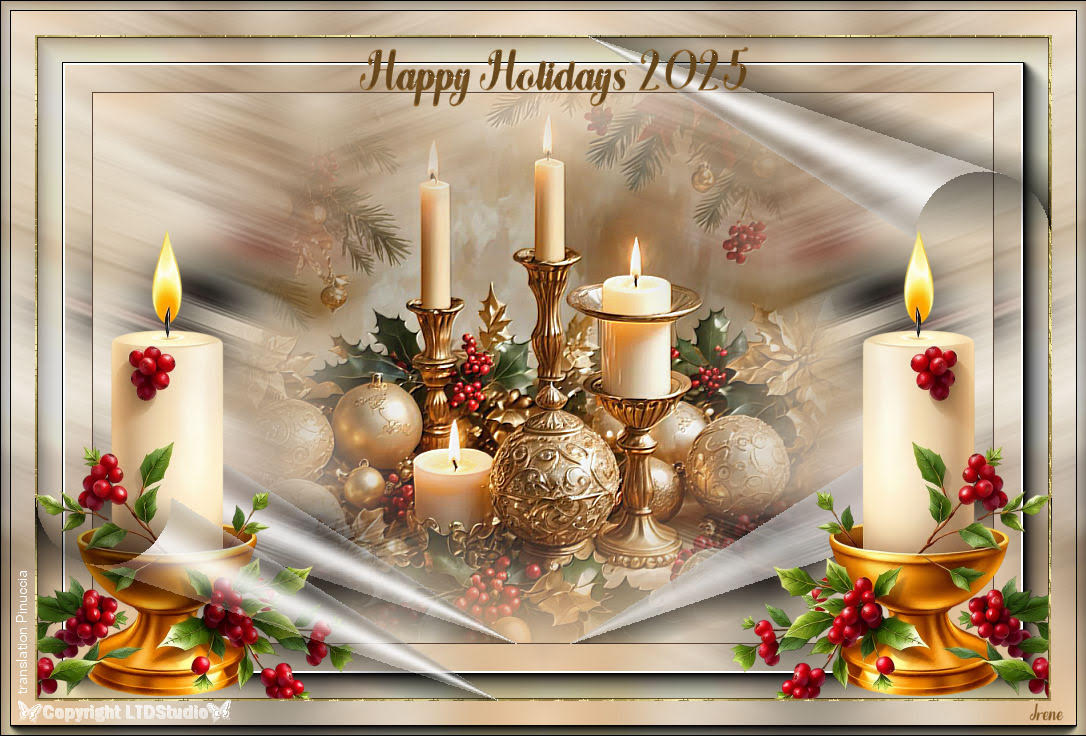 ![]() For this tutorial, you will need: ![]() Thanks for the tubes Clo and ElFairy. The rest of the material is by Lady Tess. (you find here the links to the material authors' sites) ![]() ![]() consult, if necessary, my filter section here Filters Unlimited 2.0 here Mehdi - Wavy Lab 1.1. here Toadies - What are you here Graphics Plus - Page Curl here AAA Frames - Foto Frame here FM Tile Tools - Blend Emboss here Filters Toadies and Graphics Plus can be used alone or imported into Filters Unlimited. (How do, you see here) If a plugin supplied appears with this icon ![]() You can change Blend Modes according to your colors. ![]() 1. Set your foreground color to #eceee3 and your background color to #566166. ![]() color 3 #8c999e other colors: white #ffffff and black #000000 2. Open a new transparent image 900 x 550 pixels. Effects>Plugins>Mehdi - Wavy Lab 1.1 This filter creates gradients with the colors of your Materials palette. The first is your background color, the second is your foreground color. Change the last two colors created by the filter both with the color 3 #8c999e ![]() Layers>Duplicate. Adjust>Blur>Gaussian Blur - radius 35. ![]() Layers>New Raster Layer. Selections>Select All. 3. Open element_EF(54) ![]() Edit>Copy. Go back to your work and go to Edit>Paste into Selection. Selections>Select None. Effects>Image Effects>Seamless Tiling. ![]() 4. Layers>Merge>Merge Down. Adjust>Blur>Motion Blur ![]() Edit>Repeat Motion Blur - 2 times (in total 3 times). Effects>Edge Effects>Enhance More. Edit>Repeat Enhance Edges More. 5. Effects>Reflection Effects>Rotating Mirror ![]() Effects>Image Effects>Seamless Tiling. ![]() 6. We have this ![]() 7. Open paper_EF_Misted ![]() Edit>Copy. Go back to your work and go to Edit>Paste as new layer. Image>Resize, to 80%, resize all layers not checked. Effects>Plugins>FM Tile Tools - Blend Emboss, default settings. ![]() Open Element_EF(33) ![]() Edit>Copy. Go back to your work and go to Edit>Paste as new layer. 8. Image>Resize, to 80%, resize all layers not checked. Objects>Align>Left. Objects>Align>Bottom. Effects>Plugins>FM Tile Tools - Blend Emboss, default settings. ![]() 9. Layers>Duplicate. Image>Mirror>Mirror Horizontal. Layers>Merge>Merge Down. Layers>Duplicate. Activate the layer below, Raster 3. Effects>Plugins>Filters Unlimited 2.0 - Toadies - What are you ![]() Change the Blend Mode of this layer to Hard Light. 10. We have this ![]() 11. Activate the layer Copy of Raster 1 (the second layer from the bottom). Edit>Copy. Edit>Paste as new image, and minimize this image for the moment. Image>Add Borders, 1 pixel, symmetric, color #000000. Selections>Select All. Image>Add Borders, 55 pixels, symmetric, color #ffffff. 12. Selections>Invert. Edit>Paste into Selection - the minimized image is still in memory (you'll use it again for the borders) Again Selections>Invert. 13. Layers>Duplicate. Effects>Plugins>Filters Unlimited 2.0 - Graphics Plus - Page Curl ![]() Repeat Effects>Plugins>Filters Unlimited 2.0 - Graphics Plus - Page Curl ![]() 14. Selections>Invert. Effects>Plugins>AAA Frames - Foto Frame. ![]() Selections>Select None. 15. Open the tube Woman3059_byClo ![]() Edit>Copy. Go back to your work and go to Edit>Paste as new layer. Image>Resize, to 60%, resize all layers not checked. Image>Mirror>Mirror Horizontal. Objects>Align>Bottom. Adjust>Sharpness>Sharpen. Move the tube slightly to the left, see my final tag.16. Selections>Select All. Image>Add Borders, 2 pixels, symmetric, color #ffffff. Again Selections>Select All. Image>Add Borders, 35 pixels, symmetric, color #ffffff. 17. Selections>Invert. Activate the image minimized at step 11 and go to Edit>Copy. Go back to your work and go to Edit>Paste into Selection. 18. Selections>Invert. Layers>Duplicate. Effects>Plugins>Filters Unlimited 2.0 - Graphics Plus - Page Curl ![]() Again Effects>Plugins>Filters Unlimited 2.0 - Graphics Plus - Page Curl ![]() Selections>Invert. Effects>Plugins>AAA Frames - Foto Frame. ![]() 19. Effects>Reflection Effects>Rotating Mirror. ![]() Selections>Select None. Open LTDStudio_HappyHolidays2025_Texto ![]() Edit>Copy. Go back to your work and go to Edit>Paste as new layer. Objects>Align>Top or move to your liking.20. Sign your work on a new layer. Add the watermarks of the author and of the translator. Layers>Merge>Merge All and save as jpg. Version with my tubes from images by Pinterest. ![]() ![]() Your versions. Thanks![]() Irene ![]() If you have problems or doubts, or you find a not worked link, or only for tell me that you enjoyed this tutorial, write to me. |