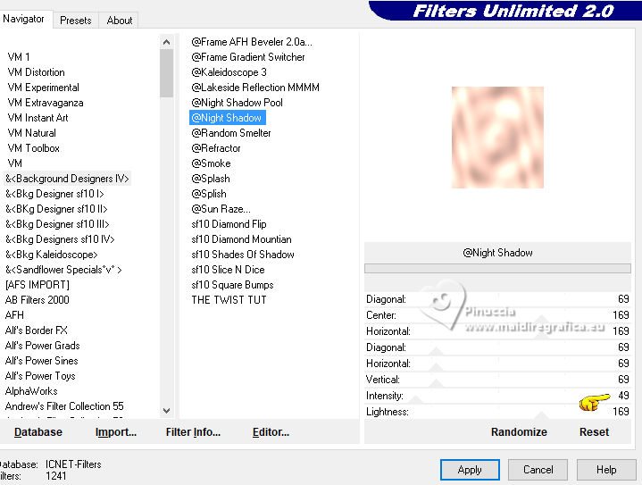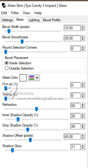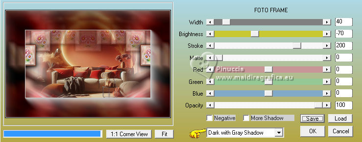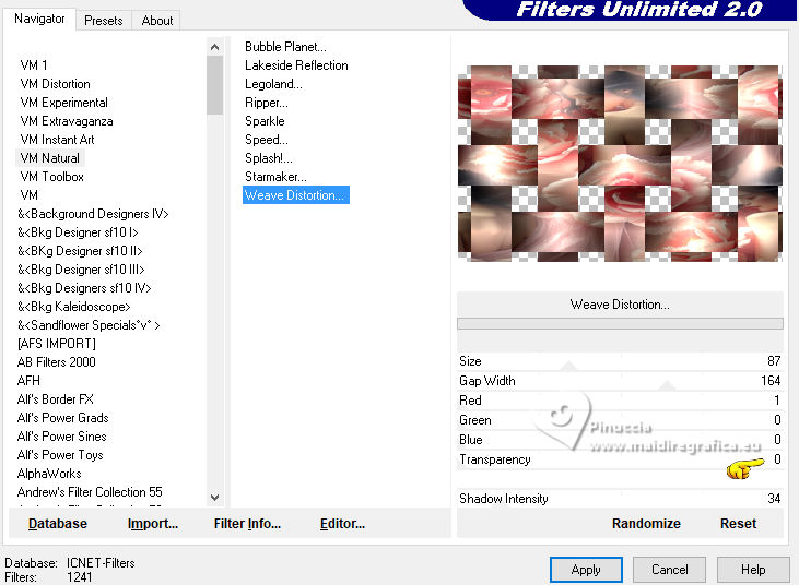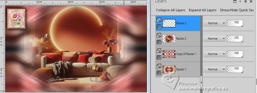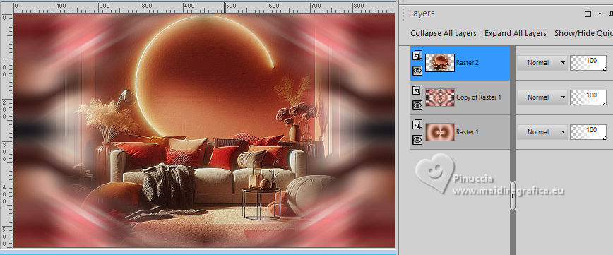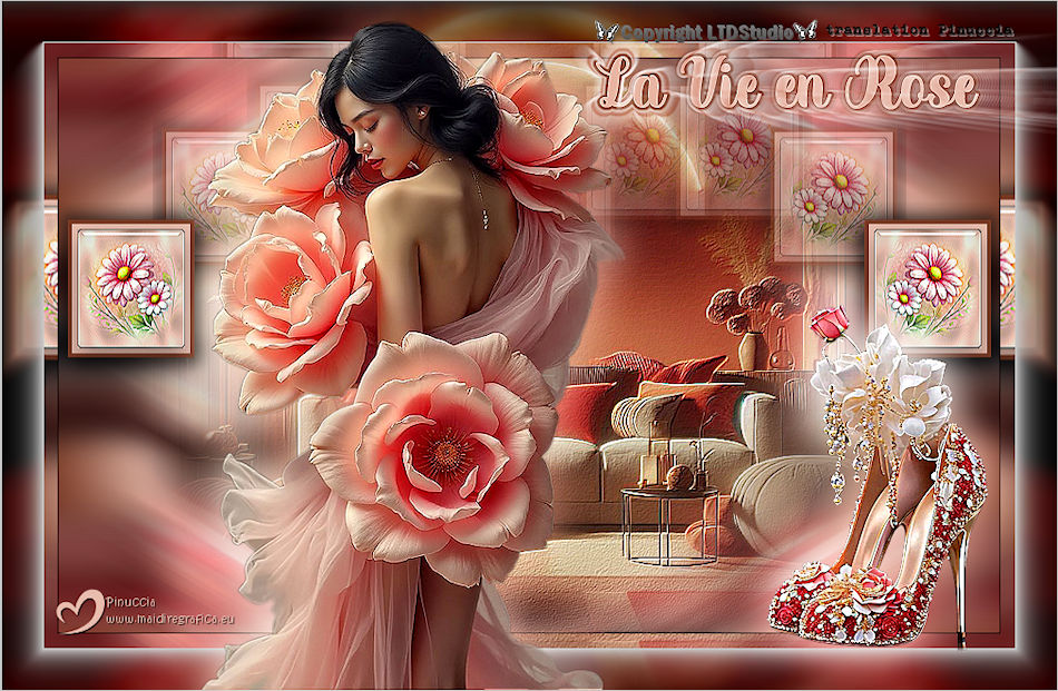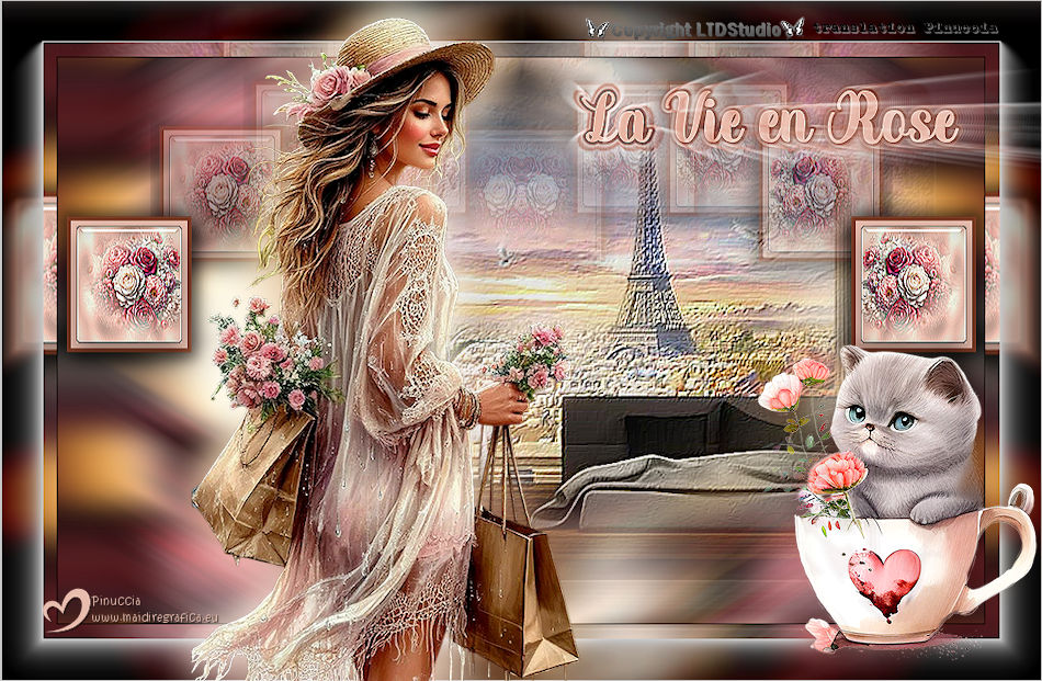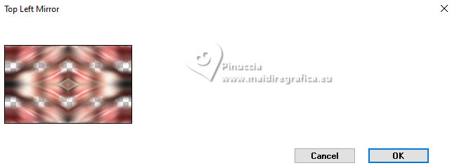 ![]() For this tutorial, you will need: ![]() Thanks for the tubes Beatriz, Cat Dana, Edith Spigai. The rest of the material is by Lady Tess. (you find here the links to the material authors' sites) ![]() ![]() consult, if necessary, my filter section here Filters Unlimited 2.0 here &<Background Designer IV> - @Night Shadow (to import in Unlimited) here Mehdi - Wavy Lab here VM Natural - Wave Distortion here FM Tile Tools - Blend Emboss here Simple - Top Left Mirror here Alien Skin Eye Candy 5 Impact - Glass here Mura's Meister - Copies here Filters VM Natural and Simple can be used alone or imported into Filters Unlimited. (How do, you see here) If a plugin supplied appears with this icon ![]() You can change Blend Modes according to your colors. ![]() Copy the Selection in the Selections Folder 1. Set your foreground color to #e8bdae and your background color to #773823. ![]() color 3 #ffffff color 4 #000000 2. Open a new transparent image 900 x 550 pixels. Effects>Plugins>Mehdi - Wavy Lab This filter creates gradients with the colors of your Materials palette. The first is your background color, the second is your foreground color. Keep the last color created by the filtre ![]() Layers>Duplicate. Adjust>Blur>Gaussian Blur - radius 50 ![]() Layers>New Raster Layer. Selections>Select All. 3. Open 5005-woman-LB TUBES ![]() Edit>Copy. Go back to your work and go to Edit>Paste into Selection. Selections>Select None. Layers>Merge>Merge Down. 4. Effects>Image Effects>Seamless Tiling, default settings. ![]() Effects>Plugins>Filters Unlimited 2.0 - VM Natural - Weave Distortion ![]() Adjust>Blur>Motion Blur ![]() Edit>Repeat Motion Blur - 2 times. 5. Effects>Reflection Effects>Rotating Mirror. ![]() 6. Effects>Plugins>Simple - Top Left Mirror. ![]() Open 2026 01 21 interieur maison Cat Dana 1 ![]() Edit>Copy. Go back to your work and go to Edit>Paste as new layer. Image>Resize, to 85%, resize all layers not checked. Effects>Plugins>FM Tile Tools - Blend Emboss, default settings. ![]() Edit>Repeat Blend Emboss. 7. We have this ![]() 8. Layers>New Raster Layer. Selections>Load/Save Selection>Load Selection from Disk. Look for and load the selection VieRose_sel_1 ![]() Flood Fill the selection with your background color #773823.Selections>Modify>Contract - 4 pixels. Flood Fill the selection with your foreground color #e8bdae.Selections>Modify>Contract - 5 pixels. 9. Effects>Plugins>Filters Unlimited 2.0 - &<Background Designer IV> - @Night Shadow ![]() Layers>New Raster Layer. Open 2025 04 05 Cat Dana N2 ![]() Edit>Copy. Go back to your work and go to Edit>Paste into Selection. Adjust>Sharpness>Sharpen More. 10. Layers>Merge>Merge Down. Effects>Plugins>Alien Skin Eye Candy 5 Impact - Glass - Clear ![]() Effects>Edge Effects>Enhance. Selections>Select None. Effects>3D Effects>Drop Shadow, color #000000. ![]() Repeat Drop Shadow, vertical and horizontal -6. ![]() Adjust>Sharpness>Sharpen. 11. We have this: ![]() 12. Effects>Plugins>Mura's Meister - Copies. ![]() Effects>Reflection Effects>Rotating Mirror. ![]() 13. Image>Add Borders, 1 pixel, symmetric, color #000000. Edit>Copy. Edit>Paste as new image, and minimize this image for the moment. Go back to your work. Selections>Select All. 14. Image>Add Borders, 55 pixels, symmetric, color #ffffff. Selections>Invert. Edit>Paste into Selection - the image minimized at step 13 is in memory. 15. Effects>Plugins>AAA Frames - Foto Frame. ![]() Effects>Reflection Effects>Rotating Mirror, default settings. ![]() Selections>Select None. 16. Activate again the woman's tube 5005-woman-LB TUBES and go to Edit>Copy. Go back to your work and go to Edit>Paste as new layer. Move the tube little to the left.Objects>Align>Bottom ![]() Layers>Duplicate. Activate the layer below of the original. 17. Adjust>Blur>Gaussian Blur - radius 20. ![]() Change the Blend Mode of this layer to Screen. Activate the layer above. Adjust>Sharpness>Sharpen. 18. Open floral200_ESpigai ![]() Edit>Copy. Go back to your work and go to Edit>Paste as new layer. Image>Resize, to 60%, resize all layers not checked. Move the tube to the right.Layers>Duplicate. 19. Activate the layer below of the original. Adjust>Blur>Gaussian Blur - radius 20. ![]() Change the Blend mode of this layer to Screen. Activate the layer above. Adjust>Sharpness>Sharpen More. 20. Open LTDStudio_VieRose_Texto ![]() Edit>Copy. Go back to your work and go to Edit>Paste as new layer. Place the text to your liking.21. Sign your work on a new layer. Add the watermarks of the author and of the translator. Layers>Merge>Merge All and save as jpg. ![]() Versions with my tubes from Pinterest images ![]() ![]() Your versions. Thanks![]() If you have problems or doubts, or you find a not worked link, or only for tell me that you enjoyed this tutorial, write to me. |