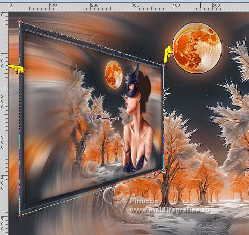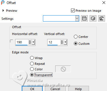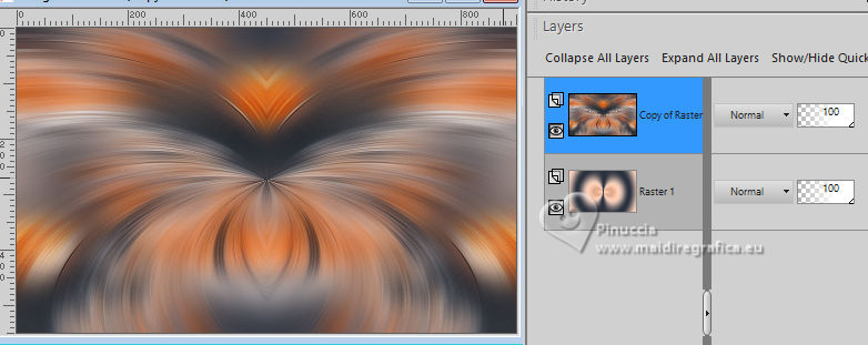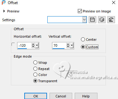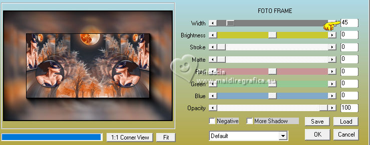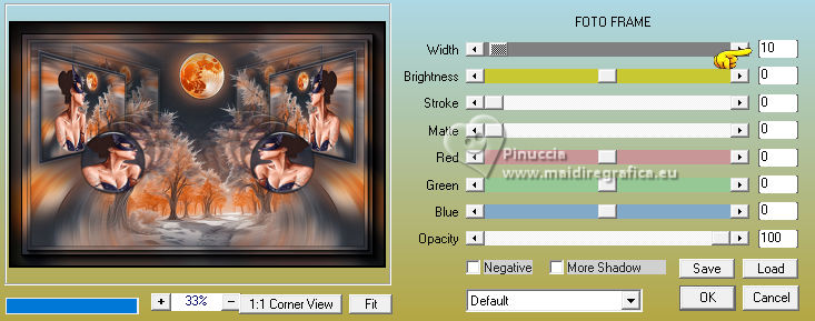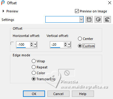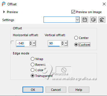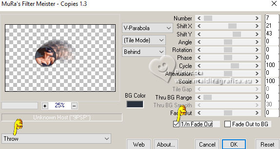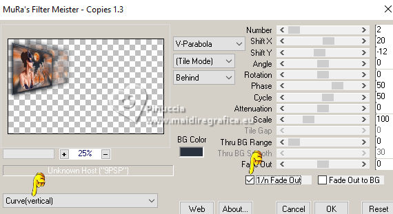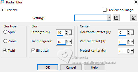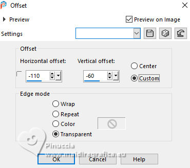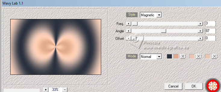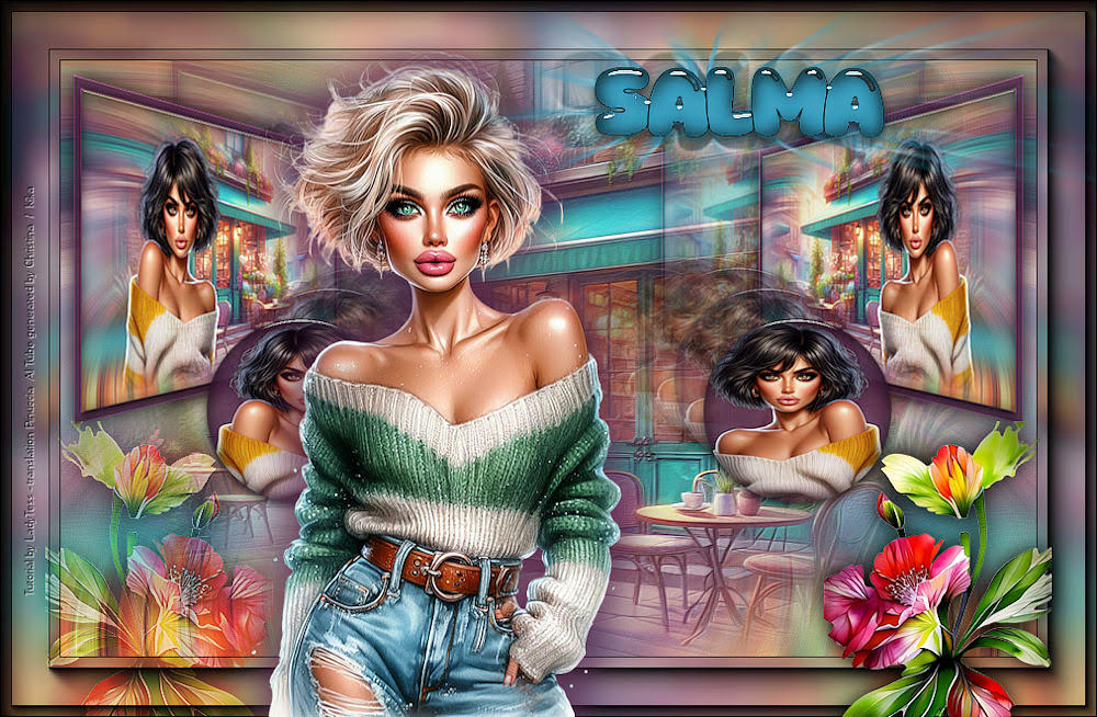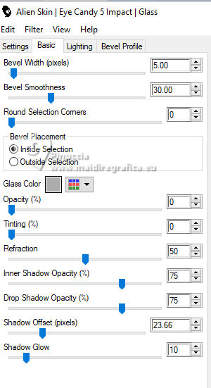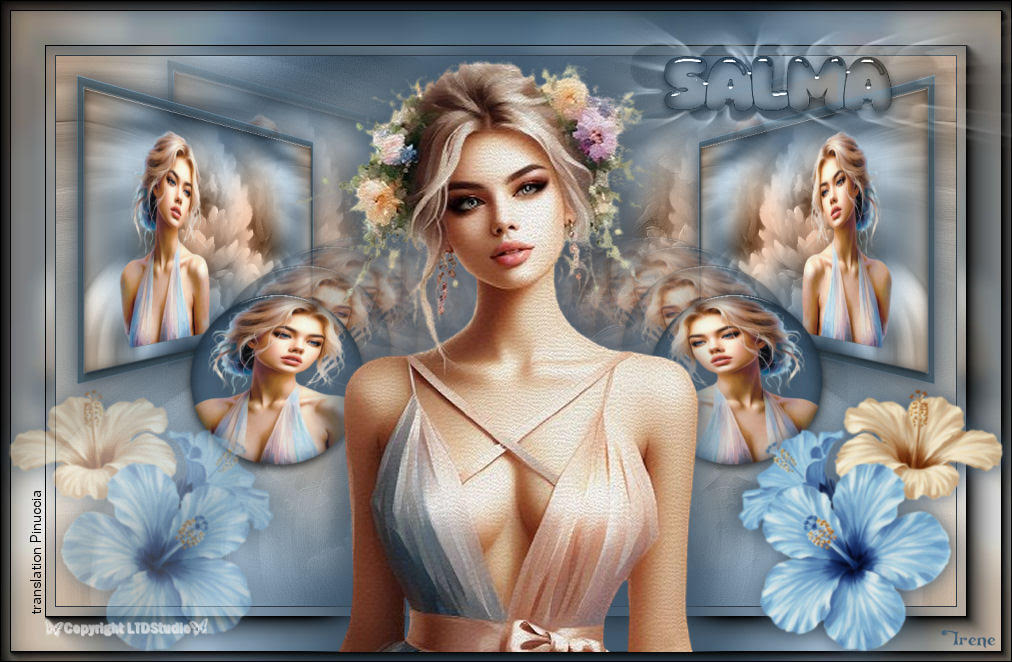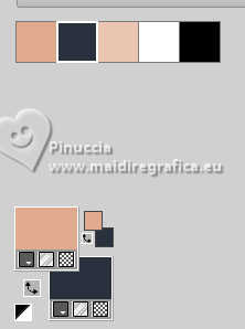 For this tutorial, you will need: ![]() Thanks for the tubes Beatriz, Edith Spigai and Mentali. The rest of the material is by Lady Tess. (you find here the links to the material authors' sites) ![]() consult, if necessary, my filter section here Filters Unlimited 2.0 here Mehdi - Wavy Lab 1.1. here FM Tile Tools - Blend Emboss here Andromeda - Perspective here Mura's Meister - Copies here AAA Frames - Foto Frame here Alien Skin Eye Candy 5 Impact - Glass here Filters Graphics Plus can be used alone or imported into Filters Unlimited. (How do, you see here) If a plugin supplied appears with this icon ![]() You can change Blend Modes according to your colors. ![]() Copy the selections in the Selections Folder. Colors ![]() 1. Set your foreground color to #dfaa8d and your background color to #2a313e. ![]() color 3 #eac6b2 other colors: white #ffffff and black #000000 2. Open a new transparent image 900 x 550 pixels. Effects>Plugins>Mehdi - Wavy Lab 1.1 This filter creates gradients with the colors of your Materials palette. The first is your background color, the second is your foreground color. Change the last two colors created by the filter both the color 3 #eac6b2. ![]() Layers>Duplicate. Adjust>Blur>Gaussian Blur - radius 60 ![]() 3. Layers>New Raster Layer. Selections>Select All. Open mentali-misted3565 ![]() Edit>Copy. Go back to your work and go to Edit>Paste into Selection. Selections>Select None. 4. Effects>Image Effects>Seamless Tiling, default settings. ![]() Adjust>Blur>Radial Blur. ![]() Effects>Edge Effects>Enhance More. Layers>Merge>Merge Down. Effects>Reflection Effects>Rotating Mirror. ![]() 5. We have this ![]() 6. Edit>Paste as new layer - the misted mentali-misted3565 is still in memory. Effects>Plugins>FM Tile Tools - Blend Emboss, default settings. ![]() Edit>Copy Special>Copy Merged Edit>Paste as new image, and minimize this image for the moment. Go back to your work. Layers>New Raster Layer. 7. Selections>Load/Save Selection>Load Selection from Disk. Look for and load the selection Salma_sel_1 ![]() Reduce the opacity of your Flood Fill Tool to 80%. Flood Fill the layer with your background color #2a313e.Selections>Modify>Contract - 15 pixels. Press CANC on the keyboard ![]() Selections>Select None. Effects>3D Effects>Inner Bevel. ![]() 8. Effects>Edge Effects>Enhance. Layers>New Raster Layer. Selections>Load/Save Selection>Load Selection from Disk. Load again the selection Salma_sel_1 ![]() Selections>Modify>Contract - 15 pixels. 9. Activate the image minimized at step and go to Edit>Copy. Go back to your work and go to Edit>Paste into Selection. Adjust>Sharpness>Sharpen. Effects>Plugins>Alien Skin Eye Candy 5 Impact - Glass Preset Clear with these settings ![]() Selections>Select None. 10. We have this ![]() 11. Open 3488-woman-LBTUBES ![]() Edit>Copy. Go back to your work and go to Edit>Paste as new layer. Image>Resize, to 67%, resize all layers not checked. Effects>Image Effects>Offset. ![]() Layers>Merge>Merge Down - 2 times. Effects>Plugins>Andromeda - Perspective Click on Presets ![]() Set Full Canvas, Side Wall and click on the sign at the bottom right to apply ![]() Again click on the sign at the bottom right to close. ![]() if you have problems with the filter, activate your Pick Tool ![]() in mode Scale ![]() pull the right central node to the left until 130 pixels ![]() in mode Perspective ![]() pull the right top node down until 320 pixels (the opposite node will move symmetrically) ![]() 12. Image>Resize, to 70%, resize all layers not checked. Adjust>Sharpness>Sharpen More. Effects>3D Effects>Drop Shadow, color #000000. ![]() Effects>Image Effects>Offset. ![]() 13. Effects>Plugins>Mura's Meister - Copies ![]() Layers>Duplicate. Image>Mirror>Mirror Horizontal. Layers>Merge>Merge Down. 14. We have this ![]() 15. Layers>New Raster Layer. Selections>Load/Save Selection>Load Selection from Disk. Look for and load the selection Salma_Sel_2 ![]() Opacity of your Flood Fill Tool always to 80%, Flood Fill the selection with your background color #2a313e.Layers>New Raster Layer. Activate again the tube 3488-woman-LBTUBES . Image>Mirror>Mirror Horizontal. Edit>Copy. 16. Go back to your work and go to Edit>Paste into Selection. Selections>Select None. Layers>Merge>Merge Down. Image>Resize, to 50%, resize all layers not checked. Effects>Plugins>Alien Skin Eye Candy 5 Impact - Glass Preset Clear with these settings ![]() Image>Resize, to 70%, resize all layers not checked. Adjust>Sharpness>Sharpen. 17. Effects>Image Effects>Offset. ![]() Effects>Plugins>Mura's Meister - Copies ![]() Again Effects>Image Effects>Offset. ![]() Effects>Reflection Effects>Rotating Mirror ![]() 18. We have this ![]() 19. Image>Add Borders, 1 pixel, symmetric, color #000000. Edit>Copy. Edit>Paste as new image and minimize this image for the moment. Selections>Select All. Image>Add Borders, 55 pixels, symmetric, color #ffffff. Selections>Invert. Edit>Paste into Selection - the image minimized at step 19 is still in memory. 20. Adjust>Blur>Gaussian Blur - radius 10. ![]() Effects>Plugins>AAA Frames - Foto Frame. ![]() Again Effects>Plugins>AAA Frames - Foto Frame, width 10 ![]() Selections>Select None. 21. Open 3286-salma-LBTUBES ![]() Edit>Copy. Go back to your work and go to Edit>Paste as new layer. Effects>Image Effects>Offset ![]() Effects>3D Effects>Drop' Shadow, color #2a313e. ![]() Edit>Repeat Drop Shadow. Adjust>Sharpness>Sharpen. 22. Open floral359-ESpigai ![]() Edit>Copy. Go back to your work and go to Edit>Paste as new layer. Image>Resize, to 60%, resize all layers not checked. Move the tube to the right, see my final tag.Effects>3D Effects>Drop shadow, color #000000. ![]() Adjust>Sharpness>Sharpen. 23. Layers>Duplicate. Image>Mirror>Mirror horizontal. Change the Blend Mode of this layer to Overlay and reduce the opacity to 53%. Layers>Arrange>Move Down - 2 times - it should be under the woman's layer. Adjust>Sharpness>Sharpen More. 24. Open LTDStudio_Salma_Texto ![]() Edit>Copy.