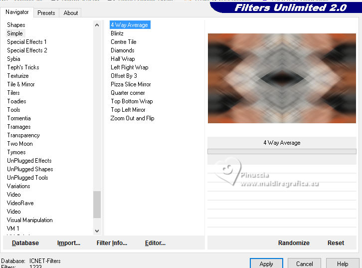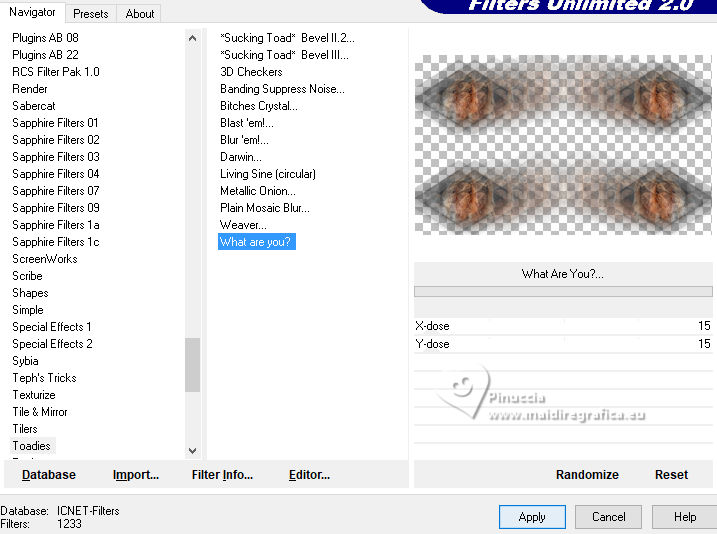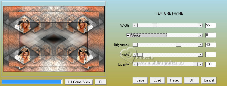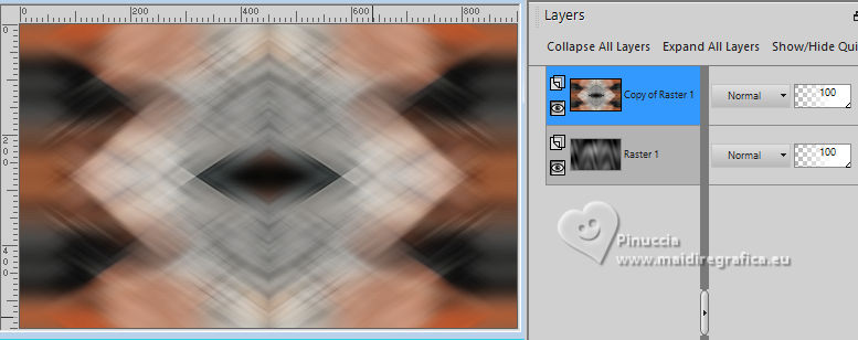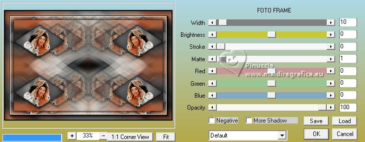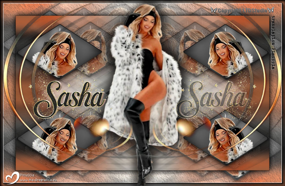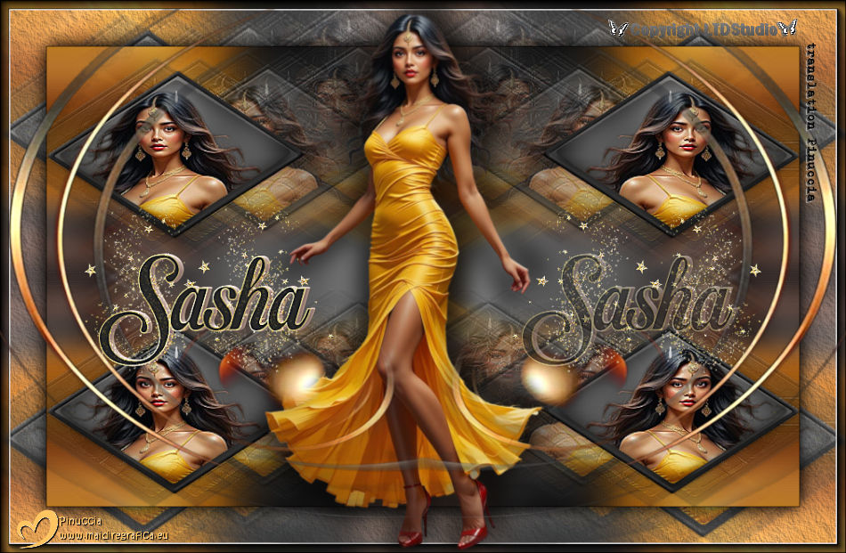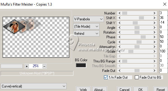 ![]() For this tutorial, you will need: ![]() Thanks for the tubes Clo and Silvie. The rest of the material is by Lady Tess. (you find here the links to the material authors' sites) ![]() ![]() consult, if necessary, my filter section here Filters Unlimited 2.0 here &<Background Designers IV> - @Night Shadow Pool (to import in Unlimited) here Toadies - What are you here Simple - 4Way Average here Alien Skin Eye Candy 5 Impact - Glass here Mura's Meister - Copies here AAA Frames - Texture Frame, Foto Frame here Filters Toadies and Simple can be used alone or imported into Filters Unlimited. (How do, you see here) If a plugin supplied appears with this icon ![]() You can change Blend Modes according to your colors. ![]() 1. Set your foreground color to #e9c2b1 and your background color to #272727. ![]() color 3 #ffffff color 4 #000000 2. Open a new transparent image 900 x 550 pixels. Flood Fill the transparent image with your background color #272727Effects>Plugins>Filters Unlimited 2.0 - &<Background Designers> - @Nigh Shadow Pool ![]() Layers>Duplicate. Layers>New Raster Layer. 3. Selections>Select All. Open Woman3136_byClo ![]() Edit>Copy. Go back to your work and go to Edit>Paste into Selection. Selections>Select None. 4. Effects>Image Effects>Seamless Tiling, default settings. ![]() Adjust>Blur>Motion Blur ![]() Edit>Repeat Motion Blur - 2 times. 5. Effects>Edge Effects>Enhance More. Layers>Merge>Merge Down. Effects>Reflection Effects>Rotating Mirror. ![]() Effects>Plugins>Filters Unlimited 2.0 - Simple - 4 Way Average ![]() 6. We have this ![]() 7. Selections>Load/Save Selection>Load Selection from Disk. Look for and load the selection Sasha_sel_1 ![]() Activate the layer Raster 1. Selections>Promote Selection to layer. Layers>Arrange>Bring to Top. 8. Layers>New Raster Layer. Selections>Modify>Select Selection Borders. ![]() Flood Fill the selection with your background color #272727.Effects>3D Effects>Inner Bevel. ![]() 9. Selections>Select None. Layers>Merge>Merge Down. Image>Resize, to 80%, resize all layers not checked. Adjust>Sharpness>Sharpen. Effects>Image Effects>Offset. ![]() Layers>New Raster Layer. Selections>Load/Save Selection>Load Selection from Disk. Look for and load the selection Sasha_sel_2 ![]() 10. Open Woman3136_byClo_1 with an active selection ![]() Edit>Copy. Go back to your work and go to Edit>Paste into Selection. Effects>Edge Effects>Enhance. Layers>Merge>Merge Down. Effects>Plugins>Alien Skin Eye Candy 5 Impact - Glass - preset Clear ![]() 11. Selections>Select None. Effects>Image Effects>Offset. ![]() Effects>Plugins>Mura's Meister - Copies. ![]() Effects>Reflection Effects>Rotating Mirror. ![]() 12. Layers>Duplicate. Effects>Image Effects>Offset. ![]() Layers>Merge>Merge Down. 13. Layers>Duplicate. Activate the layer below of the original. Effects>Plugins>Filters Unlimited 2.0 - Toadies - What are you. ![]() Effects>Edge Effects>Enhance more. 14. We have this ![]() 15. Image>Add Borders, 1 pixel, symmetric, color #000000. Edit>Copy. Edit>Paste as new image, and minimize this image. Go back to your work. Selections>Select All. Image>Add Borders, 55 pixels, symmetric, color #ffffff. Selections>Invert. 16. Edit>Paste into Selection - the minimized image still in memory. Effects>Plugins>AAA Frames - Texture Frame. ![]() 17. Selections>Invert. Effects>3D Effects>Drop Shadow, color #000000. ![]() Repeat Drop Shadow, vertical and horizontal -5/5 ![]() Selections>Invert. Effects>Plugins>AAA Frames - Foto Frame. ![]() Selections>Select None. 18. Activate again Woman3136_byClo and go to Edit>Copy. Go back to your work and go to Edit>Paste as new layer. Image>Resize, to 70%, resize all layers not checked. Move slightly the tube down.![]() 19. Effects>3D Effects>Drop Shadow, color #000000. ![]() Repeat Drop Shadow vertical and horizontal 15/-15. ![]() Open LTDStudio_Sasha_Deco ![]() Edit>Copy. Go back to your work and go to Edit>Paste as new layer. Move slightly the tube down.![]() 20. Open LTDStudio_Sasha_Texto ![]() Edit>Copy. Go back to your work and go to Edit>Paste as new layer. It's in its place, but you can move it if you want. 21. Sign your work on a new layer. Add the watermarks of the author and of the translator. Layers>Merge>Merge All and save as jpg. ![]() Versions with my tubes from Pinterest images ![]() ![]() ![]() Your versions. Thanks![]() If you have problems or doubts, or you find a not worked link, or only for tell me that you enjoyed this tutorial, write to me. |