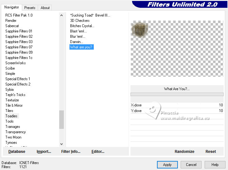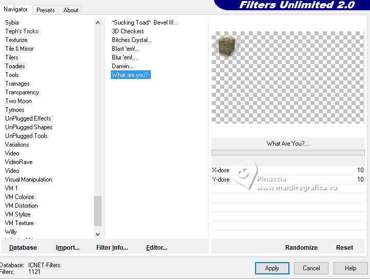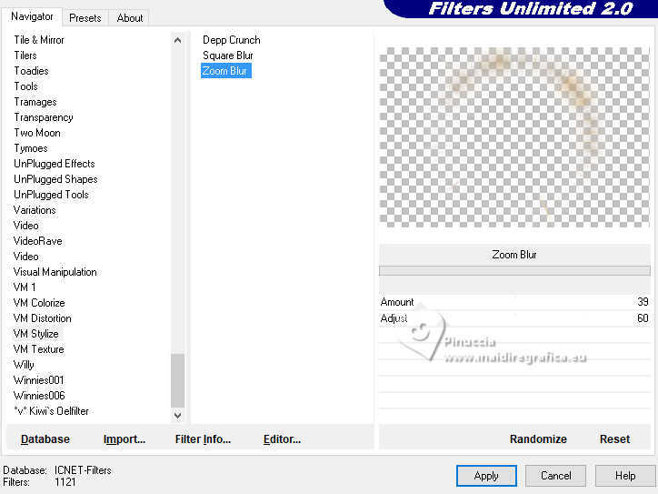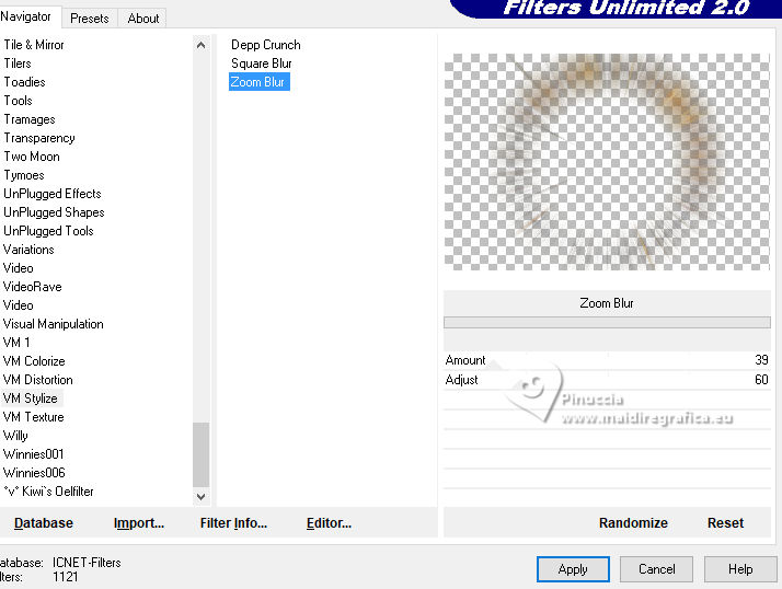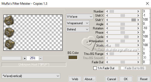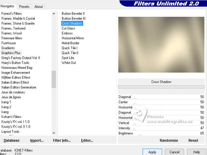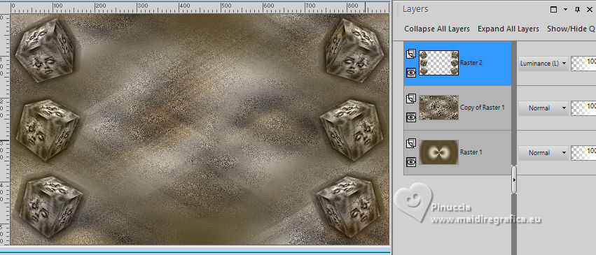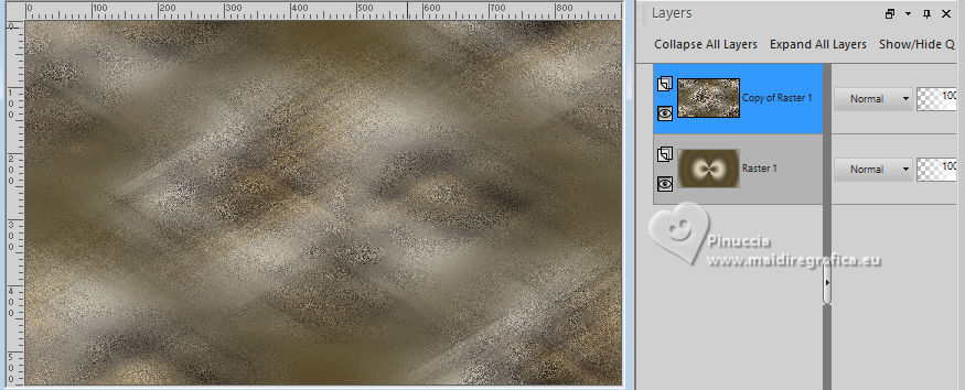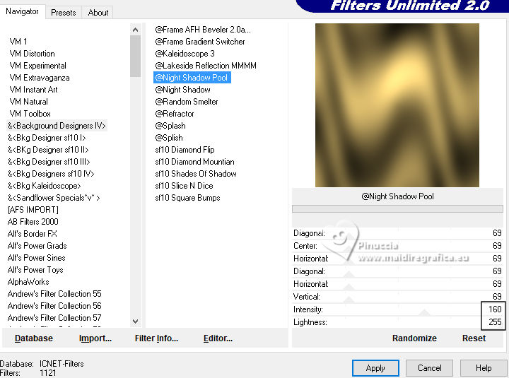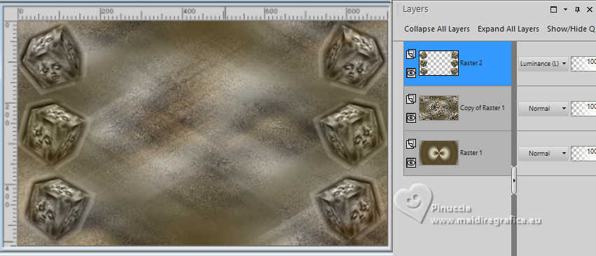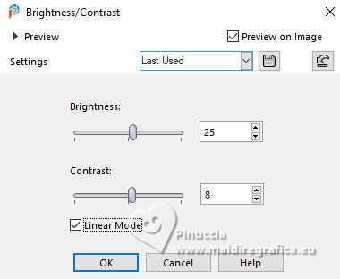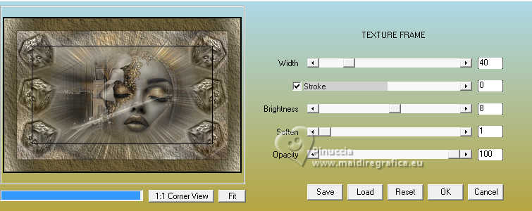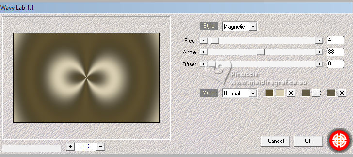 For this tutorial, you will need: ![]() Thanks for the tubes and the mask Clo, Beatriz, Silvie and Narah. The rest of the material is by Lady Tess. (you find here the links to the material authors' sites) ![]() consult, if necessary, my filter section here Filters Unlimited 2.0 here Mehdi - Wavy Lab 1.1 here &<Bkg Designer IV> - @Night Shadow Pool (to import in Unlimited) here Toadies - What are you here VM Toolbox - Zoom Blur here Mura's Meister - Copies here AAA Frames - Foto Frame, Transparent Frame here Vizros - Box - in the material Filters Toadies and VM Toolbox can be used alone or imported into Filters Unlimited. (How do, you see here) If a plugin supplied appears with this icon ![]() You can change Blend Modes according to your colors. ![]() Open the mask in PSP and minimize it with the rest of the material. ![]() 1. Set your foreground color to #d8cdb0, and your background color to #5c4f2e. ![]() color 3: #635b45 color 4: #ffffff color 5: #000000 2. Open a new transparent image 900 x 550 pixels. Effects>Plugins>Mehdi - Wavy Lab 1.1. This filter creates gradients with the colors of your Materials palette. The first is your background color, the second is your foreground color. Change the last two colors created by the filtre: both with #635b45 ![]() Layers>Duplicate. 3. Adjust>Blur>Gaussian Blur - radius 35 ![]() Layers>New Raster Layer. Selections>Select All. Open Misted_Woman2042_byClo ![]() Edit>Copy. Go back to your work and go to Edit>Paste into Selection. Selections>Select None. 4. Effects>Image Effects>Seamless Tiling, default settings. ![]() Layers>Merge>Merge Down. Effects>Plugins>Filters Unlimited 2.0 - Noise Filters - X-Noise ![]() Adjust>Sharpness>Sharpen. 5. We have this ![]() 6. Activate again Misted_Woman2042_byClo Window>Duplicate, to make a copy. Minimize the tube and stay on this image. Layers>New Raster Layer. Flood Fill the layer with your background color #5c4f2e.Effects>Plugins>Filters Unlimited 2.0 - &<Bkg Designer IV> - @Night Shadow Pool. ![]() Layers>Arrange>Send to Bottom. Activate the layer above of the misted. Layers>Merge>Merge Down. 7. Effects>Plugins>Vizros - Box. ![]() Activate your Magic Wand Tool , tolerance and feather 0,and click in the white zone to select it ![]() Selections>Invert. Edit>Copy. Edit>Paste as new image. 8. Again Edit>Copy. Go back to your main work. Edit>Paste as new layer. Adjust>Brightness and Contrast>Brightness and Contrast ![]() 9. Adjust>Sharpness>Sharpen More. K key to activate your Pick Tool ![]() Position X: 22,00 - Position Y: 22,00. ![]() M key to deselect the Tool. Layers>Duplicate. Effects>3D Effects>Drop Shadow, color black ![]() Repeat Drop Shadow, vertical and horizontal -5. ![]() 10. Activate the layer below. Effects>Plugins>Filters Unlimited 2.0 - Toadies - What are you ![]() attention please, if you are using the version 2.3 of Unlimited, the result will be different ![]() Change the Blend Mode of this layer to Luminance (L). Activate the top layer. Layers>Merge>Merge Down. Effects>Plugins>Mura's Meister - Copies. ![]() Layers>Duplicate. Image>Mirror>Mirror Horizontal. Layers>Merge>Merge Down. 11. We have this ![]() if you are using the version 2.3 of Unlimited: ![]() 12. Open Golden_Circle55J_Silvie_29.07.2024 ![]() Edit>Copy. Go back to your work and go to Edit>Paste as new layer. Image>Resize, to 70%, resize all layers not checked. Effects>Plugins>Filters Unlimited 2.0 - VM Toolbox - Zoom Blur using the filter in Unlimited, this is placed under VM Stylize ![]() with the version 2.3 of Unlimited ![]() 13. Open 1282-Night-misted-LB TUBES ![]() Edit>Copy. Go back to your work and go to Edit>Paste as new layer. Change the Blend Mode of this layer to Luminance. Adjust>Sharpness>Sharpen. 14. Activate again the misted Misted_Woman2042_byClo and go to Edit>Copy. Go back to your work and go to Edit>Paste as new layer. Image>Resize, to 55%, resize all layers not checked. Reduce the opacity of this layer to 71%. Move slightly to the right, see the final tag.Activate the layer Raster 1. Edit>Copy. Edit>Paste as new image and minimize this image for a moment. 15. Go back to your work. Image>Add Borders, 1 pixel, symmetric, color #000000. Selections>Select All. Image>Add Borders, 55 pixels, symmetric, color #ffffff. Selections>Invert. 16. Edit>Paste into Selection - the image minimized at the step 14 is still in memory. Effects>Plugins>AAA Frames - Texture Frame. ![]() Selections>Invert. Effects>Plugins>AAA Frames - Transparent Frame. ![]() Selections>Select None. 17. Open Misted_Woman2040_byClo ![]() Edit>Copy. Go back to your work and go to Edit>Paste as new layer. Image>Resize, to 80%, resize all layers not checked. Move the tube to the left side, see the final tag.Adjust>Sharpness>Sharpen. Change the Blend Mode of this layer to Luminance. ![]() 18. Layers>New Raster Layer. Flood Fill the layer with your foreground color d8cdb0Effects>Plugins>Filters Unlimited 2.0 - Graphics Plus - Cross Shadow. ![]() 19. Layers>New Mask layer>From image Open the menu under the source window and you'll see all the files open. Select the mask Narah_Mask_1145 ![]() Layers>Duplicate. Layers>Merge>Merge Group. Layers>Arrange>Move Down. Reduce the opacity of this layer to 63%. Adjust>Sharpness>Sharpen More. Edit>Repeat Sharpen More. Adjust>Add/Remove Noise>Add Noise. ![]() Open LTDStudio_Sensualité_Texto ![]() Edit>Copy. Go back to your work and go to Edit>Paste as new layer. Layers>Arrange>Bring to Top. Place the text to your liking.Sign your work. Add the author and the translator's watermarks. Agregar tu Firma o Marca de Agua - Agregar mi Marca de Agua Image>Add Borders, 1 pixel, symmetric, background color #5c4f2e. Save as jpg. For the tube of this version thanks Mentali, the second misted is mine. ![]() The misted of this version are mine. ![]() ![]() Your versions. Thanks![]() Kika ![]() Irene ![]() If you have problems or doubts, or you find a not worked link, or only for tell me that you enjoyed this tutorial, write to me. |