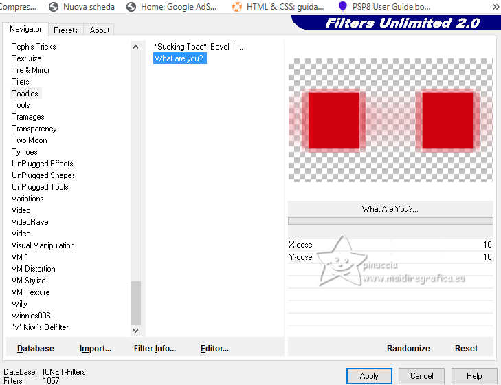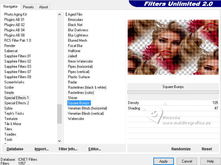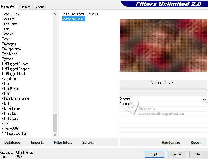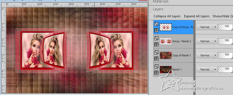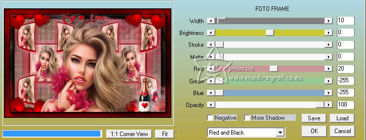 For this tutorial, you will need: ![]() Thanks for the mask Narah. (you find here the links to the material authors' sites) ![]() consult, if necessary, my filter section here Filters Unlimited 2.0 here &<Background Designers IV> - @Night Shadow (to import in Unlimited) here Toadies - What are you here Alien Skin Eye Candy 5 Impact - Glass here FM Tile Tools - Saturation Emboss here AAA Frames - Transparent Frame, Foto Frame here Filters Factory Gallery can be used alone or imported into Filters Unlimited. (How do, you see here) If a plugin supplied appears with this icon ![]() You can change Blend Modes according to your colors. ![]() Copy the Selection in the Selections Folder. Open the Mask in PSP and minimize it with the rest of the material. 1. Set your foreground color to #a0102d, and your background color to #d5a89f. ![]() 2. Open a new transparent image 900 x 550 pixels. Selections>Select All. Open Love_Fondo ![]() Edit>Copy. Go back to your work and go to Edit>Paste into Selection. Selections>Select None. 3. Layers>Duplicate. Adjust>Blur>Gaussian Blur - radius 30. ![]() Layers>New Raster Layer. Selections>Select All. Open Love_Imagegirl ![]() Edit>Copy. Minimize the tube. Go back to your work and go to Edit>Paste into Selection. Selections>Select None. 4. Effects>Image Effects>Seamless Tiling, default settings. ![]() Effects>Plugins>Filters Unlimited 2.0 - Special Effects 1 - Square Bumps ![]() Layers>Merge>Merge Down. 5. We have this ![]() 6. Effects>Plugins>Filters Unlimited 2.0 - Toadies - What are you ![]() Repeat this Effect another time. Effects>Edge Effects>Enhance More. 7. Layers>New Raster Layer. Flood Fill the layer with your foreground color #a0102d.Layers>New Mask layer>From image Open the menu under the source window and you'll see all the files open. Select the mask NarahsMasks_1524. ![]() Layers>Merge>Merge Group. 8. Effects>Plugins>FM Tile Tools - Saturation Emboss, default settings. ![]() Layers>New Raster Layer. Selections>Load/Save Selection>Load Selection from Disk. Look for and load the selection Love_sel_1 ![]() Flood Fill the selection with your background color #d5a89f.Effects>Plugins>Filters Unlimited 2.0 - &<Background Designers IV> - @Night Shadow. ![]() 9. Layers>New Raster Layer. Edit>Paste into Selection - the image Love_Imagegirl is still in memory. Effects>Edge Effects>Enhance. Layers>Merge>Merge Down. Effects>Plugins>Alien Skin Eye Candy 5 Impact - Glass preset Clear with these settings ![]() 10. Selections>Select None. Layers>Duplicate. Image>Mirror>Mirror horizontal (Image>Mirror). Layers>Merge>Merge Down. Effects>3D Effects>Drop Shadow, color #000000. ![]() 11. Activate the layer below, the mask. Effects>Plugins>Filters Unlimited 2.0 - Toadies - What are you. ![]() Effects>Edge Effects>Enhance More. Activate your top layer. Layers>Merge>Merge Down. 12. Layers>Duplicate. Effects>Geometric Effects>Circle ![]() 13. We have this ![]() 14. Image>Resize, to 80%, resize all layers not checked. K key to activate your Pick Tool ![]() Position X: -22,00 - Position Y: -105,00. M key to deselect the Tool. Layers>Duplicate. Image>Mirror>Mirror Horizontal (Image>Mirror). Layers>Merge>Merge Down. 15. Layers>Duplicate. Image>Mirror>Mirror Vertical (Image>Flip). Image>Flip>Flip Vertical *** Flip>Flip Vertical flips and leaves the image in the same position. If you are using an older version that does not have this feature, after duplicating, Pick Tool ![]() Position X: -22,00 - Position Y: 217,00 ![]() *** 16. We have this ![]() 17. Activate the layer Raster 1. Edit>Copy. Edit>Paste as new image and minimize this image. Go back to your work. Image>Add borders, 1 pixel, symmetric, color #000000. Selections>Select All. Image>Add borders, 55 pixels, symmetric, color #ffffff. 18. Selections>Invert. Edit>Paste into Selection (the minimized image is still in memory) Effects>Edge Effects>Enhance More. Edit>Repeat Enhance More. 19. Selections>Invert. Effects>3D Effects>Drop Shadow, color #000000. ![]() Effects>Plugins>AAA Frames - Transparent Frame. ![]() Again Effects>3D Effects>Drop Shadow, color #000000. ![]() Selections>Select None. 20. Activate again Love_Imagegirl and go to Edit>Copy. Go back to your work and go to Edit>Paste as new layer. Image>Resize, to 80%, resize all layers not checked. Objects>Align>Bottom. Adjust>Sharpness>Sharpen. 21. Effects>3D Effects>Drop Shadow, color #000000. ![]() Open LTDStudio_Love_Deco ![]() Edit>Copy. Go back to your work and go to Edit>Paste as new layer. It is at its place. Layers>Arrange>Move Down. 22. Go back to the top layer. Open LTDStudio_Love_Deco_1 ![]() Edit>Copy. Go back to your work and go to Edit>Paste as new layer. Move the tube to your liking, or see my example.In anticipation of applying the Photo Frame filter, leave the tube slightly away from the edge. 23. Open LTDStudio_Love_Texto ![]() Edit>Copy. Go back to your work and go to Edit>Paste as new layer. Move the text to your liking, or see my example.Layers>Merge>Merge All. Effects>Plugins>AAA Frames - Foto Frame. ![]() 24. Sign your work on a new layer. Add the author and the translator's watermarks. Layers>Merge>Merge All and save as jpg. For the tubes of these versions thanks Mentali ![]() Colybrix ![]() Lady Valella ![]() ![]() Your versions. Thanks![]() Kika ![]() If you have problems or doubts, or you find a not worked link, or only for tell me that you enjoyed this tutorial, write to me. |