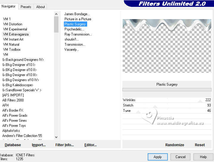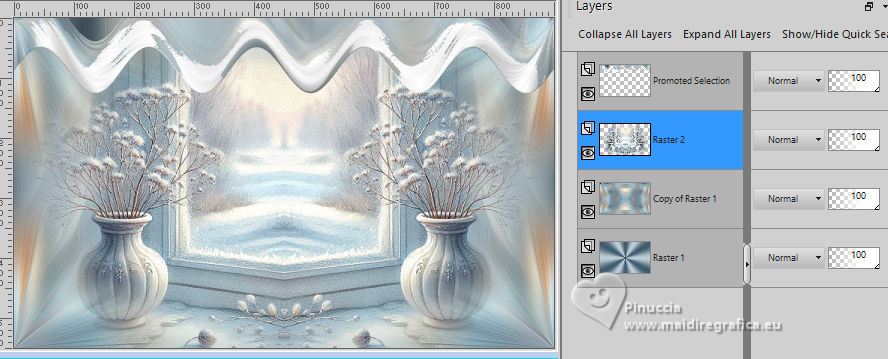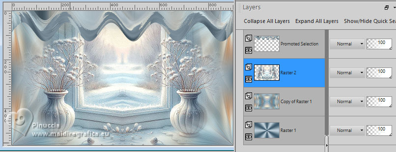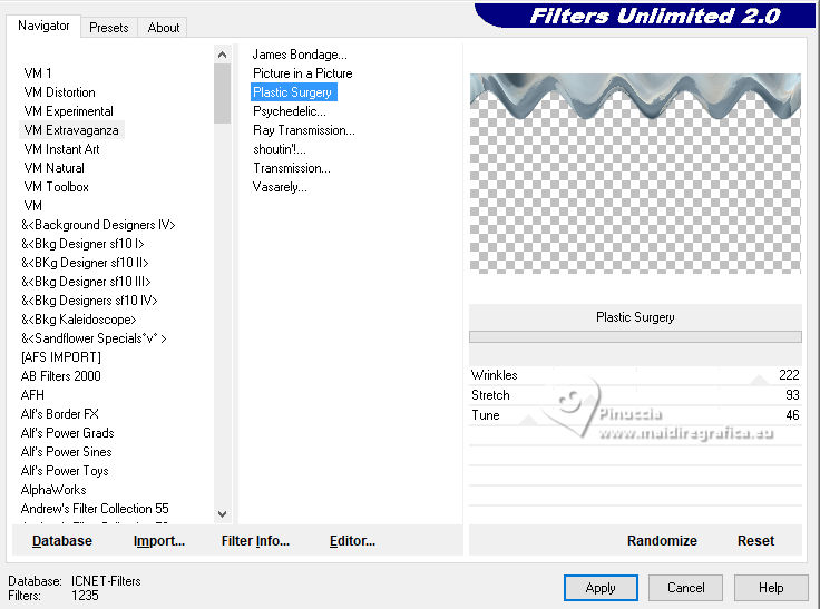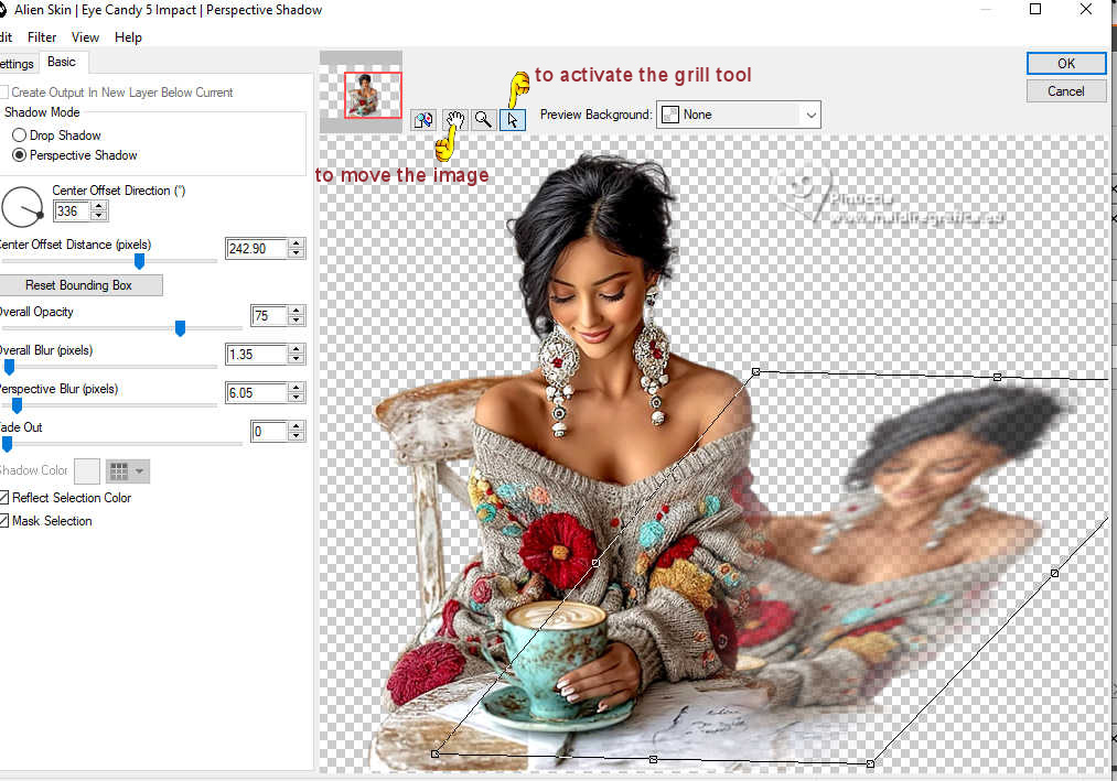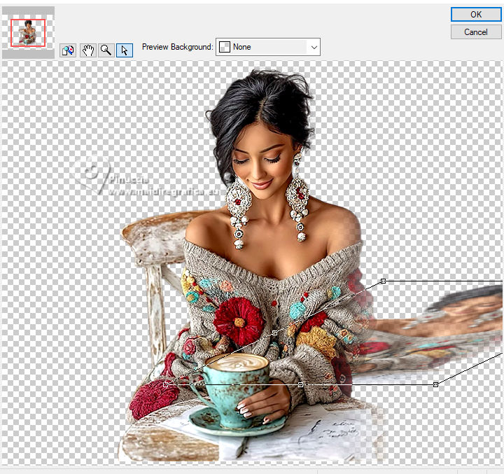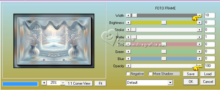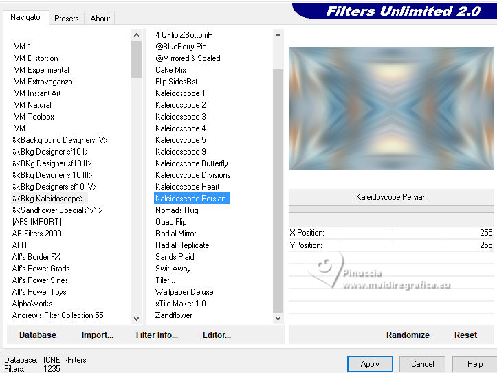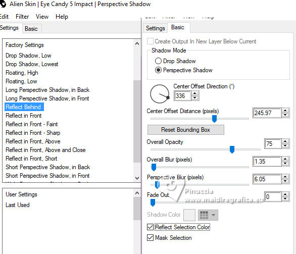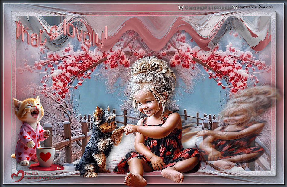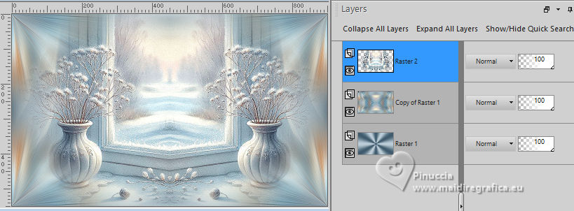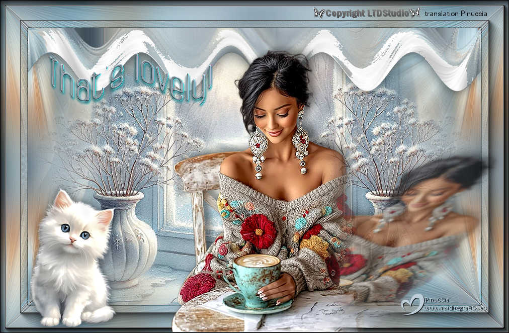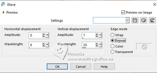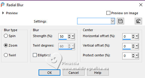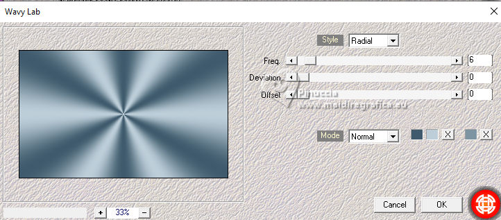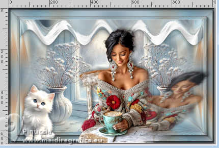 ![]() For this tutorial, you will need: ![]() Thanks for the tubes Beatriz, Cat Dana and Laurette. The rest of the material is by Lady Tess. (you find here the links to the material authors' sites) ![]() ![]() consult, if necessary, my filter section here Filters Unlimited 2.0 here &<Background Kaleidoscope> - Kaleidoscope Persian (to import in Unlimited) here Mehdi - Wavy Lab here Alien Skin Eye Candy 5 Impact - Perspective Shadow here VM Extravaganza - Plastic Surgery here AAA Frames - Foto Frame here Filters VM Extravaganza can be used alone or imported into Filters Unlimited. (How do, you see here) If a plugin supplied appears with this icon ![]() You can change Blend Modes according to your colors. ![]() Copy the Selection in the Selections Folder Colors ![]() 1. Set your foreground color to #bdced9 and your background color to #3e5a6c. ![]() color 3 #ffffff color 4 #000000 2. Open a new transparent image 900 x 550 pixels. Effects>Plugins>Mehdi - Wavy Lab This filter creates gradients with the colors of your Materials palette. The first is your background color, the second is your foreground color. Keep the last color created by the filtre. ![]() Layers>Duplicate. Adjust>Blur>Gaussian Blur - radius 45. ![]() 3. Layers>New Raster Layer. Selections>Select All. Open 2026 01 19 hiver fenêtre Cat Dana 2 ![]() Edit>Copy. Go back to your work and go to Edit>Paste into Selection. Selections>Select None. 4. Layers>Merge>Merge Down. Effects>Image Effects>Seamless Tiling, default settings. ![]() Adjust>Blur>Radial Blur ![]() 5. Effects>Plugins>Filters Unlimited 2.0 - &<Bkg Kaleidoscope> - Kaleidoscope Persian, default settings ![]() Effects>Edge Effects>Enhance More. Open 2026 01 19 hiver fenêtre Cat Dana 5 ![]() Edit>Copy. Go back to your work and go to Edit>Paste as new layer. 6. Image>Resize, to 80%, resize all layers not checked. Effects>Image Effects>Offset. ![]() Effects>Reflection Effects>Rotating Mirror, default settings. ![]() 7. We have this ![]() 8. Selections>Load/Save Selection>Load Selection from Disk. Look for and load the selection LTDLovely_sel_1 ![]() Activate the central layer, Copy of Raster 1. Selections>Promote Selection to Layer. Layers>Arrange>Bring to Top. Selections>Select None. 9. Effects>Distortion Effects>Wave ![]() Effects>Plugins>Filters Unlimited 2.0 - VM Extravaganza - Plastic Surgery ![]() attention,please. If you are using the Unlimiged version 2.3, your result will be different ![]() Activate the layer below Move the tube slightly down (optional).10. We have this ![]() with Unlimited 2.3 ![]() 11. Activate your top layer. Effects>3D Effects>Drop Shadow, color #000000. ![]() Edit>Repeat Drop Shadow. 12. Activate the layer Copy of Raster 1 - the second from the bottom. Edit>Copy. Edit>Copy as new image, and minimize this image. Go back to your work. Image>Add Borders, 1 pixel, symmetric, color #ffffff. 13. Selections>Select All. Image>Add Borders, 55 pixels, symmetric, color #ffffff. Selections>Invert. Edit>Paste into Selection - the image of step 12 is still in memory. 14. Effects>Edge Effects>Enhance. Effects>Plugins>AAA Frames - Foto Frame ![]() Repeat Effects>Plugins>AAA Frames - Foto Frame, width 10 and opacity 100 ![]() Selections>Select None. 15. Open 5006-woman-LBTUBES ![]() Edit>Copy. Go back to your work and go to Edit>Paste as new layer. Image>Resize, to 90%, resize all layers not checked. Objects>Align>Bottom. K key to activate your Pick Tool ![]() Position X: 340,00 - Position Y: 92,00. ![]() M key to deselect the Tool. 16. Effects>Plugins>Alien Skin Eye Candy 5 Impact - Perspective Shadow. Select the preset Reflect Behind with these settings ![]() According to your tube, you can adjust the shadow, using the nodes of the tool ![]() For my example, I did this ![]() 17. Effects>3D Effects>Drop Shadow, color #000000. ![]() Adjust>Sharpness>Sharpen. 18. Open divers_chaton_7_laurette ![]() Edit>Copy. Go back to your work and go to Edit>Paste as new layer. Image>Resize, to 55%, resize all layers not checked. Move the tube to the left, see my example. >Effects>3D Effects>Drop Shadow, color #000000. ![]() 19. Open LTDStudio_ThatsLovely_Texto ![]() Edit>Copy. Go back to your work and go to Edit>Paste as new layer. Layers>Duplicate (optional). Layers>Merge>Merge Down. Move the tube to your liking20. Sign your work on a new layer. Add the watermarks of the author and of the translator. Layers>Merge>Merge All and save as jpg. ![]() Versions with my tubes from Pinterest images ![]() ![]() Your versions. Thanks![]() If you have problems or doubts, or you find a not worked link, or only for tell me that you enjoyed this tutorial, write to me. |