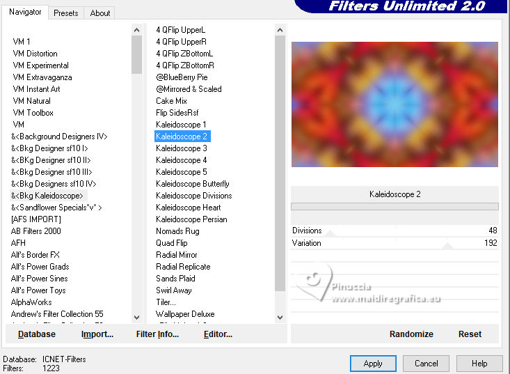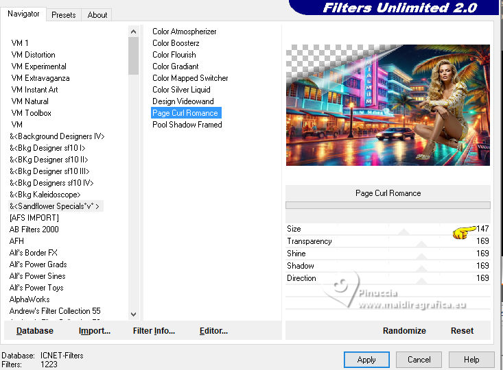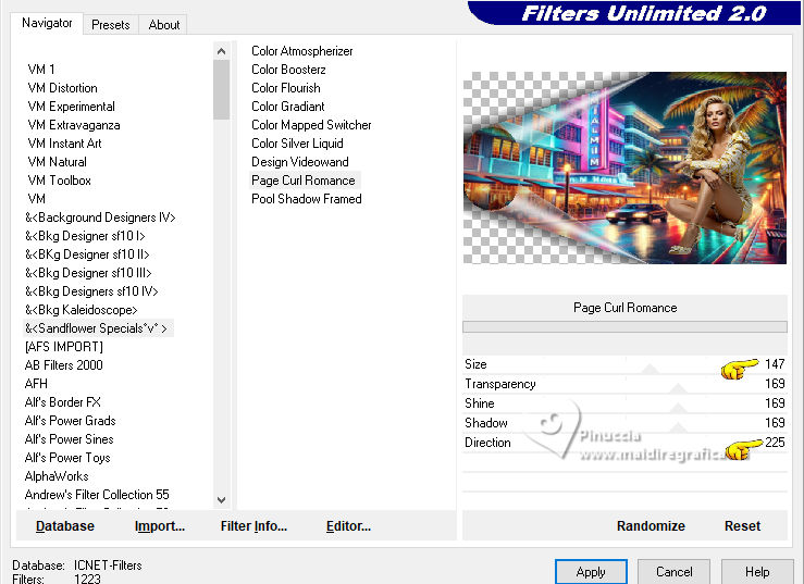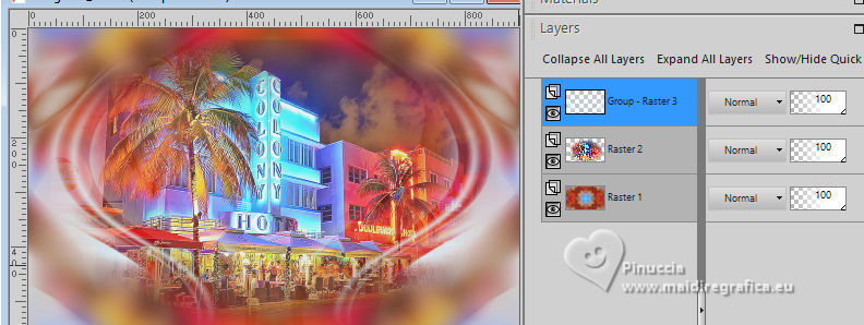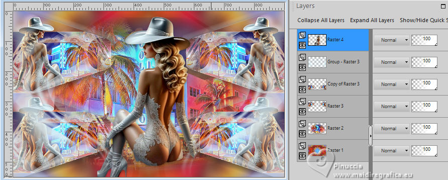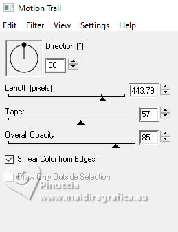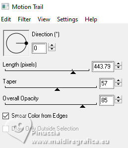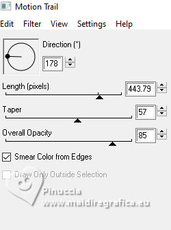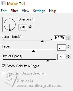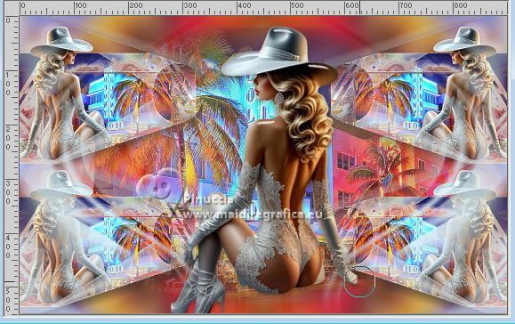 ![]() For this tutorial, you will need: ![]() Thanks for the tubes Clo and for the mask Narah. The rest of the material is by Lady Tess. (you find here the links to the material authors' sites) ![]() ![]() consult, if necessary, my filter section here Filters Unlimited 2.0 here &<Background Kaleidoscope> - Kaleidoscope 2 (to import in Unlimited) here Alien Skin Eye Candy 5 Impact - Glass, Perspective Shadow here Eye Candy 4000 - Motion Trail here Sandflowers Flowers - Curl Romance (to import in Unlimited) here ![]() You can change Blend Modes according to your colors. ![]() Copy the Selection in the Selections Folder Open the mask in PSP and minimize it with the rest of the material. 1. Set your foreground color to #dbeef5 and your background color to #3395b7. ![]() color 3 #ffffff 2. Open a new transparent image 900 x 550 pixels. Selections>Select All. Open Miami_image1 ![]() Edit>Copy. Go back to your work and go to Edit>Paste into Selection. Selections>Select None. 3. Effects>Image Effects>Seamless Tiling, default settings. ![]() Adjust>Blur>Gaussian Blur - radius 20 ![]() Effects>Plugins>Filters Unlimited 2.0 - &<Bkg Kaleidoscope> - Kaleidoscope 2, default settings ![]() 4. Open tube_miami ![]() Edit>Copy. Go back to your work and go to Edit>Paste as new layer. Image>Resize, to 80%, resize all layers not checked. Layers>Duplicate. Layers>Merge>Merge Down. Ajust>Sharpness>Sharpen. 5. Layers>New Raster Layer. Flood Fill the layer with your foreground color #dbeef5.Layers>New Mask layer>From image Open the menu under the source window and you'll see all the files open. Select the mask NarahsMasks_1530. ![]() Layers>Merge>Merge Group. Effects>Reflection Effects>Rotating Mirror, default settings. ![]() 6. We have this: ![]() ****** To realize the MIAMI_IMAGE: 1. Open a new transparent image 500 x 300 pixels. Selections>Select All. Open the miami_image1 - your background image. Edit>Copy. Go back to your work and go to Edit>Paste into Selection. Selections>Select None. 2. Layers>Duplicate. Open your woman's tube and go to Edit>Copy. Go back to your work and go to Edit>Paste as new layer. Image>Resize - Here you decide the size until it fits inside the frame and to the right. Adjust>Sharpness>Sharpen. 3. Layers>Merge>Merge Down (close the layer below). Effects>Plugins>Filters Unlimited 2.0 - &<Sandflower Specials°v°> - Page Curl Romance ![]() Again Effects>Plugins>Filters Unlimited 2.0 - &<Sandflower Specials°v°> - Page Curl Romance ![]() 4. Result ![]() Image>Resize ![]() END OF THE REALISATION ****** 7. Open Miami_image ![]() Edit>Copy. Go back to your work and go to Edit>Paste as new layer. Objects>Align>Top. Objects>Align>Right. Layers>Arrange>Move Down. 8. Layers>Duplicate. Image>Mirror>Mirror horizontal. Layers>Merge>Merge Down. Ajdust>Sharpness>Sharpen More. 9. Layers>Duplicate. Objects>Align>Bottom Activate your top layer. Layers>New Raster Layer. 10. Selections>Load/Save Selection>Load Selection from Disk. Look for and load the selection ThinkingYou_Sel_1 ![]() Open Woman3274_byClo ![]() Edit>Copy. Go back to your work and go to Edit>Paste into Selection. Adjust>Sharpness>Sharpen More. Selections>Select None. 11. Effects>Plugins>Alien Skin Eye Candy 5 Impact - Glass Select the preset Clear with these settings Glass color: background color ![]() We lowered the girl slightly - We erased part of the glove on her right hand![]() 12. We have this ![]() 13. Image>Add Borders, 1 pixel, symmetric, color #ffffff. Selections>Select All. Image>Add Borders, 55 pixels, symmetric, color #ffffff. 14. Effects>Image Effects>Seamless Tiling, default settings. ![]() Selections>Invert. Adjust>Blur>Gaussian Blur - radius 10 ![]() Selections>Invert. 15. Effects>Plugins>Eye Candy 4000 - Motion Trail ![]() Repeat Motion Trail, Direction 0 ![]() Repeat Motion Trail, Direction 90 ![]() Repeat Motion Trail, Direction 270 ![]() Selections>Select None. 16. Open Man105_byClo ![]() Edit>Copy. Go back to your work and go to Edit>Paste as new layer. Image>Resize, to 65%, resize all layers not checked. K key to activate your Pick Tool ![]() Position X: 28,00 - Position Y: 41,00. ![]() M key to deselect the Tool. Reduce the opacity of this layer to 71%. Effects>Plugins>Alien Skin Eye Candy 5 Impact - Perpective Shadow Preset Drop,Shadow Lowest with these settings. ![]() Adjust>Sharpness>Sharpen More. 17. Open LTDStudio_ThinkingYou_Texto ![]() Edit>Copy. Go back to your work and go to Edit>Paste as new layer. Move the tube to your liking(For me: Objects>Top; Objects>Align>Horizontal Center). 18. Sign your work on a new layer. Add the watermarks of the author and of the translator. Image>Add Borders, 1 pixel, symmetric, color #ffffff. 19. Save as jpg. ![]() Versions with my tubes from Pinterest images ![]() ![]() Your versions. Thanks![]() If you have problems or doubts, or you find a not worked link, or only for tell me that you enjoyed this tutorial, write to me. |
