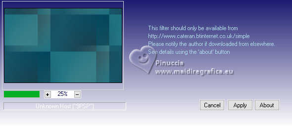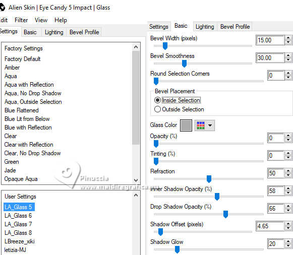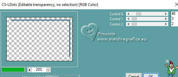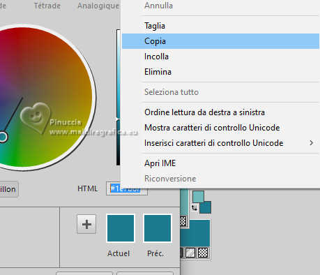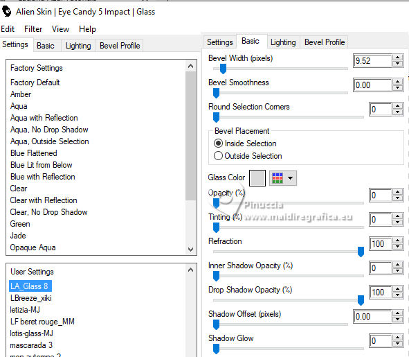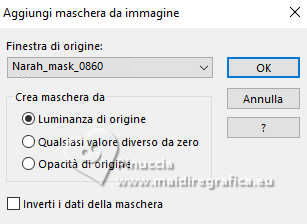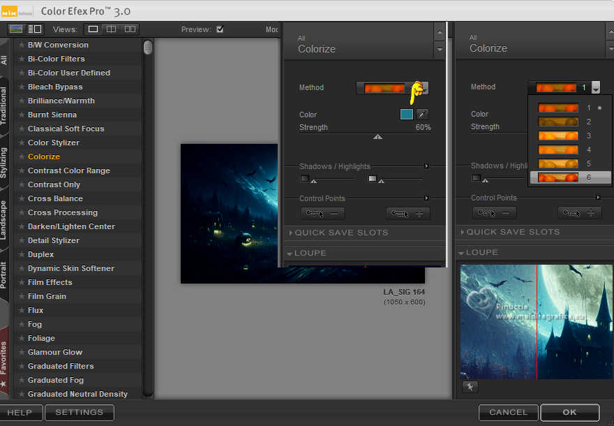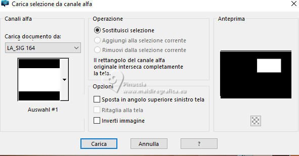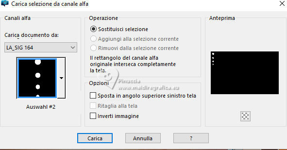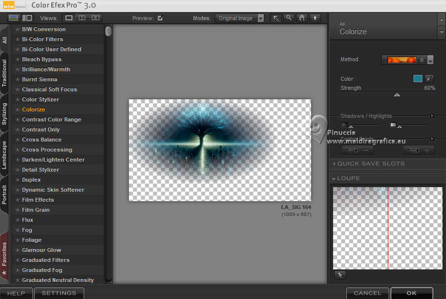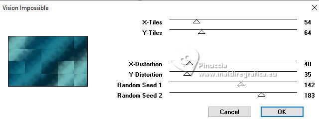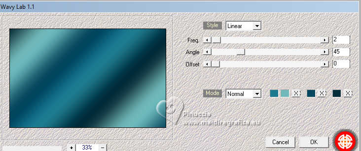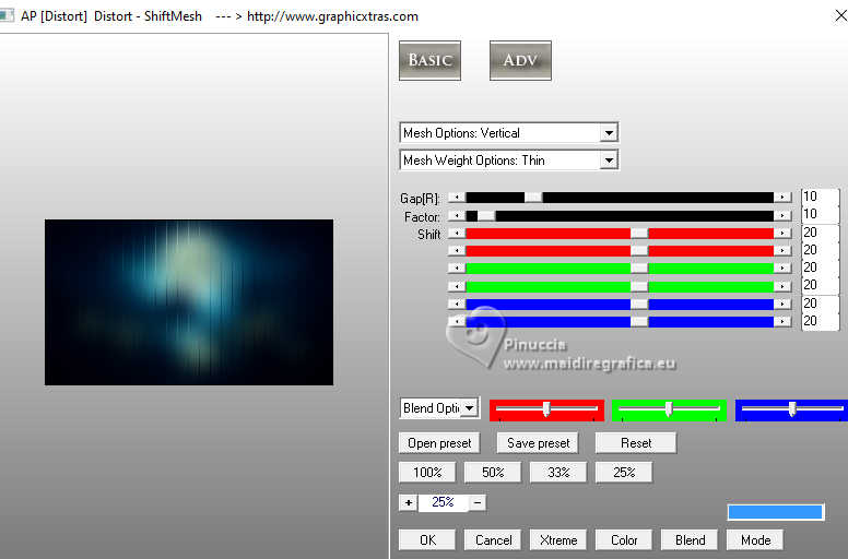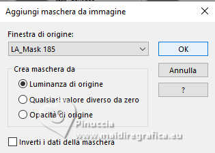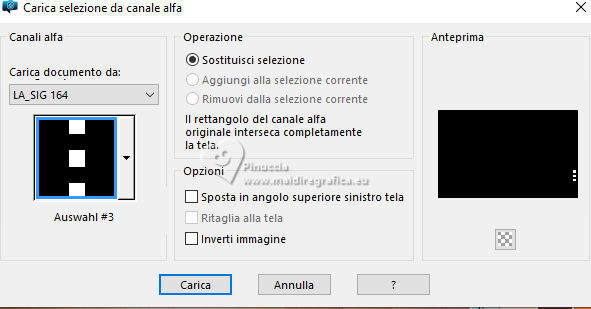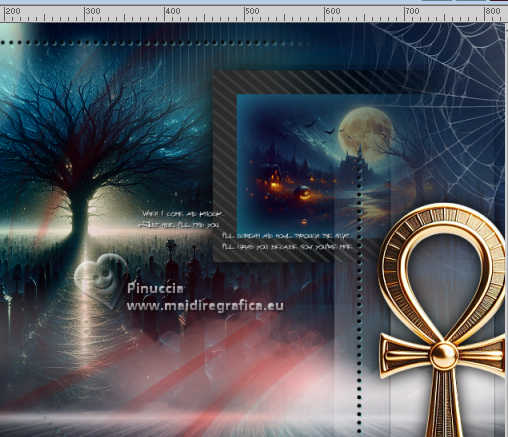 qui puoi trovare qualche risposta ai tuoi dubbi. Se l'argomento che ti interessa non è presente, ti prego di segnalarmelo. Il copyright del tutorial appartiene a Laguna Azul. Questo tutorial è stato creato con PspX9 e tradotto con CorelX e CorelX2, ma può essere realizzato anche con le altre versioni di PSP. Dalla versione X4, il comando Immagine>Rifletti è stato sostituito con Immagine>Capovolgi in orizzontale, e il comando Immagine>Capovolgi con Immagine>Capovolgi in verticale. Nelle versioni X5 e X6, le funzioni sono state migliorate rendendo disponibile il menu Oggetti. Con la nuova versione X7, sono tornati Rifletti>Capovolgi, ma con nuove varianti. Vedi la scheda sull'argomento qui Traduzione francese/traduction en français qui Le vostre versioni quiOccorrente: 1 immagine con sfondo scuro 1050 x 600 pixels (facoltativa) 1 misted con cimitero 875 x 500 pixels (facoltativo Il resto del materiale ![]() Per due maschere grazie Narah. Il resto del materiale è di Laguna Azul. I tubes delle mie versioni sono miei, realizzati da immagini di Pinterest. (in questa pagina trovi i links ai siti dei creatori di tubes) Filtri in caso di dubbi, ricorda di consultare la mia sezione filtri qui Filters Unlimited 2.0 qui AP Distort SwiftMesh qui Carolaine and Sensibility - CS-BRectangle, CS-LDots qui Graphics Plus - Cross Shadow qui Nik Software - Color Efex Pro qui Simple - Quick Tile qui Mehdi - Wavy Lab 1.1. qui Mehdi - Weaver qui Alien Skin Eye Candy 5 Impact - Glass qui VM Distortion - Smallpox, Vision Impossible qui I filtri Simple, Graphics Plus e VM Distortion si possono usare da soli o importati in Filters Unlimited (come fare vedi qui) Se un filtro fornito appare con questa icona ![]() non esitare a cambiare modalità di miscelatura e opacità secondo i colori utilizzati. Metti i presets Cliccando sul file una o due volte (a seconda delle tue impostazioni), automaticamente il preset si installerà nella cartella corretta. perchè uno o due clic vedi qui ![]() Ouvrir les masque dans PSP et les minimiser avec le reste du matériel. Apri il file LA_FARBEN ![]() e spostalo nell'angolo in alto a destra del tuo PSP. Il primo colore (Raster 1) è il colore bianco Scegli un colore dal centro del tuo tube (i colori non devono essere troppo vivaci) Riempi il livello Colore 2. Tutto dovrebbe essere tono su tono Ora, scegli un colore leggermente più scuro dal tube, e riempi il livello Colore 3. Mantieni il colore corrente e rendilo un po' più scuro, quindi riempi il livello Colore 4. Prendi lo stesso colore ancora più scuro e riempi il livello Colore 5. ![]() 1. Imposta il colore di primo piano con il colore 2 e il colore di sfondo con il colore 3 ![]() Ouvrir LA_SIG 164 Questa immagine, che sarà la base del tuo lavoro non è vuota, ma contiene le selezioni salvate sul canale alfa. Scegli una delle immagini di sfondo, per me ![]() Modifica>Copia. Torna al tuo lavoro e vai a Modifica>Incolla come nuovo livello. Copia il codice del tuo colore di sfondo. (apri la paletta del colore di sfondo, seleziona il codice e Copia) ![]() Effetti>Plugins>Nik Software - Color Efex Pro 3.0 Complete - Colorize Fai clic con il pulsante destro del mouse nel campo "Color" e inserisci il codice copiato del tuo colore di sfondo. Ora vai su Metodo, seleziona il n. 5 o il n. 6 (io userò il n. 6), quindi clicca su OK. ![]() Regola>Sfocatura>Sfocatura gaussiana - raggio 40. ![]() 3. Effetti>Plugins>AP [Distort] - ShiftMesh ![]() Livelli>Nuovo livello raster. Effetti>Plugins>Mehdi - Wavy Lab 1.1. questo filtro lavora con i colori della paletta: il primo è il colore di sfondo (colore 3), il secondo quello di primo piano (colore 2); cambia gli ultimi due colori creati dal filtro: il terzo con il colore 4 e il quarto con il colore 5. ![]() Effetti>Plugins>VM Distortion - Smallpox. ![]() 4. Effetti>Plugins>VM Distortion - Vision Impossible. ![]() Effetti>Effetti di bordo>Aumenta. Effetti>Plugins>Mehdi - Weaver ![]() Effetti>Plugins>Carolaine and Sensibility - CS-BRectangle. ![]() Effetti>Effetti di bordo>Aumenta. Effetti>Plugins>Simple - Quick Tile. ![]() Cambia la modalità di miscelatura di questo livello in Luce diffusa. 5. Livelli>Nuovo livello raster. Riempi il livello con il colore di primo piano (colore 2).Livelli>Nuovo livello maschera>Da immagine. Apri il menu sotto la finestra di origine e vedrai la lista dei files aperti. Seleziona la maschera LA_Mask 184 ![]() Livelli>Unisci>Unisci gruppo. Cambia la modalità di miscelatura di questo livello in Sovrapponi. Livelli>Duplica. 6. Apri uno dei tubes LA_Spiderweb..., per me ![]() Modifica>Copia. Torna al tuo lavoro e vai a Modifica>Incolla come nuovo livello. Tasto K per attivare lo strumento Puntatore ![]() Posizione X: 599,00 - Posizione Y: -161,00 ![]() Cambia la modalità di miscelatura di questo livello in Filtra, e abbassa l'opacità al 70%. Apri il tube LA_Moon ![]() Modifica>Copia. Torna al tuo lavoro e vai a Modifica>Incolla come nuovo livello. Posizione X: -220,00 - Posizione Y: -215,00 ![]() Cambia la modalità di miscelatura di questo livello in Filtra. ![]() 7. Imposta il colore di primo piano con il colore nero. Livelli>Nuovo livello raster. Riempi il livello con il colore nero.Livelli>Nuovo livello maschera>Da immagine. Apri il menu sotto la finestra di origine e seleziona la maschera LA_Mask 186 ![]() Livelli>Unisci>Unisci gruppo. Cambia la modalità di miscelatura di questo livello in Luce diffusa. Livelli>Nuovo livello raster. Imposta il colore di primo piano con il colore bianco. Riempi il livello con il colore bianco.Livelli>Nuovo livello maschera>Da immagine. Apri il menu sotto la finestra di origine e seleziona la maschera LA_Mask 187 ![]() Livelli>Unisci>Unisci gruppo. 8. Apri uno dei tube LA_Cemetry... per me ![]() Modifica>Copia. Torna al tuo lavoro e vai a Modifica>Incolla come nuovo livello. Posizione x: -139,00 - Posizione Y: -7,00. ![]() Tasto M per deselezionare lo strumento. Ricolora il tube appannato con: Effetti>Plugins>Nik Software 
