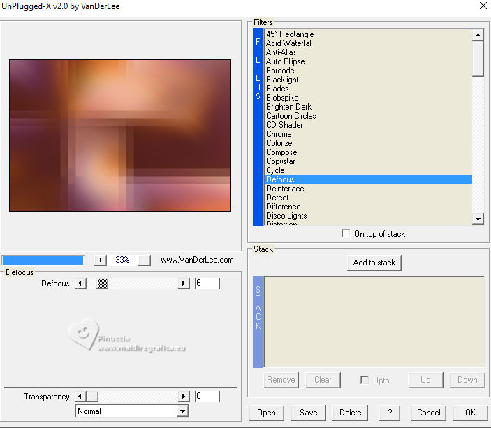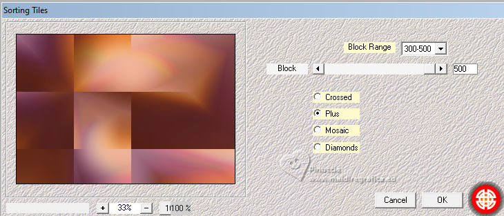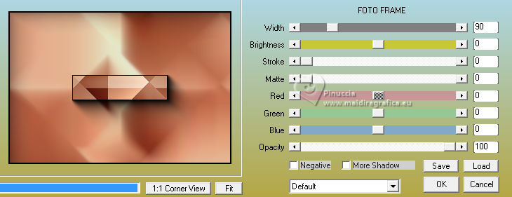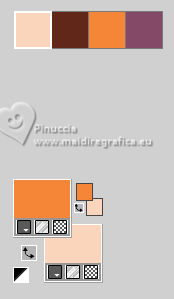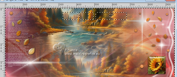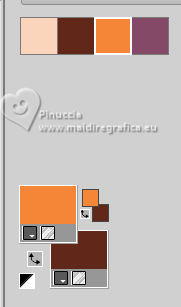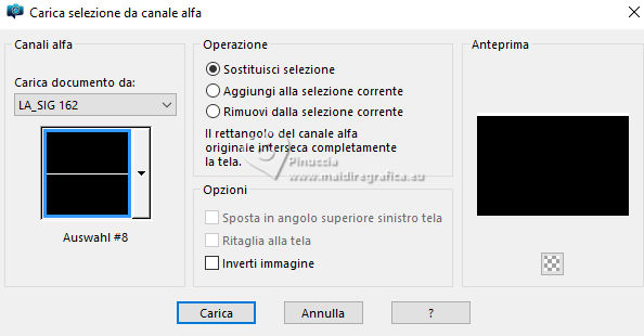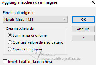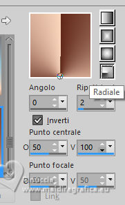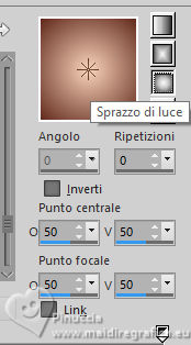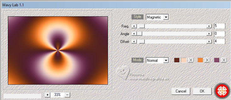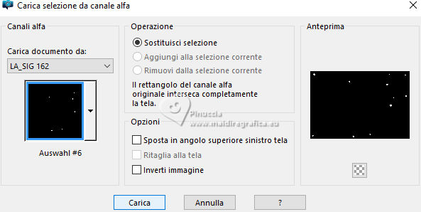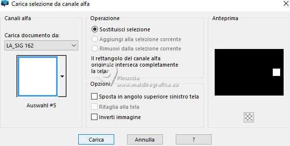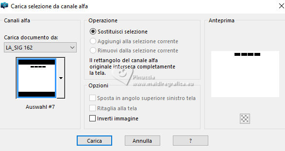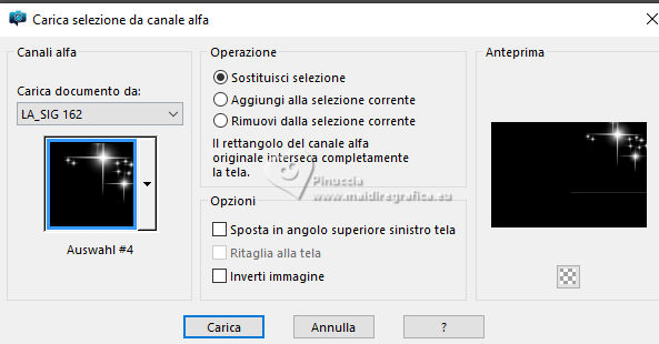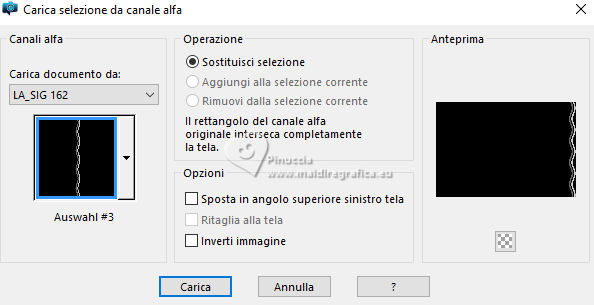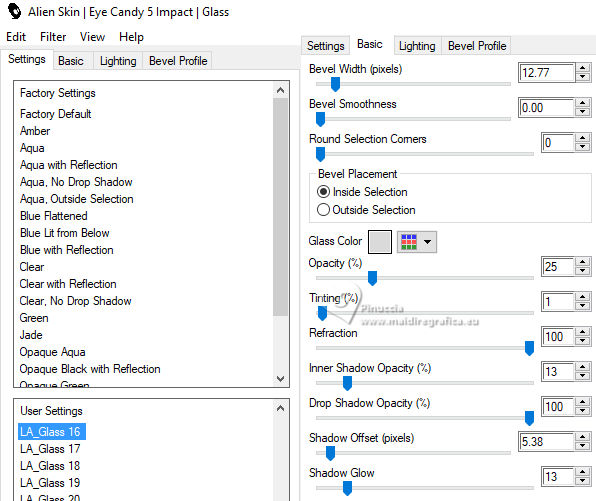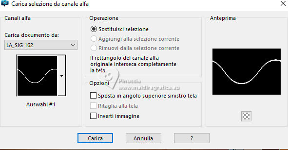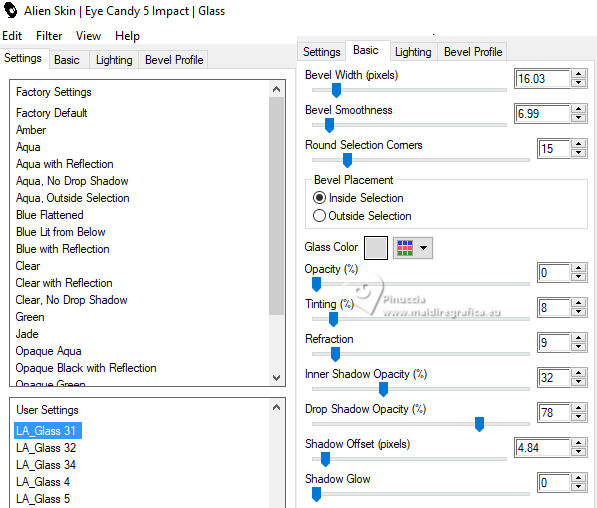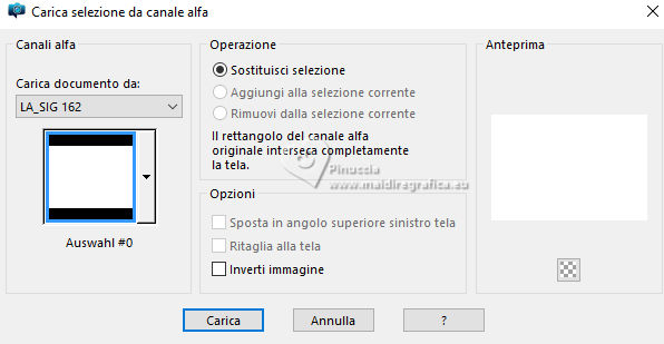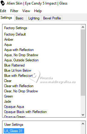 qui puoi trovare qualche risposta ai tuoi dubbi. Se l'argomento che ti interessa non è presente, ti prego di segnalarmelo. Il copyright del tutorial appartiene a Laguna Azul. Questo tutorial è stato creato con PspX9 e tradotto con CorelX e CorelX2, ma può essere realizzato anche con le altre versioni di PSP. Dalla versione X4, il comando Immagine>Rifletti è stato sostituito con Immagine>Capovolgi in orizzontale, e il comando Immagine>Capovolgi con Immagine>Capovolgi in verticale. Nelle versioni X5 e X6, le funzioni sono state migliorate rendendo disponibile il menu Oggetti. Con la nuova versione X7, sono tornati Rifletti>Capovolgi, ma con nuove varianti. Vedi la scheda sull'argomento qui Traduzione francese/traduction en français qui Le vostre versioni quiOccorrente: 1 tube a scelta 1 misted paesaggio 770 x 440 pixels (facoltativo). Il resto del materiale ![]() Per le maschere grazie Narah. Il resto del materiale è di Laguna Azul. Per il tube del mio esempio grazie Lady Valella. (in questa pagina trovi i links ai siti dei creatori di tubes) Filtri in caso di dubbi, ricorda di consultare la mia sezione filtri qui Filters Unlimited 2.0 qui AAA Frames - Foto Frame qui Mehdi - Wavy Lab 1.1. qui Mehdi - Sorting Tiles qui Alien Skin Eye Candy 5 Impact - Glass qui VanDerLee - Unplugged-X qui ![]() non esitare a cambiare modalità di miscelatura e opacità secondo i colori utilizzati. Nelle ultime versioni di PSP non c'è il gradiente di primo piano/sfondo (Corel_06_029) Puoi usare i gradienti delle versioni precedenti. Trovi qui i gradienti Corel X. Metti i presets Cliccando sul file una o due volte (a seconda delle tue impostazioni), automaticamente il preset si installerà nella cartella corretta. perchè uno o due clic vedi qui ![]() Apri le maschere in PSP e minimizzale con il resto del materiale. Apri il file LA_FARBEN ![]() e spostalo nell'angolo in alto a destra del tuo PSP. Ora scegli un colore abbastanza chiaro dal tuo tube, (i colori non devono essere troppo vivaci) Riempi il livello Colore 1. Ora scegli dal tube un colore scuro adatto, ma non troppo scuro, e usalo per riempire il livello Colore 2. Ora ti serve un colore medio leggermente più intenso che si abbini agli altri due colori; questo sarà il Colore 3. Ora scegli un colore medio di diversa tonalità, che sarà il Colore 4. ![]() 1. Imposta il colore di primo piano con il colore 1 e il colore di sfondo con il colore 2 ![]() Apri LA_SIG 162 Questa immagine, che sarà la base del tuo lavoro non è vuota, ma contiene le selezioni salvate sul canale alfa. Effetti>Plugins>Mehdi - Wavy Lab 1.1. questo filtro lavora con i colori della paletta: il primo è il colore di sfondo, il secondo quello di primo piano; cambia gli ultimi due colori creati dal filtro: il terzo con il colore 3 e il quarto con il colore 4. ![]() Regola>Sfocatura>Sfocatura gaussiana - raggio 50. ![]() Effetti>Plugins>Mehdi - Sorting Tiles. ![]() 3. Effetti>Plugins>VanDerLee - Unplugged-X - Defocus ![]() Livelli>Duplica. Cambia la modalità di miscelatura di questo livello in Filtra, e abbassa l'opacità al 40%. 4. Passa il colore di primo piano a Gradiente di primo piano/sfondo, stile Radiale. ![]() Livelli>Nuovo livello raster. Riempi il livello con il gradiente.Livelli>Duplica. Immagine>Ruota per gradi - 90 gradi a destra. ![]() 5. Effetti>Effetti di immagine>Motivo unico. ![]() Cambia la modalità di miscelatura di questo livello in Luce diffusa. Livelli>Unisci>Unisci giù. Selezione>Carica/Salva selezione>Carica selezione da canale alfa. Apri il menu delle selezioni e carica la selezione Auswahl #0 ![]() Immagine>Ritaglia la selezione. Effetti>Plugins>Mehdi - Sorting Tiles ![]() Effetti>Effetti di bordo>Aumenta. 6. Effetti>Plugins>AAA Frames - Foto Frame. ![]() Immagine>Ruota per gradi, con i settaggi precedenti. ![]() Effetti>Plugins>VanDerLee - Unplugged-X - Defocus, con i settaggi precedenti. Tasto K per attivare lo strumento Puntatore ![]() Posizione X: 355,00 - Posizione Y: -225,00. ![]() Tasto M per deselezionare lo strumento. Cambia la modalità di miscelatura di questo livello in Luce diffusa. 7. Apri uno dei tube LA_Scene.... per me ![]() Modifica>Copia. Torna al tuo lavoro e vai a Modifica>Incolla come nuovo livello. Imposta il tuo colore di sfondo con un colore un po' più scuro, e imposta il colore di primo piano a Gradiente di primo piano/sfondo, stile Sprazzo di luce. ![]() Livelli>Nuovo livello raster. Selezione>Carica/Salva selezione>Carica selezione da canale alfa. La selezione Auswahl #1 è subito disponibile. Devi soltanto cliccare Carica. ![]() Riempi la selezione con il gradiente.Selezione>Deseleziona. Effetti>Effetti 3D>Sfalsa ombra, colore bianco. ![]() Cambia la modalità di miscelatura di questo livello in Luce diffusa. 8. Livelli>Nuovo livello raster. Selezione>Carica/Salva selezione>Carica selezione da canale alfa. Apri il menu delle selezioni e carica la selezione Auswahl #2 ![]() Riempi la selezione con il gradiente.Selezione>Deseleziona. Effetti>Effetti 3D>Sfalsa ombra, con i settaggi precedenti. Cambia la modalità di miscelatura di questo livello in Sovrapponi. Imposta il colore di primo piano con il colore 4. ![]() Livelli>Nuovo livello raster. Riempi il livello con il colore di primo piano.Livelli>Nuovo livello maschera>Da immagine Apri il menu sotto la finestra di origine e vedrai la lista dei files aperti. Seleziona la maschera Narah_mask_1250 ![]() Livelli>Unisci>Unisci gruppo. Cambia la modalità di miscelatura di questo livello in Filtra. 9. Imposta il colore di primo piano con il colore bianco ![]() Livelli>Nuovo livello raster. Selezione>Carica/Salva selezione>Carica selezione da canale alfa. Apri il menu delle selezioni e carica la selezione Auswahl #3 ![]() Riempi la selezione con il colore bianco di primo piano.Livelli>Nuovo livello raster. Selezione>Carica/Salva selezione>Carica selezione da canale alfa. Apri il menu delle selezioni e carica la selezione Auswahl #4 ![]() Riempi la selezione con il colore bian