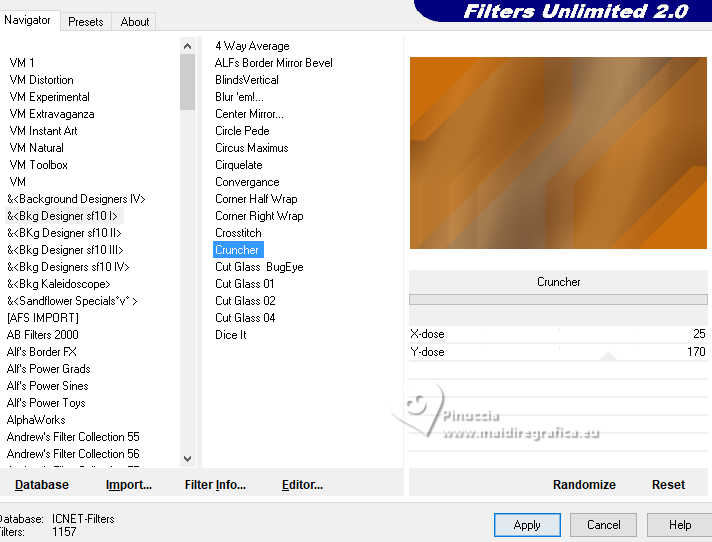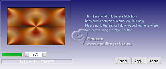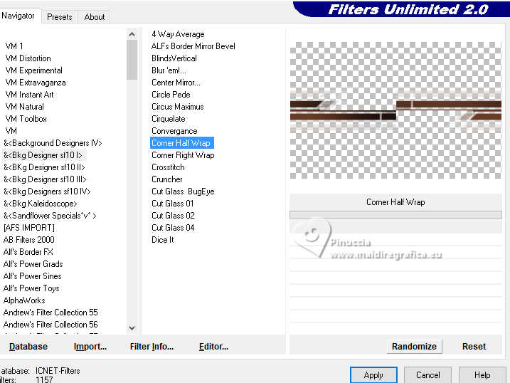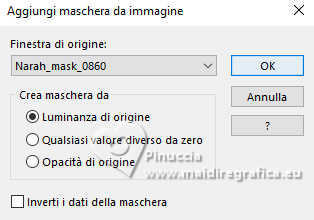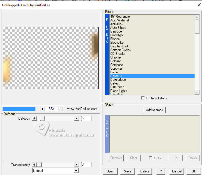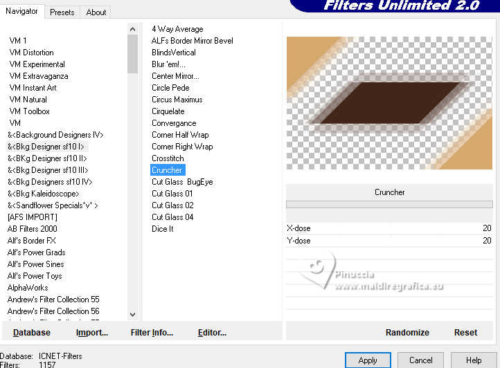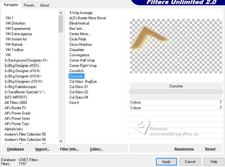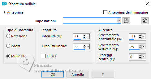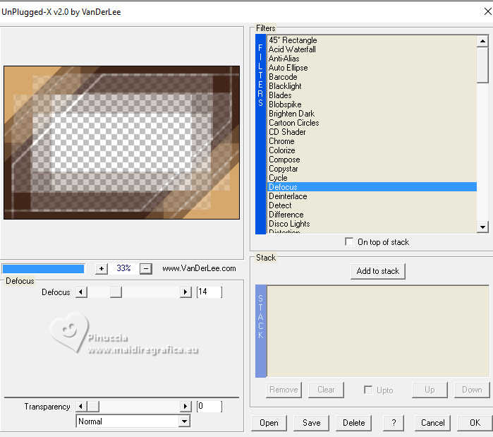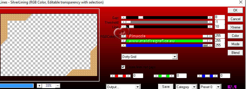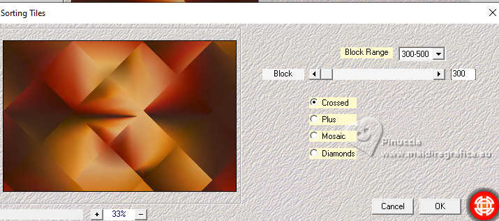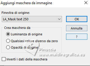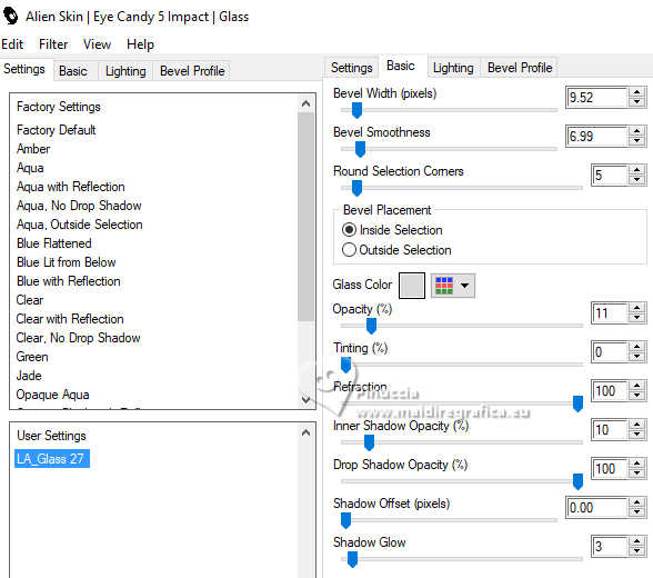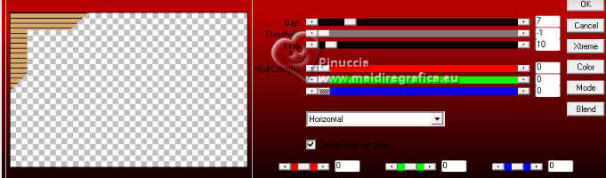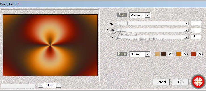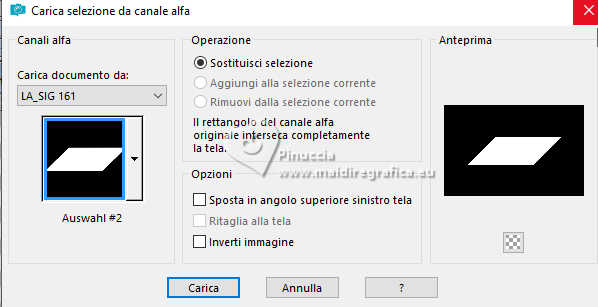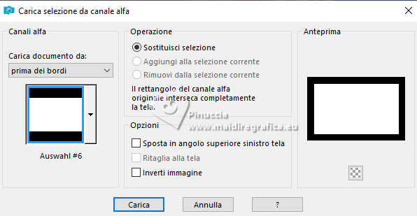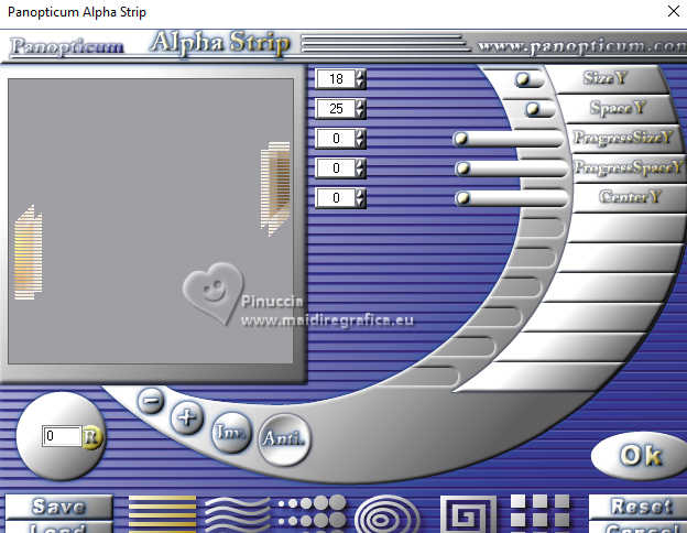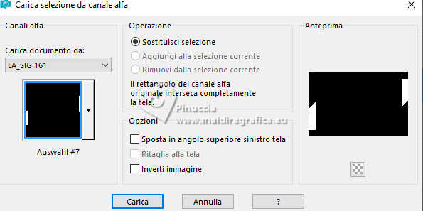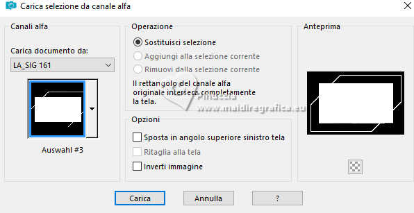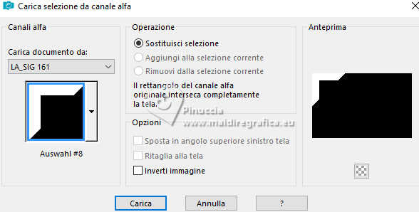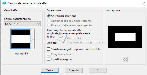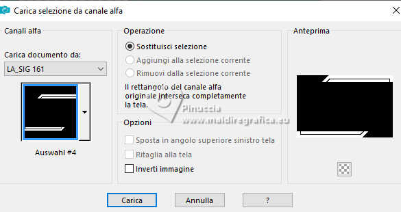 qui puoi trovare qualche risposta ai tuoi dubbi. Se l'argomento che ti interessa non è presente, ti prego di segnalarmelo. Il copyright del tutorial appsamiene a Laguna Azul. Questo tutorial è stato creato con PspX9 e tradotto con CorelX e CorelX2, ma può essere realizzato anche con le altre versioni di PSP. Dalla versione X4, il comando Immagine>Rifletti è stato sostituito con Immagine>Capovolgi in orizzontale, e il comando Immagine>Capovolgi con Immagine>Capovolgi in verticale. Nelle versioni X5 e X6, le funzioni sono state migliorate rendendo disponibile il menu Oggetti. Con la nuova versione X7, sono tornati Rifletti>Capovolgi, ma con nuove varianti. Vedi la scheda sull'argomento qui Traduzione francese/traduction en français qui Le vostre versioni quiOccorrente: 1 tube a scelta 1 misted 308x308 pixels corrispondente al tuo tube (facoltativo). Il resto del materiale ![]() Per 1 maschera grazie Narah. Il resto del materiale è di Laguna Azul. Per il tube del mio esempio grazie Tatty Things. (in questa pagina trovi i links ai siti dei creatori di tubes) Filtri in caso di dubbi, ricorda di consultare la mia sezione filtri qui Filters Unlimited 2.0 qui &<Bkg Designer sf10I> - Cruncher, Corner Half Wrap qui Mehdi - Wavy Lab 1.1. qui Mehdi - Sorting Tiles, Weaver qui VM Toolbox - Zoom Blur qui Alien Skin Eye Candy 5 Impact - Glass qui AP 01 ]Innovations] - Lines SilverLining qui Carolaine and Sensibility - CS-DLines, CS-texture, CS-Reflections qui Graphics Plus - Cross Shadow qui Panopticum - PAN Alpha Strip qui Simple - Quick Tile qui Mura's Meister - Cloud qui VanDerLee - Unplugged-X qui I filtri VM Toolbox, Graphics Plus e Simple si possono usare da soli o importati in Filters Unlimited (come fare vedi qui) Se un filtro fornito appare con questa icona ![]() non esitare a cambiare modalità di miscelatura e opacità secondo i colori utilizzati. Nelle ultime versioni di PSP non c'è il gradiente di primo piano/sfondo (Corel_06_029) Puoi usare i gradienti delle versioni precedenti. Trovi qui i gradienti Corel X. Metti il preset Cliccando sul file una o due volte (a seconda delle tue impostazioni), automaticamente il preset si installerà nella cartella corretta. perchè uno o due clic vedi qui ![]() Apri le maschere in PSP e minimizzale con il resto del materiale. Apri il file LA_FARBEN ![]() e spostalo nell'angolo in alto a destra del tuo PSP. Seleziona un colore scuro dal tuo tube, e riempi il livello Colore 1. Ora seleziona un colore chiaro diverso dal tuo tube, e riempi il livello Colore 2. Seleziona di nuovo un colore diverso dal tuo tube; dovrebbe essere nella gamma di colori intermedia e può essere un po' più vivace. Usalo per riempire il livello Colore 3. seleziona ancora un colore diverso dal tuo tube; anche questo può essere un po' più vivace e dovrebbe essere nella gamma di colori intermedia. Riempi il livello Colore 4 con questo colore. ![]() Ti serviranno anche i colori bianco e nero. 1. Apri LA_SIG 161 Questa immagine, che sarà la base del tuo lavoro non è vuota, ma contiene le selezioni salvate sul canale alfa. 2. Imposta il colore di primo piano con il colore 1, e il colore di sfondo con il colore 2. ![]() Effetti>Plugins>Mehdi - Wavy Lab 1.1. questo filtro lavora con i colori della paletta: il primo il colore di sfondo, il secondo quello di primo piano; cambia gli ultimi due colori creati dal filtro: il terzo con il colore 3 e il quarto con il colore 4. ![]() Effetti>Plugins>VM Toolbox - Zoom Blur. ![]() Livelli>Duplica. Attiva il livello inferiore. Effetti>Plugins>Simple - Quick Tile. ![]() Regola>Sfocatura>Sfocatura gaussiana - raggio 50. ![]() 3. Attiva il livello superiore. Effetti>Plugins>Mehdi - Sorting Tiles. ![]() Effetti>Effetti di bordo>Aumenta di più. Cambia la modalità di miscelatura di questo livello in Luce diffusa. 4. Livelli>Nuovo livello raster. Passa il colore di sfondo a Gradiente di primo piano/sfondo, stile Sprazzo di luce. ![]() Riempi il livello con il gradiente.Effetti>Plugins>Simple - Quick Tile. ![]() Effetti>Effetti geometrici>Inclina - colore 3. ![]() Effetti>Plugins>Filters Unlmited 2.0 - &<Bkg Designer sf10I> - Cruncher. ![]() Effetti>Effetti di bordo>Aumenta. Abbassa l'opacità di questo livello al 70%. 5. Livelli>Nuovo livello raster. Selezione>Carica/Salva selezione>Carica selezione da canale alfa. La selezione Auswahl #1 è subito disponibile. Devi soltanto cliccare Carica. ![]() Riempi la selezione con il colore di primo piano (colore 1) ![]() Selezione>Deseleziona. Effetti>Effetti geometrici>Inclina - colore 2. ![]() Effetti>Plugins>Filters Unlimited 2.0 - &<Bkg Designer sf10I> - Cruncher, con i settaggi standard. ![]() Rimani su questo livello. Selezione>Carica/Salva selezione>Carica selezione da canale alfa. Apri il menu delle selezioni e carica la selezione Auswahl #2 ![]() Effetti>Plugins>Carolaine and Sensibility - CS-DLines ![]() Selezione>Deseleziona. Effetti>Plugins>Simple - Quick Tile. ![]() 6. Livelli>Nuovo livello raster. Riporta il colore di sfondo a Colore. Riempi con il colore di sfondo (colore 2) ![]() Livelli>Nuovo livello maschera>Da immagine Apri il menu sotto la finestra di origine e vedrai la lista dei files aperti. Seleziona la maschera Narah_mask_0860 ![]() Livelli>Unisci>Unisci gruppo. Cambia la modalità di miscelatura di questo livello in Rafforza. 7. Livelli>Nuovo livello raster. Riempi con il colore di primo piano (colore 1) ![]() Effetti>Effetti geometrici>Inclina - colore 2. ![]() Selezione>Carica/Salva selezione>Carica selezione da canale alfa. Apri il menu delle selezioni e carica la selezione Auswahl #3 ![]() Premi sulla tastiera il tasto CANC ![]() Selezione>Deseleziona. Effetti>Plugins>VanDerLee - Unplugged-X - Defocus ![]() 8. Livelli>Nuovo livello raster. Selezione>Carica/Salva selezione>Carica selezione da canale alfa. Apri il menu delle selezioni e carica la selezione Auswahl #4 ![]() Riempi la selezione con il colore di primo piano (colore 1) ![]() Selezione>Deseleziona. Effetti>Plugins
