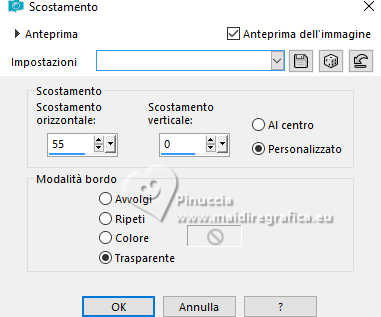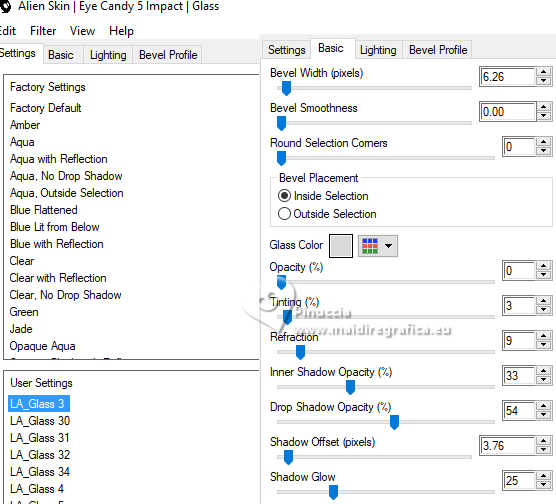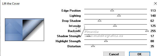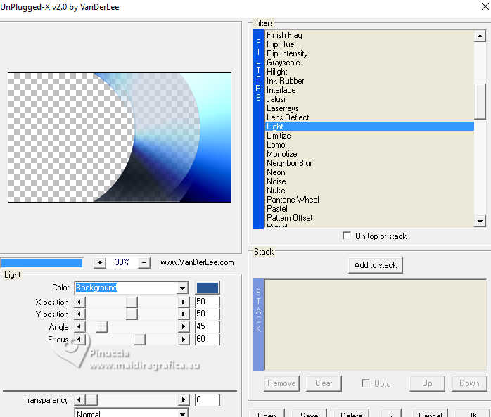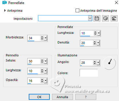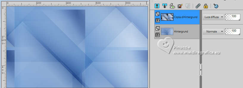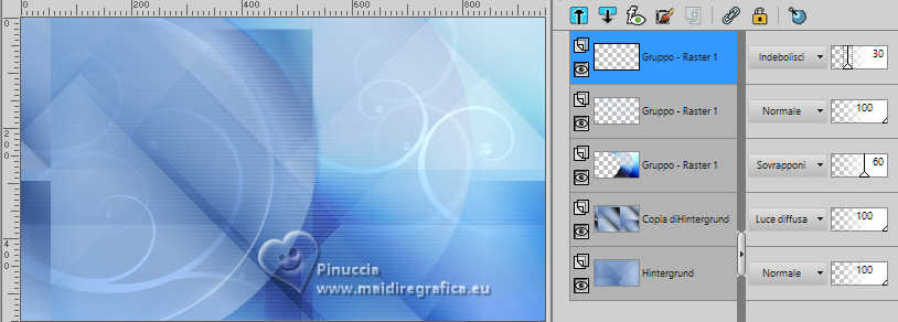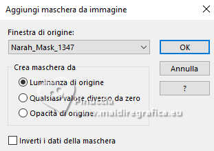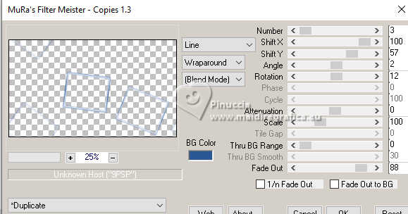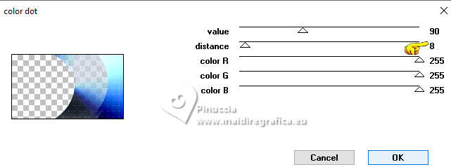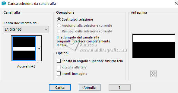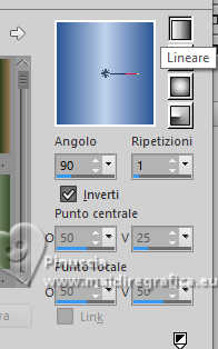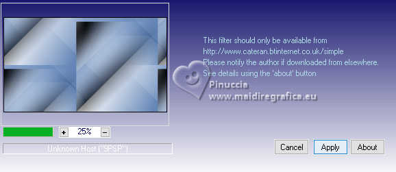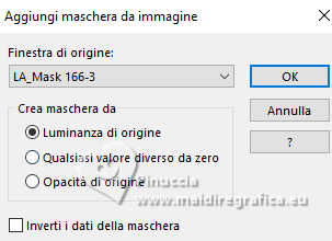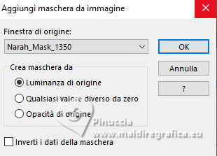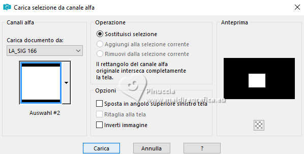 qui puoi trovare qualche risposta ai tuoi dubbi. Se l'argomento che ti interessa non è presente, ti prego di segnalarmelo. Il copyright del tutorial appartiene a Laguna Azul. Questo tutorial è stato creato con PspX9 e tradotto con CorelX e CorelX2, ma può essere realizzato anche con le altre versioni di PSP. Dalla versione X4, il comando Immagine>Rifletti è stato sostituito con Immagine>Capovolgi in orizzontale, e il comando Immagine>Capovolgi con Immagine>Capovolgi in verticale. Nelle versioni X5 e X6, le funzioni sono state migliorate rendendo disponibile il menu Oggetti. Con la nuova versione X7, sono tornati Rifletti>Capovolgi, ma con nuove varianti. Vedi la scheda sull'argomento qui Traduzione francese/traduction en français qui Le vostre versioni quiOccorrente: Un tube a scelta Il resto del materiale ![]() Per due maschere grazie Narah. Per il tube del mio esempio ho usato un'immagine di Pinterest. Il resto del materiale è di Laguna Azul (in questa pagina trovi i links ai siti dei creatori di tubes) ![]() Filtri in caso di dubbi, ricorda di consultare la mia sezione filtri qui Filters Unlimited 2.0 qui &<Bkg Designer sf10I> - Cruncher (da importare in Unlimited) qui Mura's Meister - Copies qui Penta.com - Color Dot qui Penta.com - VTR2 qui Simple - Blintz, Quick Tile, Diamonds qui VanderLee - Unplugged-x qui VM Toolbox - Lift the Cover qui I filtri Penta.com, Simple e VM Toolbox si possono usare da soli o importati in Filters Unlimited (come fare vedi qui) Se un filtro fornito appare con questa icona ![]() ![]() non esitare a cambiare modalità di miscelatura e opacità secondo i colori utilizzati. Nelle ultime versioni di PSP non c'è il gradiente di primo piano/sfondo (Corel_06_029) Puoi usare i gradienti delle versioni precedenti. Trovi qui i gradienti Corel X. Metti il preset Cliccando sul file una o due volte (a seconda delle tue impostazioni), automaticamente il preset si installerà nella cartella corretta. perchè uno o due clic vedi qui ![]() Apri le maschere in PSP e minimizzale con il resto del materiale. 1. Apri un'immagine di 50 x 50 pixels e falla scorrere nell'angolo in alto a destra della tua area di lavoro. Ora scegli e imposta il colore di primo piano con un colore luminoso del tuo tube. Riempi la piccola immagine con questo colore. Poiché il colore di primo piano cambia colore diverse volte, puoi sempre tornare su questo livello per usarlo. Ora scegli e imposta come colore di sfondo un colore scuro in armonia con il tuo colore di primo piano. ![]() Passa il colore di primo piano a Gradiente di primo piano/sfondo, stile Lineare. ![]() 2. Apri LA_SIG 166 Questa immagine, che sarà la base del tuo lavoro, non è vuota, ma contiene le selezioni salvate sul canale alfa. Riempi l'immagine trasparente con il gradiente.Effetti>Plugins>Simple - Blintz. Effetti>Plugins>Filters Unlimited 2.0 - &<Bkg Designer sf10I> - Cruncher. ![]() Effetti>Effetti di bordo>Aumenta. Livelli>Duplica. 3. Effetti>Plugins>VM Toolbox - Lift the Cover. ![]() Effetti>Plugins>Simple - Quick Tile. ![]() Immagine>Rifletti>Rifletti orizzontalmente. Cambia la modalità di miscelatura di questo livello in Luce diffusa. ![]() 4. Livelli>Nuovo livello raster. Riempi il livello con il colore di sfondo.Livelli>Nuovo livello maschera>Da immagine. Apri il menu sotto la finestra di origine e vedrai la lista dei files aperti. Seleziona la maschera LA_Mask 166-1 ![]() Livelli>Unisci>Unisci gruppo. Effetti>Effetti 3D>Sfalsa ombra, colore bianco ![]() Effetti>Plugins>VanDerLee - Unplugged-X - Light colore di sfondo. ![]() 5. Effetti>Plugins>Penta.com - Color Dot. ![]() Cambia la modalità di miscelatura di questo livello in Sovrapponi, e abbassa l'opacità al 60%. ![]() 6. Livelli>Nuovo livello raster. Passa il colore di primo piano a Colore. ![]() Riempi il livello con il colore di primo piano.Livelli>Nuovo livello maschera>Da immagine. Apri il menu sotto la finestra di origine e seleziona la maschera Narah_Mask_1347 ![]() Livelli>Unisci>Unisci gruppo. Imposta il colore di primo piano con il colore bianco. ![]() Livelli>Nuovo livello raster. Riempi il livello con il colore bianco.Livelli>Nuovo livello maschera>Da immagine. Apri il menu sotto la finestra di origine e seleziona la maschera Narah_Mask_1350 ![]() Livelli>Unisci>Unisci gruppo. Cambia la modalità di miscelatura in Indebolisci, e abbassa l'opacità al 30%. ![]() 7. Livelli>Nuovo livello raster. Riempi il livello con il colore di sfondo.Livelli>Nuovo livello maschera>Da immagine. Apri il menu sotto la finestra di origine Seleziona la maschera LA_Mask 166-2 ![]() Livelli>Unisci>Unisci gruppo. Cambia la modalità di miscelatura di questo livello in Sovrapponi, o Luce netta, e abbassa l'opacità al 62%. 8. Apri uno dei tubes misted Winter Scene o uno dei tuoi; per me ![]() Modifica>Copia. Torna al tuo lavoro e vai a Modifica>Incolla come nuovo livello. Se vuoi, puoi colorizzarlo in base alle tue esigenze. Cambia la modalità di miscelatura di questo livello in Luce netta, e riduci l'opacità se è troppo intensa Imposta il colore di primo piano con il colore iniziale e cambia i settaggi del gradiente ![]() Livelli>Nuovo livello raster. Selezione>Carica/Salva selezione>Carica selezione da canale alfa. La selezione Auswahl #1 è subito disponibile. Devi soltanto cliccare Carica. ![]() Riempi la selezione con il gradiente.Selezione>Modifica>Contrai - 5 pixels. Riempi la selezione con il colore di sfondo.Selezione>Modifica>Contrai - 1 pixel. Imposta il colore di primo piano con il colore bianco. Riempi la selezione con il colore bianco.Selezione>Modifica>Contrai - 5 pixels. Premi sulla tastiera il tasto CANC ![]() Selezione>Deseleziona. Livelli>Duplica. 9. Effetti>Plugins>Mura's Meister - Copies ![]() Effetti>Effetti tecniche di disegno>Pennellate. ![]() Cambia la modalità di miscelatura di questo livello in Rafforza. Livelli>Disponi>Sposta giù. 10. Attiva il livello superiore. Imposta ancora il colore di primo piano con il colore iniziale e il gradie