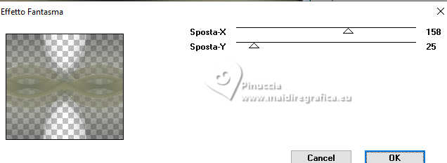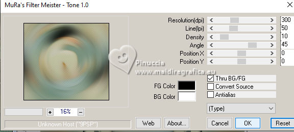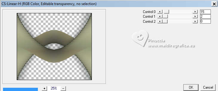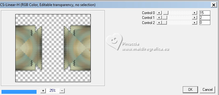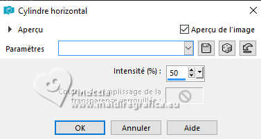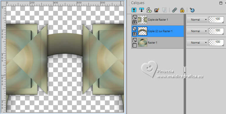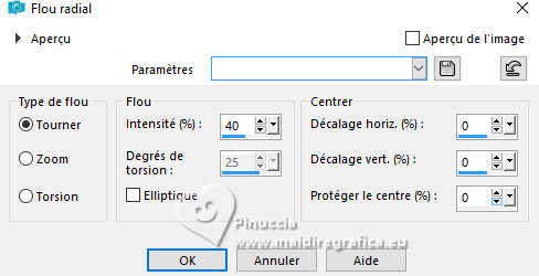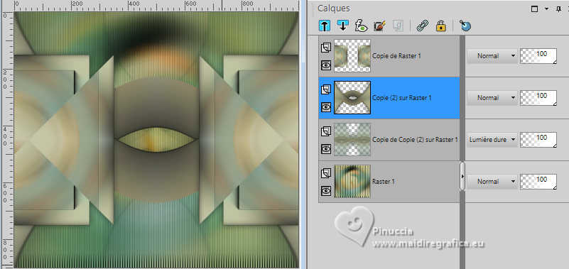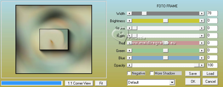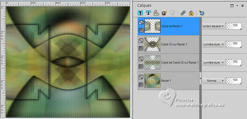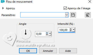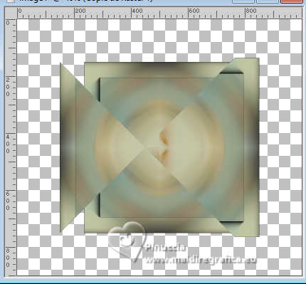 Le tutoriel a été créé avec PSP9 et traduit avec PSPX9 et PSP2020, mais il peut également être exécuté avec les autres versions. Suivant la version utilisée, vous pouvez obtenir des résultats différents. Depuis la version X4, la fonction Image>Miroir a été remplacée par Image>Renverser horizontalement, et Image>Renverser avec Image>Renverser verticalement. Dans les versions X5 et X6, les fonctions ont été améliorées par la mise à disposition du menu Objets. Avec la nouvelle version X7, nous avons à nouveau Miroir/Retourner, mais avec nouvelles différences. Consulter, si vouz voulez, mes notes ici Certaines dénominations ont changées entre les versions de PSP. Les plus frequentes dénominations utilisées: ![]() Traduction anglaise ici Vos versions ici![]() Nécessaire: ![]() (ici les liens vers les sites des créateurs de tubes) ![]() consulter, si nécessaire, ma section de filtre ici Filters Unlimited 2.0 ici Simple - Pizza Slice Mirror ici Simple - Left Right Wrap (Bonus) ici Mura's Meister - Pole Transform, Tone ici AAA Frames - Foto Frame ici FM Tile Tools - Blend Emboss, Saturation Emboss ici It@lian Editors Effect - Effetto Fantasma ici Carolaine and Sensibility - CS-Linear H ici Filtres Simple et It@lian Editors peuvent être utilisés seuls ou importés dans Filters Unlimited. voir comment le faire ici). Si un filtre est fourni avec cette icône, ![]() N'hésitez pas à changer le mode mélange des calques et leur opacité selon les couleurs utilisées. Dans les plus récentes versions de PSP, vous ne trouvez pas le dégradé d'avant plan/arrière plan ou Corel_06_029. Vous pouvez utiliser le dégradés des versions antérieures. Ici le dossier Dégradés de CorelX. ![]() 1. Ouvrir une nouvelle image transparente 1000 x 900 pixels. 2. Placer en avant plan la couleur #c5c7a5, et en arrière plan la couleur #527b6f. ![]() Préparer en avant plan un dégradé de premier plan/arrière plan, style Linéaire. ![]() Remplir l'image transparente du dégradé.3. Sélections>Sélectionner tout. Ouvrir le tube de la femme 9081-Luz Cristina ![]() Édition>Copier. Revenir sur votre travail et Édition>Coller dans la sélection. Sélections>Désélectionner tout. 4. Effets>Effets d'image>Mosaïque sans jointures, par défaut. ![]() 5. Réglage>Flou>Flou radial. ![]() 6. Calques>Duplicate. Fermer le calque Raster 1 pour voir mieux. Rester sur le calque de la copie. 7. Effets>Modules Externes>AAA Frames - Foto Frame. ![]() Image>Redimensionner, à 70%, redimensionner tous les calques décoché. 8. Effets>Modules Externes>Simple - Pizza Slice Mirror. Cet effet travaille sans fenêtre; résultat ![]() 9. Effets>Effets de réflexion>Miroir rotatif. ![]() 10. Effets>Modules Externes>Simple - Left Right Wrap. Également cet effet travaille sans fenêtre; résultat ![]() 11. Effets>Effets 3D>Ombre portée, couleur noire. ![]() 12. Calques>Dupliquer. Effets>Modules Externes>Mura's Meister - Pole Transform. ![]() 13. Calques>Agencer>Déplacer vers le bas. ![]() 14. Effets>Effets de distorsion>Cintrage ![]() 15. Calques>Dupliquer. Image>Miroir>Miroir vertical (Image>Renverser). Calques>Fusionner>Fusionner le calque de dessous. 16. Calques>Dupliquer. Calques>Agencer>Déplacer vers le bas. 17. Effets>Modules Externes>Italian Effects Editors - Effetto Fantasma. ![]() Placer ce calque en mode Lumière dure. 18. Ouvrir le calque Raster 1, et vous positionner sur le calque copie (2) surRaster 1. ![]() 19. Effets>Effets géométriques>Cylindre horizontal. ![]() 20. Vous positionner sur le calques du bas de la pile, Raster 1. Effets>Modules Externes>Mura's Meister - Tone, par défaut. ![]() 21. Réglage>Flou>Flou directionnel ou Flou de Mouvement. ![]() 22. Effets>Modules Externes>FM Tile Tools - Saturation Emboss, par défaut. ![]() 23. Vous positionner sur le calque Copie (2) sur Raster 1 ![]() Effets>Modules Externes>Carolaine and Sensibility - CS-Linear H. ![]() 24. Effets>Effets 3D>Ombre portée, comme précédemment, optionnel. Placer ce calque en mode Lumière dure. 25. Vous positionner sur le calque du haut de la pile, copie de Raster 1. Effets>Modules Externes>Carolaine and Sensibility - CS-Linear H, comme précédemment. ![]() Placer ce calque en mode Assombrir davantage. 26. La tag et les calques - adapter mode mélange à votre goût. ![]() 27. Édition>Coller comme nouveau calque - le tube de la femme est encore en mémoire. Déplacer le tube à gauche.Effets>Effets 3D>Ombre portée, comme précédemment, ou à choix. 28. Ouvrir le déco tube-LuzCristina ![]() Édition>Copier. Revenir sur votre travail et Édition>Coller comme nouveau calque. Déplacer le tube en bas à droite.Effets>Effets 3D>Ombre portée, comme précédemment, ou à choix. 29. Ouvrir le texte Texto ![]() Édition>Copier. Revenir sur votre travail et Édition>Coller comme nouveau calque Déplacer le tube à gauche.Le texte a déjà son Ombre portée. 30. Image>Ajouter des bordures, 10 pixels, symétrique, couleur foncée. Image>Ajouter des bordures, 55 pixels, symétrique, couleur claire. Activer l'outil Baguette magique ![]() et cliquer dans le dernier bord pour le sélectionner. 31. Changer les réglages du dégradé, Répéts. 10 ![]() Remplir la sélection du dégradé.32. Réglage>Ajouter/Supprimer du bruit/Ajouter du bruit. ![]() 33. Effets>Effets 3D>Biseautage intérieur. ![]() 34. Effets>Modules Externes>FM Tile Tools - Blend Emboss, par défaut. ![]() Sélections>Désélectionner tout. 35. Image>Redimensionner, à 84%, redimensionner tous les calques coché. Signer votre travail et enregistrer en jpg. ![]() ![]() Si vous avez des problèmes, ou des doutes, ou vous trouvez un link modifié, ou seulement pour me dire que ce tutoriel vous a plu, vous pouvez m'écrire. |