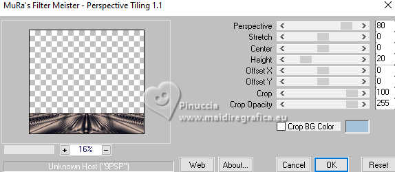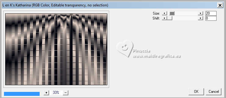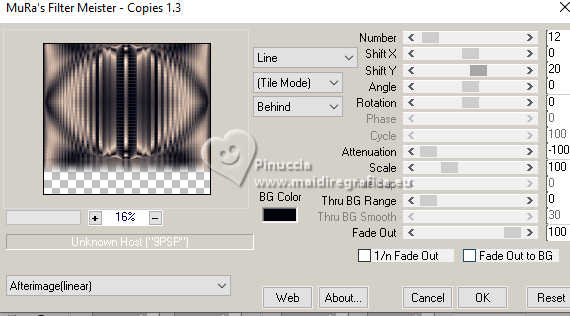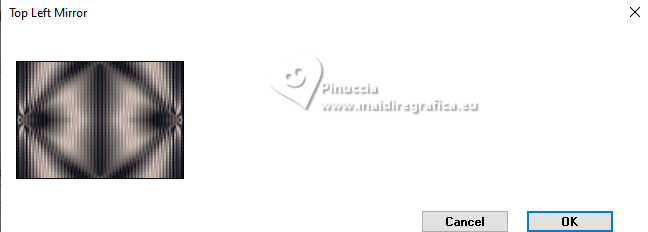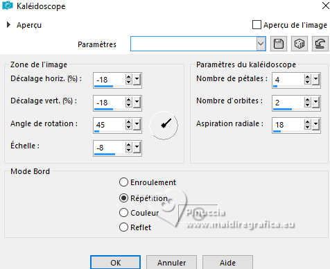 Le tutoriel a été créé avec PSP9 et traduit avec PSPX9 et PSP2020, mais il peut également être exécuté avec les autres versions. Suivant la version utilisée, vous pouvez obtenir des résultats différents. Depuis la version X4, la fonction Image>Miroir a été remplacée par Image>Renverser horizontalement, et Image>Renverser avec Image>Renverser verticalement. Dans les versions X5 et X6, les fonctions ont été améliorées par la mise à disposition du menu Objets. Avec la nouvelle version X7, nous avons à nouveau Miroir/Retourner, mais avec nouvelles différences. Consulter, si vouz voulez, mes notes ici Certaines dénominations ont changées entre les versions de PSP. Les plus frequentes dénominations utilisées: ![]() Traduction anglaise ici Vos versions ici![]() Nécessaire: ![]() (ici les liens vers les sites des créateurs de tubes) ![]() consulter, si nécessaire, ma section de filtre ici Filters Unlimited 2.0 ici L&K's - L&K's Katharina ici Simple - Top Left Mirror - Half Wrap ici FM Tile Tools - Saturation Emboss, Blend Emboss ici Blur - Radial Blur ici Mura's Meister - Perspective Tiling ici Mura's Meister - Copies ici Filtres Simple peuvent être utilisés seuls ou importés dans Filters Unlimited. voir comment le faire ici). Si un filtre est fourni avec cette icône, ![]() N'hésitez pas à changer le mode mélange des calques et leur opacité selon les couleurs utilisées. Dans les plus récentes versions de PSP, vous ne trouvez pas le dégradé d'avant plan/arrière plan ou Corel_06_029. Vous pouvez utiliser le dégradés des versions antérieures. Ici le dossier Dégradés de CorelX. ![]() 1. Ouvrir une nouvelle image transparente 1000 x 700 pixels. 2. Placer en avant plan la couleur #e1cfc3, et en arrière plan la couleur #00020c. ![]() Préparer en avant plan un dégradé de premier plan/arrière plan, style Radial. ![]() Remplir l'image transparente du dégradé.3. Effets>Modules Externes>L&&K's - L&K's Katharina ![]() 4. Effets>Effets d'image>Mosaïque sans jointures, par défaut ![]() 5. Effets>Effets de réflexion>Miroir rotatif. ![]() 6. Image>Miroir>Miroir vertical (Image>Renverser). 7. Effets>Modules Externes>Simple - Top Left Mirror ![]() 8. Effets>Modules Externes>Simple - Half Wrap Cet effet travaille sans fenêtre; résultat ![]() 9. Effets>Effets géométriques>Cylindre vertical ![]() 10. Effets>Modules Externes>FM Tile Tools - Saturation Emboss, par défaut (optionnel dans vos version libre) ![]() 11. Réglage>Netteté>Netteté. 12. Image>Taille du support - 1000 x 900 pixels ![]() 13. Calques>Dupliquer. Calques>Agencer>Déplacer vers le bas. 14. Effets>Modules Externes>Mura's Meister - Perspective Tiling. ![]() 15. Vous positionner sur le calque Raster 1. Effets>Modules Externes>Mura's Meister - Copies. ![]() 16. Ouvrir le misted Misted-LuzCristina ![]() Édition>Copier. Revenir sur votre travail et Édition>Coller comme nouveau calque. Déplacer le tube à gauche![]() Calques>Dupliquer. Image>Miroir>Miroir horizontal (Image>Miroir). 17. Calques>Fusionner>Fusionner le calque de dessous. 18. Ouvrir le tube 8252-LuzCristina ![]() Édition>Copier. Revenir sur votre travail et Édition>Coller comme nouveau calque. Déplacer le tube à gauche.19. Effets>Effets 3D>Ombre portée, couleur noire. ![]() 20. Ouvrir le tube anna-br_crisantemo-rosa-by-mkatka_24-08-10s ![]() Édition>Copier. Revenir sur votre travail et Édition>Coller comme nouveau calque. Déplacer le tube en bas à droite.Effets>Effets 3D>Ombre portée, comme précédemment. 21. Image>Ajouter des bordures, 5 pixels, symétrique, couleur foncée. Image>Ajouter des bordures, 2 pixels, symétrique, couleur claire. Image>Ajouter des bordures, 50 pixels, symétrique, couleur foncée. 22. Activer l'outil Baguette magique ![]() et cliquer dans le dernier bord pour le sélectionner. 23. Effets>Effets de réflexion>Kaléïdoscope. ![]() 24. Effets>Modules Externes>Blur - Radial Blur ![]() 25. Effets>Effets 3D>Biseautage intérieur. ![]() 26. Effets>Modules Externes>FM Tile Tools - Blend Emboss ![]() Sélections>Désélectionner tout. 27. Image>Redimensionner, à 85%, redimensionner tous les calques coché. Signer votre travail et enregistrer en jpg. Pour les tubes de cette version merci Luz Cristina ![]() ![]() Si vous avez des problèmes, ou des doutes, ou vous trouvez un link modifié, ou seulement pour me dire que ce tutoriel vous a plu, vous pouvez m'écrire. |