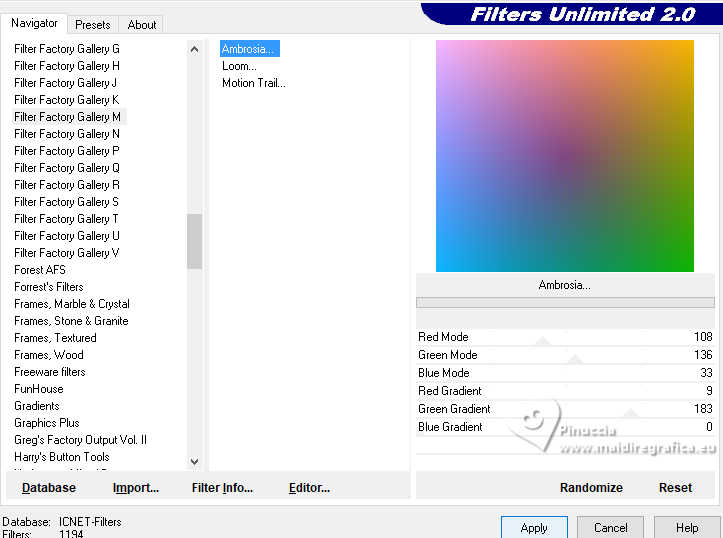 Effects>Plugins>Filters Unlimited 2.0 - Filter Factory Gallery M - Ambrosia.