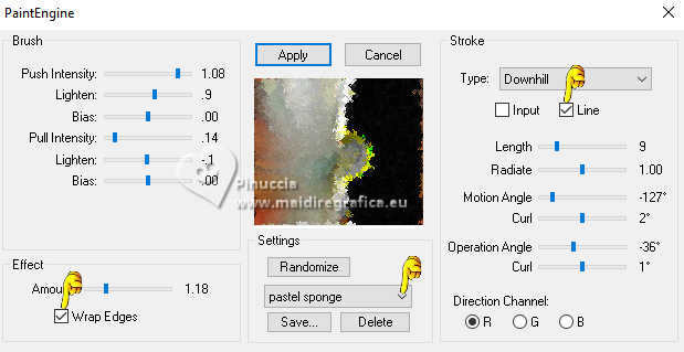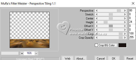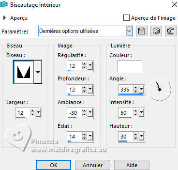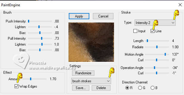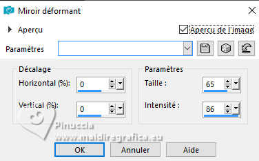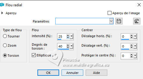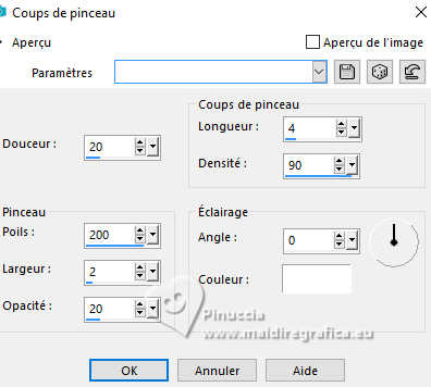 Le tutoriel a été créé avec PSP9 et traduit avec PSPX9 et PSP2020, mais il peut également être exécuté avec les autres versions. Suivant la version utilisée, vous pouvez obtenir des résultats différents. Depuis la version X4, la fonction Image>Miroir a été remplacée par Image>Renverser horizontalement, et Image>Renverser avec Image>Renverser verticalement. Dans les versions X5 et X6, les fonctions ont été améliorées par la mise à disposition du menu Objets. Avec la nouvelle version X7, nous avons à nouveau Miroir/Retourner, mais avec nouvelles différences. Consulter, si vouz voulez, mes notes ici Certaines dénominations ont changées entre les versions de PSP. Les plus frequentes dénominations utilisées: ![]() Traduction anglaise ici Vos versions ici![]() Nécessaire: ![]() (ici les liens vers les sites des créateurs de tubes) ![]() consulter, si nécessaire, ma section de filtre ici Filters Unlimited 2.0 ici Fantastic Machine - Paint Engine ici Simple - Top Left Mirror ici Mura's Meister - Perspective Tiling ici FM Tile Tools - Blend Emboss ici Filtres Simple peuvent être utilisés seuls ou importés dans Filters Unlimited. voir comment le faire ici). Si un filtre est fourni avec cette icône, ![]() N'hésitez pas à changer le mode mélange des calques et leur opacité selon les couleurs utilisées. Dans les plus récentes versions de PSP, vous ne trouvez pas le dégradé d'avant plan/arrière plan ou Corel_06_029. Vous pouvez utiliser le dégradés des versions antérieures. Ici le dossier Dégradés de CorelX. ![]() 1. Ouvrir une nouvelle image transparente 1000 x 900 pixels. 2. Placer en avant plan la couleur #cc9346, et en arrière plan la couleur #19120f. ![]() Préparer en avant plan un dégradé de premier plan/arrière plan, style Halo. ![]() Remplir l'image transparente du dégradé.3. Sélections>Sélectionner tout. Ouvrir le tube de la femme 8878-LuzCristina ![]() Édition>Copier. Revenir sur votre travail et Édition>Coller dans la sélection. Sélections>Désélectionner tout. 4. Effets>Effets d'image>Mosaïque sans jointures, par défaut. ![]() 5. Réglage>Flou>Flou radial. ![]() 6. Effets>Effets de traits ou Effets Média Art>Coups de pinceau ![]() Édition>Répéter Coups de pinceau 7. Effets>Modules Externes>Fantastic Machine - PaintEngine. ![]() si vous ne voyez pas la liste des presets, il est probable que vous n'ayez pas effectué les étapes nécessaires lors de l'installation du filtre. Pour avoir tous les presets il faut copier, dans le dossier Window, un fichier fourni avec le filtre. Voir les notes de Paint Engine ici Dans tous les cas, vous pouvez définir manuellement les paramètres correspondant au preset "brush strokes" que vous voyez dans la capture. 8. Calques>Dupliquer. Effets>Modules Externes>Mura's Meister - Perspective Tiling. ![]() 9. Effets>Effets de distorsion>Miroir déformant. ![]() 10. Calques>Dupliquer. Effets>Effets de distorsion>Coordonnées polaires ![]() 11. Image>Miroir>Miroir Vertical (Image>Renverser). Effets>Modules Externes>Simple - Top Left Mirror. ![]() 12. Image>Redimensionner, à 84%, redimensionner tous les calques décoché. 13. Effets>Effets d'image>Mosaïque sans jointures. ![]() 14. Effets>Effets de traits ou Effets Média Art>Coups de pinceau, comme précédemment ![]() 15. Effets>Effets de bords>Éroder. Réglage>Netteté>Davantage de netteté. 16. Calques>Dupliquer. Effets>Effets d'image>Décalage. ![]() 17. Calques>Fusionner>Fusionner le calque de dessous. 18. Effets>Effets 3D>Ombre portée, couleur noire. ![]() 19. Ouvrir le misted Misted-LuzCristina ![]() Édition>Copier. Revenir sur votre travail et Édition>Coller comme nouveau calque. Déplacer le tube en haut à droite.![]() 20. Calques>Dupliquer. Réglage>Flou>Flou radial, comme précédemment. ![]() 21. Image>Miroir>Miroir horizontal (Image>Miroir). 22. Effets>Modules Externes>Fantastic Machine - Paint Engine. ![]() le résultat peut-être légèrement différent, à cause de la position du misted, et également si vous utilisez un autre tube 23. Effets>Modules Externes>FM Tile Tools - Blend Emboss, par défaut. ![]() 24. Calques>Dupliquer. Activer à nouveau le tube de la femme et Édition>Copier. Revenir sur votre travail et Édition>Coller comme nouveau calque. Déplacer le tube à gauche.25. Effets>Effets 3D>Ombre portée, couleur noire. ![]() 26. Ouvrir le texte texto ![]() Édition>Copier. Revenir sur votre travail et Édition>Coller comme nouveau calque. Déplacer le texte en bas à droite.27. Image>Ajouter des bordures, 8 pixels, symétrique, couleur foncée. Image>Ajouter des bordures, 2 pixels, symétrique, couleur claire. Image>Ajouter des bordures, 8 pixels, symétrique, couleur foncée. Image>Ajouter des bordures, 2 pixels, symétrique, couleur claire. Image>Ajouter des bordures, 8 pixels, symétrique, couleur foncée. Image>Ajouter des bordures, 30 pixels, symétrique, couleur claire. 28. Activer l'outil Baguette magique ![]() et cliquer dans le dernier bord pour le sélectionner. 29. Effets>Effets 3D>Biseautage intérieur. ![]() Sélections>Désélectionner tout. 30. Image>Redimensionner, à 85%, redimensionner tous les calques coché. Signer votre travail et enregistrer en jpg. Message de Luz Cristina: Y siempre recuerda que hay mil maneras de pelar un gato!! Busca siempre alternativas cuando algo te atore. tr. Et rappelez-vous toujours qu’il existe mille façons d’écorcher un chat !! Recherchez toujours des alternatives lorsque quelque chose vous bloque. Pour les tubes de cette version merci Luz Cristina ![]() ![]() Si vous avez des problèmes, ou des doutes, ou vous trouvez un link modifié, ou seulement pour me dire que ce tutoriel vous a plu, vous pouvez m'écrire. |