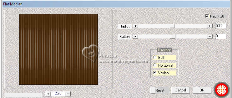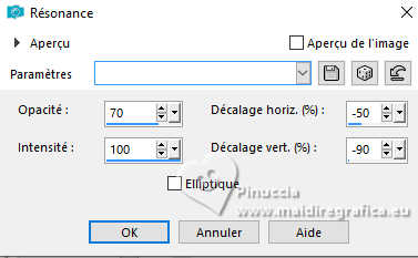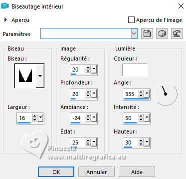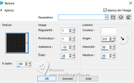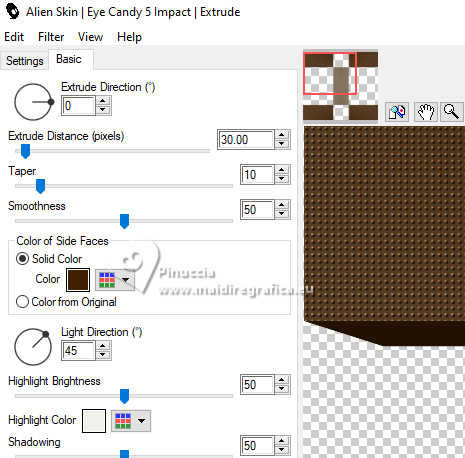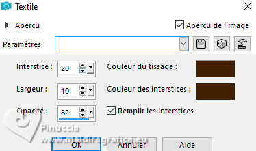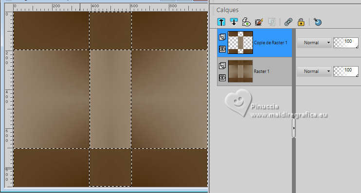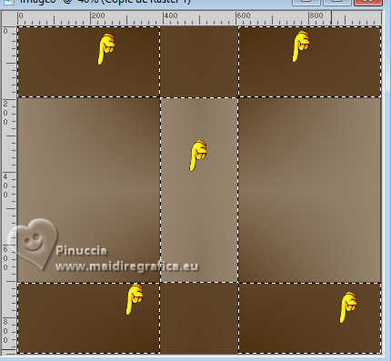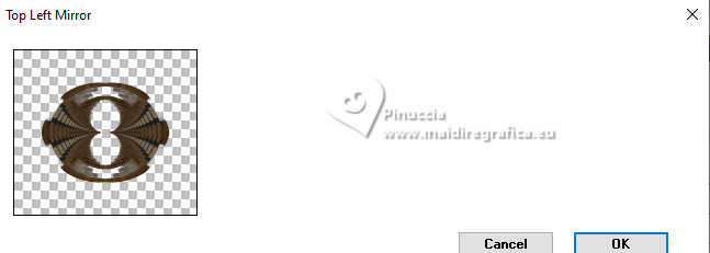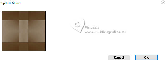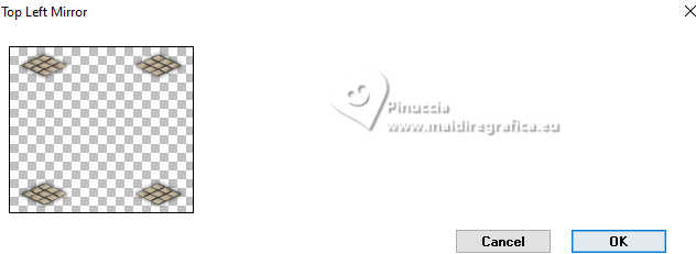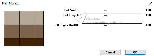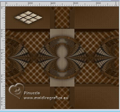 Le tutoriel a été créé avec PSP9 et traduit avec PSPX9 et PSP2020, mais il peut également être exécuté avec les autres versions. Suivant la version utilisée, vous pouvez obtenir des résultats différents. Depuis la version X4, la fonction Image>Miroir a été remplacée par Image>Renverser horizontalement, et Image>Renverser avec Image>Renverser verticalement. Dans les versions X5 et X6, les fonctions ont été améliorées par la mise à disposition du menu Objets. Avec la nouvelle version X7, nous avons à nouveau Miroir/Retourner, mais avec nouvelles différences. Consulter, si vouz voulez, mes notes ici Certaines dénominations ont changées entre les versions de PSP. Les plus frequentes dénominations utilisées: ![]() Traduction anglaise ici Vos versions ici![]() Nécessaire: ![]() (ici les liens vers les sites des créateurs de tubes) ![]() consulter, si nécessaire, ma section de filtre ici Filters Unlimited 2.0 ici Simple - Top Left Mirror ici Toadies - Mosaic Blur ici Mehdi 2 - Flat Median ici Alien Skin Eye Candy 5 Impact - Extrude ici FM Tile Tools - Blend Emboss ici Filtres Simple et Toadies peuvent être utilisés seuls ou importés dans Filters Unlimited. voir comment le faire ici). Si un filtre est fourni avec cette icône, ![]() N'hésitez pas à changer le mode mélange des calques et leur opacité selon les couleurs utilisées. Dans les plus récentes versions de PSP, vous ne trouvez pas le dégradé d'avant plan/arrière plan ou Corel_06_029. Vous pouvez utiliser le dégradés des versions antérieures. Ici le dossier Dégradés de CorelX. ![]() 1. Ouvrir une nouvelle image transparente 1000 x 900 pixels. 2. Placer en avant plan la couleur #412000, et en arrière plan la couleur #d2c9ba. ![]() Préparer en avant plan un dégradé de premier plan/arrière plan, style Linéaire. ![]() Remplir l'image transparente du dégradé.3. Effets>Modules Externes>Toadies - Plain Mosaic ![]() pour mon exemple, j'ai utilisé Toadies>Plain Mosaic Blur ![]() Le résultat entre les deux effets semble presque le même, mais en comparant le tag final avec celui de Luz Cristina, avec cet effet je l'ai trouvé plus clair et plus similaire au sien. 4. Effets>Effets de réflexion>Miroir rotatif. ![]() 5. Image>Miroir>Miroir vertical (Image>Renverser). 6. Effets>Modules Externes>Simple - Top Left Mirror. ![]() 7. Calques>Dupliquer. 8. Activer l'outil Baguette magique ![]() et cliquer dans les 5 rectangles indiqués pour les sélectionner. ![]() si nécessaire, placer la tolérance à 10/15 9. Sélections>Inverser. Presser CANC sur le clavier ![]() ![]() 10. Sélections>Inverser. Effets>Effets de textures>Texture - sélectionner la texture Grille (Corel 15_006) ![]() Sélections>Désélectionner tout. 11. Effets>Modules Externes>Alien Skin Eye Candy 5 Impact - Extrude Solid Color: votre couleur d'avant plan. ![]() 12. Effets>Effets de réflexion>Miroir rotatif. ![]() 13. Réglage>Netteté>Netteté. 14. Effets>Effets 3D>Ombre portée, couleur noire. ![]() 15. Vous positionner sur le calque Raster 1. Effets>Effets de textures>Textile - les deux couleurs: couleur d'avant plan. ![]() 16. Effets>Modules Externes>Mehdi 2 - Flat Median. ![]() 17. Effets>Modules Externes>FM Tile Tools - Blend Emboss, par défaut. ![]() 18. Image>Rotation libre - 45 degrés à droite. ![]() 19. Image>Redimensionner, à 130%, redimensionner tous les calques décoché. 20. Calques>Dupliquer. Image>Miroir>Miroir horizontal. Réduire l'opacité de ce calque à 50%. Calques>Fusionner>Fusionner le calque de dessous. 21. Vous positionner sur le calque Copie de Raster 1. Calques>Dupliquer. 22. Effets>Effets géométriques>Perspective Horizontale. ![]() 23. Effets>Effets de réflexion>Résonance. ![]() 24. Effets>Effets de réflexion>Miroir rotatif. ![]() 25. Effets>Effets de distorsion>Coordonnées polaires. ![]() 26. Effets>Modules Externes>Simple - Top Left Mirror. ![]() 27. Effets>Effets de distorsion>Cintrage ![]() 28. Effets>Effets d'image>Mosaïque sans jointures. ![]() 29. Effets>Effets 3D>Ombre portée, comme précédemment. ![]() 30. Réglage>Netteté>Netteté. 31. Ouvrir le déco deco ![]() Édition>Copier. Revenir sur votre travail et Édition>Coller comme nouveau calque. Déplacer dans le cadre en haut à gauche.![]() Effets>Modules Externes>Simple - Top Left Mirror. ![]() 32. Ouvrir le tube de la femme 9802-LuzCristina ![]() Édition>Copier. Revenir sur votre travail et Édition>Coller comme nouveau calque. Image>Redimensionner, si nécessaire, pour mon exemple j'ai fait à 95%, redimensionner tous les calques décoché. Déplacer le tube à gauche.Effets>Effets 3D>Ombre portée, comme précédemment, ou à votre goût. 33. Ouvrir le texte texto ![]() Édition>Copier. Revenir sur votre travail et Édition>Coller comme nouveau calque. Déplacer le texte à votre goût.34. Image>Ajouter des bordures, 8 pixels, symétrique, couleur foncée. Image>Ajouter des bordures, 2 pixels, symétrique, couleur claire. Image>Ajouter des bordures, 8 pixels, symétrique, couleur foncée. Image>Ajouter des bordures, 2 pixels, symétrique, couleur claire. Image>Ajouter des bordures, 50 pixels, symétrique, couleur foncée. Activer l'outil Baguette magique ![]() et cliquer dans le dernier bord pour le sélectionner. 35. Effets>Effets de textures>Texture, comme précédemment. ![]() 36. Effets>Effets 3D>Biseautage intérieur. ![]() 37. Effets>Modules Externes>FM Tile Tools - Blend Emboss, par défaut. ![]() Sélections>Désélectionner tout. 38. Image>Redimensionner, à 83%, redimensionner tous les calques coché. Signer votre travail et enregistrer en jpg. ![]() ![]() ![]() Si vous avez des problèmes, ou des doutes, ou vous trouvez un link modifié, ou seulement pour me dire que ce tutoriel vous a plu, vous pouvez m'écrire. |