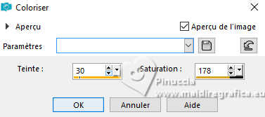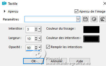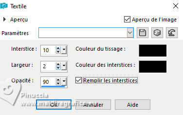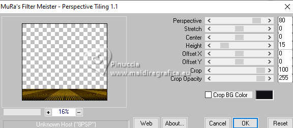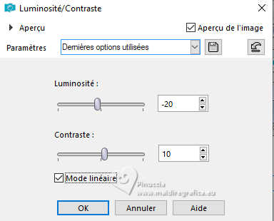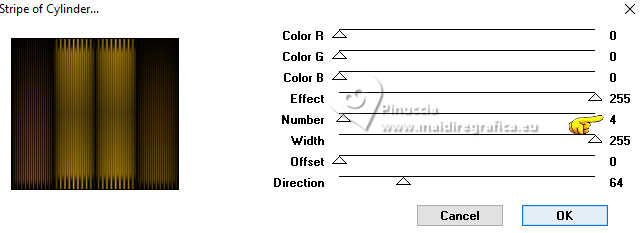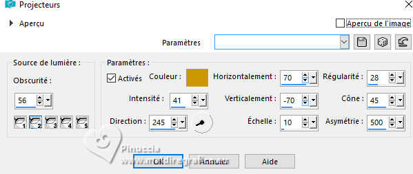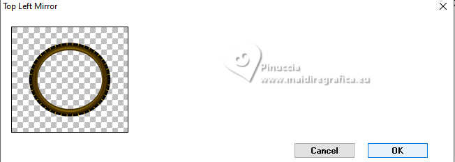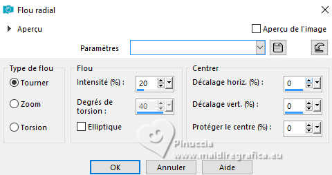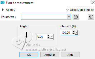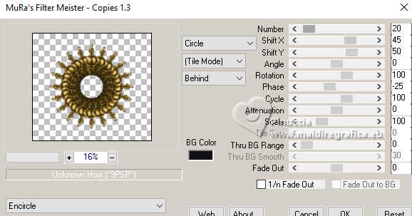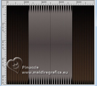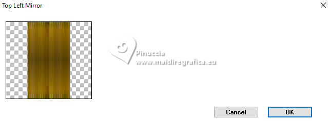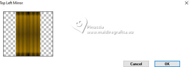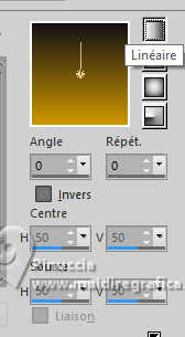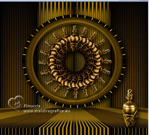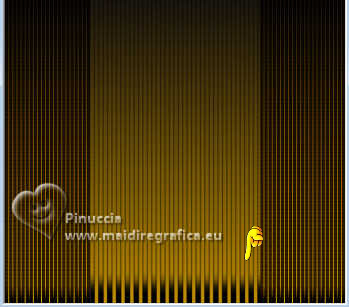 Le tutoriel a été créé avec PSP9 et traduit avec PSPX9 et PSP2020, mais il peut également être exécuté avec les autres versions. Suivant la version utilisée, vous pouvez obtenir des résultats différents. Depuis la version X4, la fonction Image>Miroir a été remplacée par Image>Renverser horizontalement, et Image>Renverser avec Image>Renverser verticalement. Dans les versions X5 et X6, les fonctions ont été améliorées par la mise à disposition du menu Objets. Avec la nouvelle version X7, nous avons à nouveau Miroir/Retourner, mais avec nouvelles différences. Consulter, si vouz voulez, mes notes ici Certaines dénominations ont changées entre les versions de PSP. Les plus frequentes dénominations utilisées: ![]() Traduction anglaise ici Vos versions ici![]() Nécessaire: ![]() (ici les liens vers les sites des créateurs de tubes) ![]() consulter, si nécessaire, ma section de filtre ici Filters Unlimited 2.0 ici Mura's Seamless - Stripe of Cylinder ici Simple - Top Left Mirror ici Mura's Meister - Perspective Tiling ici Mura's Meister - Copies ici FM Tile Tools - Blend Emboss, Saturation Emboss ici Filtres Simple et Mura's Seamless peuvent être utilisés seuls ou importés dans Filters Unlimited. voir comment le faire ici). Si un filtre est fourni avec cette icône, ![]() N'hésitez pas à changer le mode mélange des calques et leur opacité selon les couleurs utilisées. Dans les plus récentes versions de PSP, vous ne trouvez pas le dégradé d'avant plan/arrière plan ou Corel_06_029. Vous pouvez utiliser le dégradés des versions antérieures. Ici le dossier Dégradés de CorelX. ![]() 1. Ouvrir une nouvelle image transparente 250 x 900 pixels. 2. Placer en avant plan la couleur #cd9700, et en arrière plan la couleur #121014. ![]() Préparer en avant plan un dégradé de premier plan/arrière plan, style Linéaire. ![]() Remplir l'image transparente du dégradé.3. Effets>Effets de textures>Textile, les deux couleurs #000000. ![]() 4. Réglage>Flou>Flou directionnel ou Flou de mouvement. ![]() 5. Effets>Modules Externes>FM Tile Tools - Saturation Emboss, par défaut. ![]() Répéter l'Effet une deuxième fois (optionnel dans votre libre, selon vos couleurs). 6. Image>Taille du support - 1000 x 900 pixels. ![]() 7. Effets>Effets de réflexion>Miroir rotatif. ![]() 8. Activer l'outil Baguette magique ![]() et clique dans la partie transparent au centre pour la sélectionner. Sélections>Modifier>Agrandir - 2 pixels. 9. Calques>Nouveau calque raster. Calques>Agencer>Déplacer vers le bas. Remplir la sélection du dégradé.Sélections>Désélectionner tout. 10. Effets>Effets de textures>Textile - les deux couleur #000000. ![]() 11. Réglage>Flou>Flou de mouvement, comme précédemment. ![]() Édition>Répeter Flou de mouvement. **** Note Luz Cristina travaille avec la version PSP9; dans ce tutoriel le résultat peut être différent avec les versions plus recentes. Les nouvelles version que j'ai utilisé pour traduire le tutoriel sont PSPX9 et PSP2020. Je n'ai pas PSP9, mais j'ai utilisé la version précédente PSP8 et dès ce moment j'ai eu des différences. À gauche le résultat avec la version PSP8 - &A; droite le résultat avec la version PSPX9 et PSP2020 ![]() ![]() **** 12. Image>Miroir>Miroir vertical. 13. Effets>Modules Externes>Simple - Top Left Mirror. Avec les nouvelles versions de PSP: ![]() Avec les anciennes versions de PSP ![]() 14. Effets>Modules Externes>FM Tile Tools - Blend Emboss, par défaut - 2 fois. ![]() A ce point, voici les résultat; à gauche PSP8 - à droite PSPX9 et PSP2020 ![]() ![]() **** Si vous voulez obtenir le résultat du tutoriel original, Ouvrir le fichier que j'ai ajouté au matériel calque central ![]() Édition>Copier. Revenir sur votre travail et Édition>Coller comme nouveau calque. Il est à sa place. Coloriser, si vous utilisez des autres couleurs (ci-dessous ma version libre) ![]() **** 15. Calques>Fusionner>Calques visibles. 16. Calques>Dupliquer. 17. Effets>Modules Externes>Mura's Meister - Perspective Tiling. ![]() 18. Effets>Effets d'image>Décalage. ![]() 19. Vous positionner sur le calque Fusionné. Effets>Modules Externes>Mura's Seamless - Stripe of Cylinder. ![]() 20. Vous positionner sur le calque Copie de Fusionné. Calques>Dupliquer. 21. Effets>Effets de distorsion>Coordonnées polaires. ![]() 22. Image>Redimensionner, à 70%, redimensionner tous les calques décoché. 23. Effets>Modules Externes>Simple - Top Left Mirror. ![]() 24. Effets>Effets d'image>Décalage, comme précédemment. ![]() 25. Effets>Effets 3D>Ombre portée, couleur noire. ![]() 26. Ouvrir le tube Deco 29-Luz Cristina ![]() Édition>Copier. Revenir sur votre travail et Édition>Coller comme nouveau calque. 27. Réglage>Teinte et Saturation>Coloriser ![]() 28. Effets>Modules Externes>Mura's Meister - Copies. ![]() 29. Image>Redimensionner, à 70%, redimensionner tous les calques décoché. Déplacer l'image au centre.![]() 30. Effets>Effets 3D>Ombre portée, comme précédemment. 31. Réglage>Luminosité et Contraste>Luminosité et Contraste. ![]() Si vous préférez l'image plus foncée, répéter l'Effet une deuxième fois. 32. Édition>Coller comme nouveau calque - le tube Deco 29-Luz Cristina est toujours en mémoire. Déplacer le tube en bas à droite.Ne pas oublier de coloriser, assombrir et appliquer l'ombre portée. ![]() 33. Ouvrir le tube de la femme 7664-LuzCristina ![]() Édition>Copier. Revenir sur votre travail et Édition>Coller comme nouveau calque. Déplacer le tube à gauche.Effets>Effets 3D>Ombre portée, comme précédemment, ou à votre goût. 34. Ouvrir le tube texto ![]() Édition>Copier. Revenir sur votre travail et Édition>Coller comme nouveau calque. Déplacer le texte à votre goût.le numéro est optionnel dans votre libre). 35. Vous positionner sur le calque du bas de la pile. Effets>Effets d'éclairage>Projecteurs ![]() Le tutoriel montre uniquement le projecteur numéro 2. Si nécessaire, jouez avec le