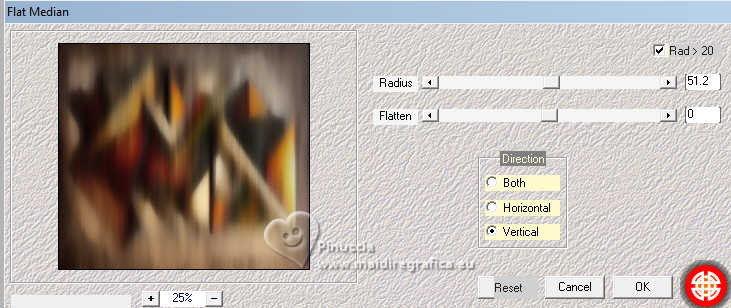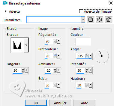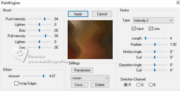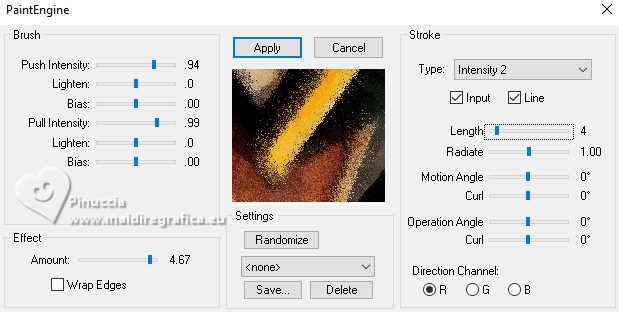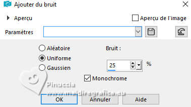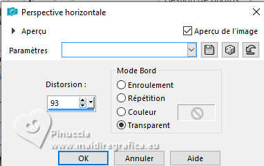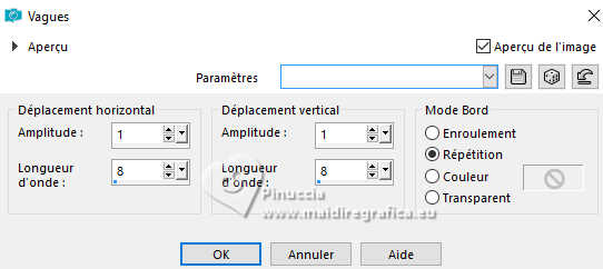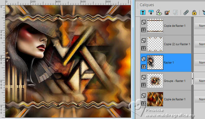 Le tutoriel a été créé avec PSP9 et traduit avec PSPX9 et PSP2020, mais il peut également être exécuté avec les autres versions. Suivant la version utilisée, vous pouvez obtenir des résultats différents. Depuis la version X4, la fonction Image>Miroir a été remplacée par Image>Renverser horizontalement, et Image>Renverser avec Image>Renverser verticalement. Dans les versions X5 et X6, les fonctions ont été améliorées par la mise à disposition du menu Objets. Avec la nouvelle version X7, nous avons à nouveau Miroir/Retourner, mais avec nouvelles différences. Consulter, si vouz voulez, mes notes ici Certaines dénominations ont changées entre les versions de PSP. Les plus frequentes dénominations utilisées: ![]() Traduction anglaise ici Vos versions ici![]() Nécessaire: ![]() (ici les liens vers les sites des créateurs de tubes) ![]() consulter, si nécessaire, ma section de filtre ici Filters Unlimited 2.0 ici Fantastic Machine - Paint Engine ici Mehdi 2 - Flat Median ici VM Toolbox - Zoom Blur ici Simple - Top Left Mirror ici FM Tile Tools - Blend Emboss, Saturation Emboss ici Filtres VM Toolbox et Simple peuvent être utilisés seuls ou importés dans Filters Unlimited. voir comment le faire ici). Si un filtre est fourni avec cette icône, ![]() N'hésitez pas à changer le mode mélange des calques et leur opacité selon les couleurs utilisées. ![]() Ouvrir le masque dans PSP et le minimiser avec le reste du matériel. 1. Ouvrir une nouvelle image transparente 1000 x 900 pixels. 2. Sélections>Sélectionner tout. Choisir et ouvrir le fractal, pour moi Fractal ![]() Édition>Copier. Revenir sur votre travail et Édition>Coller dans la sélection. Sélections>Désélectionner. 3. Effets>Modules Externes>Fantastic Machine - PaintEngine. ![]() 4. Calques>Dupliquer. 5. Effets>Effets géométriques>Perspective Horizontale. ![]() 6. Image>Miroir>Miroir horizontal. Répéter Effets>Effets géométriques>Perspective Horizontale, comme précédemment. ![]() 7. Effets>Effets de distorsion>Cintrage. ![]() 8. Effets>Effets de distorsion>Vagues. ![]() 9. Effets>Effets d'image>Décalage. ![]() 10. Effets>Modules Externes>Simple - Top Left Mirror. ![]() 11. Effets>Effets 3D>Ombre portée, couleur noire. ![]() 12. Calques>Dupliquer. Calques>Agencer>Déplacer vers le bas. 13. Effets>Modules Externes>VM Toolbox - Zoom Blur. ![]() 14. Effets>Modules Externes>FM Tile Tools - Saturation Emboss, par défaut. ![]() 15. Vous positionner sur le calque Raster 1. Calques>Dupliquer. Calques>Agencer>Déplacer vers le bas. Fermer le calque Raster 1 pour voir mieux. 16. Effets>Modules Externes>Mehdi 2 - Flat Median. ![]() 17. Image>Redimensionner, à 120%, redimensionner tous les calques décoché. 18. Effets>Effets de distorsion>Vagues, comme précédemment. ![]() Répéter Effets>Modules Externes>Fantastic Machine - Paint Engine, comme précédemment. ![]() Effets>Effets d'image>Mosaïque sans jointures, par défaut. ![]() 19. Effets>Modules Externes>FM Tile Tools - Saturation Emboss. par défaut. ![]() 20. Ouvrir et vous positionner sur le calque Raster 1. Calques>Nouveau calque de masque>A partir d'une image. Ouvrir le menu deroulant sous la fenêtre d'origine et vous verrez la liste des images ouvertes. Sélectionner le masque 20-21. ![]() Calques>Dupliquer - 2 fois (pour appliquer le masque 3 fois) Calques>Fusionner>Fusionner le groupe. Image>Redimensionner, à 85%, redimensionner tous les calques décoché. 21. Ouvrir le tube de la femme Tube-LuzCristina ![]() Édition>Copier. Revenir sur votre travail et Édition>Coller comme nouveau calque. Déplacer le tube à gauche, voir mon exemple.![]() 22. Placer en avant plan la couleur #e9b832 .Image>Ajouter des bordures, 6 pixels, symétrique, couleur noire. Image>Ajouter des bordures, 2 pixels, symétrique, couleur #e9b832. Image>Ajouter des bordures, 6 pixels, symétrique, couleur noire. Image>Ajouter des bordures, 2 pixels, symétrique, couleur #e9b832. Image>Ajouter des bordures, 60 pixels, symétrique, couleur noire. 23. Activer l'outil Baguette magique ![]() cliquer dans le dernier bord pour le sélectionner. 24. Réglage>Ajouter/Supprimer du bruit>Ajouter du bruit. ![]() 25. Effets>Modules Externes>FM Tile Tools - Blend Emboss, par défaut. ![]() 26. Effets>Effets 3D>Biseautage intérieur. ![]() Édition>Répéter Biseautage intérieur (optionnel dans votre version). Sélections>Désélectionner tout. 27. Image>Redimensionner, à 83%, redimensionner tous les calques coché. 28. Ouvrir le texte Texto ![]() Édition>Copier. Revenir sur votre travail et Édition>Coller comme nouveau calque. Déplacer le texte en bas, ou à votre goût.29. Ouvrir un des decos (selon votre couleur) et Édition>Copier. Revenir sur votre travail et Édition>Coller comme nouveau calque. Déplacer le tube sur le bord à gauche.Calques>Dupliquer. Image>Miroir>Miroir horizontal. 30. Signer votre travail sur un nouveau calque. Calques>Fusionner>Tous et enregistrer en jpg. ![]() ![]() ![]() Si vous avez des problèmes, ou des doutes, ou vous trouvez un link modifié, ou seulement pour me dire que ce tutoriel vous a plu, vous pouvez m'écrire. |