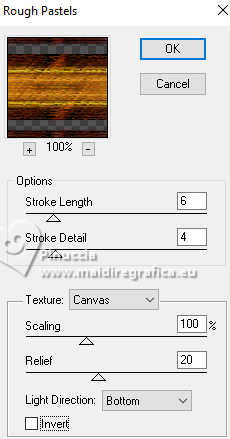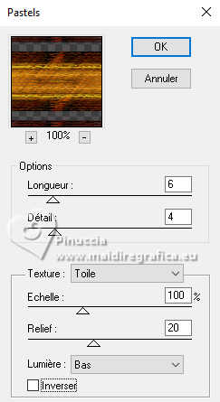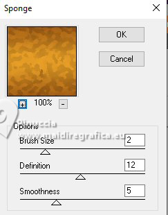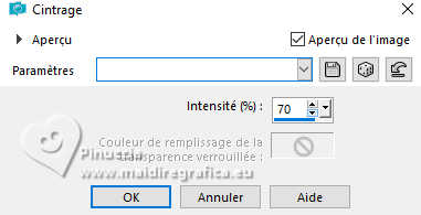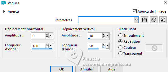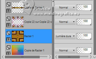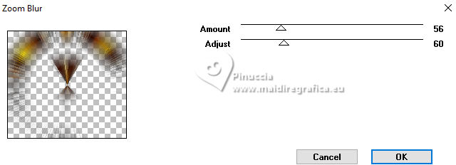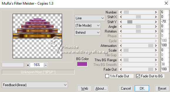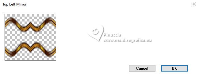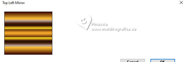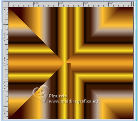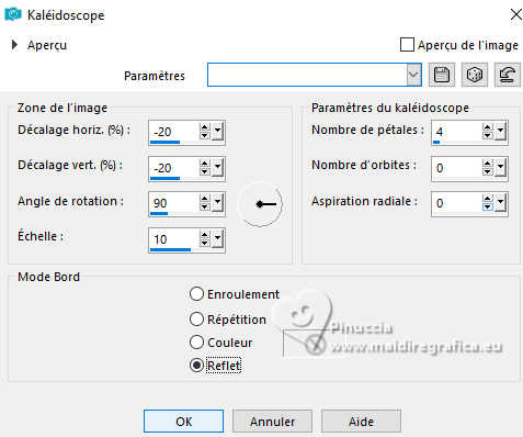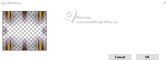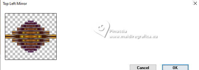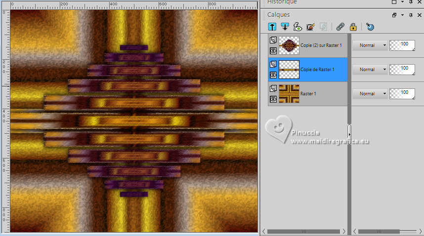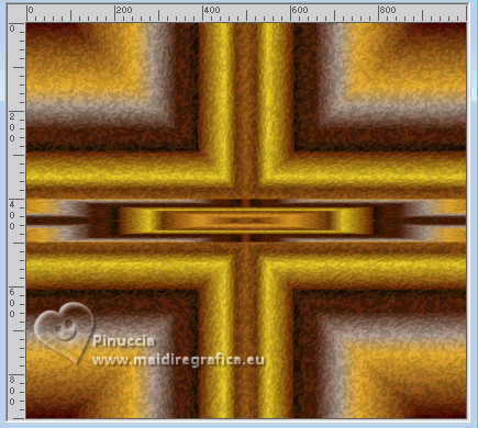 Le tutoriel a été créé avec PSP9 et traduit avec PSPX9 et PSP2020, mais il peut également être exécuté avec les autres versions. Suivant la version utilisée, vous pouvez obtenir des résultats différents. Depuis la version X4, la fonction Image>Miroir a été remplacée par Image>Renverser horizontalement, et Image>Renverser avec Image>Renverser verticalement. Dans les versions X5 et X6, les fonctions ont été améliorées par la mise à disposition du menu Objets. Avec la nouvelle version X7, nous avons à nouveau Miroir/Retourner, mais avec nouvelles différences. Consulter, si vouz voulez, mes notes ici Certaines dénominations ont changées entre les versions de PSP. Les plus frequentes dénominations utilisées: ![]() Traduction anglaise ici Vos versions ici![]() Nécessaire: ![]() (ici les liens vers les sites des créateurs de tubes) ![]() consulter, si nécessaire, ma section de filtre ici Filters Unlimited 2.0 ici Simple - Top Left Mirror, Pizza Slice Mirror ici VM Toolbox - Zoom Blur ici FM Tile Tools - Blend Emboss ici Artistiques - Eponge, Pastels ici Mura's Meister - Copies ici Filtres VM Toolbox et Simple peuvent être utilisés seuls ou importés dans Filters Unlimited. voir comment le faire ici). Si un filtre est fourni avec cette icône, ![]() N'hésitez pas à changer le mode mélange des calques et leur opacité selon les couleurs utilisées. ![]() Placer le dégradé dans le dossier Dégradés 1. Ouvrir une nouvelle image transparente 1000 x 900 pixels. 2. Placer en avant plan le dégradé et sélectionner le dégradé Metalic gold01, style Linéaire ![]() Placer en arrière plan la couleur #3a0749. ![]() Remplir l'image transparente du dégradé.**** Veuillez noter que selon les traducteurs des différentes versions PSP, les dégradés peuvent être enregistrés avec l'extension .jgd ou avec l'extension .grd. Pour cette raison, si vous ne voyez pas le dégradé fourni dans votre PSP, vérifiez l'extension. Vous pouvez modifier l'extension vous-même, de jgd à .grd ou vice versa. Dans tous les cas, dans le matériel, j'ai ajouté le dégradé avec les deux extensions. **** 3. Effets>Modules Externes>Simple - Top Left Mirror. ![]() 4. Effets>Modules Externes>Simple - Pizza Slice Mirror. Cet effet travaille sans fenêtre; résultat ![]() 5. Image>Miroir>Miroir horizontal. 6. Effets>Effets de réflexion>Miroir rotatif. ![]() 7. Effets>Modules Externes>Artistiques - Eponge si vous utilisez la version anglaise de ce filtre (le résultat ne change pas): Effets>Modules Externes>Artistics - Sponge ![]() 8. Effets>Modules Externes>FM Tile Tools - Blend Emboss ![]() 9. Calques>Dupliquer. Effets>Effets de réflexion>Kaléïdoscope. ![]() 10. Effets>Effets géométriques>Perspective horizontale. ![]() 11. Image>Miroir>Miroir horizontal. Répéter Effets>Effets géométriques>Perspective horizontale, comme précédemment. ![]() 12. Effets>Effets 3D>Ombre portée, couleur #000000. ![]() Édition>Répéter Ombre portée (optionnel dans votre version). 13. Calques>Dupliquer. Effets>Modules Externes>Mura's Meister - Copies. ![]() avec ces paramètres, il est important de placer votre couleur d'arrière plan ![]() 14. Effets>Effets de distorsion>Cintrage ![]() 15. Effets>Modules Externes>Simple - Top Left Mirror. ![]() 16. Effets>Effets 3D>Ombre portée, couleur #000000. ![]() 17. Effets>Modules Externes>Artistiques - Eponge si vous utilisez la version anglaise de ce filtre (le résultat ne change pas): Effets>Modules Externes>Artistics - Rough Pastel ![]() 18. Vous positionner sur le calque Copie de Raster 1. ![]() Calques>Dupliquer. 19. Effets>Effets de distorsion>Vagues. ![]() 20. Effets>Effets d'image>Décalage. ![]() 21. Calques>Dupliquer. Image>Miroir>Miroir vertical (Image>Renverser). Calques>Fusionner>Fusionner le calque de dessous. 22. Effets>Modules Externes>Simple - Top Left Mirror. ![]() 23. Effets>Effets géométriques>Cylindre vertical. ![]() 24. Effets>Modules Externes>Artistiques - Pastels, comme précédemment. 25. Calques>Dupliquer. Effets>Effets de distorsion>Coordonnées polaires. ![]() 26. Calques>Agencer>Déplacer vers le bas. 27. Calques>Dupliquer. Calques>Agencer>Déplacer vers le bas. 28. Effets>Modules Externes>VM Toolbox - Zoom Blur. ![]() 29. Effets>Effets de réflexion>Miroir rotatif, comme précédemment. ![]() 30. Effets>Effets de distorsion>Coordonnées polaires ![]() 31. Image>Miroir>Miroir vertical (Image>Renverser). 32. Effets>Modules Externes>Simple - Top Left Mirror. ![]() 33. Calques>Agencer>Déplacer vers le bas. 34. Effets>Modules Externes>Artistiques - Pastels, comme précédemment. 35. Vous positionner sur le calque du haut de la pile. Ouvrir le tube 8971-LuzCristina ![]() Édition>Copier. Revenir sur votre travail et Édition>Coller comme nouveau calque. Déplacer le tube à gauche.Effets>Effets 3D>Ombre portée, à choix. 36. Ouvrir le texte Texto ![]() Édition>Copier. Revenir sur votre travail et Édition>Coller comme nouveau calque. Déplacer le tube à droite.37. Image>Ajouter des bordures, 10 pixels, symétrique, couleur foncée. Image>Ajouter des bordures, 10 pixels, symétrique, couleur blanche. Activer l'outil Baguette magique ![]() cliquer dans le dernier bord pour le sélectionner. Remplir la sélection du dégradé.Sélections>Désélectionner tout. 38. Image>Ajouter des bordures, 10 pixels, symétrique, couleur foncée. Image>Ajouter des bordures, 10 pixels, symétrique, couleur blanche. Sélectionner le dernier bord aver votre Baguette magique ![]() Remplir la sélection du dégradé.39. Image>Miroir>Miroir vertical (Image>Renverser). Sélections>Désélectionner tout. 40. Image>Ajouter des bordures, 50 pixels, symétrique, couleur foncée. Sélectionner ce bord avec la Baguette magique ![]() Réglage>Ajouter/Supprimer du bruit>Ajouter du bruit. ![]() 41. Effets>Modules Externes>FM Tile Tools - Blend Emboss ![]() 42. Effets>Effets 3D>Biseautage intérieur. ![]() Sélections>Désélectionner tout. 43. Image>Ajouter des