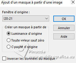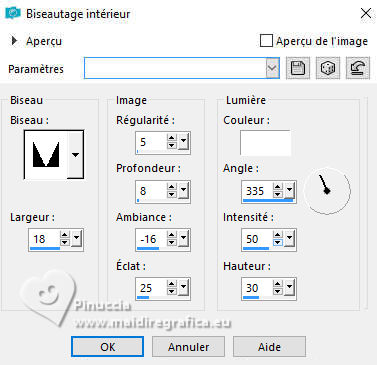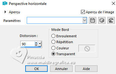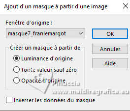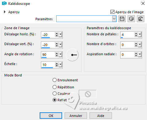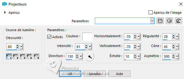 Le tutoriel a été créé avec PSP9 et traduit avec PSPX9 et PSP2020, mais il peut également être exécuté avec les autres versions. Suivant la version utilisée, vous pouvez obtenir des résultats différents. Depuis la version X4, la fonction Image>Miroir a été remplacée par Image>Renverser horizontalement, et Image>Renverser avec Image>Renverser verticalement. Dans les versions X5 et X6, les fonctions ont été améliorées par la mise à disposition du menu Objets. Avec la nouvelle version X7, nous avons à nouveau Miroir/Retourner, mais avec nouvelles différences. Consulter, si vouz voulez, mes notes ici Certaines dénominations ont changées entre les versions de PSP. Les plus frequentes dénominations utilisées: ![]() Traduction anglaise ici Vos versions ici![]() Nécessaire: ![]() (ici les liens vers les sites des créateurs de tubes) ![]() consulter, si nécessaire, ma section de filtre ici Filters Unlimited 2.0 ici FM Tile Tools - Saturation Emboss, Blend Emboss ici Xero - Clarity ici Graphics Plus - Cross Shadow ici Filtres Graphics Plus peuvent être utilisés seuls ou importés dans Unlimited. voir comment le faire ici). Si un filtre est fourni avec cette icône, ![]() N'hésitez pas à changer le mode mélange des calques et leur opacité selon les couleurs utilisées. ![]() Ouvrir les masques dans PSP et les minimiser avec le reste du matériel. 1. Ouvrir une nouvelle image transparente 1000 x 900 pixels. 2. Placer en avant plan la couleur #190000, et en arrière plan la couleur #d2b083. ![]() Remplir l'image transparente avec la couleur foncée.3. Calques>Nouveau calque raster. Remplir le calque avec la couleur claire.4. Calques>Nouveau calque de masque>A partir d'une image. Ouvrir le menu deroulant sous la fenêtre d'origine et vous verrez la liste des images ouvertes. Sélectionner le masque masque7_franiemargot ![]() Calques>Fusionner>Fusionner le groupe. 5. Effets>Modules Externes>FM Tile Tools - Saturation Emboss - 2 fois. ![]() Répéter l'effet une deuxième fois optionnel dans ta version: selon vos couleurs 6. Effets>Modules Externes>Xero - Clarity ![]() Répéter l'effet une deuxième fois optionnel dans ta version: selon vos couleurs Calques>Dupliquer. Calques>Fusionner>Fusionner le calque de dessous. 7. Vous positionner sur le calque d'arrière plan, Raster 1. Effets>Effets d'éclairage>Projecteurs Le tutoriel ne présente que le projecteur n.1. Pour le meilleur résultat, sélectionner d'abord les paramètres par défaut, puis ajustez-les du projecteur n.1, comme ci-dessous ![]() 8. Ouvrir l'image jpg du visage Rostro JPG ![]() Calques>Nouveau calque de masque>A partir d'une image. Ouvrir le menu deroulant sous la fenêtre d'origine et sélectionner le masque 20-21 . ![]() Calques>Dupliquer. Calques>Fusionner>Fusionner le groupe. Édition>Copier. Revenir sur votre travail et Édition>Coller comme nouveau calque. 9. Réglage>Luminosité et Contraste>Clarifier ![]() (optionnel dans vos version, seulement si votre image est trop foncée). dans les nouvelles versions de PSP vous ne trouvez pas cet effet. Dans le menu Réglage, choisissez l’effet qui vous convient le mieux. 10. Effets>Modules Externes>FM Tile Tools - Blend Emboss ![]() 11. Vous positionner sur le calque du masque Groupe-Raster 2. Effets>Modules Externes>Graphics Plus - Cross Shadow, par défaut. ![]() 12. Effets>Effets 3D>Ombre portée. ![]() 13. Vous positionner sur le calque Raster 1. Calques>Dupliquer. Effets>Effets géométriques>Perspective horizontale. ![]() Image>Miroir>Miroir Horizontal. Répéter Effets>Effets géométriques>Perspective horizontale, comme précédemment. ![]() 14. Effets>Effets de distorsion>Cintrage ![]() 15. Effets>Effets de distorsion>Vagues ![]() 16. Effets>Effets d'image>Mosaïque sans jointures ![]() 16. Vous positionner sur le calque du haut de la pile. Ouvrir le texte texto ![]() Édition>Copier. Revenir sur votre travail et Édition>Coller cmome nouveau calque. Positionner le texte à votre goût.17. Image>Ajouter des bordures, 8 pixels, symétrique, couleur foncée. Image>Ajouter des bordures, 2 pixels, symétrique, couleur claire. Image>Ajouter des bordures, 55 pixels, symétrique, couleur foncée. Activer l'outil Baguette magique ![]() et cliquer dans le dernier bord pour le sélectionner. 18. Effets>Effets de réflexion>Kaléïdoscope. ![]() 19. Réglage>Flou>Flou gaussien - rayon 30. ![]() 20. Effets>Effets 3D>Biseautage intérieur ![]() Optionnel: Édition>Répéter Biseautage intérieur. 21. Image>Ajouter des bordures, 2 pixels, symétrique, couleur claire. Sélections>Désélectionner tout. 22. Image>Redimensionner, à 84%, redimensionner tous les calques coché. Signer votre travail et enregistrer en jpg. Note de Luz Cristina: Les options que je vous propose vous invitent à être attentif pendant votre temps libre, et à faire preuve de discernement et de bon goût lorsqu'un effet nuit à votre conception. Ces étapes s'appliquent au modèle que j'ai réalisé. ![]() ![]() ![]() Si vous avez des problèmes, ou des doutes, ou vous trouvez un link modifié, ou seulement pour me dire que ce tutoriel vous a plu, vous pouvez m'écrire. |
