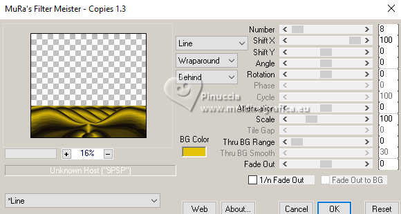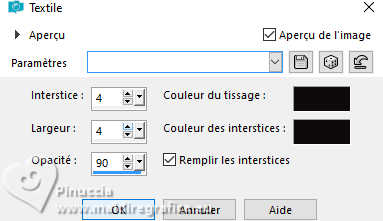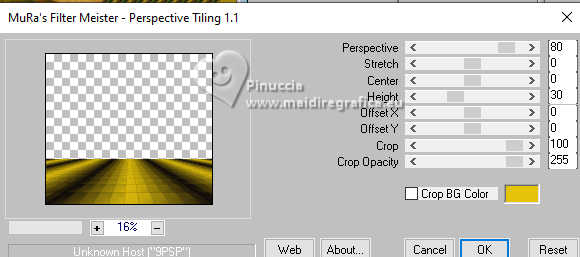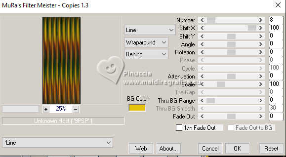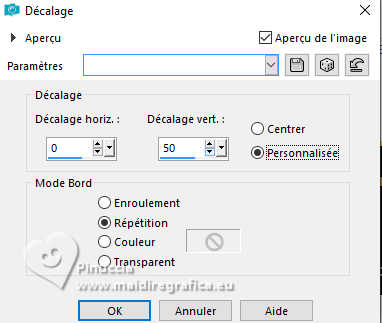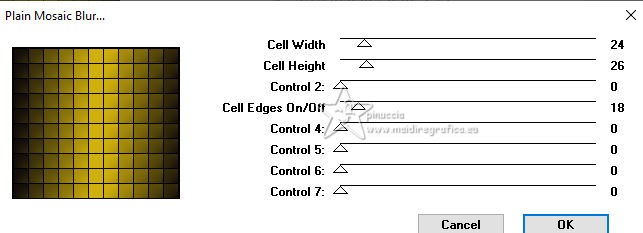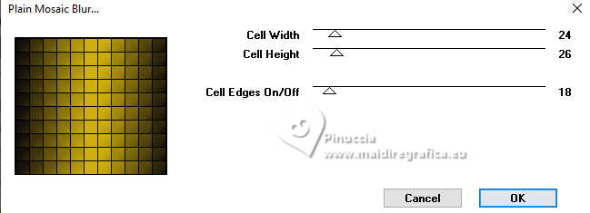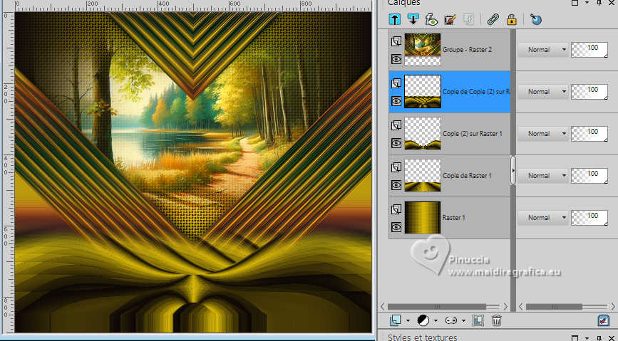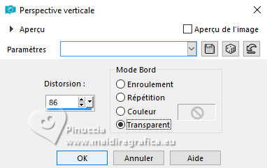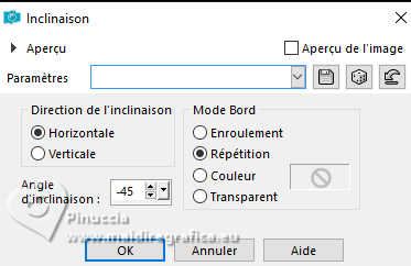 Le tutoriel a été créé avec PSP9 et traduit avec PSPX9 et PSP2020, mais il peut également être exécuté avec les autres versions. Suivant la version utilisée, vous pouvez obtenir des résultats différents. Depuis la version X4, la fonction Image>Miroir a été remplacée par Image>Renverser horizontalement, et Image>Renverser avec Image>Renverser verticalement. Dans les versions X5 et X6, les fonctions ont été améliorées par la mise à disposition du menu Objets. Avec la nouvelle version X7, nous avons à nouveau Miroir/Retourner, mais avec nouvelles différences. Consulter, si vouz voulez, mes notes ici Certaines dénominations ont changées entre les versions de PSP. Les plus frequentes dénominations utilisées: ![]() Traduction anglaise ici Vos versions ici![]() Nécessaire: ![]() (ici les liens vers les sites des créateurs de tubes) ![]() consulter, si nécessaire, ma section de filtre ici Filters Unlimited 2.0 ici Mehdi 2 - Flat Median ici FM Tile Tools - Blend Emboss ici Mura's Meister - Copies, Perspective Tiling ici Toadies - Plain Mosaic Blur ici AAA Frames - Foto Frame ici Filtres Toadies peuvent être utilisés seuls ou importés dans Filters Unlimited. voir comment le faire ici). Si un filtre est fourni avec cette icône, ![]() N'hésitez pas à changer le mode mélange des calques et leur opacité selon les couleurs utilisées. Dans les plus récentes versions de PSP, vous ne trouvez pas le dégradé d'avant plan/arrière plan ou Corel_06_029. Vous pouvez utiliser le dégradés des versions antérieures. Ici le dossier Dégradés de CorelX. ![]() Placer le masque dans le dossier Masques 1. Ouvrir une nouvelle image transparente 300 x 700 pixels. 2. Placer en avant plan la couleur #100b0a, et en arrière plan la couleur #e5c30b. ![]() Préparer en avant plan un dégradé de premier plan/arrière plan, style Linéaire. ![]() Remplir l'image transparente du dégradé.3. Sélections>Sélectionner tout. Ouvrir le tube de la femme 8456-luzcristina ![]() Édition>Copier. Revenir sur votre travail et Édition>Coller dans la sélection. Sélections>Désélectionner tout. 4. Effets>Effets d'image>Mosaïque sans jointures, par défaut. ![]() 5. Effets>Modules Externes>Mehdi 2 - Flat Median ![]() 6. Effets>Effets géométriques>Perspective verticale. ![]() 7. Image>Miroir>Miroir vertical (Image>Renverser). Répéter Effets>Effets géométriques>Perspective verticale. Et vous aurez ceci ![]() 8. Effets>Effets d'image>Décalage. ![]() 9. Effets>Modules Externes>Mura's Meister - Copies. ![]() 10. Image>Taille du support - 1000 x 900 pixels ![]() 11. Effets>Effets de réflexion>Miroir rotatif. ![]() 12. Effets>Effets géométriques>Inclinaison. ![]() 13. Effets>Effets de réflexion>Miroir rotatif, comme précédemment ![]() 14. Activer l'outil Baguette magique ![]() et cliquer la partie centrale pour la sélectionner. ![]() 15. Calques>Nouveau calque raster. Calques>Agencer>Déplacer vers le bas. Sélections>Modifier>Agrandir - 6 pixels. Remplir la sélection du dégradé.16. Effets>Effets de textures>Textile les deux couleurs: couleur d'avant plan ![]() 17. Sélections>Inverser. Effets>Effets 3D>Ombre portée, couleur noire. ![]() Édition>Répéter Ombre portée. Sélections>Inverser. 18. Ouvrir le misted 9121-LuzCristina ![]() Édition>Copier. Revenir sur votre travail et Édition>Coller dans la sélection. Sélections>Désélectionner tout. 19. Vous positionner sur le calque Raster 1. Effets>Modules Externes>FM Tile Tools - Blend Emboss, par défaut. ![]() 20. Calques>Fusionner>Fusionner le calque de dessous. 21. Calques>Charger/Enregistrer un masque>Charger à partir du disque. Chercher et charger le masque !!mask-fadesuave ![]() Calques>Dupliquer, pour appliquer le masque deux fois. Calques>Fusionner>Fusionner le groupe. j'ai utilisé le masque à partir du disque, parce que à partir d'une image ne m'a donné un bon résultat 22. Calques>Nouveau calque raster. Calques>Agencer>Déplacer vers le bas. Remplir le calque du dégradé.23. Effets>Modules Externes>Toadies - Plain Mosaic Blur. ![]() si vous utilisez la version avec plusieurs settages, le résultat ne change pas ![]() 24. Calques>Dupliquer. Effets>Modules Externes>Mura's Meister - Perspective Tiling. ![]() 25. Calques>Dupliquer. Effets>Effets de distorsion>Miroir déformant. ![]() 26. Calques>Dupliquer. Effets>Modules Externes>Mura's Meister - Copies, comme précédemment. ![]() 27. Effets>Effets d'image>Décalage. ![]() La tag et les calques ![]() 28. Image>Ajouter des bordures, 5 pixels, symétrique, couleur foncée. Édition>Copier 29. Image>Ajouter des bordures, 55 pixels, symétrique, couleur claire. Activer l'outil Baguette Magique ![]() et cliquer dans ce bord pour le sélectionner. Édition>Coller dans la sélection - l'image de l'étape 28. 30. Effets>Modules Externes>AAA Frames - Foto Frame. ![]() Sélections>Désélectionner tout. 31. Image>Ajouter des bordures, 2 pixels, symétrique, couleur claire. 32. Activer à nouveau le tube de la femme et Édition>Copier. Revenir sur votre travail et Édition>Coller comme nouveau calque. Déplacer le tube en bas à gauche.Effets>Effets 3D>Ombre portée, à choix. 33. Ouvrir le déco Image5High.Style_LR ![]() Édition>Copier. Revenir sur votre travail et Édition>Coller comme nouveau calque. Déplacer le tube en bas à droite.Effets>Effets 3D>Ombre portée, à choix. 34. Ouvrir le texte Texto ![]() Édition>Copier. Revenir sur votre travail et Édition>Coller comme nouveau calque. Déplacer le tube en bas au centre, ou à votre goût.35. Calques>Fusionner>Calques visibles. Image>Redimensionner, à 84%, redimensionner tous les calques coché. 36. Signer votre travail et enregistrer en jpg. ![]() ![]() Si vous avez des problèmes, ou des doutes, ou vous trouvez un link modifié, ou seulement pour me dire que ce tutoriel vous a plu, vous pouvez m'écrire. |