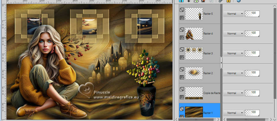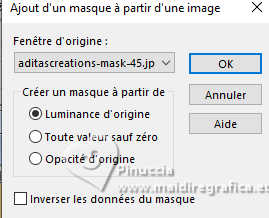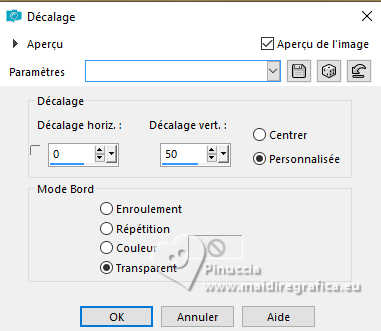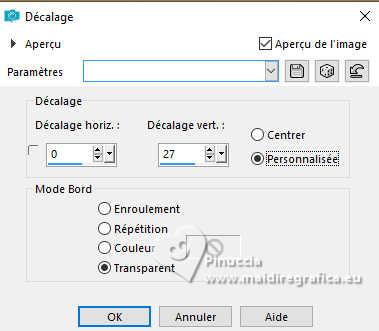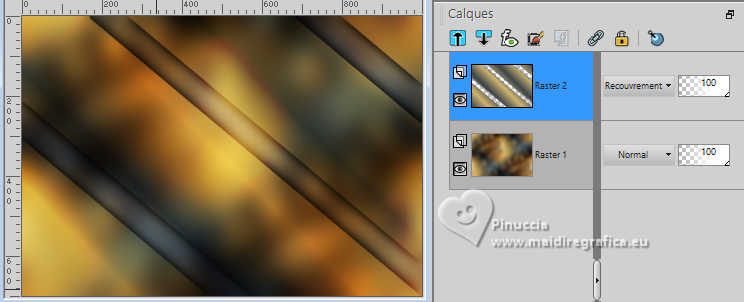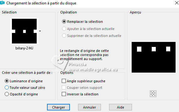 Pour traduire ce tutoriel j'ai utilisé PSPX9 et PSP2020, mais il peut également être exécuté avec les autres versions. Suivant la version utilisée, vous pouvez obtenir des résultats différents. Depuis la version X4, la fonction Image>Miroir a été remplacée par Image>Renverser horizontalement, et Image>Renverser avec Image>Renverser verticalement . Dans les versions X5 et X6, les fonctions ont été améliorées par la mise à disposition du menu Objets. Avec la nouvelle version X7, nous avons encore Image>Miroir et Image>Renverser/Retourner, mais avec nouvelles différences. Voir les détails à ce sujet ici Certaines dénominations ont changées entre les versions de PSP. Les plus frequentes dénominations utilisées: ![]() English translation here Vos versions ici![]() Nécessaire pour réaliser ce tutoriel: ![]() Grafico Marika Fantasy, merci Masque aditascreations, merci Images Pinterest - tubes - MJ (ici les liens vers les sites des créateurs du matériel) ![]() ![]() consulter, si nécessaire, ma section des filtres ici Filters Unlimited 2.0 ici VM Experimental - Magnetic Detection ici Filter Factory Gallery L - Send me an Angle ici Mura's Meister - Perspective Tiling ici Simple - Top Left Mirror ici Alien Skin Eye Candy 5 Impact - Glass ici Filtres VM Experimental, Factory Gallery et Simple peuvent être utilisés seuls ou importés dans Filters Unlimited. voir comment le faire ici. Si un filtre est fourni avec cette icône, ![]() en fonction des couleurs utilisées, vous pouvez changer le mode mélange et l'opacité des calques. Dans les plus récentes versions de PSP, vous ne trouvez pas le dégradé d'avant plan/arrière plan ou Corel_06_029. Vous pouvez utiliser le dégradés des versions antérieures. Ici le dossier Dégradés de CorelX. Placer le preset En cliquant sur le preset une ou deux fois (selon vos r glages) automatiquement il se placera directement dans le dossier Settings de Alien Skin Eye Candy. pourquoi un ou deux clic voir ici ![]() Placer le preset Emboss 3 dans le dossier Paramètres per défaut. Placer les sélections dans le dossier Sélections. Ouvrir le masque dans PSP et le minimiser avec le reste du matériel. Choisir deux couleurs de votre graphique; pour moi placer en avant plan la couleur #d0b370, et placer en arrière plan la couleur #3d464b. ![]() Préparer en avant plan un dégradé de premier plan/arrière plan, style Linéaire. ![]() 1. Ouvrir une nouvelle image transparente 1000 x 700 pixels. Sélections>Sélectionner tout. 2. Ouvrir l'image gráfico-marika-MJ ![]() Édition>Copier. Revenir sur votre travail et Édition>Coller dans la sélection. Sélections>Désélectionner tout. 3. Effets>Effets d'image>Mosaïque sans jointures. ![]() 4. Réglage>Flou>Flou gaussien - rayon 30 ![]() 5. Calques>Nouveau calque raster. Remplir le calque du dégradé.6. Sélections>Charger/Enregistrer une sélection>Charger à partir du disque. Chercher et charger la sélection britany-1-MJ ![]() Presser CANC sur le clavier ![]() ![]() Sélections>Désélectionner tout. 7. Effets>Effets 3D>Ombre portée, couleur noire. ![]() 8. Placer le calque en mode Recouvrement ![]() Calques>Fusionner>Fusionner le calque de dessous. 9. Effets>Modules Externes>Filters Unlimited 2.0 - VM Experimental - Magnetic Detection. ![]() 10. Effets>Modules Externes>Filters Unlimited 2.0 - Tile & Mirror - Seamless Blend (vertical) ![]() 11. Effets>Modules Externes>Filter Factory Gallery L - Send me an Angle, par défaut ![]() 12. Effets>Effets d'image>Mosaïque sans jointures. ![]() 13. Calques>Dupliquer. Effets>Modules Externes>Mura's Meister - Perspective Tiling. ![]() 14. Activer l'outil Baguette magique , tolérance 0 et progressivité 70,et cliquer dans la partie transparente pour la sélectionner. Presser +/-10 fois CANC sur le clavier. Sélections>Désélectionner tout. ne pas oublier de placer à nouveau la progressivité à 0 15. Effets>Effets de réflexion>Miroir rotatif, par défaut ![]() ![]() 16. Ouvrir misted-novo-MJ ![]() Édition>Copier. Revenir sur votre travail et Édition>Coller comme nouveau calque. 17. Effets>Effets d'image>Décalage (selon votre misted) ![]() 18. Calques>Nouveau calque raster. Placer en avant plan la Couleur. Remplir le calque avec la couleur claire d'avant plan.19. Calques>Nouveau calque de masque>A partir d'une image. Ouvrir le menu deroulant sous la fenêtre d'origine et vous verrez la liste des images ouvertes. Sélectionner le masque aditascreations-mask-45 ![]() Calques>Fusionner>Fusionner le groupe. 20. Effets>Filtre personnalisé - Emboss 3 ![]() 21. Effets>Effets de réflexion>Miroir rotatif, par défaut ![]() 22. Sélections>Charger/Enregistrer une sélection>Charger à partir du disque. Chercher et charger la sélection britany-2-MJ ![]() 23. Calques>Nouveau calque raster. Activer à nouveau l'image gráfico-marika-MJ et Édition>Copier. Revenir sur votre travail et Édition>Coller dans la sélection. 24. Effets>Modules Externes>Alien Skin Eye Candy 5 Impact - Glass sélectionner le preset britany-glass-MJ ![]() Calques>Agencer>Déplacer vers le bas. 25. Vous positionner sur le calque du masque Groupe-Raster3. Calques>Fusionner>Fusionner le calque de dessous. Sélections>Désélectionner tout. Effets>Effets 3D>Ombre portée, couleur noire. ![]() 26. Effets>Effets d'image>Décalage ![]() 27. Ouvrir le tube de la femme femme-2-britany ![]() Effacer le watermark et Édition>Copier. Revenir sur votre travail et Édition>Coller comme nouveau calque. Image>Redimensionner, à 60%, redimensionner tous les calques décoché Déplacer le tube à gauche, ou à votre goût.Effets>Effets 3D>Ombre portée, à choix. 28. Ouvrir le tube vasodecorativo-MJ ![]() Effacer le watermark et Édition>Copier. Revenir sur votre travail et Édition>Coller comme nouveau calque. Image>Redimensionner, à 50%, redimensionner tous les calques décoché Déplacer le tube à droite, ou à votre goût.Effets>Effets 3D>Ombre portée, à choix. 29. Vous positionner 