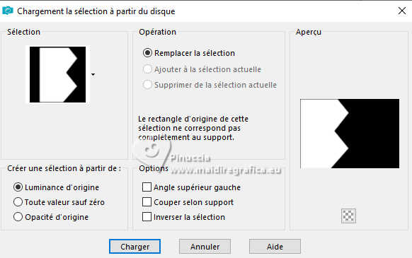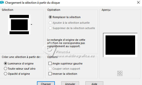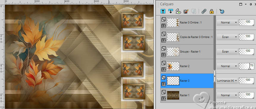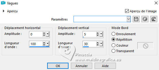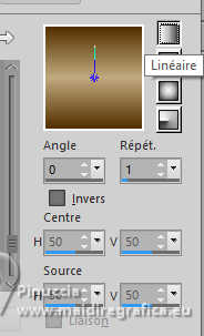 Pour traduire ce tutoriel j'ai utilisé PSPX9 et PSP2020, mais il peut également être exécuté avec les autres versions. Suivant la version utilisée, vous pouvez obtenir des résultats différents. Depuis la version X4, la fonction Image>Miroir a été remplacée par Image>Renverser horizontalement, et Image>Renverser avec Image>Renverser verticalement . Dans les versions X5 et X6, les fonctions ont été améliorées par la mise à disposition du menu Objets. Avec la nouvelle version X7, nous avons encore Image>Miroir et Image>Renverser/Retourner, mais avec nouvelles différences. Voir les détails à ce sujet ici Certaines dénominations ont changées entre les versions de PSP. Les plus frequentes dénominations utilisées: ![]() English translation here Vos versions ici![]() Nécessaire pour réaliser ce tutoriel: ![]() Pour un tube merci Delf. Le reste du matériel est de Maria José. (ici les liens vers les sites des créateurs du matériel) ![]() consulter, si nécessaire, ma section des filtres ici Filters Unlimited 2.0 ici Mura's Seamless - Emboss at Alpha ici Birgits Chaos - Tapestry ici Simple - Top Left Mirror ici Toadies - Weaver ici AAA Frames - Foto Frame ici Filtres Simple, Toadies et Mura's Seamless peuvent être utilisés seuls ou importés dans Filters Unlimited. voir comment le faire ici. Si un filtre est fourni avec cette icône, ![]() en fonction des couleurs utilisées, vous pouvez changer le mode mélange et l'opacité des calques. Dans les plus récentes versions de PSP, vous ne trouvez pas le dégradé d'avant plan/arrière plan ou Corel_06_029. Vous pouvez utiliser le dégradés des versions antérieures. Ici le dossier D´grad´s de CorelX. ![]() Placer les sélections dans le dossier Sélections. Ouvrir le masque dans PSP et le minimiser avec le reste du matériel. Choisir deux couleurs à votre goût Pour l'exemple: Placer en avant plan la couleur foncée #532f00, et en arrière plan la couleur claire #c1aa7e. ![]() Préparer en avant plan un dégradé de premier plan/arrière plan, style Linéaire. ![]() 1. Ouvrir une nouvelle image transparente 1000 x 700 pixels. Remplir l'image transparente avec la couleur claire d'arrière plan.2. Calques>Nouveau calque de masque>A partir d'une image. Ouvrir le menu deroulant sous la fenêtre d'origine et vous verrez la liste des images ouvertes. Sélectionner le masque mask-delf-MJ ![]() Calques>Fusionner>Fusionner le groupe. 3. Effets>Modules Externes>Mura's Seamless - Emboss at Alpha, par défaut. ![]() 4. Effets>Effets d'image>Mosaïques sans jointures. ![]() Placer le calque en mode Écran. 5. Calques>Nouveau calque raster. Remplir le calque du dégradé.6. Effets>Modules Externes>Birgits Chaos - Tapestry. ![]() 7. Effets>Effets d'image>Mosaïques sans jointures. ![]() 8. Sélections>Charger/Enregistrer une sélection>Charger à partir du disque. Chercher et charger la sélection Delf-MJ ![]() Calques>Nouveau calque raster. 9. Ouvrir le misted misted-delf-MJ ![]() Édition>Copier. Revenir sur votre travail et Édition>Coller dans la sélection. Sélections>Désélectionner tout. Réduire l'opacité de ce calque +/-70%. 10. Vous positionner sur le calque Groupe-Raster 1. Édition>Copier. Édition>Coller comme nouvelle image. Rester sur cette image. 11. Effets>Effets de réflexion>Miroir rotatif. ![]() Image>Redimensionner - 30%, redimensionner tous les calques coché. 12. Effets>Modules Externes>AAA Frames - Foto Frame. ![]() 13. Sélections>Charger/Enregistrer une sélection>Charger à partir du disque. Chercher et charger la sélection delf-1-MJ ![]() 14. Remplir la sélection du dégradé.Sélections>Désélectionner tout. Image>Redimensionner, à 50%, redimensionner tous les calques coché. 15. Édition>Copier. Revenir sur votre travail et Édition>Coller comme nouveau calque. ![]() Effets>Effets 3D>Ombre portée, couleur noire. ![]() 16. Touche K pour activer l'outil Sélecteur ![]() Position horiz.: 760,00 - Position vert.: 30,00 ![]() Touche M pour désélectionner l'outil. Effets>Effets 3D>Ombre portée, couleur blanche, ombre sur le nouveau calque coché. ![]() Réduire l'opacité du calque de l'ombre à 80%. 17. Vous positionner sur le calque Raster 3. Calques>Fusionner>Fusionner le calque de dessous. Calques>Dupliquer. Image>Miroir>Miroir horizontal. 18. Outil Sélecteur ![]() Position horiz.: 760,00 - Position vert.: 180,00. ![]() 19. Calques>Fusionner>Fusionner le calque de dessous. Calques>Dupliquer. Position horiz: 760,00 - Position vert.: 360,00. ![]() 20. Effets>Modules Externes>Toadies - Weaver, par défaut. ![]() 21. Effets>Effets de distorsion>Vagues. ![]() 22. Réglage>Netteté>Davantage de netteté. 23. Image>Retourner>Renverser verticalement. Cette commande retourne et laisse l'image dans la même position. Ci-dessous avant et après la commande. ![]() Si vous utilisez une ancienne version qui ne dispose pas de cette commande, dans ce cas, vous pouvez simplement faire Image>Renverser. Calques>Agencer>Déplacer vers le bas. Placer le calque en mode Écran. 24. Vous positionner sur le calque Raster 1. Ouvrir le tube deco-delf-MJ ![]() Édition>Copier. Revenir sur votre travail et Édition>Coller comme nouveau calque. Placer le calque en mode Luminance (héritée). La tag et les calques - adapter Mode mélange et opacité en fonction de vos couleurs ![]() 25. Ouvrir le tube de la femme Remove-tube-MJ ![]() Édition>Copier. Revenir sur votre travail et Édition>Coller comme nouveau calque. Image>Redimensionner, à 95%, redimensionner tous les calques décoché. Déplacer le tube à gauche.Effets>Effets 3D>Ombre portée, à choix. 26. Image>Ajouter des bordures, 1 pixel, symétrique, couleur foncée. 27. Sélections>Sélectionner tout. Édition>Copier Image>Ajouter des bordures, 50 pixels, symétrique, couleur blanche. 28. Sélections>Inverser. Édition>Coller dans la sélection (l'image de l'étape 27). 29. Effets>Effets de distorsion>Vent - vers la gauche, intensité 100. ![]() 30. Réglage>Net