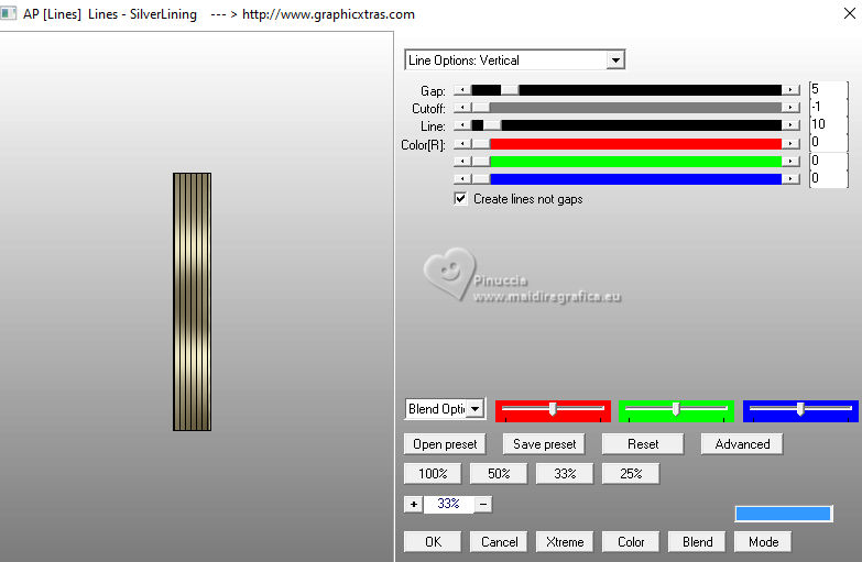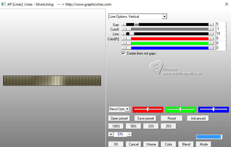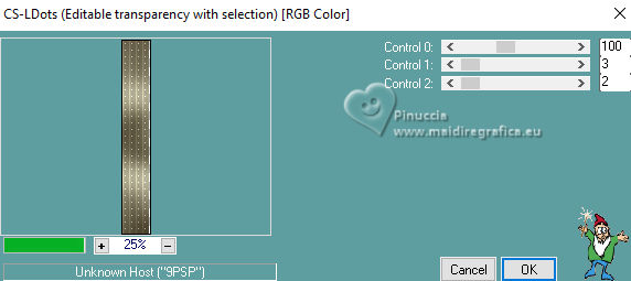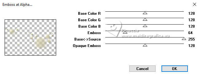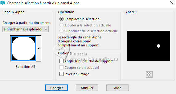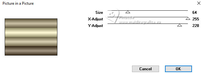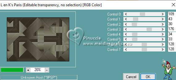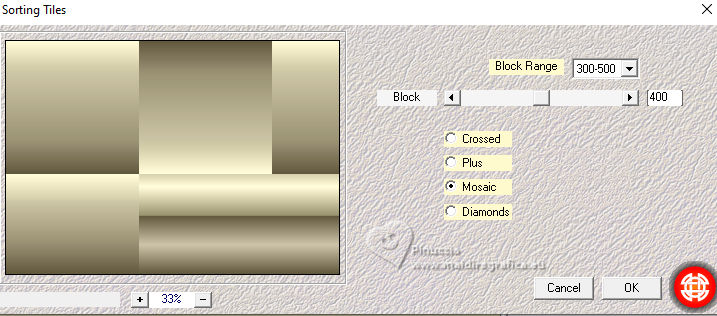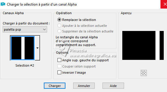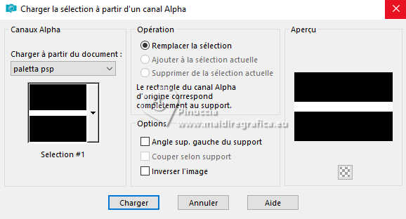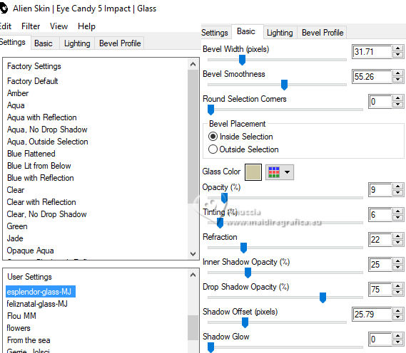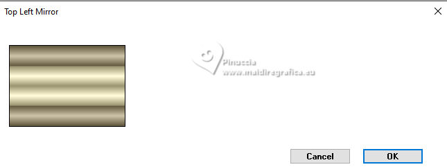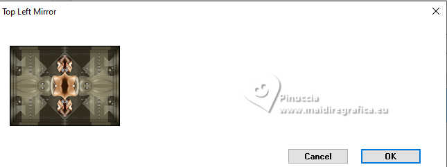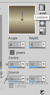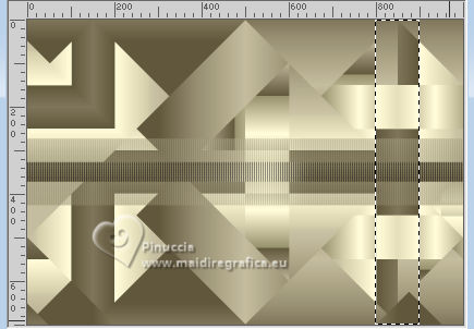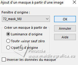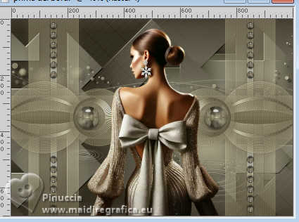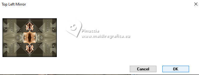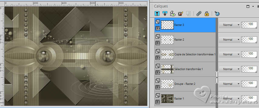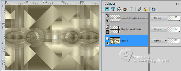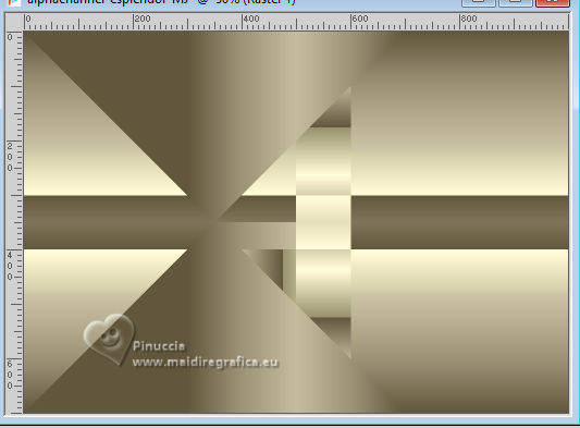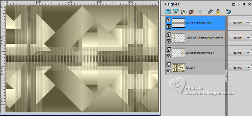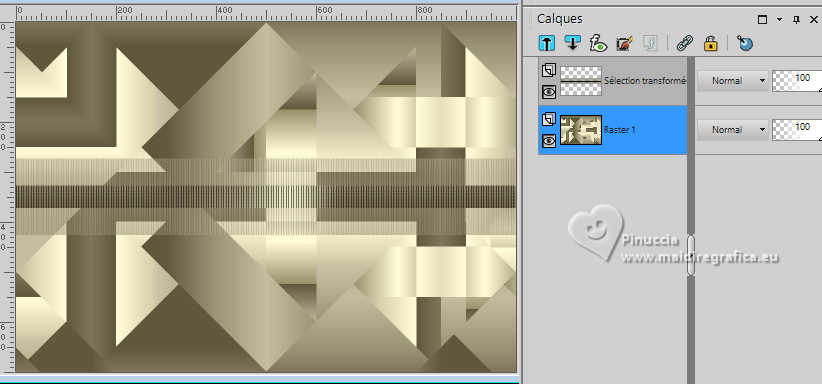 Pour traduire ce tutoriel j'ai utilisé PSPX9 et PSP2020, mais il peut également être exécuté avec les autres versions. Suivant la version utilisée, vous pouvez obtenir des résultats différents. Depuis la version X4, la fonction Image>Miroir a été remplacée par Image>Renverser horizontalement, et Image>Renverser avec Image>Renverser verticalement . Dans les versions X5 et X6, les fonctions ont été améliorées par la mise à disposition du menu Objets. Avec la nouvelle version X7, nous avons encore Image>Miroir et Image>Renverser/Retourner, mais avec nouvelles différences. Voir les détails à ce sujet ici Certaines dénominations ont changées entre les versions de PSP. Les plus frequentes dénominations utilisées: ![]() English translation here Vos versions ici![]() Nécessaire pour réaliser ce tutoriel: ![]() Matériel de Maria José (ici les liens vers les sites des créateurs du matériel) ![]() consulter, si nécessaire, ma section des filtres ici Filters Unlimited 2.0 ici VM Extravaganza - Picture in a picture ici Mehdi - Sorting Tiles ici Simple - Top Left Mirror, Pizza Slice Mirror ici AP [Lines] - Lines SilverLining ici Carolaine and Sensibility - CS-LDots ici Toadies - What are you ici Flaming Pear - Flexify 2 ici RCS Filter Pak 1.0 - Coppertooling Simulator ici Mura's Seamless - Emboss at Alpha ici L&K's - L&K's - Paris ici Alien Skin Eye Candy 5 Impact - Glass ici Filtres VM Extravaganza, Simple, Toadies, RCS Filter Pak et Mura's Seamless peuvent être utilisés seuls ou importés dans Filters Unlimited. voir comment le faire ici. Si un filtre est fourni avec cette icône, ![]() en fonction des couleurs utilisées, vous pouvez changer le mode mélange et l'opacité des calques. Dans les plus récentes versions de PSP, vous ne trouvez pas le dégradé d'avant plan/arrière plan ou Corel_06_029. Vous pouvez utiliser le dégradés des versions antérieures. Ici le dossier Dégradés de CorelX. Placer le preset En cliquant sur le preset une ou deux fois (selon vos r glages) automatiquement il se placera directement dans le dossier Settings de Alien Skin Eye Candy. pourquoi un ou deux clic voir ici Placer le preset pour Flexify dans un dossier de votre choix. Je le laisse habituellement dans le dossier du matériel. Vous l'importerez de ce dossier lorsque vous en aurez besoin. ![]() Ouvrir le masque dans PSP et le minimiser avec le reste du matériel Choisir deux couleurs du tube. Pour l'example: Placer en avant plan la couleur foncée #605340, et en arrière plan la couleur claire #cdc7a3. ![]() Préparer en avant plan un dégradé de premier plan/arrière plan, style Linéaire. ![]() 1. Ouvrir alphachannel-esplendor-MJ. Fenêtre>Dupliquer ou sur le clavier shift+D pour faire une copie. ![]() Fermer l'original. La copie, qui sera la base de votre travail, n'est pas vide, mais contient les sélections enregistrées sur le canal alpha. Remplir l'image transparente du dégradé.2. Effets>Modules Externes>VM Extravaganza - Picture in a Picture ![]() si vous avez une version avec plus de paramètres, ne vous inquiètez: tous les Control restant à 0 3. Effets>Modules Externes>Simple - Top Left Mirror ![]() 4. Effets>Modules Externes>Mehdi - Sorting Tiles ![]() 5. Effets>Modules Externes>Simple - Pizza Slice Mirror Nous avons ceci ![]() 6. Sélections>Charger/Enregistrer une sélection>Charger à partir d'un canal alpha. La sélection Selection #1 est déjà disponible. On doit seulement cliquer sur Charger. ![]() Sélections>Transformer la sélection en calque. Réglage>Flou>Flou gaussien - rayon 30. ![]() 7. Effets>Modules Externes>AP [Lines] - Lines SilverLining. ![]() 8. Effets>Modules Externes>Carolaine and Sensibility - CS-LDots ![]() Sélections>Désélectionner tout. 9. Effets>Modules Externes>Toadies - What Are You?... ![]() 10. Vous positionner sur le calque Raster 1. 11. Effets>Modules Externes>Simple - Blintz 12. Image>Retourner>Renverser verticalement (Image>Renverser). Effets>Modules Externes>Simple - Blintz. 13. Rester sur le calque Raster 1. ![]() Sélections>Charger/Enregistrer une sélection>Charger à partir d'un canal alpha. Ouvrir le menu des sélections et charger la sélection Selection #2 ![]() Sélections>Transformer la sélection en calque. 14. Réglage>Flou>Flou gaussien - rayon 30. ![]() 15. Effets>Modules Externes>AP [Lines] - Lines SilverLining, comme précédemment. ![]() 16. Effets>Modules Externes>Carolaine and Sensibility - CS-LDots, comme précédemment. ![]() Sélections>Désélectionner tout. 17. Effets>Modules Externes>Toadies - What Are You?... ![]() Calques>Dupliquer. Image>Miroir>Miroir horizontal. 18. Vous positionner sur le calque du haut de la pile, Sélection transformée. ![]() Calques>Fusionner>Fusionner le calque de dessous - 2 fois. Calques>Dupliquer. 19. Effets>Modules Externes>Flaming Pear - Flexify 2 Chercher le preset dans le dossier où vous l'avez copié ![]() ![]() 20. Image>Redimensionner, à 50%, redimensionner tous les calques décoché. 21. Objets>Aligner>Gauche. Calques>Dupliquer. Image>Miroir>Miroir horizontal. Calques>Fusionner>Fusionner le calque de dessous. 22. Réglage>Netteté>Davantage de netteté. Effets>Effets 3D>Ombre portée, couleur foncée d'avant plan. ![]() 23. Vous positionner sur le calque de dessous, Sélection transformée 1. Répéter l'étape 22: Réglage>Netteté>Davantage de netteté. Effets>Effets 3D>Ombre portée, couleur foncée d'avant plan. ![]() 24. Vous positionner sur le calque Raster 1. ![]() Effets>Modules Externes>RCS Filter Pak 1.0 - Coppertooling Simulator. ![]() 25. Calques>Nouveau calque raster. Réduire l'opacité de l'outil Pot de peinture à 80%. Remplir le calque avec la couleur claire d'arrière plan.ne pas oublier de placer à nouveau l'opacité de l'outil Pot de peinture à 100 26. Calques>Nouveau calque de masque>A partir d'une image. Ouvrir le menu deroulant sous la fenêtre d'origine et vous verrez la liste des images ouvertes. Sélectionner le masque 72-mask_MJ.