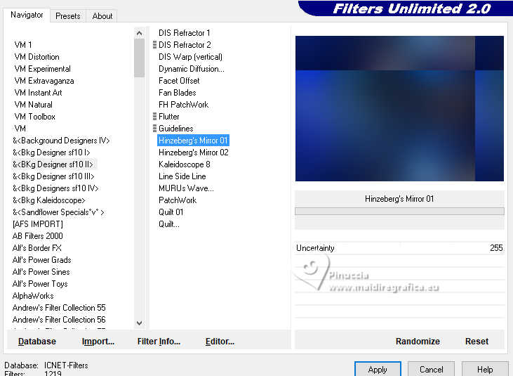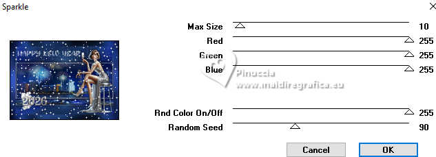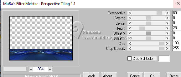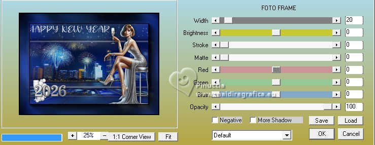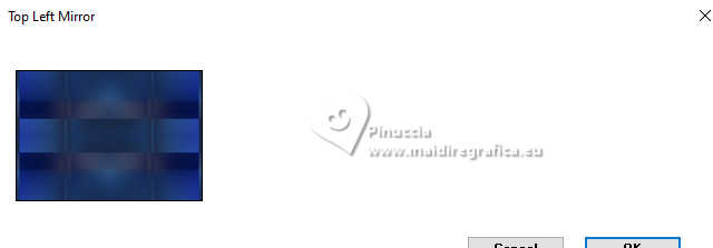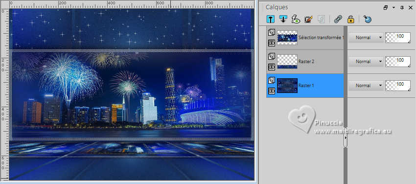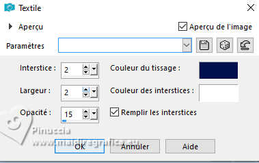 Pour traduire ce tutoriel j'ai utilisé PSPX9 et PSP2020, mais il peut également être exécuté avec les autres versions. Suivant la version utilisée, vous pouvez obtenir des résultats différents. Depuis la version X4, la fonction Image>Miroir a été remplacée par Image>Renverser horizontalement, et Image>Renverser avec Image>Renverser verticalement . Dans les versions X5 et X6, les fonctions ont été améliorées par la mise à disposition du menu Objets. Avec la nouvelle version X7, nous avons encore Image>Miroir et Image>Renverser/Retourner, mais avec nouvelles différences. Voir les détails à ce sujet ici Certaines dénominations ont changées entre les versions de PSP. Les plus frequentes dénominations utilisées: ![]() English translation here Vos versions ici![]() Nécessaire pour réaliser ce tutoriel: ![]() Images Pinterest - tubes MJ (ici les liens vers les sites des créateurs du matériel) ![]() ![]() consulter, si nécessaire, ma section des filtres ici Filters Unlimited 2.0 ici &<Bkg Designer sf10II> - Hinzenberg's Mirror 01 (à importer dans Unlimited) ici Mehdi 2 - Flat Median ici Graphics Plus - Cross Shadow ici VM Natural - Sparkle ici Mura's Meister - Perspective Tiling ici Simple - Top Left Mirror ici AAA Frames - Foto Frame ici Filtres Graphics Plus, VM Natural et Simple peuvent être utilisés seuls ou importés dans Filters Unlimited. voir comment le faire ici. Si un filtre est fourni avec cette icône, ![]() en fonction des couleurs utilisées, vous pouvez changer le mode mélange et l'opacité des calques. ![]() Placer la sélection dans le dossier Sélections. Choisir une couleur de votre graphique pour l'avant plan; pour moi #02104f, et placer en arrière plan la couleur #ffffff. ![]() 1. Ouvrir une nouvelle image transparente 1000 x 700 pixels. Sélections>Sélectionner tout. 2. Ouvrir l'image d'arrière plan gráfico-newyear-MJ ![]() Édition>Copier. Revenir sur votre travail et Édition>Coller dans la sélection. Sélections>Désélectionner tout. 3. Effets>Modules Externes>Mehdi 2 - Flat Median. ![]() 4. Effets>Modules Externes>Filters Unlimited 2.0 - &<Bkg Designer sf10II> - Hinzenberg's Mirror 01 ![]() 5. Effets>Effets d'image>Mosaïque sans jointures ![]() 6. Effets>Effets d'image>Mosaïque sans jointures ![]() 7. Effets>modules Externes>Simple - Top Left Mirror. ![]() 8. Réglage>Ajouter/Supprimer du bruit>Ajouter du bruit. ![]() 9. Sélections>Charger/Enregistrer une sélection>Charger à partir du disque. Chercher et charger la sélection MJ-newyear-1 ![]() Sélections>Transformer la sélection en calque. 10. Sélections>Modifier>Contracter - 12 pixels. Presser CANC sur le clavier ![]() Sélections>Désélectionner tout. 11. Effets>Effets de textures>Textile couleur du tissage: couleur d'avant plan #02104f couleur des interstices: couleur d'arrière plan #ffffff ![]() 12. Vous positionner sur le calque du bas de la pile, Raster 1. Sélections>Charger/Enregistrer une sélection>Charger à partir du disque. Charger à nouveau la sélection MJ-newyear-1 ![]() Sélections>Transformer la sélection en calque. 13. Réglage>Flou>Flou gaussien - rayon 25. ![]() 14. Ouvrir le misted misted-azul ![]() Édition>Copier. Revenir sur votre travail et Édition>Coller dans la sélection. Sélections>Désélectionner tout. 15. Vous positionner sur le calque du haut de la pile. Calques>Fusionner>Fusionner le calque de dessous. Effets>Effets 3D>Ombre portée, couleur noire. ![]() 16. Édition>Copie Spéciale>Copier avec fusion. Édition>Coller comme nouveau calque. 17. Effets>Modules Externes>Mura's Meister - Perspective Tiling. ![]() Calques>Agencer>Déplacer vers le bas. 18. Vous positionner à nouveau sur le calque Raster 1. Effets>Modules Externes>VM Natural - Sparkle. ![]() ![]() 19. Vous positionner sur le calque du haut de la pile. Ouvrir texto-1-MJ ![]() Édition>Copier. Revenir sur votre travail et Édition>Coller comme nouveau calque. Placer le calque en mode Écran, ou autre, selon votre travail. 20. Ouvrir deco-2026-MJ ![]() Édition>Copier. Revenir sur votre travail et Édition>Coller comme nouveau calque. Positionner le tube à votre goût.21. Ouvrir le tube femme-newyear-MJ ![]() Édition>Copier. Revenir sur votre travail et Édition>Coller comme nouveau calque. Déplacer le tube à droite.Le tube a déjà son ombre portée. 22. Vous positionner sur le calque Raster 1. Édition>Copier Pour précaution Édition>Coller comme nouvelle image et minimiser. La tag et les calques - adapter Mode mélange et opacité en fonction de votre travail ![]() 23 Image>Ajouter des bordures, 1 pixel, symétrique, couleur d'avant plan #02104f. Sélections>Sélectionner tout. 24. Image>Ajouter des bordures, 50 pixels, symétrique, couleur blanche. 25. Sélections>Inverser. Édition>Coller dans la sélection - l'image copiée à l'étape 22. 26. Réglage>Flou>Flou gaussien - rayon 25. ![]() 27. Effets>Modules Externes>Graphics Plus - Cross Shadow, par défaut. ![]() 28. Effets>Modules Externes>VM Natural - Sparkle, comme précédemment. ![]() 29. Réglage>Netteté>Davantage de netteté. 30. Sélections>Inverser. Effets>Effets 3D>Ombre portée, couleur noire. ![]() Sélections>Désélectionner tout. 31. Effets>Modules Externes>AAA Frames - Foto Frame. ![]() 32. Signer votre travail. Calques>Fusionner>Tous. 33. Image>Redimensionner, 1000 pixels de largeur, redimensionner tous les calques coché. Enregistrer en jpg. Version avec mes tubes (images Pinterest) ![]() ![]() ![]() Si vous avez des problèmes, ou des doutes, ou vous trouvez un link modifié, ou seulement pour me dire que ce tutoriel vous a plu, vous pouvez m'écrire. |