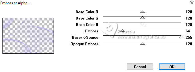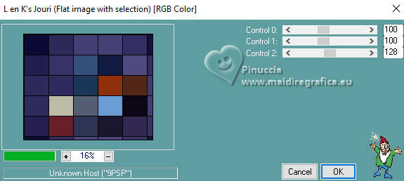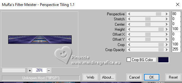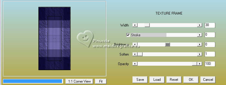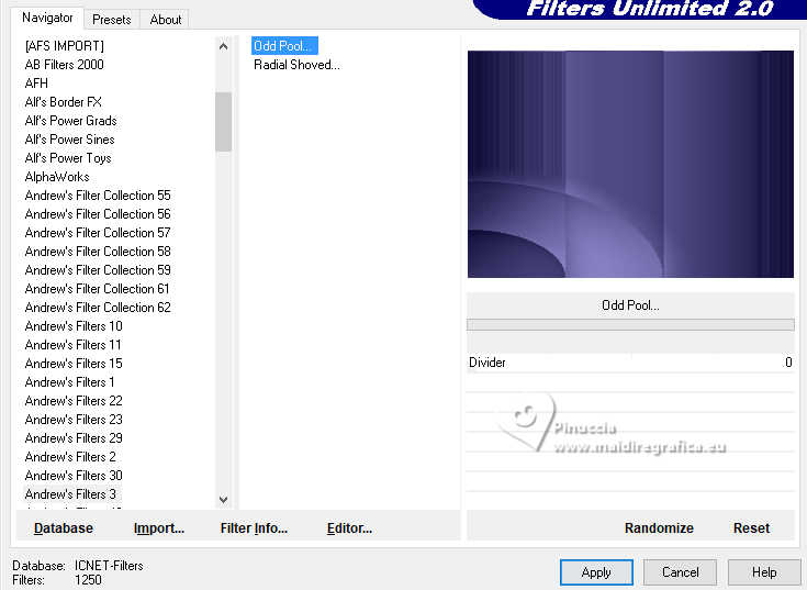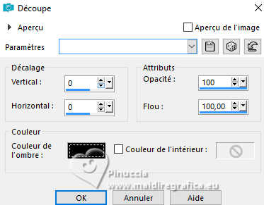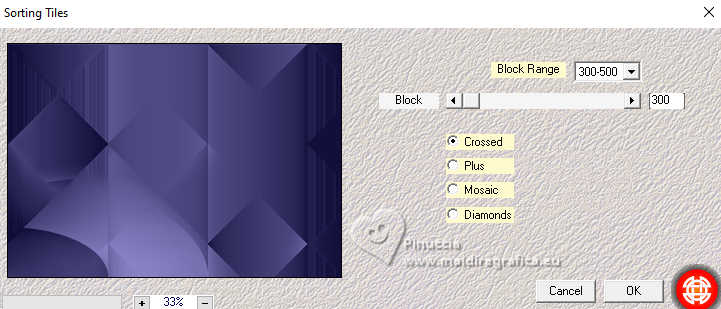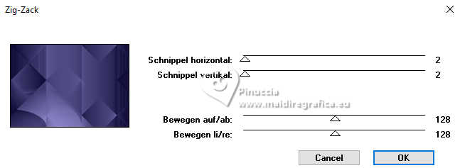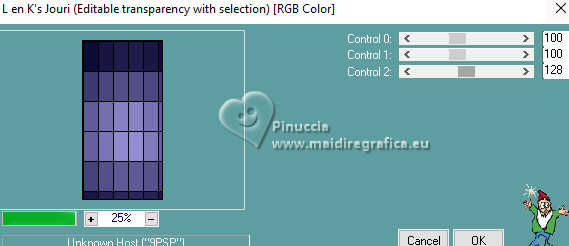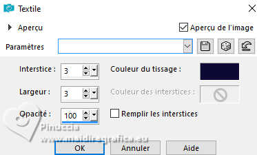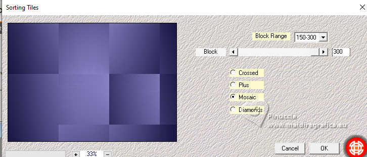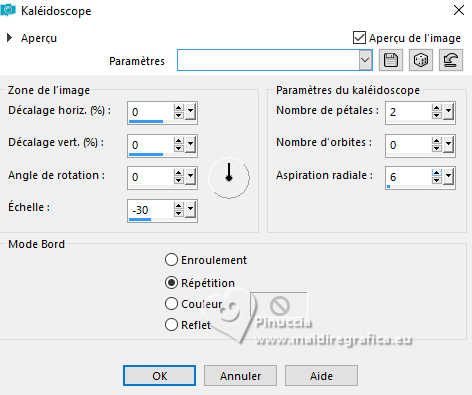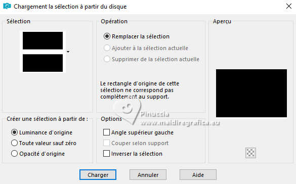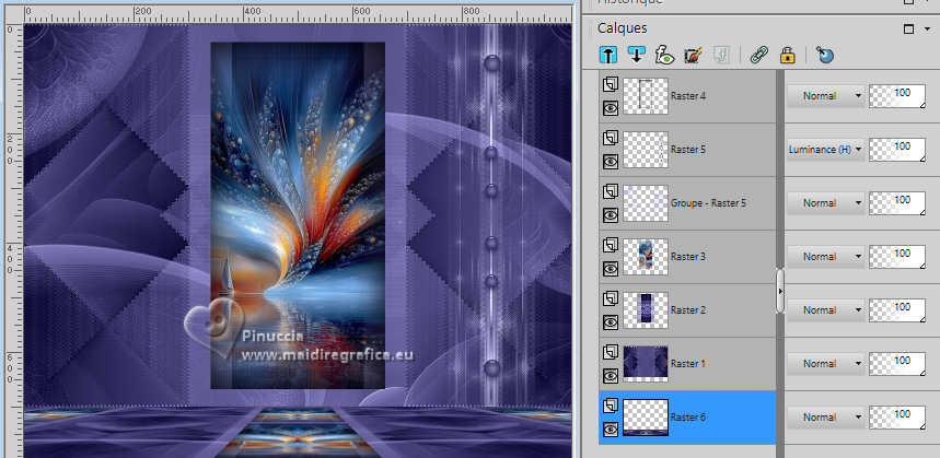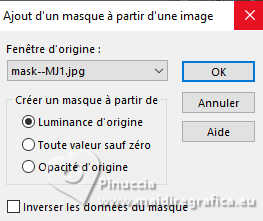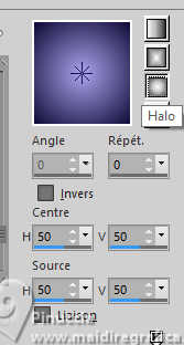 Pour traduire ce tutoriel j'ai utilisé PSPX9 et PSP2020, mais il peut également être exécuté avec les autres versions. Suivant la version utilisée, vous pouvez obtenir des résultats différents. Depuis la version X4, la fonction Image>Miroir a été remplacée par Image>Renverser horizontalement, et Image>Renverser avec Image>Renverser verticalement . Dans les versions X5 et X6, les fonctions ont été améliorées par la mise à disposition du menu Objets. Avec la nouvelle version X7, nous avons encore Image>Miroir et Image>Renverser/Retourner, mais avec nouvelles différences. Voir les détails à ce sujet ici Certaines dénominations ont changées entre les versions de PSP. Les plus frequentes dénominations utilisées: ![]() English translation here Vos versions ici![]() Nécessaire pour réaliser ce tutoriel: ![]() Pour le tube de la femme merci Steffi Buscher. Le reste du matériel est de Maria José (ici les liens vers les sites des créateurs du matériel) ![]() ![]() consulter, si nécessaire, ma section des filtres ici Filters Unlimited 2.0 ici Mehdi - Sorting Tiles ici Toadies - Blur'em, What are you ici Andrew's Filter 3 - Odd Pool ici Mura's Seamless - Emboss at Alpha ici Kiwi's - Zig-Zack ici Mura's Meister - Perspective Tiling ici L&K's - L&K's Jouri ici Simple - Top Left Mirror ici AAA Frames - Texture Frame ici Filtres Toadies, Andrew's, Mura's Seamless et Simple peuvent être utilisés seuls ou importés dans Filters Unlimited. voir comment le faire ici. Si un filtre est fourni avec cette icône, ![]() en fonction des couleurs utilisées, vous pouvez changer le mode mélange et l'opacité des calques. Dans les plus récentes versions de PSP, vous ne trouvez pas le dégradé d'avant plan/arrière plan ou Corel_06_029. Vous pouvez utiliser le dégradés des versions antérieures. Ici le dossier Dégradés de CorelX. ![]() Placer les sélections dans le dossier Sélections. Ouvrir le masque dans PSP et le minimiser avec le reste du matérie. 1. Choisir deux couleurs du tube; pour moi; placer en avant plan la couleur #aba3ec, et placer en arrière plan la couleur #0d0a35. ![]() Préparer en avant plan un dégradé de premier plan/arrière plan, style Halo. ![]() 2. Ouvrir une nouvelle image transparente 1000 x 700 pixels. Remplir l'image transparente du dégradé.3. Effets>Modules Externes>Toadies - Blur'em ![]() 4. Effets>Modules Externes>Mehdi - Sorting Tiles. ![]() 5. Effets>Modules Externes>Filters Unlimited 2.0 - Andrew's Filter 3 - Odd Pool ![]() 6. Effets>Modules Externes>Mehdi - Sorting Tiles. ![]() 7. Effets>Modules Externes>Kiwi's - Zig Zack, par défaut. ![]() 8. Effets>Modules Externes>Simple - Top Left Mirror. ![]() 9. Réglage>Netteté>Davantage de netteté. 10. Sélections>Charger/Enregistrer une sélection>Charger à partir du disque. Chercher et charger la sélection ingelore-1-MJ ![]() 11. Calques>Nouveau calque raster. Remplir le calque du dégradé.12. Effets>Modules Externes>L&K's - L&K's Jouri. ![]() 13. Effets>Effets de textures>Textile - couleur du tissage: couleur foncée d'arrière plan. ![]() 14. Effets>Effets de réflexion>Kaléïdoscope. ![]() 15. Effets>Modules Externes>AAA Frames - Texture Frame. ![]() Sélections>Désélectionner tout. 16. L'effet What are you peut donner des résultats différents selon la couleur d'arrière plan. Si vous le souhaitez, placer en arrière plan la couleur claire. Pour vous aider à choisir, voici le résultat avec la couleur claire en arrière plan Effets>Modules Externes>Toadies - What are you ![]() et voici le résultat avec la couleur foncée en arrière plan. ![]() 17. Sélections>Charger/Enregistrer une sélection>Charger à partir du disque. Charger à nouveau la sélection ingelore-1-MJ ![]() 18. Ouvrir le misted misted ![]() Édition>Copier. Revenir sur votre travail et Édition>Coller comme nouveau calque. Image>Redimensionner, si nécessaire. Positionner le misted à votre goût dans la sélection.19. Sélections>Inverser. Presser CANC sur le clavier ![]() Sélections>Inverser. Calques>Nouveau calque raster. 20. Effets>Effets 3D>Découpe. ![]() Sélections>Désélectionner tout. 21. Calques>Nouveau calque raster. Placer en avant plan la Couleur. Remplir le calque avec la couleur claire d'avant plan.22. Calques>Nouveau calque de masque>A partir d'une image. Ouvrir le menu deroulant sous la fenêtre d'origine et vous verrez la liste des images ouvertes. Sélectionner le masque mask-MJ1 ![]() Calques>Fusionner>Fusionner le groupe. 23. Effets>Modules Externes>Mura's Seamless - Emboss at Alpha, par défaut. ![]() 24. Sur le même calque: Sélections>Charger/Enregistrer une sélection>Charger à partir du disque. Charger encore une fois la sélection ingelore-1-MJ ![]() Presser CANC sur le clavier ![]() Sélections>Désélectionner tout. Calques>Agencer>Déplacer vers le bas. 25. Ouvrir deco-mj ![]() Édition>Copier. Revenir sur votre travail et Édition>Coller comme nouveau calque. 26. Touche K pour activer l'outil Sélecteur ![]() Position horiz.: 775,00 - Position vert.: 0,00 ![]() Touche M pour désélectionner l'outil. Placer le calque en mode Luminance (héritée). 27. Vous positionner sur le calque du haut de la pile. Édition>Copie Spéciale>Copier avec fusion 28. Image>Taille du support - 1000 x 800 pixels. ![]() 29. Sélections>Charger/Enregistrer une sélection>Charger à partir du disque. Chercher et charger la sélection ingelore-2-MJ ![]() 30. Calques>Nouveau calque raster. Édition>Coller dans la sélection - l'image en mémoire de l'étape 27. 31. Effets>Effets de réflexion>Miroir rotatif. ![]() 32. Effets>Modules Externes>Mura's Meister - Perspective Tiling, par défaut. ![]() Sélections>Désélectionner tout. 33. Calques>Agencer>Placer en bas de la pile. La tag et les calques - adapter Mode mélange et opacité en fonction de votre travail ![]() 34. Vous positionner sur le calque du haut de la pile. Ouvrir le tube SBWebdesignsCreation-steffibuscher ![]() Édition>Copier. Revenir 