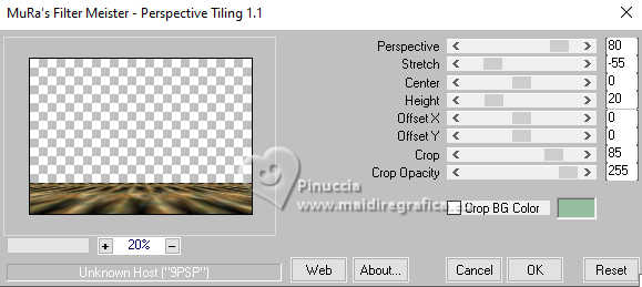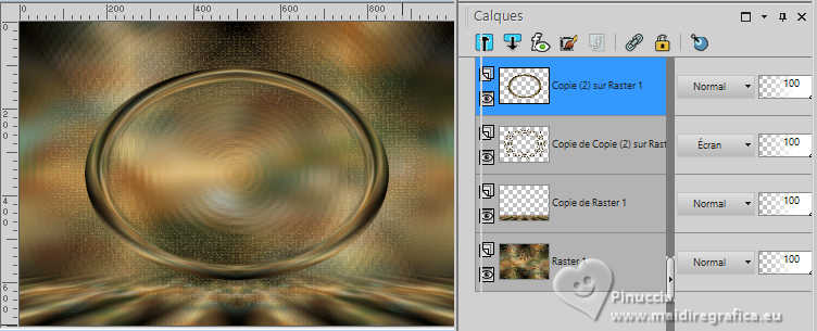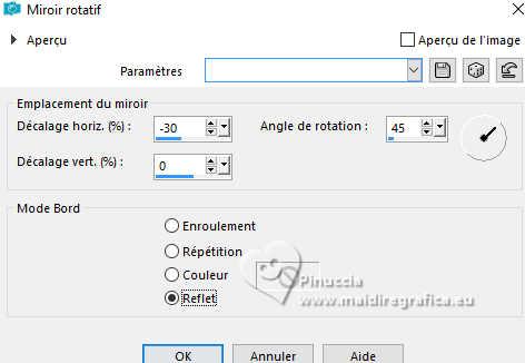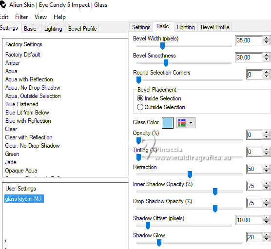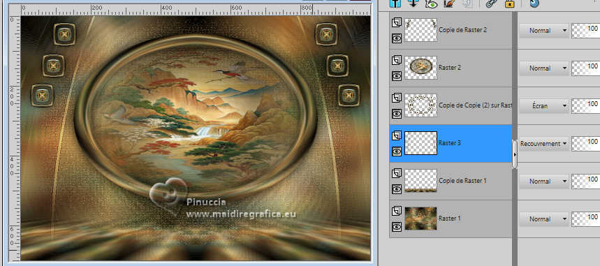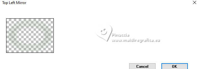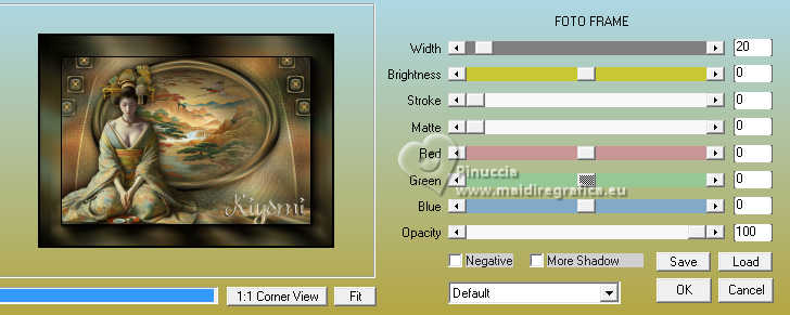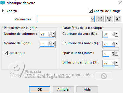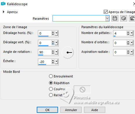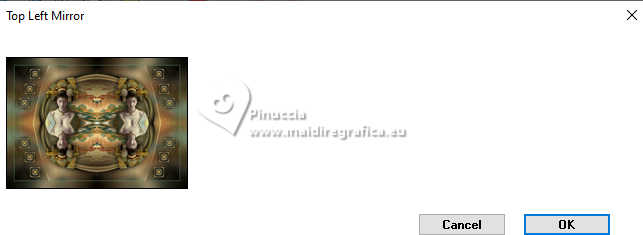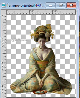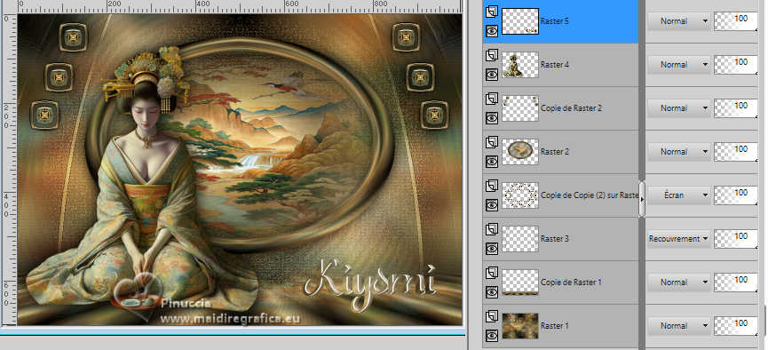 Pour traduire ce tutoriel j'ai utilisé PSPX9 et PSP2020, mais il peut également être exécuté avec les autres versions. Suivant la version utilisée, vous pouvez obtenir des résultats différents. Depuis la version X4, la fonction Image>Miroir a été remplacée par Image>Renverser horizontalement, et Image>Renverser avec Image>Renverser verticalement . Dans les versions X5 et X6, les fonctions ont été améliorées par la mise à disposition du menu Objets. Avec la nouvelle version X7, nous avons encore Image>Miroir et Image>Renverser/Retourner, mais avec nouvelles différences. Voir les détails à ce sujet ici Certaines dénominations ont changées entre les versions de PSP. Les plus frequentes dénominations utilisées: ![]() English translation here Vos versions ici![]() Nécessaire pour réaliser ce tutoriel: ![]() Images Pinterest - tube et misted MJ (ici les liens vers les sites des créateurs du matériel) ![]() consulter, si nécessaire, ma section des filtres ici Filters Unlimited 2.0 ici Greg's Factory Output vol.II - Waffle, Radial Hilite ici Mura's Meister - Perspective Tiling ici Simple - Top Left Mirror ici Alien Skin Eye Candy 5 Impact - Glass ici AAA Frames - Foto Frame ici Filtres Greg's Factory Output et Simple peuvent être utilisés seuls ou importés dans Filters Unlimited. voir comment le faire ici. Si un filtre est fourni avec cette icône, ![]() en fonction des couleurs utilisées, vous pouvez changer le mode mélange et l'opacité des calques. Placer le preset En cliquant sur le preset une ou deux fois (selon vos réglages) automatiquement il se placera directement dans le dossier Settings de Alien Skin Eye Candy. pourquoi un ou deux clic voir ici ![]() Placer la sélection dans le dossier Sélections. Placer en avant plan la couleur #4f7649, et en arrière plan la couleur #95be9e. ![]() 1. Ouvrir une nouvelle image transparente 1000 x 700 pixels. Sélections>Sélectionner tout. Ouvrir gráfico-1-MJ ![]() Édition>Copier. Revenir sur votre travail et Édition>Coller dans la sélection. Sélections>Désélectionner tout. 2. Effets>Effets d'image>Mosaïque sans jointures. ![]() 3. Réglage>Flou>Flou gaussien - rayon 20. ![]() 4. Effets>Modules Externes>Greg's Factory Output II - Waffle. ![]() 5. Effets>Modules Externes>Greg's Factory Output II - Radial Hilite. ![]() 6. Effets>Effete de bords>Accentuer davantage. Calques>Dupliquer. 7. Effets>Modules Externes>Mura's Meister - Perspective Tiling. ![]() 8. Activer l'outil Baguette magique , progressivité 60,et cliquer dans la partie transparente pour la sélectionner. Presser +/- 10 fois CANC sur le clavier ![]() Ne pas oublier de placer à nouveau la progressivité de votre Baguette magique à 0. 9. Effets>Effets de réflexion>Miroir rotatif, par défaut. ![]() Calques>Dupliquer. 10. Effets>Effets de réflexion>Miroir rotatif. ![]() 11. Effets>Effets de distorsion>Coordonnées polaires. ![]() 12. Effets>Effets de réflexion>Miroir rotatif, par défaut. ![]() 13. Image>Redimensionner, à 70%, redimensionner tous les calques décoché. Calques>Dupliquer. 14. Effets>Effets de textures>Mosaïque de verre. ![]() 15. Objets>Aligner>Centrer sur le support. Placer le calque en mode Écran. 16. Effets>Modules Externes>Simple - Top Left Mirror. ![]() Calques>Agencer>Déplacer vers le bas. Objets>Aligner>Haut. Vous positionner sur le calque Copie (2)sur Raster 1. ![]() 17. Sélections>Charger/Enregistrer une sélection>Charger à partir du disque. Chercher et charger la sélection kiyomi-1-MJ ![]() 18. Calques>Nouveau calque raster. Calques>Agencer>Déplacer vers le bas. 19. Ouvrir misted-tuto-MJ ![]() Édition>Copier. Revenir sur votre travail et Édition>Coller dans la sélection. 20. Vous positionner à nouveau sur le calque Copie (2) sur Raster 1. Calques>Fusionner>Fusionner le calque de dessous. Sélections>Désélectionner tout. Effets>Effets 3D>Ombre portée, couleur noire. ![]() 21. Touche K pour activer l'outil Sélecteur ![]() Position horiz.: 120,00 - Position vert.: 20,00. ![]() Touche M pour désélectionner l'outil. Calques>Dupliquer. 22. Effets>Effets de réflexion>Kaléïdoscope ![]() 23. Effets>Modules Externes>Alien Skin Eye Candy 5 Impact - Glass sélectionner le preset glass-kiyomi-MJ ![]() 24. Image>Redimensionner, à 25%, redimensionner tous les calques décoché. Position horiz.: 88,00 - Position vert.: 16,00. ![]() 25. Calques>Dupliquer. Position horiz.: 56,00 - Position vert.: 106,00. ![]() 26. Calques>Dupliquer. Position horiz.: 24,00 - Position vert.: 191,00. ![]() Calques>Fusionner>Fusionner le calque de dessous - 2 fois. 27. Calques>Dupliquer. Image>Miroir>Miroir horizontal. Calques>Fusionner>Fusionner le calque de dessous. 28. Réglage>Netteté>Davantage de netteté. Effets>Effets 3D>Ombre portée, couleur noire. ![]() 29. Ouvrir deco-kiyomi-MJ ![]() Édition>Copier. Revenir sur votre travail et Édition>Coller comme nouveau calque. Calques>Agencer>Déplacer vers le bas - 3 fois. Placer ce calque en mode Recouvrement. ![]() Vous positionner sur le calque Raster 1. Édition>Copier Édition>Copier comme nouvelle image et minimiser cette image. Revenir sur votre travail. Vous positionner sur le calque du haut de la pile, Copie de Raster 2. 30. Ouvrir le tube femme-oriental-MJ ![]() Effacer le watermark et Édition>Copier. Revenir sur votre travail et Édition>Coller comme nouveau calque. Image>Redimensionner, à 65%, redimensionner tous les calques décoché. Effets>Effets 3D>Ombre portée, à choix. 31. Ouvrir le texte texto ![]() Édition>Copier. Revenir sur votre travail et Édition>Coller comme nouveau calque. Déplacer le texte à votre goût, ou voir mon exemple.La tag et les calques - Mode mélange et opacité selon votre travail ![]() 32. Image>Ajouter des bordures, 1 pixel, symétrique, couleur claire d'arrière plan. Image>Ajouter des bordures, 1 pixel, symétrique, couleur foncée d'avant plan. 33. Sélections>Sélectionner tout. Image>Ajouter des bordures, 40 pixels, symétrique, c