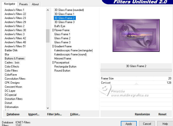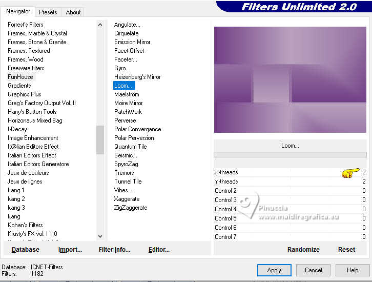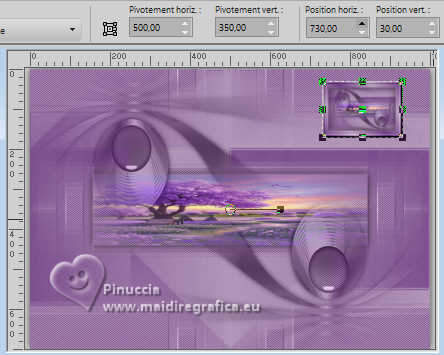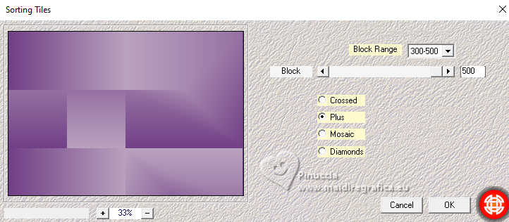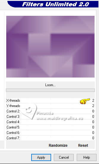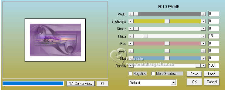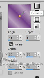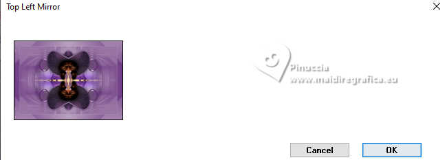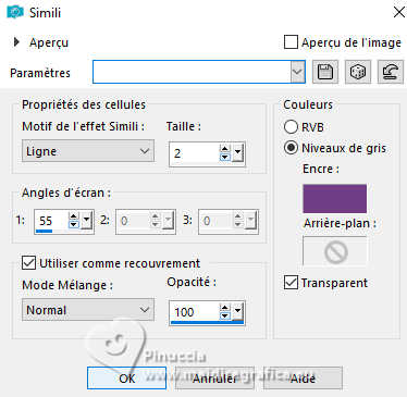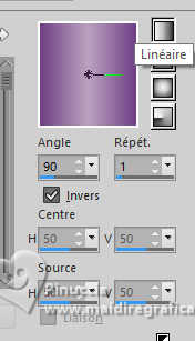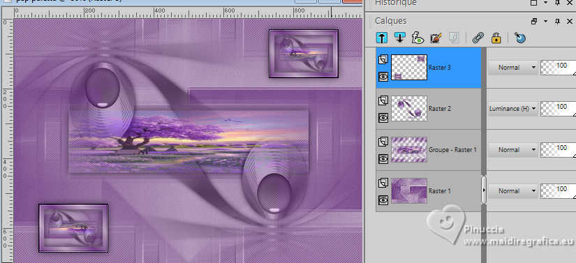 Pour traduire ce tutoriel j'ai utilisé PSPX9 et PSP2020, mais il peut également être exécuté avec les autres versions. Suivant la version utilisée, vous pouvez obtenir des résultats différents. Depuis la version X4, la fonction Image>Miroir a été remplacée par Image>Renverser horizontalement, et Image>Renverser avec Image>Renverser verticalement . Dans les versions X5 et X6, les fonctions ont été améliorées par la mise à disposition du menu Objets. Avec la nouvelle version X7, nous avons encore Image>Miroir et Image>Renverser/Retourner, mais avec nouvelles différences. Voir les détails à ce sujet ici Certaines dénominations ont changées entre les versions de PSP. Les plus frequentes dénominations utilisées: ![]() English translation here Vos versions ici![]() Nécessaire pour réaliser ce tutoriel: ![]() Matériel de Maria José (ici les liens vers les sites des créateurs du matériel) ![]() consulter, si nécessaire, ma section des filtres ici Filters Unlimited 2.0 ici Mura's Seamless - Emboss at Alpha ici Mehdi - Sorting Tile ici Simple - Blintz, Top Left Mirror ici AAA Frames - Foto Frame ici Funhouse - Loom ici Filtres Mura's Seamless, Funhouse et Simple peuvent être utilisés seuls ou importés dans Filters Unlimited. voir comment le faire ici. Si un filtre est fourni avec cette icône, ![]() en fonction des couleurs utilisées, vous pouvez changer le mode mélange et l'opacité des calques. Dans les plus récentes versions de PSP, vous ne trouvez pas le dégradé d'avant plan/arrière plan ou Corel_06_029. Vous pouvez utiliser le dégradés des versions antérieures. Ici le dossier Dégradés de CorelX. ![]() Placer les sélections dans le dossier Sélections. Ouvrir le masque dans PSP et le minimiser avec le reste du matériel. Choisir deux couleurs du tube. Pour l'exemple: Placer en avant plan la couleur #b9a2be, et en arrière plan la couleur #713f86. ![]() 1. Ouvrir une nouvelle image transparent 1000 x 700 pixels. Remplir l'image transparente avec la couleur claire d'avant plan.2. Calques>Nouveau calque de masque>A partir d'une image. Ouvrir le menu deroulant sous la fenêtre d'origine et vous verrez la liste des images ouvertes. Sélectionner le masque maskcameron215 ![]() Calques>Fusionner>Fusionner le groupe. 3. Effets>Modules Externes>Mura's Seamless - Emboss at Alpha, par défaut. ![]() 4. Effets>Effets d'image>Mosaïque sans jointures. ![]() 5. Effets>Effets artistiques>Simili - couleur d'arrière plan ![]() 6. Préparer en avant plan un dégradé de premier plan/arrière plan, style Linéaire. ![]() Calques>Nouveau calque raster. Remplir le calque du dégradé.7. Effets>Modules Externes>Mehdi - Sorting Tiles. ![]() 8. Effets>Modules Externes>Filters Unlimited 2.0 - Funhouse - Loom. ![]() 9. Effets>Modules Externes>Simple - Blintz. Cet effet travaille sans fenêtre; résultat ![]() 10. Image>Miroir>Miroir vertical (Image>Renverser) 11. Effets>Modules Externes>Filters Unlimited 2.0 - Funhouse - Loom, comme précédemment. ![]() 12. Réglage>Ajouter/Supprimer du bruit>Ajouter du bruit. ![]() 13. Réglage>Netteté>Davantage de netteté. 14. Calques>Agencer>Placer en bas de la pile. 15. Vous positionner sur le calque du haut, Groupe-Raster 1. Sélections>Charger/Enregistrer une sélection>Charger à partir du disque. Chercher et charger la sélection luara-MJ ![]() 16. Calques>Nouveau calque raster. Ouvrir le misted misted-luara-MJ ![]() Édition>Copier. Revenir sur votre travail et Édition>Coller dans la sélection. 17. Calques>Fusionner>Fusionner le calque de dessous. Effets>Effets 3D>Ombre portée, couleur noire. ![]() Sélections>Désélectionner tout. 18. Ouvrir deco-luara-MJ ![]() Édition>Copier. Revenir sur votre travail et Édition>Coller comme nouveau calque. Placer le calque en mode Luminance (héritée). 19. Édition>Copie Spéciale>Copier avec fusion Édition>Coller comme nouvelle image. 20. Sur cette image. Image>Redimensionner, à 20%, redimensionner tous les calques coché. 21. Effets>Modules Externes>AAA Frames - Foto Frame. ![]() 22. Sélections>Charger/Enregistrer une sélection>Charger à partir du disque. Chercher et charger la sélection luara-1-MJ ![]() Changer les réglages du dégradé ![]() Remplir la sélection du dégradé.23. Effets>Modules Externes>Filters Unlimited 2.0 - Buttons &Frames - 3D Glass Frame 2. ![]() Effets>Effets 3D>Ombre portée, couleur noire. ![]() Sélections>Désélectionner tout. 24. Édition>Copier. Revenir sur votre travail et Édition>Coller comme nouveau calque. 25. Touche K pour activer l'outil Sélecteur ![]() Position horiz.: 730,00 - Position vert.: 30,00. ![]() Touche M pour désélectionner l'outil. 26. Calques>Dupliquer. Image>Miroir>Miroir horizontal. Image>Miroir>Miroir vertical (Image>Renverser). 27. Calques>Fusionner>Fusionner le calque de dessous. Effets>Effets 3D>Ombre portée, couleur noire. ![]() Vous positionner sur le calque Raster 1 Édition>Copier Édition>Coller comme nouvelle image et minimiser cette image. La tag et les calques - adapter Mode mélange en fonction de votre travail. ![]() 28. Ouvrir le tube femme-tube MJ ![]() Effacer le watermark et Édition>Copier. Revenir sur votre travail et Édition>Coller comme nouveau calque. Image>Redimensionner, à 74%, redimensionner tous les calques décoché. Calques>Agencer>Placer en haut de la pile. Image>Miroir>Miroir horizontal. Positionner le tube à votre goût.Effets>Effets 3D>Ombre portée, à choix. 29. Image>Ajouter des bordures, 50 pixels, symétrique, couleur blanche. 30. Activer l'outil Baguette magique , progressivité 5,et cliquer dans ce bord pour le sélectionner. 31. Activer l'image minimisée à l'étape 27 et Édition>Copier. Revenir sur votre travail et Édition>Coller dans la sélection. 32. Effets>Modules Externes>Simple - Top Left Mirror. ![]() Effets>Effets 3D>Ombre portée, couleur noire. ![]() 33. Sélections>Séletionner tout. Sélections>Modifier>Contracter - 25 pixels. Sélections>Inverser. 34. Réglag
