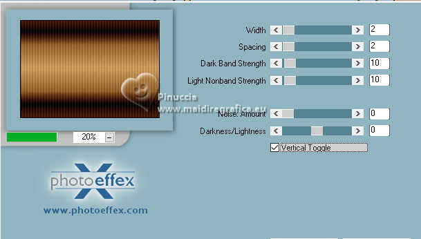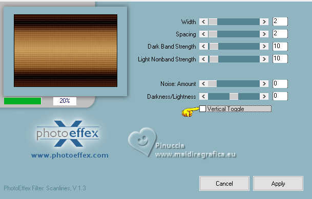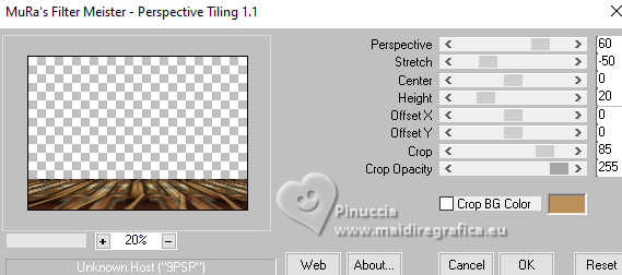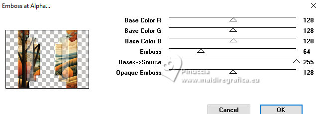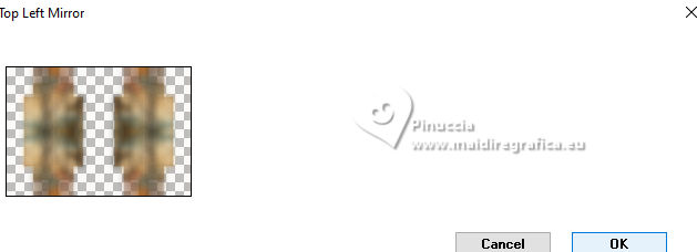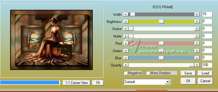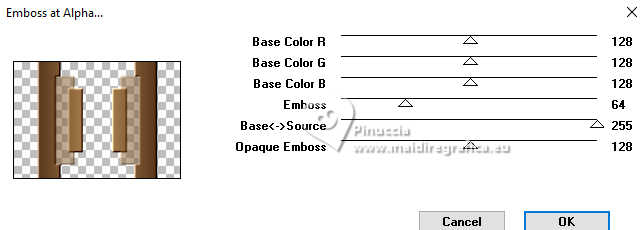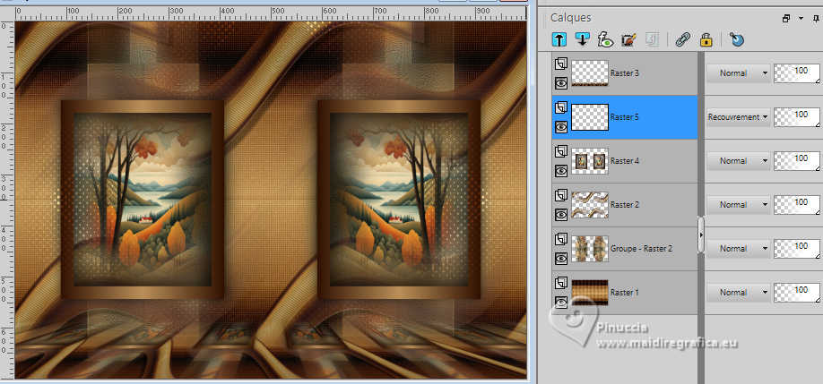 Pour traduire ce tutoriel j'ai utilisé PSPX9 et PSP2020, mais il peut également être exécuté avec les autres versions. Suivant la version utilisée, vous pouvez obtenir des résultats différents. Depuis la version X4, la fonction Image>Miroir a été remplacée par Image>Renverser horizontalement, et Image>Renverser avec Image>Renverser verticalement . Dans les versions X5 et X6, les fonctions ont été améliorées par la mise à disposition du menu Objets. Avec la nouvelle version X7, nous avons encore Image>Miroir et Image>Renverser/Retourner, mais avec nouvelles différences. Voir les détails à ce sujet ici Certaines dénominations ont changées entre les versions de PSP. Les plus frequentes dénominations utilisées: ![]() English translation here Vos versions ici![]() Nécessaire pour réaliser ce tutoriel: ![]() Image KamilTube-1493-BG. Merci. Mask Cameron. Merci Le reste du matériel est de Maria José. (ici les liens vers les sites des créateurs du matériel) ![]() consulter, si nécessaire, ma section des filtres ici Filters Unlimited 2.0 ici Simple - Top Left Mirror ici PhotoEffex - Scanlines ici Mura's Meister - Perspective Tiling ici Mura's Seamless - Emboss at Alpha ici AAA Frames - Foto Frame ici Filtres Mura's Seamless et Simple peuvent être utilisés seuls ou importés dans Filters Unlimited. voir comment le faire ici. Si un filtre est fourni avec cette icône, ![]() en fonction des couleurs utilisées, vous pouvez changer le mode mélange et l'opacité des calques. Dans les plus récentes versions de PSP, vous ne trouvez pas le dégradé d'avant plan/arrière plan ou Corel_06_029. Vous pouvez utiliser le dégradés des versions antérieures. Ici le dossier Dégradés de CorelX. ![]() Placer la sélection dans le dossier Sélections Ouvrir le masque dans PSP et le minimiser avec le reste du matériel Ouvrir layer-base-MJ. Cette image sera la base de votre travail. Coloriser à votre goût Choisir deux couleurs de votre image layer-base-MJ Pour l'example: Placer en avant plan la couleur foncée #311203, et en arrière plan la couleur claire #bb9059. ![]() Préparer en avant plan un dégradé de premier plan/arrière plan, style Linéaire. ![]() 1. Calques>Nouveau calque raster. Remplir le calque du dégradé.2. Calques>Nouveau calque de masque>A partir d'une image. Ouvrir le menu deroulant sous la fenêtre d'origine et vous verrez la liste des images ouvertes. Sélectionner le masque maskzephir2-camerontags. ![]() Calques>Fusionner>Fusionner le groupe. 3. Effets>Modules Externes>Mura's Seamless - Emboss at Alpha, par défaut. ![]() 4. Effets>Effets d'image>Mosaïque sans jointures. ![]() 5. Calques>Nouveau calque raster. Sélections>Sélectionner tout. 6. Ouvrir le graphique KamilTube-1493-BG ![]() Édition>Copier. Revenir sur votre travail et Édition>Coller dans la sélection. Sélections>Désélectionner tout. 7. Calques>Nouveau calque de masque>A partir d'une image. Ouvrir le menu deroulant sous la fenêtre d'origine et sélectionner à nouveau le masque maskzephir2-camerontags. ![]() Calques>Fusionner>Fusionner le groupe. 8. Effets>Modules Externes>Mura's Seamless - Emboss at Alpha, par défaut. ![]() 9. Effets>Effets d'image>Mosaïque sans jointures. ![]() 10. Effets>Effets de textures>Moulage plastique. ![]() Calques>Fusionner>Fusionner le calque de dessous. 11. Réglage>Netteté>Davantage de netteté. 12. Effets>Modules Externes>Simple - Top Left Mirror. ![]() Effets>Effets 3D>Ombre portée, couleur noire. ![]() 13. Ouvrir deco-lucrecia-MJ ![]() Édition>Copier. Revenir sur votre travail et Édition>Coller comme nouveau calque. Effets>Effets 3D>Ombre portée, par défaut. ![]() 14. Sélections>Charger/Enregistrer une sélection>Charger à partir du disque. Chercher et charger la sélection lucrecia-MJ ![]() 15. Calques>Nouveau calque raster. Remplir la sélection du dégradé.Sélections>Modifier>Contracter - 25 pixels. Presser CANC sur le clavier ![]() 16. Calques>Nouveau calque raster. Ouvrir le misted misted-lucrecia-MJ ![]() Édition>Copier. Revenir sur votre travail et Édition>Coller dans la sélection. 17. Calques>Agencer>Déplacer vers le bas. Vous positionner sur le calque de dessus, Raster 3. Calques>Fusionner>Fusionner le calque de dessous. 18. Garder sélectionné. Calques>Nouveau calque raster. Effets>Effets 3D>Découpe. ![]() Calques>Fusionner>Fusionner le calque de dessous. Sélections>Désélectionner tout. 19. Calques>Dupliquer. Image>Miroir>Miroir horizontal. Calques>Fusionner>Fusionner le calque de dessous. Effets>Effets 3D>Ombre portée, couleur noire. ![]() 20. Vous positionner sur le calque Raster 1. Réglage>Ajouter/Supprimer du bruit>Ajouter du bruit. ![]() Effets>Modules Externes>PhotoEffex - Scanlines ![]() Répéter Effets>Modules Externes>PhotoEffex - Scanlines Vertical Toggle décoché ![]() 21. Vous positionner sur le calque du haut de la pile, Raster 4. Édition>Copie Spéciale>Copier avec fusion. 22. Édition>Coller comme nouveau calque. 23. Effets>Modules Externes>Mura's Meister - Perspective Tiling. ![]() 24. Activer l'outil Baguette magique , tolérance 0 et progressivité 80,et cliquer dans la partie transparente pour la sélectionner. Presser +/- 10 fois CANC sur le clavier. Sélections>Désélectionner tout. ne pas oublier de placer à nouveau la progressivité à 0 25. Image>Miroir>Miroir horizontal. 26. Ouvrir deco_1_mj ![]() Édition>Copier. Revenir sur votre travail et Édition>Coller comme nouveau calque. Calques>Agencer>Déplacer vers le bas. 27. Réglage>Netteté>Davantage de netteté. Placer le calque en mode Recouvrement. La tag et les calques - adapter Mode mélange et opacité en fonction de votre travail ![]() 28. Vous positionner sur le calque du haut de la pile. Ouvrir le tube AI-tube-MJ ![]() Édition>Copier. Revenir sur votre travail et Édition>Coller comme nouveau calque. Image>Redimensionner, si nécessaire, pour le tube fournie je n'ai pas rédimensionné. Positionner bien le tube.Effets>Effets 3D