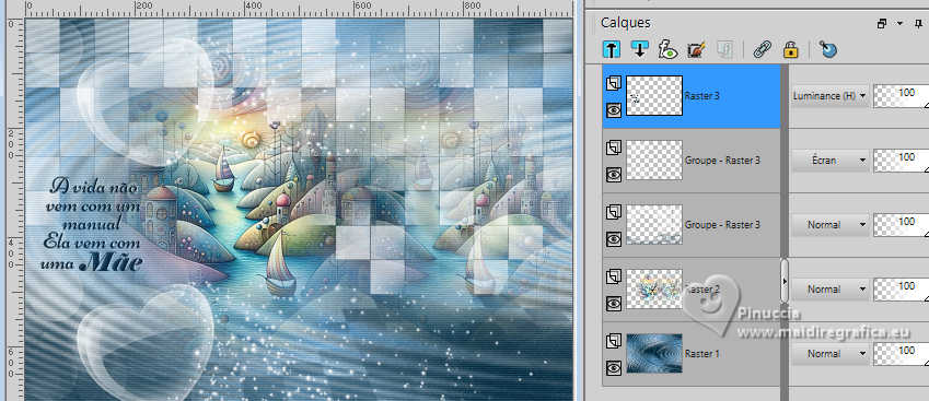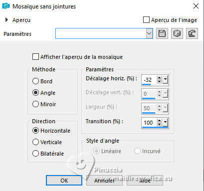 Pour traduire ce tutoriel j'ai utilisé PSPX9 et PSP2020, mais il peut également être exécuté avec les autres versions. Suivant la version utilisée, vous pouvez obtenir des résultats différents. Depuis la version X4, la fonction Image>Miroir a été remplacée par Image>Renverser horizontalement, et Image>Renverser avec Image>Renverser verticalement . Dans les versions X5 et X6, les fonctions ont été améliorées par la mise à disposition du menu Objets. Avec la nouvelle version X7, nous avons encore Image>Miroir et Image>Renverser/Retourner, mais avec nouvelles différences. Voir les détails à ce sujet ici Certaines dénominations ont changées entre les versions de PSP. Les plus frequentes dénominations utilisées: ![]() English translation here Vos versions ici![]() Nécessaire pour réaliser ce tutoriel: ![]() Images de Pinterest. Tubes de Maria José. Pour le masque merci Ildiko. (ici les liens vers les sites des créateurs du matériel) ![]() consulter, si nécessaire, ma section des filtres ici Filters Unlimited 2.0 ici Mehdi - Wavy Lab 1.1. ici Filter Factory Gallery E - Splash 2 ici Photoeffex - Scanlines ici Mura's Seamless - Emboss at Alpha ici Simple - Top Left Mirror ici Alien Skin Eye Candy 5 Impact - Perspective Tiling ici Filtres Factory Gallery, Mura's Seamless et Simple peuvent être utilisés seuls ou importés dans Filters Unlimited. voir comment le faire ici. Si un filtre est fourni avec cette icône, ![]() en fonction des couleurs utilisées, vous pouvez changer le mode mélange et l'opacité des calques. Placer le preset En cliquant sur le preset une ou deux fois (selon vos r glages) automatiquement il se placera directement dans le dossier Settings de Alien Skin Eye Candy. pourquoi un ou deux clic voir ici ![]() Ouvrir les masques dans PSP et les minimiser avec le reste du matériel Couleurs du tutoriel ![]() Placer en avant plan la couleur #62a4d6, et en arrière plan la couleur #11374c. ![]() 1. Ouvrir une nouvelle image transparente 1000 x 700 pixels. Effets>Modules Externes>Mehdi - Wavy Lab 1.1. Ce filtre crée des dégradés avec les couleurs de votre palette: la première est la couleur d'arrière plan, la deuxième est la couleur d'avant plan. Changer les autres deux couleurs créées par le filtre: la troisième avec #c5d6de et la quatrième avec #597a8d. ![]() 3. Effets>Effets d'image>Mosaïque sans jointures. ![]() 4. Réglage>Flou>Flou gaussien - rayon 35. ![]() 5. Effets>Modules Externes>Filter Factory Gallery E - Splash 2. ![]() 6. Effets>Modules Externes>PhotoEffex - Scanlines. ![]() 7. Ouvrir le misted misted-mae ![]() Édition>Copier. Revenir sur votre travail et Édition>Coller comme nouveau calque. Déplacer le tube un peu plus à gauche.8. Effets>Effets d'image>Mosaïque sans jointures. ![]() 9. Placer en avant plan la couleur blanche #ffffff. ![]() Calques>Nouveau calque raster. Remplir le calque avec la couleur blanche #ffffff.10. Calques>Nouveau calque de masque>A partir d'une image. Ouvrir le menu deroulant sous la fenêtre d'origine et vous verrez la liste des images ouvertes. Sélectionner le masque ildiko_maszk_2016_110. ![]() Calques>Fusionner>Fusionner le groupe. 11. Effets>Modules Externes>Mura's Seamless - Emboss at Alpha, par défaut. ![]() 12. Effets>Modules Externes>Alien Skin Eye Candy 5 Impact - Perspective Shadow. Sélectionner le preset Shadow-mae-MJ et ok. ![]() 13. Réglage>Netteté>Davantage de netteté. 14. Calques>Nouveau calque raster. Remplir le calque avec la couleur blanche #ffffff.15. Calques>Nouveau calque de masque>A partir d'une image. Ouvrir le menu deroulant sous la fenêtre d'origine e sélectionner le masque coeur-mask. ![]() Calques>Fusionner>Fusionner le groupe. 16. Effets>Modules Externes>Mura's Seamless - Emboss at Alpha, par défaut. ![]() 17. Touche K pour activer l'outil Sélecteur ![]() Position horiz.: 0,00 - Position vert.: -200,00. ![]() 18. Effets>Effets d'image>Mosaïque sans jointures. ![]() Placer le calque en mode Écran. 19. Ouvrir le texte texto-mae ![]() Édition>Copier. Revenir sur votre travail et Édition>Coller comme nouveau calque. Déplacer le texte à gauche ou à votre goût.Placer le calque en mode Luminance (héritée). La Tag et les calques - adapter Mode mélange et opacité en fonction de vos couleurs. ![]() 20. Ouvrir le tube principal personagem-MJ ![]() Édition>Copier. Revenir sur votre travail et Édition>Coller comme nouveau calque. Image>Redimensionner, à 61%, redimensionner tous les calques décoché. Déplacer le tube à droite.Effets>Effets 3D>Ombre portée, à choix. 21. Vous positionner sur le calque Raster 1. Édition>Copier Si vous voulez, pour précaution Édition>Coller comme nouvelle image, et minimiser. 22. Placer en avant plan la couleur du début. ![]() Image>Ajouter des bordures, 1 pixel, symétrique, couleur d'arrière plan. Image>Ajouter des bordures, 2 pixels, symétrique, couleur d'avant plan. Image>Ajouter des bordures, 1 pixel, symétrique, couleur d'arrière plan. Sélections>Sélectionner tout. Image>Ajouter des bordures, 50 pixels, symétrique, couleur blanche #ffffff. 23. Sélections>Inverser. Édition>Coller dans la sélection - l'image de l'étape 21 est toujours en mémoire. 24. Effets>Modules Externes>Simple - Top Left Mirror. ![]() Effets>Effets 3D>Ombre portée, couleur noire. ![]() 25. Sélections>Sélectionner tout. Sélections>Modifier>Contracter - 25 pixels. Sélections>Inverser. 26. Effets>Effets de textures>Mosaïque de verre ![]() Édition>Répéter Mosaïque de verre. 27. Effets>Modules Externes>Simple - Top Left Mirror. ![]() 28. Réglage>Netteté>Davantage de netteté. Effets>Effets 3D>Ombre portée, couleur noire. ![]() Sélections>Désélectionner tout. 29. Signer votre travail. Image>Ajouter des bordures, 1 pixel, symétrique, couleur d'arrière plan. 30. Image>Redimensionner, 1000 pixels de largeur, redimensionner tous les calques coché. Enregistrer en jpg. Pour les tubes de cette version merci Tammy's Welt ![]() !