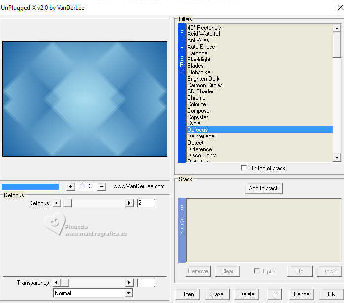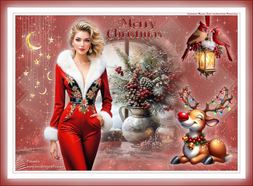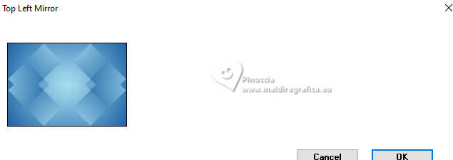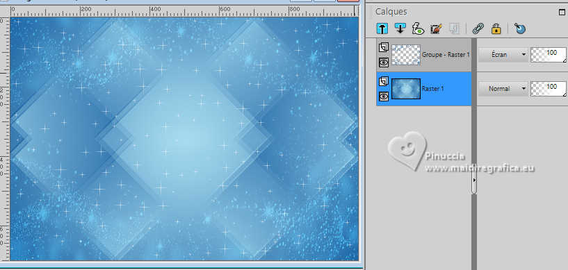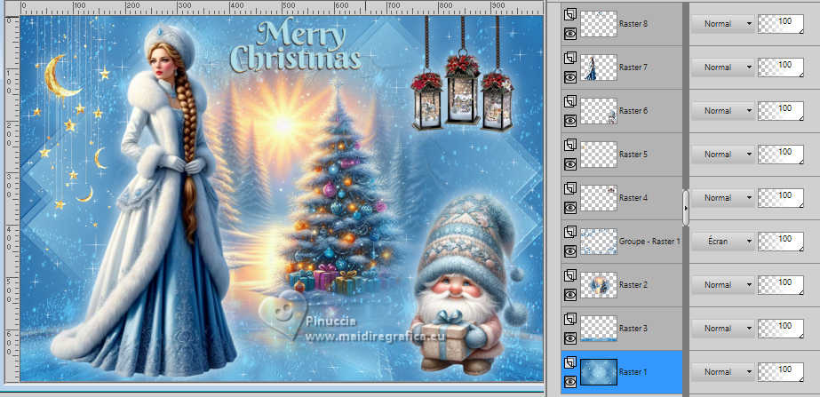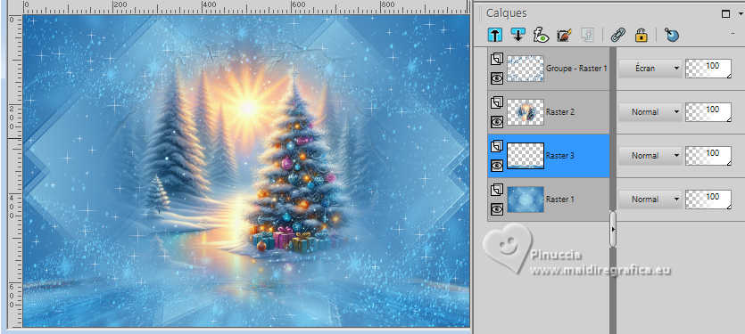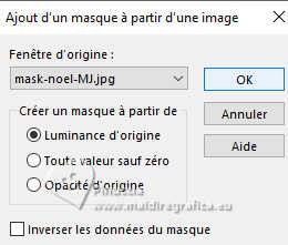 Pour traduire ce tutoriel j'ai utilisé PSPX9 et PSP2020, mais il peut également être exécuté avec les autres versions. Suivant la version utilisée, vous pouvez obtenir des résultats différents. Depuis la version X4, la fonction Image>Miroir a été remplacée par Image>Renverser horizontalement, et Image>Renverser avec Image>Renverser verticalement . Dans les versions X5 et X6, les fonctions ont été améliorées par la mise à disposition du menu Objets. Avec la nouvelle version X7, nous avons encore Image>Miroir et Image>Renverser/Retourner, mais avec nouvelles différences. Voir les détails à ce sujet ici Certaines dénominations ont changées entre les versions de PSP. Les plus frequentes dénominations utilisées: ![]() English translation here Vos versions ici![]() Nécessaire pour réaliser ce tutoriel: ![]() Pour le misted merci CatDana - Images Pinterest - tubes MJ (ici les liens vers les sites des créateurs du matériel) ![]() ![]() consulter, si nécessaire, ma section des filtres ici Filters Unlimited 2.0 ici Mehdi - Sorting Tiles ici VanDerLee - Unplugged-X ici VM Natural - Sparkle ici Mura's Meister - Perspective Tiling ici Simple - Top Left Mirror ici Filtres VM Natural et Simple peuvent être utilisés seuls ou importés dans Filters Unlimited. voir comment le faire ici. Si un filtre est fourni avec cette icône, ![]() ![]() en fonction des couleurs utilisées, vous pouvez changer le mode mélange et l'opacité des calques. Dans les plus récentes versions de PSP, vous ne trouvez pas le dégradé d'avant plan/arrière plan ou Corel_06_029. Vous pouvez utiliser le dégradés des versions antérieures. Ici le dossier Dégradés de CorelX. ![]() Placer le preset dans le dossier Paramètres par défaut. Ouvrir le masque dans PSP et le minimiser avec le reste du matériel. Placer en avant plan la couleur #afe2f3, et en arrière plan la couleur #1d64a4. ![]() Préparer en avant plan un dégradé de premier plan/arrière plan, style Halo ![]() 1. Ouvrir une nouvelle image transparente 1000 x 700 pixels. Remplir l'image transparente avec la couleur d'arrière plan #1d64a4.2. Calques>Nouveau calque de masque>A partir d'une image. Ouvrir le menu deroulant sous la fenêtre d'origine et vous verrez la liste des images ouvertes. Sélectionner le masque mask-noel-MJ ![]() Calques>Fusionner>Fusionner le groupe. 3. Effets>Filtre personnalisé - Emboss 3 ![]() Placer le calque en mode Écran. 4. Calques>Nouveau calque raster. Remplir le calque du dégradé.5. Effets>Modules Externes>Mehdi - Sorting Tiles. ![]() 6. Effets>Modules Externes>Simple - Top Left Mirror. ![]() 7. Effets>Modules Externes>VanDerLee - Unplugged-X - Defocus ![]() 8. Effets>Filtre personnalisé - Emboss 3 ![]() 9. Effets>Modules Externes>VM Natural - Sparkle. ![]() Calques>Agencer>Déplacer vers le bas. ![]() 10. Ouvrir le tube 2024 12 12 Cat Dana mist 3 ![]() Effacer le watermark et Édition>Copier. Revenir sur votre travail et Édition>Coller comme nouveau calque. Image>Redimensionner, à 80%, redimensionner tous les calques décoché. Touche K pour activer l'outil Sélecteur ![]() Position horiz.: 165,00 - Position vert.: -10,00 ![]() Touche M pour désélectionner l'outil. 11. Édition>Copie Spéciale>Copier avec fusion. Édition>Coller comme nouveau calque. 12. Effets>Modules Externes>Mura's Meister - Perspective Tiling. ![]() 13. Activer l'outil Baguette magique , tolérance 0 et progressivité 80et cliquer dans la partie transparente pour la sélectionner. Presser +/- 10 fois CANC sur le clavier ![]() Sélections>Désélectionner tout. ne pas oublier de placer à nouveau la progressivité de l'outil Baguette Magique à 0 Calques>Agencer>Déplacer vers le bas. ![]() 14. Vous positionner sur le calque du haut de la pile. Ouvrir deco-1-MJ ![]() Édition>Copier. Revenir sur votre travail et Édition>Coller comme nouveau calque. Touche K pour activer l'outil Sélecteur ![]() Position horiz.: 745,00 - Position vert.: 0,00 ![]() Touche M pour désélectionner l'outil. 15. Effets>Effets 3D>Ombre portée, couleur blanche. ![]() 16. Ouvrir deco-3-MJ ![]() Édition>Copier. Revenir sur votre travail et Édition>Coller comme nouveau calque. 17. Objets>Aligner>Haut. Objets>Aligner>Gauche. Effets>Effets 3D>Ombre portée, comme précédemment. ![]() 18. Ouvrir gnomo-1-MJ ![]() Édition>Copier. Revenir sur votre travail et Édition>Coller comme nouveau calque. Déplacer le tube en bas à droiteEffets>Effets 3D>Ombre portée, comme précédemment. 19. Ouvrir le tube personagem-MJ ![]() Édition>Copier. Revenir sur votre travail et Édition>Coller comme nouveau calque. Déplacer le tube à gaucheEffets>Effets 3D>Ombre portée, comme précédemment. 20. Ouvrir le texte texto ![]() Édition>Copier. Revenir sur votre travail et Édition>Coller comme nouveau calque. Positionner le tube à votre goût.Vous positionner sur le calque Raster 1. Édition>Copier. Édition>Coller comme nouvelle image, et la minimiser pour précaution. La tag et le calque; adapter selon votre travail ![]() 21. Image>Ajouter des bordures, 1 pixel, symétrique, couleur foncée d'arrière plan #1d64a4. Image>Ajouter des bordures, 10 pixels, symétrique, couleur blanche. Image>Ajouter des bordures, 1 pixel, symétrique, couleur foncée d'arrière plan #1d64a4. Image>Ajouter des bordures, 25 pixels, symétrique, couleur blanche. Image>Ajouter des bordures, 1 pixel, symétrique, couleur foncée d'arrière plan #1d64a4. 22. Sélections>Sélectionner tout. Image>Ajouter des bordures, 30 pixels, symétrique, couleur blanche. 23. Sélections>Inverser. Édition>Coller dans la sélection - l'image minimisée est encore en mémoire. 24. Réglage>Flou>Flou gaussien - rayon 30. ![]() 25. Sélections>Inverser. Effets>Effets 3D>Ombre portée, couleur blanche ![]() Sélections>Désélectionner tout. 26. Image>Ajouter des bordures, 1 pixel, symétrique, couleur foncée d'arrière plan #1d64a4. 27. Signer votre travail. Calques>Fusionner>Tous. 28. Image>Redimensionn