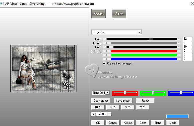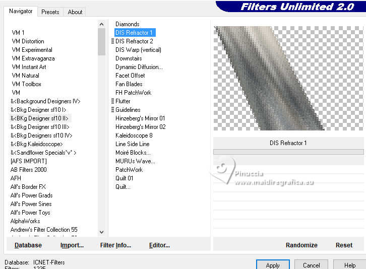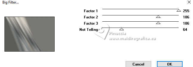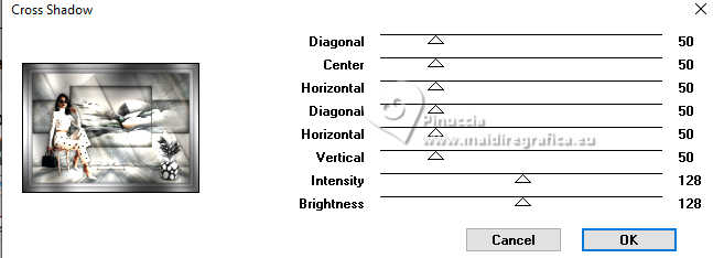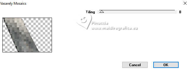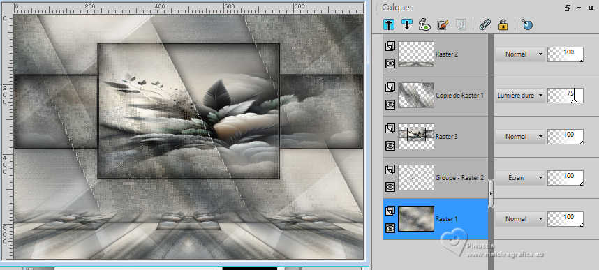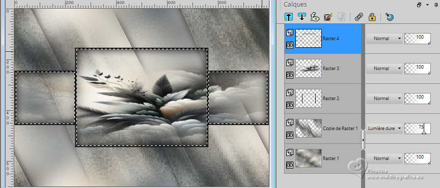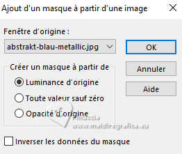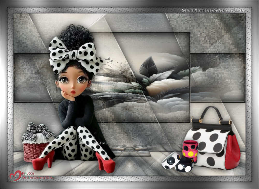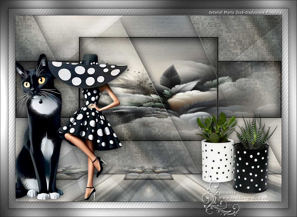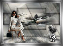 Pour traduire ce tutoriel j'ai utilisé PSPX9 et PSP2020, mais il peut également être exécuté avec les autres versions. Suivant la version utilisée, vous pouvez obtenir des résultats différents. Depuis la version X4, la fonction Image>Miroir a été remplacée par Image>Renverser horizontalement, et Image>Renverser avec Image>Renverser verticalement . Dans les versions X5 et X6, les fonctions ont été améliorées par la mise à disposition du menu Objets. Avec la nouvelle version X7, nous avons encore Image>Miroir et Image>Renverser/Retourner, mais avec nouvelles différences. Voir les détails à ce sujet ici Certaines dénominations ont changées entre les versions de PSP. Les plus frequentes dénominations utilisées: ![]() English translation here Vos versions ici![]() Nécessaire pour réaliser ce tutoriel: ![]() Matériel de Maria José (ici les liens vers les sites des créateurs du matériel) ![]() ![]() consulter, si nécessaire, ma section des filtres ici Filters Unlimited 2.0 ici &<Bkg Designer sf10II> - DIS Refractor 1 (à importer dans Unlimited) ici VM Natural - Speed ici Neology - Vasarely Mosaic ici Andrew's Filters Collection 55 - Big Filter ici Mura's Meister - Perspective Tiling ici L&K's - L&K's Zitah ici Mura's Seamless - Emboss at Alpha ici AP [Lines] - Lines SilverLining ici Graphics Plus - Cross Shadow ici Filtres Neology, Mura's Seamless et Graphics Plus peuvent être utilisés seuls ou importés dans Filters Unlimited. voir comment le faire ici. Si un filtre est fourni avec cette icône, ![]() en fonction des couleurs utilisées, vous pouvez changer le mode mélange et l'opacité des calques. ![]() Placer les sélections dans le dossier Sélections. Ouvrir le masque dans PSP et le minimiser avec le reste du matériel. Choisir deux couleurs du tube; pour moi; placer en avant plan la couleur #b3b3b5, et placer en arrière plan la couleur #1f1f1f. ![]() 1. Ouvrir une nouvelle image transparente 1000 x 700 pixels. Sélections>Sélectionner tout. 2. Ouvrir l'image bg_blackandwhite(19) ![]() Édition>Copier. Revenir sur votre travail et Édition>Coller dans la sélection. Sélections>Désélectionner tout. 3. Effets>Effets d'image>Mosaïque sans jointures. ![]() 4. Réglae>Flou>Flou gaussien - rayon 35. ![]() 5. Effets>Modules Externes>VM Natural - Speed, par défaut. ![]() Calques>Dupliquer. 6. Effets>Modules Externes>Andrew's Filters Collection 55 - Big Filter ![]() 7. Sélections>Charger/Enregistrer une sélection>Charger à partir du disque. Chercher et charger la sélection bigfilter ![]() Presser CANC sur le clavier ![]() ![]() Sélections>Désélectionner tout. 8. Effets>Modules Externes>Neology - Vasalery Mosaics ![]() 9. Effets>Modules Externes>Filters Unlimited 2.0 - &<Bkg Designer sf10II> - DIS Refractor 1 ![]() 10. Réglage>Netteté>Davantage de netteté. 11. Effets>Effets 3D>Ombre portée, couleur noire. ![]() 12. Effets>Effets d'image>Mosaïque sans jointures. ![]() Placer le calque en mode Lumière dure (ou autre) et réduire l'opacité +/-75%, en fonction de votre travail. 13. Ouvrir cadres-MJ ![]() Édition>Copier. Revenir sur votre travail et Édition>Coller comme nouveau calque. 14. Sélections>Charger/Enregistrer une sélection>Charger à partir du disque. Chercher et charger la sélection bigfilter-1 ![]() 15. Remplir la sélection avec la couleur foncée d'arrière plan.16. Effets>Effets 3D>Biseautage intérieur ![]() Sélections>Désélectionner tout. 17. Sélections>Charger/Enregistrer une sélection>Charger à partir du disque. Chercher et charger la sélection bigfilter-2 ![]() ![]() 18. Calques>Nouveau calque raster. Ouvrir le tube misted-2 ![]() Édition>Copier. Revenir sur votre travail et Édition>Coller dans la sélection. 19. Calques>Nouveau calque raster. Effets>Effets 3D>Découpe. ![]() ![]() 20. Calques>Fusionner>Fusionner le calque de dessous. Calques>Agencer>Déplacer vers le bas. 21. Vous positionner sur le calque Raster 2. Calques>Fusionner>Fusionner le calque de dessous. Sélections>Désélectionner tout. 22. Effets>Effets 3D>Ombre portée, couleur noire. ![]() 23. Touche K pour activer l'outil Sélecteur ![]() Position horiz.: 0,00 - Position vert.: 59,00 ![]() Touche M pour désélectionner l'outil. Calques>Agencer>Déplacer vers le bas. 24. Calques>Nouveau calque raster. Remplir le calque avec la couleur claire d'avant plan.25. Calques>Nouveau calque de masque>A partir d'une image. Ouvrir le menu deroulant sous la fenêtre d'origine et vous verrez la liste des images ouvertes. Sélectionner le masque abstract-blau-metalic ![]() Calques>Fusionner>Fusionner le groupe. 26. Effets>Modules Externes>Mura's Seamless - Emboss at Alpha, par défaut. ![]() Calques>Agencer>Déplacer vers le bas. Placer le calque en mode Écran. Vous positionner sur le calque du haut de la pile, Copie de Raster 1. 27. Édition>Copie Spéciale>Copier avec fusion. Édition>Coller comme nouveau calque. 28. Effets>Modules Externes>Mura's Meister - Perspective Tiling ![]() 29. Effets>Effets de réflexion>Miroir rotatif, par défaut. ![]() 30. Activer l'outil Baguette magique , progressivité 80,et cliquer dans la partie transparente pour la sélectionner. Presser +/-10 fois CANC sur le clavier. Sélections>Désélectionner tout. ne pas oublier de placer à nouveau la progressivité à 0 31. Vous positionner sur le calque Raster 1. Effets>Modules Externes>L&K's - L&K's Zitah ![]() La tag et les calques - adapter Mode mélange et opacité en fonction de vos couleurs ![]() 32. Ouvrir le tube tutowoman ![]() Édition>Copier. Revenir sur votre travail et Édition>Coller comme nouveau calque. Calques>Agencer>Placer en haut de la pile. Déplacer le tube à gauche, ou à votre goût.Effets>Effets 3D>Ombre portée, à choix. 33. Ouvrir le tube vaso-deco-MJ ![]() Édition>Copier. Revenir sur votre travail et Édition>Coller comme nouveau calque. Image>Redimensionner, à 85%, redimensionner tous les calques décoché. Déplacer le tube en bas à droite.Effets>E