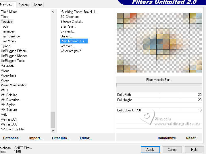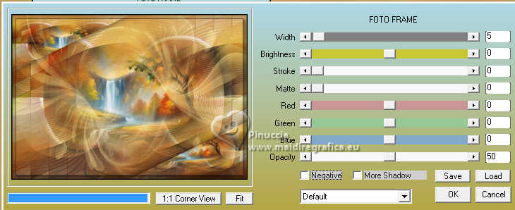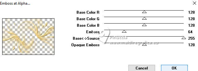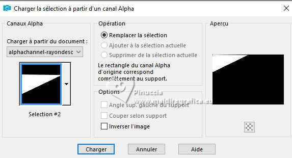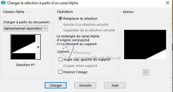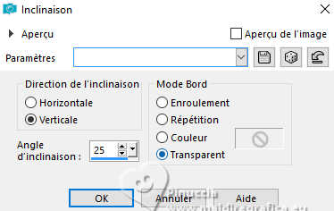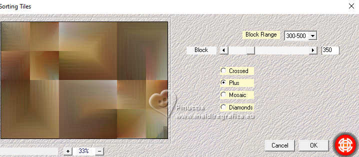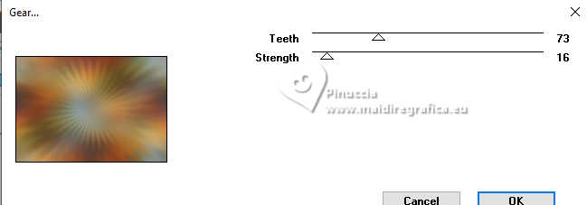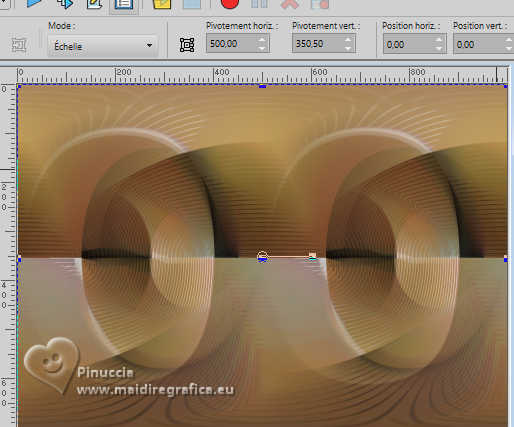 Pour traduire ce tutoriel j'ai utilisé PSPX9 et PSP2020, mais il peut également être exécuté avec les autres versions. Suivant la version utilisée, vous pouvez obtenir des résultats différents. Depuis la version X4, la fonction Image>Miroir a été remplacée par Image>Renverser horizontalement, et Image>Renverser avec Image>Renverser verticalement . Dans les versions X5 et X6, les fonctions ont été améliorées par la mise à disposition du menu Objets. Avec la nouvelle version X7, nous avons encore Image>Miroir et Image>Renverser/Retourner, mais avec nouvelles différences. Voir les détails à ce sujet ici Certaines dénominations ont changées entre les versions de PSP. Les plus frequentes dénominations utilisées: ![]() English translation here Vos versions ici![]() Nécessaire pour réaliser ce tutoriel: ![]() Matériel de Maria José. (ici les liens vers les sites des créateurs du matériel) ![]() consulter, si nécessaire, ma section des filtres ici Filters Unlimited 2.0 ici VM Distortion - Gear ici Tramages - Tow the lines ici Mehdi - Sorting Tiles ici AAA Frames - Foto Frame ici Flaming Pear - Flexify 2 ici Toadies - Plain Mosaic Blur ici Mura's Seamless - Emboss at Alpha ici Filtres VM Distortion, Tramages, Toadies et Mura's Seamless peuvent être utilisés seuls ou importés dans Filters Unlimited. voir comment le faire ici. Si un filtre est fourni avec cette icône, Ce tutoriel a été exécuté avec PSP 2019, dans d'autres versions le résultat peut être différent. ![]() en fonction des couleurs utilisées, vous pouvez changer le mode mélange et l'opacité des calques. Placer le preset pour Flexify dans un dossier de votre choix. Je le laisse habituellement dans le dossier du matériel. Vous l'importerez de ce dossier lorsque vous en aurez besoin. ![]() Placer le masque 20-20 dans le dossier Masques. Ouvrir le deuxième masque dans PSP et le minimiser avec le reste du matériel 1. Ouvrir alphachannel-rayondesoleil. Fenêtre>Dupliquer ou sur le clavier shift+D pour faire une copie. ![]() Fermer l'original. La copie, qui sera la base de votre travail, n'est pas vide, mais contient les sélections enregistrées sur le canal alpha. 2. Sélections>Sélectionner tout. Ouvrir l'image grafico-zenart-07 ![]() Édition>Copier. Revenir sur votre travail et Édition>Coller dans la sélection. Sélections>Désélectionner tout. 3. Effets>Effets d'image>Mosaïque sans jointures. ![]() 4. Réglage>Flou>Flou Gaussien - rayon 50 ![]() 5. Effets>Modules Externes>VM Distortion - Gear, par défaut. ![]() 6. Effets>Modules Externes>Tramages - Tow the line, par défaut. ![]() 7. Effets>Effets d'image>Mosaïque sans jointures, comme précédemment ![]() 8. Effets>Modules Externes>Mehdi - Sorting Tiles. ![]() 9. Effets>Modules Externes>Flaming Pear - Flexify 2 cliquer sur le bouton rouge et chercher le preset dans le dossier où vous l'avez copié. ![]() Ci-dessous les réglages ![]() 10. Effets>Effets d'image>Mosaïque sans jointures, Horizontale coché. ![]() 11. Touche K pour activer l'outil Sélecteur ![]() tirer l'image comme ci-dessous ![]() Touche M pour désélectionner l'outil. Calques>Dupliquer. Placer ce calque en mode Recouvrement. 12. Vous positionner sur le calque Raster 1. Réglage>Ajouter/Supprimer du bruit>Ajouter du bruit. ![]() 13. Réglage>Netteté>Davantage de netteté. 14. Ouvrir le misted misted-2 ![]() Édition>Copier. Revenir sur votre travail et Édition>Coller comme nouveau calque. Calques>Agencer>Placer en haut de la pile. Calques>Dupliquer. 15. Effets>Effets d'image>Mosaïque sans jointures, Bilatérale coché. ![]() 16. Effets>Modules Externes>Toadies - Plain Mosaic Blur. ![]() 17. Effets>Effets géométriques>Inclinaison. ![]() 18. Calques>Charger/Enregistrer un masque>Charger à partir du disque. Chercher et charger le masque 20-20 . ![]() Calques>Dupliquer. Calques>Fusionner>Fusionner le groupe. Placer le calque en mode Lumière dure. 19. Vous positionner sur le calque Groupe-Copie de Raster 2. Édition>Copie Spéciale>Copier avec fusion 20. Sélections>Charger/Enregistrer une sélection>Charger à partir d'un canal alpha. La sélection Selection #1 est déjà disponible. On doit seulement cliquer sur Charger. ![]() 21. Calques>Nouveau calque raster. Édition>Coller dans la sélection - l'image de l'étape précédente. Sélections>Désélectionner tout. 22. Sélections>Charger/Enregistrer une sélection>Charger à partir d'un canal alpha. Ouvrir le menu des sélection et charger la sélection Selection #2 ![]() 23. Calques>nouveau calque raster. Édition>Coller dans la sélection - l'image de l'étape 19 est toujours en mémoire. Sélections>Désélectionner tout. 24. Calques>Fusionner>Fusionner le calque de dessous. Effets>Effets 3D>Ombre portée, couleur noire ![]() 25. Calques>Nouveau calque raster. Placer en avant plan une couleur claire de votre grafique: #e4c270 .Remplir le calque avec la couleur claire d'avant plan.26. Calques>Nouveau calque de masque>A partir d'une image. Ouvrir le menu deroulant sous la fenêtre d'origine et sélectionner le masque colormask-MJ . ![]() Calques>Fusionner>Fusionner le groupe. 27. Effets>Modules Externes>Mura's Seamless - Emboss at Alpha, par défaut. ![]() Placer le calque en mode Écran et réduire l'opacité +/-65%. La tag et les calques - adapter Mode mélange et opacité selon vos couleurs. ![]() Calques>Fusionner>Calques visibles. 28. Effets>Modules Externes>AAA Frames - Foto Frame. ![]() 29. Sélections>Sélectionner tout. Édition>Copier 30. Image>Ajouter des bordures, 30 pixels, symétrique, couleur blanche. 31. Sélections>Inverser. Édition>Coller dans la sélection - l'image de l'étape 29. 32. Réglage>Flou>Flou gaussien - rayon 30. ![]() 33. Sélections>Inverser. Effets>Effets 3D>Ombre portée, couleur noire. ![]() 34. Sélections>Sélectionner tout. Édition>Copier 35. Image>Ajouter des bordures, 30 pixels, symétrique, couleur blanche. 36. Sélections>Inverser. Édition>Coller dans la sélectio