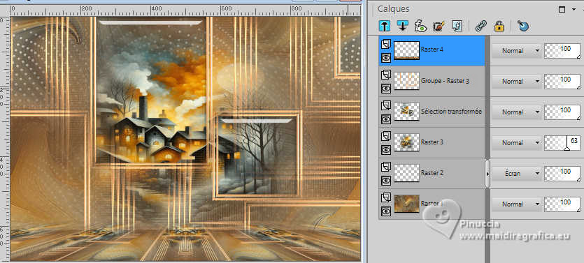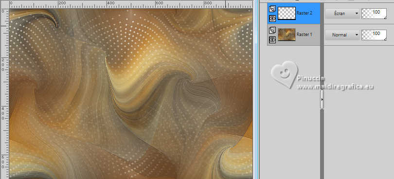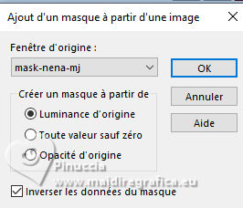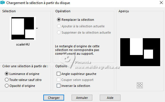 Pour traduire ce tutoriel j'ai utilisé PSPX9 et PSP2020, mais il peut également être exécuté avec les autres versions. Suivant la version utilisée, vous pouvez obtenir des résultats différents. Depuis la version X4, la fonction Image>Miroir a été remplacée par Image>Renverser horizontalement, et Image>Renverser avec Image>Renverser verticalement . Dans les versions X5 et X6, les fonctions ont été améliorées par la mise à disposition du menu Objets. Avec la nouvelle version X7, nous avons encore Image>Miroir et Image>Renverser/Retourner, mais avec nouvelles différences. Voir les détails à ce sujet ici Certaines dénominations ont changées entre les versions de PSP. Les plus frequentes dénominations utilisées: ![]() English translation here Vos versions ici![]() Nécessaire pour réaliser ce tutoriel: ![]() Misted après une image de Marika Fantasy, merci. (ici les liens vers les sites des créateurs du matériel) ![]() consulter, si nécessaire, ma section des filtres ici Filters Unlimited 2.0 ici Mura's Meister - Perspective Tiling ici Simple - Top Left Mirror ici Alien Skin Eye Candy 5 Impact - Glass ici Alien Skin Eye Candy 5 Texture - Swirl ici AAA Frames - Foto Frame ici Filtres Simple peuvent être utilisés seuls ou importés dans Filters Unlimited. voir comment le faire ici. Si un filtre est fourni avec cette icône, ![]() en fonction des couleurs utilisées, vous pouvez changer le mode mélange et l'opacité des calques. Dans les plus récentes versions de PSP, vous ne trouvez pas le dégradé d'avant plan/arrière plan ou Corel_06_029. Vous pouvez utiliser le dégradés des versions antérieures. Ici le dossier Dégradés de CorelX. Placer les presets En cliquant sur le preset une ou deux fois (selon vos réglages) automatiquement il se placera directement dans le dossier Settings de Alien Skin Eye Candy. pourquoi un ou deux clic voir ici ![]() Placer le preset Emboss 3 dans le dossier Paramètres par défaut. Placer la sélection dans le dossier Sélections. Ouvrir le masque dans PSP et le minimiser avec le reste du matérie. Placer en avant plan la couleur #f4b176, et en arrière plan la couleur #4c2606. ![]() Préparer en avant plan un dégradé de premier plan/arrière plan, style Linéaire. ![]() 1. Ouvrir une nouvelle image transparente 1000 x 700 pixels. Remplir l'image transparente du dégradé.2. Sélections>Sélectionner tout. Ouvrir le misted misted-scalet-MJ ![]() Édition>Copier. Revenir sur votre travail et Édition>Coller dans la sélection. Sélections>Désélectionner tout. 3. Effets>Effets d'image>Mosaïque sans jointures. ![]() 4. Effets>Modules Externes>Alien Skin Eye Candy 5 Texture - Swirl. Sélectionner le preset scarlet-swirl-MJ ![]() 5. Effets>Effets de bords>Accentuer davantage. 6. Ouvrir deco-lucien-2-MJ ![]() Édition>Copier. Revenir sur votre travail et Édition>Coller comme nouveau calque. Placer le calque en mode Écran. ![]() 7. Calques>Nouveau calque raster. Placer en avant plan la Couleur. Remplir le calque avec la couleur claire d'avant plan.8. Calques>Nouveau calque de masque>A partir d'une image. Ouvrir le menu deroulant sous la fenêtre d'origine et vous verrez la liste des images ouvertes. Sélectionner le masque mask-nena-mj Inverser les données du masque coché. ![]() Calques>Fusionner>Fusionner le groupe. 9. Effets>Filtre personnalisé - Emboss 3. ![]() 10. Activer à nouveau le misted et Édition>Copier. Revenir sur votre travail et Édition>Coller comme nouveau calque. Calques>Agencer>Déplacer vers le bas. 11. Sélections>Charger/Enregistrer une sélection>Charger à partir du disque. Chercher et charger la sélection scarlet-MJ ![]() Sélections>Transformer la sélection en calque. 12. Effets>Modules Externes>Alien Skin Eye Candy 5 Impact - Glass. Sélectionner le preset glass-scarlet-MJ Si vous utilisez des autres couleurs, changez Glass Color avec votre couleur claire ![]() Sélections>Désélectionner tout. 13. Vous positionner sur le calque du misted, Raster 3. Réduire l'opacité de ce calque +/-63%. 14. Vous positionner sur le calque du masque Groupe-Raster 3. Édition>Copie Spéciale>Copier avec fusion Édition>Coller comme nouveau calque. 15. Effets>Modules Externes>Mura's Meister - Perspective Tiling. ![]() 16. Activer l'outil Baguette Magique , progressivité 70%,et cliquer dans la partie transparente pour la sélectionner. Presser +/-10 fois CANC sur le clavier ![]() Sélections>Désélectionner tout. 17. Effets>Effets de réflexion>Miroir rotatif. ![]() La tag et le calques - Mode Mélange et opacité en fonction de votre travail ![]() 18. Ouvrir le tube scarlet-MJ ![]() Effacer le watemark et Édition>Copier. Revenir sur votre travail et Édition>Coller comme nouveau calque. Positionner le tube à gauche, ou à votre goût.Effets>Effets 3D>Ombre portée, à choix. 19. Ouvrir le déco vaso-deco-MJ ![]() Effacer le watermark et Édition>Copier. Revenir sur votre travail et Édition>Coller comme nouveau calque. Image>Redimensionner, à 35%, redimensionner tous les calques décoché. Déplacer le tube à droite, ou à votre goût Effets>Effets 3D>Ombre portée, à choix. Vous positionner sur le calque Raster 1. Édition>Copier Édition>Coller comme nouvelle image (pour sécurité). 20. Image>Ajouter des bordures, 1 pixel, symétrique, couleur foncée d'arrière plan. Image>Ajouter des bordures, 1 pixel, symétrique, couleur claire d'avant plan. Image>Ajouter des bordures, 1 pixels, symétrique, couleur foncée d'arrière plan. 21. Sélections>Sélectionner tout. Image>Ajouter des bordures, 50 pixels, symétrique, couleur blanche. 22. Sélections>Inverser. Édition>Coller dans la sélection - l'image copiée à l'étape 19 est encore en mémoire. 23. Effets>Modules Externes>Simple - Top Left Mirror. ![]() 24. Effets>Effets de distorsion>Vent - vers la droite, intensité 100. ![]() 25. Effets>Effets de réflexion>Miroir rotatif, par défaut. ![]() 26. Réglage>Netteté>Davantage de netteté. 27. Sélecti
