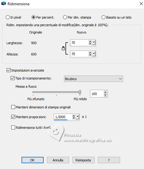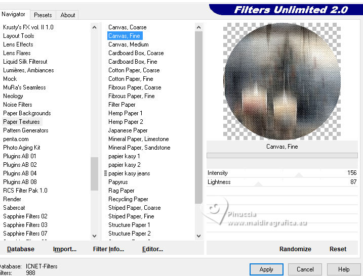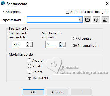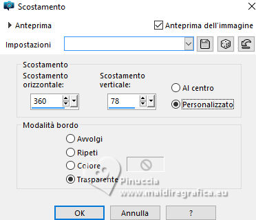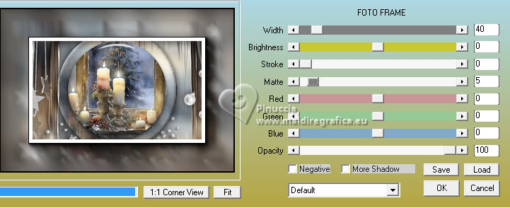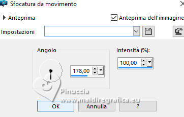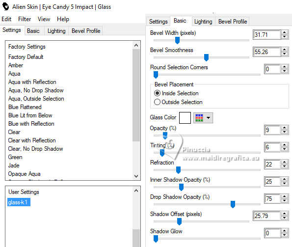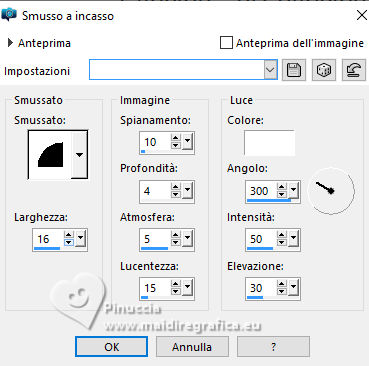 qui puoi trovare qualche risposta ai tuoi dubbi. Se l'argomento che ti interessa non è presente, ti prego di segnalarmelo. Per tradurre il tutorial ho usato PSPX9 e PSPX2020, ma può essere eseguito con ogni versione di PSP. Dalla versione X4, il comando Immagine>Rifletti è stato sostituito con Immagine>Capovolgi in orizzontale, e il comando Immagine>Capovolgi con Immagine>Capovolgi in verticale. Nelle versioni X5 e X6, le funzioni sono state migliorate rendendo disponibile il menu Oggetti. Con la nuova versione X7, sono tornati Rifletti/Capovolgi, ma con nuove differenze Vedi la scheda sull'argomento qui traduzione in francese qui Le vostre versioni qui![]() Occorrente: ![]() (in questa pagina trovi i links ai siti dei creatori di tubes) ![]() in caso di dubbi, ricorda di consultare la mia sezione filtri qui Filters Unlimited 2.0 qui Alien Skin Eye Candy 5 Impact - Glass qui AAA Frames - Foto Frame qui ![]() ![]() se stai usando altri colori, sperimenta le modalità di miscelatura e opacità più adatte ai tuoi colori Metti il preset Cliccando sul file una o due volte (a seconda delle tue impostazioni), automaticamente il preset si installerà nella cartella corretta. perchè uno o due clic vedi qui ![]() 1. Imposta il colore di primo piano con #6d5d4d, e il colore di sfondo con #cdcac5. ![]() 2. Apri una nuova immagine trasparente 900 x 600 pixels. ![]() 3. Selezione>Seleziona tutto. Apri plaatje-6ad04 ![]() Modifica>Copia. Torna al tuo lavoro e vai a Modifica>Incolla nella selezione. Selezione>Deseleziona. 4. Regola>Sfocatura>Sfocatura da movimento. ![]() 5. Effetti>Effetti di bordo>Aumenta di più. 6. Livelli>Duplica. Effetti>Effetti geometrici>Cerchio. ![]() 7. Immagine>Ridimensiona, al 70%, tutti i livelli non selezionato. ![]() 8. Selezione>Seleziona tutto. Selezione>Mobile. Selezione>Immobilizza. 9. Livelli>Nuovo livello raster. Apri deco-1-kerst-2024.png ![]() Modifica>Copia. Torna al tuo lavoro e vai a Modifica>Incolla nella selezione. Mantieni selezionato. 10. Livelli>Nuovo livello raster. Effetti>Plugins>Alien Skin Eye Candy 5 Impact - Glass. Seleziona il preset glass-k1.f1s ![]() 11. Attiva il livello Raster 1. Selezione>Modifica>Espandi - 45 pixels. Selezione>Innalza selezione a livello. 12. Effetti>Plugins>Filters Unlimited 2.0 - Paper Texture - Canvas,Fine, con i settaggi standard ![]() 13. Effetti>Effetti 3D>Smusso a incasso. ![]() 14. Effetti>Effetti 3D>Sfalsa ombra, colore nero. ![]() Selezione>Deseleziona. 15. Apri deco-2-2024.png ![]() Modifica>Copia. Torna al tuo lavoro e vai a Modifica>Incolla come nuovo livello. Oggetti>Allinea>Inferiore. ![]() 16. Livelli>Disponi>Sposta giù. Attiva il livello superiore. 17. Apri WINTER MAGIC by_Mago74 el (1).png ![]() Modifica>Copia. Torna al tuo lavoro e vai a Modifica>Incolla come nuovo livello. 18. Effetti>Effetti di immagine>Scostamento. ![]() 19. Apri kerstbalslinger -101.png ![]() Modifica>Copia. Torna al tuo lavoro e vai a Modifica>Incolla come nuovo livello. 20. Effetti>Effetti di immagine>Scostamento. ![]() 21. Effetti>Effetti 3D>Sfalsa ombra, colore nero. ![]() 22. Immagine>Aggiungi bordatura, 2 pixels, simmetriche, colore scuro. Modifica>Copia 23. Selezione>Seleziona tutto. Immagine>Aggiungi bordatura, 45 pixels, simmetriche, colore chiaro. Selezione>Inverti. Modifica>Incolla nella selezione 24. Regola>Sfocatura>Sfocatura gaussiana - raggio 30. ![]() 25. Effetti>Plugins>AAA Frames - Foto Frame. ![]() Selezione>Deseleziona. 27. Apri Rand ![]() Modifica>Copia. Torna al tuo lavoro e vai a Modifica>Incolla come nuovo livello. 28. Immagine>Aggiungi bordatura, 2 pixels, simmetriche, colore scuro. 29. Firma il tuo lavoro su un nuovo livello. 30. Livelli>Unisci>Unisci tutto e salva in formato jpg. ![]() ![]() Se hai problemi o dubbi, o trovi un link non funzionante, o anche soltanto per un saluto, scrivimi. |