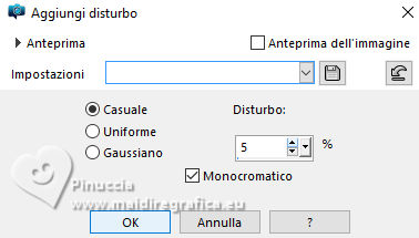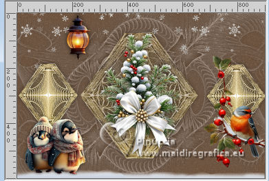 qui puoi trovare qualche risposta ai tuoi dubbi. Se l'argomento che ti interessa non è presente, ti prego di segnalarmelo. Per tradurre il tutorial ho usato PSPX9 e PSPX2020, ma può essere eseguito con ogni versione di PSP. Dalla versione X4, il comando Immagine>Rifletti è stato sostituito con Immagine>Capovolgi in orizzontale, e il comando Immagine>Capovolgi con Immagine>Capovolgi in verticale. Nelle versioni X5 e X6, le funzioni sono state migliorate rendendo disponibile il menu Oggetti. Con la nuova versione X7, sono tornati Rifletti/Capovolgi, ma con nuove differenze Vedi la scheda sull'argomento qui traduzione in francese qui Le vostre versioni qui![]() Occorrente: ![]() (in questa pagina trovi i links ai siti dei creatori di tubes) Filtri ![]() Nessuno ![]() ![]() se stai usando altri colori, sperimenta le modalità di miscelatura e opacità più adatte ai tuoi colori ![]() 1. Imposta il colore di primo piano con il colore scuro #705540, e il colore di sfondo con il colore bianco #ffffff ![]() 2. Apri una nuova immagine trasparente 900 x 600 pixels. ![]() Riempi l'immagine trasparente con il colore di primo piano #705540.3- Apri deco-1 ![]() Modifica>Copia. Torna al tuo lavoro e vai a Modifica>Incolla come nuovo livello. Abbassa l'opacità di questo livello al 40%. Effetti>Effetti 3D>Sfalsa ombra, colore nero. ![]() 4. Open deco-2.pspimage ![]() Modifica>Copia. Torna al tuo lavoro e vai a Modifica>Incolla come nuovo livello. 5. Apri boven-sneeuw ![]() Modifica>Copia. Torna al tuo lavoro e vai a Modifica>Incolla come nuovo livello. Oggetti>Allinea>Superiore. 6. Apri sneeuw-1 ![]() Modifica>Copia. Torna al tuo lavoro e vai a Modifica>Incolla come nuovo livello. Oggetti>Allinea>Inferiore. 7. Apri deco-3 ![]() Modifica>Copia. Torna al tuo lavoro e vai a Modifica>Incolla come nuovo livello. 8. Apri kerst-tak-20 ![]() Modifica>Copia. Torna al tuo lavoro e vai a Modifica>Incolla come nuovo livello. Effetti>Effetti 3D>Sfalsa ombra, colore nero. ![]() 9. Apri winter- pinguïns ![]() Modifica>Copia. Torna al tuo lavoro e vai a Modifica>Incolla come nuovo livello. Sposta il tube in basso a sinistra, sul bordo di neve.10. Apri vogel-tak-2 ![]() Modifica>Copia. Torna al tuo lavoro e vai a Modifica>Incolla come nuovo livello. Sposta il tube a destra, vedi il mio esempio.11. Apri lamp ![]() Modifica>Copia. Torna al tuo lavoro e vai a Modifica>Incolla come nuovo livello. Sposta il tube in alto a sinistra.![]() Effetti>Effetti 3D>Sfalsa ombra, colore nero. ![]() 12. Immagine>Aggiungi bordatura, 5 pixels, simmetriche, colore scuro. Selezione>Seleziona tutto. Immagine>Aggiungi bordatura, 45 pixels, simmetriche, colore chiaro. 13. Effetti>Effetti di immagine>Motivo unico, con i settaggi standard. ![]() Selezione>Inverti. 14. Regola>Sfocatura>Sfocatura gaussiana - raggio 30. ![]() 15. Regola>Aggiungi/Rimuovi disturbo>Aggiungi disturbo. ![]() 16. Selezione>Inverti. Effetti>Effetti 3D>Sfalsa ombra, colore nero. ![]() Selezione>Deseleziona. Immagine>Aggiungi bordatura, 2 pixels, simmetriche, colore scuro. Firma il tuo lavoro su un nuovo livello. Livelli>Unisci>Unisci tutto e salva in formato jpg. ![]() ![]() Se hai problemi o dubbi, o trovi un link non funzionante, o anche soltanto per un saluto, scrivimi. |