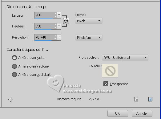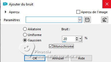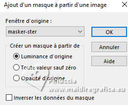 Pour traduire ce tutoriel j'ai utilisé PSPX9 et PSP2020, mais il peut également être exécuté avec les autres versions. Suivant la version utilisée, vous pouvez obtenir des résultats différents. Depuis la version X4, la fonction Image>Miroir a été remplacée par Image>Renverser horizontalement, et Image>Renverser avec Image>Renverser verticalement. Dans les versions X5 et X6, les fonctions ont été améliorées par la mise à disposition du menu Objets. Dans la nouvelle version X7, nous avons à nouveau Miroir/Renverser, mais avec autres différences. Voir plus les détails à ce sujet ici Certaines dénominations ont changées entre les versions de PSP. Les plus frequentes dénominations utilisées: ![]() Traduction en italien ici Vos versions ici![]() Nécessaire pour réaliser ce tutoriel: ![]() (les liens des sites des tubeuses ici) ![]() consulter, si nécessaire, ma section de filtre ici Filters Unlimited 2.0 ici Alf's Border FX - Binoculars (à importer dans Unlimited) ici Mura's Meister - Cloud ici Filtres Alf's Border FX - sauf l'effet de ce tutoriel - peuvent être utilisés seuls ou importés dans Filters Unlimited. voir comment le faire ici). Si un filtre est fourni avec cette icône, ![]() ![]() Si vous voulez utiliser vos propres couleurs, n'hésitez pas à changer le mode et l'opacité des calques ![]() Ouvrir le masque dans PSP et le minimiser avec le reste du matériel. 1. Placer en avant plan la couleur blanche #ffffff, et en arrière plan la couleur #bdbedf. 2. Ouvrir une nouvelle image transparente 900 x 550 pixels. ![]() Remplir l'image transparente avec la couleur blanche #ffffff.3. Effets>Modules Externes>Filters Unlimited 2.0 - Paper Textures - Canvas, Fine ![]() 4. Calques>Dupliquer. Effets>Modules Externes>Filters Unlimited 2.0 - Paper Textures - Canvas, Fine. ![]() 5. Effets>Modules Externes>Filters Unlimited 2.0 - Alf's Border FX - Binoculars. ![]() 6. Activer l'outil Baguette magique , tolérance et progressivité 0,![]() Cliquer dans la partie noire en bas pour la sélectionner. ![]() Presser CANC sur le clavier ![]() Sélections>Désélectionner tout. 7. Et maintenant cliquer dans la partie noire en haut avec la baguette magique , même réglages.![]() Remplir la sélection avec la couleur d'arrière plan #bdbfe9 (importante per il filtro Cloud).8. Effets>Modules Externes>Mura's Meister - Cloud ![]() n'oubliez pas que ce filtre travaille avec les couleurs de votre palette des materiaux, mais il garde en mémoire le premier réglage depuis l'ouverture de Psp. Donc, si vous avez déjà utilisé le filtre, pour vous assurer d'avoir les bonnes couleurs, cliquer sur Reset. Le résultat de l'effet est aléatoire, il ne sera donc pas le même que le mien. Vous pouvez modifier l'apparence des nuages en cliquant sur la fenêtre de prévisualitation, jusqu'à ce que vous soyez satisfait du résultat. 9. Effets>Effets 3D>Ombre portée, couleur noire. ![]() Sélections>Désélectionner tout. 10. Ouvrir Ildiko_Design@Winter_Cold_Deco_1 ![]() Édition>Copier. Revenir sur votre travail et Édition>Coller comme nouveau calque. Objets>Aligner>Haut. 11. Ouvrir sneeuw ![]() Édition>Copier. Revenir sur votre travail et Édition>Coller comme nouveau calque. Objets>Aligner>Bas. 12. Ouvrir deco-hek ![]() Édition>Copier. Revenir sur votre travail et Édition>Coller comme nouveau calque. Déplacer le tube en bas à droite, voir mon exemple.![]() 13. Ouvrir noel-agac-tree-png-3 (4) ![]() Édition>Copier. Revenir sur votre travail et Édition>Coller comme nouveau calque. Déplacer le tube à gauche, voir mon exemple.14. Ouvrir sneeuw grasrand ![]() Édition>Copier. Revenir sur votre travail et Édition>Coller comme nouveau calque. Objets>Aligner>Bas. 15. Ouvrir ai_1733652352141 ![]() Édition>Copier. Revenir sur votre travail et Édition>Coller comme nouveau calque. Image>Redimensionner, à 60%, redimensionner tous les calques décoché. Réglage>Netteté>Netteté. Positionner bien le tube, voir mon exemple.![]() Effets>Effets 3D>Ombre portée, couleur noire. ![]() 16. Calques>Nouveau calque raster. Remplir le calque avec la couleur blanche.Calques>Nouveau calque de masque>A partir d'une image. Ouvrir le menu deroulant sous la fenêtre d'origine et vous verrez la liste des images ouvertes. Sélectionner le masque masker-ster ![]() Calques>Fusionner>Fusionner le groupe. Déplacer les étoiles un peu plus en haut.![]() Déplacer les étoiles laisse une fine bordure blanche. Si vous le souhaitez, sélectionnez le petit trait ![]() et presser CANC sur le clavier. Sélections>Désélectionner tout. 17. Image>Ajouter des bordures, 2 pixels, symétrique, couleur noire. Sélections>Sélectionner tout. Image>Ajouter des bordures, 40 pixels, symétrique, couleur blanche. Sélections>Inverser. Effets>Modules Externes>Mura's Meister - Cloud, comme précédemment. ![]() 18. Réglage>Ajouter/Supprimer du bruit>Ajouter du bruit. ![]() 19. Sélections>Inverser. Effets>Effets 3D>Ombre portée, couleur noire. ![]() Sélections>Désélectionner tout. 20. Image>Ajouter des bordures, 2 pixels, symétrique, couleur noire. Signer votre travail sur un nouveau calque. Calques>Fusionner>Tous et enregistrer en jpg. ![]() ![]() Si vous avez des problèmes, ou des doutes, ou vous trouvez un link modifié, ou seulement pour me dire que ce tutoriel vous a plu, vous pouvez m'écrire. |