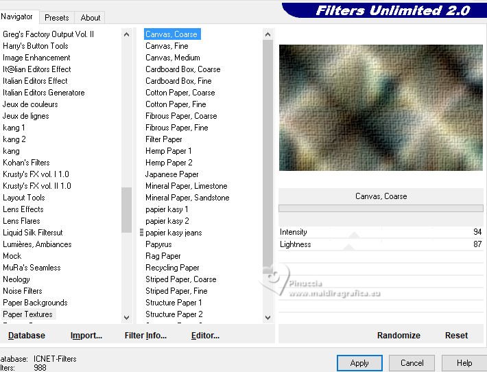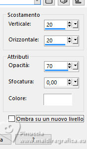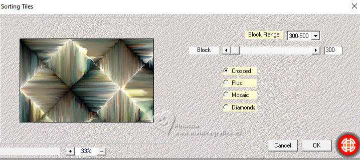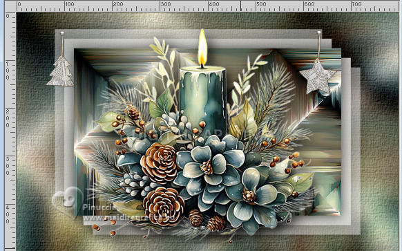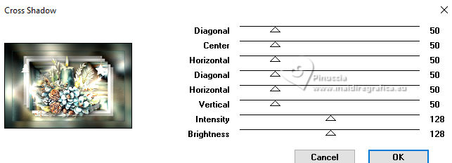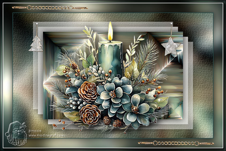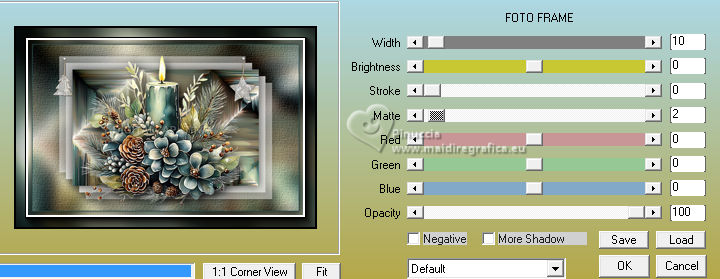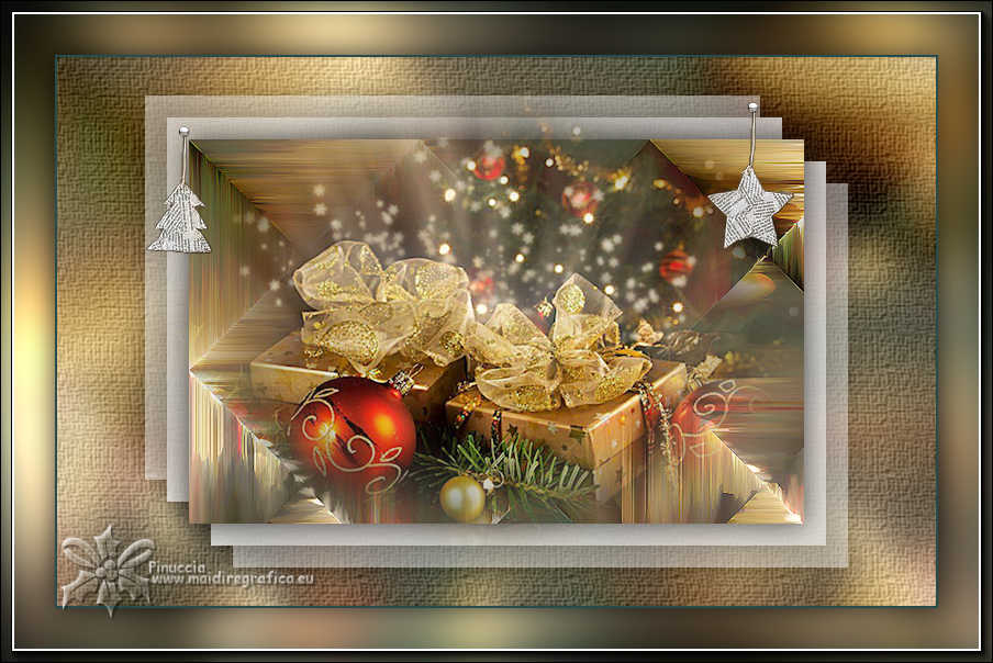 qui puoi trovare qualche risposta ai tuoi dubbi. Se l'argomento che ti interessa non è presente, ti prego di segnalarmelo. Per tradurre il tutorial ho usato PSPX9 e PSPX2020, ma può essere eseguito con ogni versione di PSP. Dalla versione X4, il comando Immagine>Rifletti è stato sostituito con Immagine>Capovolgi in orizzontale, e il comando Immagine>Capovolgi con Immagine>Capovolgi in verticale. Nelle versioni X5 e X6, le funzioni sono state migliorate rendendo disponibile il menu Oggetti. Con la nuova versione X7, sono tornati Rifletti/Capovolgi, ma con nuove differenze Vedi la scheda sull'argomento qui traduzione in francese qui Le vostre versioni qui![]() Occorrente: ![]() (in questa pagina trovi i links ai siti dei creatori di tubes) ![]() in caso di dubbi, ricorda di consultare la mia sezione filtri qui Filters Unlimited 2.0 qui Mehdi - Sorting Tiles qui Graphics Plus - Cross Shadow qui AAA Frames - Foto Frame qui I filtri Graphics Plus si possono usare da soli o importati in Filters Unlimited (come fare vedi qui) Se un filtro fornito appare con questa icona ![]() ![]() se stai usando altri colori, sperimenta le modalità di miscelatura e opacità più adatte ai tuoi colori Nelle ultime versioni di PSP non c'è il gradiente di primo piano/sfondo (Corel_06_029) Puoi usare i gradienti delle versioni precedenti. Trovi qui i gradienti Corel X. ![]() 1. Imposta il colore di primo piano con #eab882, e il colore di sfondo con #284c4b. ![]() Passa il colore di primo piano a Gradiente di primo piano/sfondo, stile Sprazzo di luce. ![]() 2. Apri una nuova immagine trasparente 800 x 500 pixels. ![]() Riempi l'immagine trasparente con il gradiente.3. Selezione>Seleziona tutto. Apri Kerst-deco-3-2024.png ![]() Modifica>Copia. Torna al tuo lavoro e vai a Modifica>Incolla nella selezione. Selezione>Deseleziona. 4. Effetti>Effetti di immagine>Motivo unico, con i settaggi standard. ![]() 5. Effetti>Plugins>Mehdi - Sorting Tiles ![]() Effetti>Effetti di bordo>Aumenta. 6. Livelli>Duplica. Immagine>Ridimensiona, al 70%, tutti i livelli non selezionato. 7. Livelli>Duplica. 8. Effetti>Effetti 3D>Sfalsa ombra, colore bianco. ![]() Modifica>Ripeti Sfalsa ombra. 9. Ripeti Effetti>Effetti 3D>Sfalsa ombra, verticale e orizzontale -20. ![]() Modifica>Ripeti Sfalsa ombra. 10. Livelli>Disponi>Sposta giù. 11. Attiva il livello inferiore, Raster 1. Regola>Sfocatura>Sfocatura gaussiana - raggio 15. ![]() 12. Effetti>Plugins>Filters Unlimited 2.0 - Paper Textures - Canvas Coarse, con i settaggi standard ![]() 13. Attiva il livello superiore. Effetti>Effetti 3D>Sfalsa ombra, colore nero. ![]() Livelli>Unisci>Unisci giù. Ripeti Effetti>Effetti 3D>Sfalsa ombra, colore nero. ![]() 14. Modifica>Incolla come nuovo livello - il tube Kerst-deco-3-2024.png è sempre in memoria, ed è al suo posto. 15. Apri Kerst-deco2-2024.png ![]() Modifica>Copia. Torna al tuo lavoro e vai a Modifica>Incolla come nuovo livello. Spostalo nella cornice in alto a sinistra.16. Apri deco3.png ![]() Modifica>Copia. Torna al tuo lavoro e vai a Modifica>Incolla come nuovo livello. Spostalo nella cornice in alto a destra.![]() 17. Immagine>Aggiungi bordatura, 2 pixels, simmetriche, colore scuro. Selezione>Seleziona tutto. Modifica>Copia 18. Immagine>Aggiungi bordatura, 50 pixels, simmetriche, colore chiaro. Selezione>Inverti. Modifica>Incolla nella selezione 19. Regola>Sfocatura>Sfocatura gaussiana - raggio 15. ![]() 20. Effetti>Plugins>Graphics Plus - Cross shadow, con i settaggi standard ![]() 21. Selezione>Inverti. Effetti>Effetti 3D>Sfalsa ombra, colore nero. ![]() Selezione>Deseleziona. 22. Effetti>Plugins>AAA Frames - Foto Frame. ![]() 23. Apri Rand-3-2024 ![]() Modifica>Copia. Torna al tuo lavoro e vai a Modifica>Incolla come nuovo livello. Regola>Messa a fuoco>Metti a fuoco. 24. Firma il tuo lavoro su un nuovo livello. Livelli>Unisci>Unisci tutto e salva in formato jpg. Per il tube di questo esempio grazie Silvie ![]() ![]() Se hai problemi o dubbi, o trovi un link non funzionante, o anche soltanto per un saluto, scrivimi. |