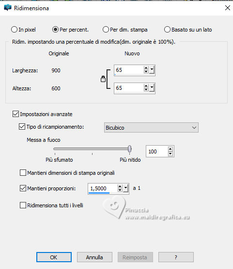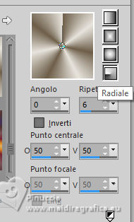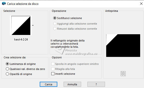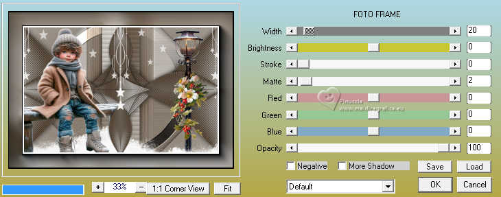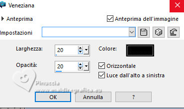 qui puoi trovare qualche risposta ai tuoi dubbi. Se l'argomento che ti interessa non è presente, ti prego di segnalarmelo. Per tradurre il tutorial ho usato PSPX9 e PSPX2020, ma può essere eseguito con ogni versione di PSP. Dalla versione X4, il comando Immagine>Rifletti è stato sostituito con Immagine>Capovolgi in orizzontale, e il comando Immagine>Capovolgi con Immagine>Capovolgi in verticale. Nelle versioni X5 e X6, le funzioni sono state migliorate rendendo disponibile il menu Oggetti. Con la nuova versione X7, sono tornati Rifletti/Capovolgi, ma con nuove differenze Vedi la scheda sull'argomento qui traduzione in francese qui Le vostre versioni qui![]() Occorrente: ![]() (in questa pagina trovi i links ai siti dei creatori di tubes) ![]() in caso di dubbi, ricorda di consultare la mia sezione filtri qui Filters Unlimited 2.0 qui Simple - Top Left Mirror qui Flaming Pear - Flexify 2 qui AP 01 [Innovations] - Lines SilverLining qui AAA Frames - Foto Frame qui I filtri Simple si possono usare da soli o importati in Filters Unlimited (come fare vedi qui) Se un filtro fornito appare con questa icona ![]() ![]() se stai usando altri colori, sperimenta le modalità di miscelatura e opacità più adatte ai tuoi colori Nelle ultime versioni di PSP non c'è il gradiente di primo piano/sfondo (Corel_06_029) Puoi usare i gradienti delle versioni precedenti. Trovi qui i gradienti Corel X. ![]() Metti la selezione nella cartella Selezioni. 1. Imposta il colore di primo piano con #6d5d4c, e il colore di sfondo con #e7e3dd. ![]() Passa il colore di sfondo a Gradiente di primo piano/sfondo, stile Radiale. ![]() 2. Apri una nuova immagine trasparente 900 x 600 pixels. ![]() 3. Selezione>Seleziona tutto. Apri achtergrond-1.jpg ![]() Modifica>Copia. Torna al tuo lavoro e vai a Modifica>Incolla nella selezione. 4. Selezione>Carica/Salva selezione>Carica selezione da disco. Cerca e carica la selezione kerst-4-2-24.PspSelection ![]() Selezione>Innalza selezione a livello. Selezione>Deseleziona. 5. Effetti>Plugins>Simple - Top Left Mirror. ![]() 6. Effetti>Effetti 3D>Sfalsa ombra, colore nero. ![]() 7. Attiva lo strumento Selezione ![]() (non importa il tipo di selezione impostato, perch con la selezione personalizzata si ottiene sempre un rettangolo) clicca sull'icona Selezione personalizzata ![]() e imposta i seguenti settaggi. ![]() Livelli>Nuovo livello raster. Riempi la selezione con il gradiente.8. Regola>Sfocatura>Sfocatura gaussiana - raggio 15. ![]() 9. Effetti>Effetti di trama>Veneziana - colore nero. ![]() Selezione>Deseleziona. 10. Effetti>Effetti 3D>Sfalsa ombra, colore nero. ![]() 11. Apri deco-1 ![]() Modifica>Copia. Torna al tuo lavoro e vai a Modifica>Incolla come nuovo livello. 12. Livelli>Duplica. 13. Effetti>Plugins>Flaming Pear - Flexify 2 ![]() 14. Livelli>Duplica. 15. Immagine>Ruota per gradi - 90 gradi a sinistra. ![]() 16. Immagine>Ridimensiona, al 65%, tutti i livelli non selezionato. ![]() 17. Apri deco-2.png ![]() Modifica>Copia. Torna al tuo lavoro e vai a Modifica>Incolla come nuovo livello. 18. Effetti>Effetti di immagine>Scostamento. ![]() 19. Apri sneeuwrand.png ![]() Modifica>Copia. Torna al tuo lavoro e vai a Modifica>Incolla come nuovo livello. 20. Oggetti>Allinea>Inferiore. ![]() 21. Apri il tube ai--deco-4.png ![]() Modifica>Copia. Torna al tuo lavoro e vai a Modifica>Incolla come nuovo livello. 22. Effetti>Effetti di immagine>Scostamento. ![]() 23. Attiva il livello Copia 2 di Raster 3. ![]() Livelli>Disponi>Porta in alto. 24. Apri deco-3 ![]() Modifica>Copia. Torna al tuo lavoro e vai a Modifica>Incolla come nuovo livello. 25. Oggetti>Allinea>Superiore. ![]() 26. Immagine>Aggiungi bordatura, 2 pixels, simmetriche, colore scuro. Modifica>Copia. 27. Selezione>Seleziona tutto. Immagine>Aggiungi bordatura, 40 pixels, simmetriche, colore chiaro. Selezione>Inverti. Modifica>Incolla nella selezione 28. Regola>Sfocatura>Sfocatura gaussiana - raggio 30. ![]() 29. Effetti>Plugins>AAA Frames - Foto Frame. ![]() 30. Effetti>Plugins>AP 01 [Innovations] - LinesSilverLining ![]() Selezione>Deseleziona. 31. Firma il tuo lavoro su un nuovo livello. Livelli>Unisci>Unisci tutto e salva in formato jpg. ![]() ![]() Se hai problemi o dubbi, o trovi un link non funzionante, o anche soltanto per un saluto, scrivimi. |