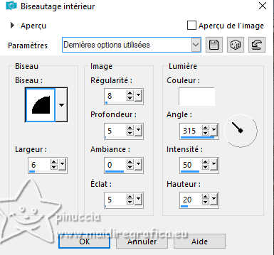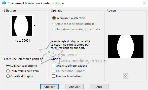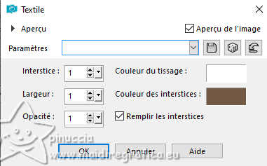 Pour traduire ce tutoriel j'ai utilisé PSPX9 et PSP2020, mais il peut également être exécuté avec les autres versions. Suivant la version utilisée, vous pouvez obtenir des résultats différents. Depuis la version X4, la fonction Image>Miroir a été remplacée par Image>Renverser horizontalement, et Image>Renverser avec Image>Renverser verticalement. Dans les versions X5 et X6, les fonctions ont été améliorées par la mise à disposition du menu Objets. Dans la nouvelle version X7, nous avons à nouveau Miroir/Renverser, mais avec autres différences. Voir plus les détails à ce sujet ici Certaines dénominations ont changées entre les versions de PSP. Les plus frequentes dénominations utilisées: ![]() Traduction en italien ici Vos versions ici![]() Nécessaire pour réaliser ce tutoriel: ![]() (les liens des sites des tubeuses ici) ![]() consulter, si nécessaire, ma section de filtre ici Filters Unlimited 2.0 ici Alien Skin Eye Candy 5 Impact - Glass ici AAA Frames - Foto Frame ici Texturize - Wood 1 (à importer dans Unlimited) ici ![]() ![]() Si vous voulez utiliser vos propres couleurs, n'hésitez pas à changer le mode et l'opacité des calques ![]() Placer la sélection dans le dossier Sélections 1. Placer en avant plan la couleur #725945, et en arrière plan la couleur #ffffff. ![]() 2. Ouvrir une nouvelle image transparente 900 x 600 pixels. ![]() Remplir l'image transparente avec la couleur #ffffff.3. Sélections>Sélectionner tout. Ouvrir b96c ![]() Édition>Copier. Revenir sur votre travail et Édition>Coller dans la sélection. Sélections>Désélectionner tout. 4. Effets>Effets d'image>Mosaïque sans jointures, par défaut. ![]() 5. Effets>Modules Externes>Mehdi - Sorting Tiles. ![]() 6. Effets>Modules Externes>Filters Unlimited 2.0 - Texturize - Wood1. ![]() 7. Calques>Nouveau calque raster. 8. Sélections>Charger/Enregistrer une sélection>Charger à partir du disque. Chercher et charger la sélection kerst5-24/sel.jpg ![]() Remplir la sélection avec la couleur blanche #ffffff.9. Sélections>Modifier>Contracter - 10 pixels. Presser CANC sur le clavier ![]() Sélections>Désélectionner tout. 10. Effets>Effets 3D>Biseautage intérieur. ![]() 11. Effets>Effets de textures>Textile couleur du tissage: blanc couleur des interstices: couleur foncée. ![]() 12. Activer l'outil Baguette Magique , tolérance et progressivité 0,![]() et cliquer dans le cadre pour le sélectionner. 13. Calques>Nouveau calque raster. Édition>Coller dans la sélection - l'image b96c est toujours en mémoire. 14. Effets>Modules Externes>Alien Skin Eye Candy 5 Impact - Glass - preset Clear. ![]() Sélections>Désélectionner tout. 15. Ouvrir deco-kerst-67.png ![]() Édition>Copier. Revenir sur votre travail et Édition>Coller comme nouveau calque. Déplacer le tube en bas à droite.![]() 16. Effets>Effets 3D>Ombre portée, comme précédemment. ![]() 17. Ouvrir kerst-f742.png ![]() Édition>Copier. Revenir sur votre travail et Édition>Coller comme nouveau calque. Déplacer le tube en haut à gauche.18. Effets>Effets 3D>Ombre portée, comme précédemment. ![]() 19. Ouvrir kerst-bd.png ![]() Édition>Copier. Revenir sur votre travail et Édition>Coller comme nouveau calque. Déplacer le tube en bas à gauche.![]() 20. Effets>Effets 3D>Ombre portée, comme précédemment. ![]() 21. Image>Ajouter des bordures, 2 pixels, symétrique, couleur foncée. Sélections>Sélectionner tout. Édition>Copier 22. Image>Ajouter des bordures, 40 pixels, symétrique, couleur claire. Sélections>Inverser. Édition>Coller dans la sélection 23. Réglage>Flou>Flou gaussien - rayon 30. ![]() 24. Effets>Effets de textures>Textile, comme précédemment. ![]() 25. Effets>Modules Externes>AAA Frames - Foto Frame. ![]() Sélections>Désélectionner tout. 26. Signer votre travail sur un nouveau calque. Calques>Fusionner>tous et enregistrer en jpg. ![]() ![]() Si vous avez des problèmes, ou des doutes, ou vous trouvez un link modifié, ou seulement pour me dire que ce tutoriel vous a plu, vous pouvez m'écrire. |