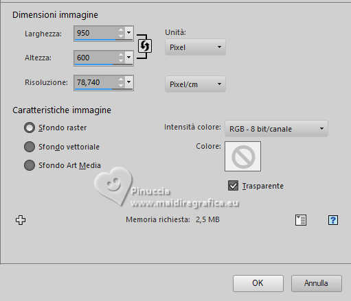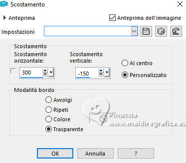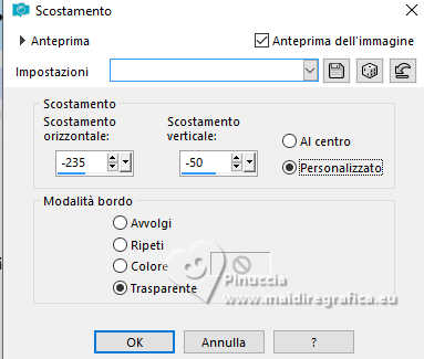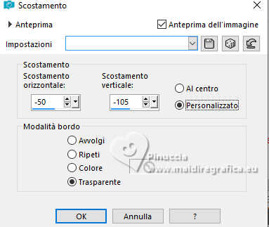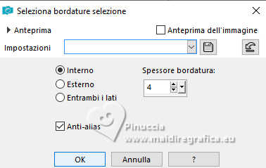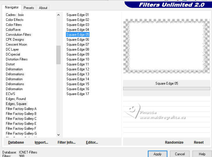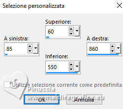 qui puoi trovare qualche risposta ai tuoi dubbi. Se l'argomento che ti interessa non è presente, ti prego di segnalarmelo. Per tradurre il tutorial ho usato PSPX9 e PSPX2020, ma può essere eseguito con ogni versione di PSP. Dalla versione X4, il comando Immagine>Rifletti è stato sostituito con Immagine>Capovolgi in orizzontale, e il comando Immagine>Capovolgi con Immagine>Capovolgi in verticale. Nelle versioni X5 e X6, le funzioni sono state migliorate rendendo disponibile il menu Oggetti. Con la nuova versione X7, sono tornati Rifletti/Capovolgi, ma con nuove differenze Vedi la scheda sull'argomento qui traduzione in francese qui Le vostre versioni qui![]() Occorrente: ![]() (in questa pagina trovi i links ai siti dei creatori di tubes) ![]() in caso di dubbi, ricorda di consultare la mia sezione filtri qui Filters Unlimited 2.0 qui ![]() ![]() se stai usando altri colori, sperimenta le modalità di miscelatura e opacità più adatte ai tuoi colori ![]() 1. Imposta il colore di primo piano con il colore #617188, e il colore di sfondo con il colore #ffffff. ![]() Apri una nuova immagine trasparente 950 x 600 pixels. ![]() 2. Selezione> tutto. Apri sneeuw foto.jpg ![]() Modifica>Copia. Torna al tuo lavoro e vai a Modifica>Incolla nella selezione. Selezione>Deseleziona 4. Effetti>Effetti di immagine>Motivo unico, con i settaggi standard. ![]() 5. Regola>Sfocatura>Sfocatura gaussiana - raggio 25. ![]() 6. Livelli>Nuovo livello raster. Riempi il livello con il colore bianco di sfondo #ffffff.7. Effetti>Plugins>Filters Unlimited 2.0 - Edge Square - Square Edge 05. ![]() 8. Effetti>Effetti 3D>Sfalsa ombra, colore nero. ![]() 9. Attiva lo strumento Selezione ![]() (non importa il tipo di selezione impostato, perch con la selezione personalizzata si ottiene sempre un rettangolo) clicca sull'icona Selezione personalizzata ![]() e imposta i seguenti settaggi. ![]() 10. Livelli>Nuovo livello raster. Selezione>Modifica>Seleziona bordature selezione. ![]() Riempi la selezione con il colore di primo piano #617188.11. Effetti>Effetti 3D>Smusso a incasso. ![]() Selezione>Deseleziona. 12. Apri deco-1 ![]() Modifica>Copia. Torna al tuo lavoro e vai a Modifica>Incolla come nuovo livello. Effetti>Effetti di immagine>Scostamento ![]() 13. Attiva il livello Raster 3. Attiva lo strumento Bacchetta magica , sfumatura e tolleranza 0e clicca al centro della cornice per selezionarla. 14. Attiva nuovamente l'immagine sneeuw foto e vai a Modifica>Copia. Livelli>Nuovo livello raster. Torna al tuo lavoro e vai a Modifica>Incolla nella selezione. Selezione>Deseleziona. 15. Apri deco-2 ![]() Modifica>Copia. Torna al tuo lavoro e vai a Modifica>Incolla come nuovo livello. Livelli>Disponi>Porta in alto. Effetti>Effetti di immagine>Scostamento ![]() 16. Apri Deco-3 ![]() Modifica>Copia. Torna al tuo lavoro e vai a Modifica>Incolla come nuovo livello. Effetti>Effetti di immagine>Scostamento ![]() 17. Apri Deco-4 ![]() Modifica>Copia. Torna al tuo lavoro e vai a Modifica>Incolla come nuovo livello. Effetti>Effetti di immagine>Scostamento ![]() 18. Immagine>Aggiungi bordatura, 6 pixels, simmetriche, colore #ffffff. Immagine>Aggiungi bordatura, 1 pixel, simmetriche, colore #000000. Firma il tuo lavoro su un nuovo livello. Livelli>Unisci>Unisci tutto e salva in formato jpg. ![]() ![]() Se hai problemi o dubbi, o trovi un link non funzionante, o anche soltanto per un saluto, scrivimi. |