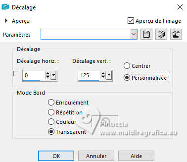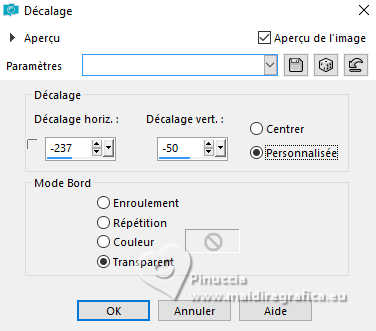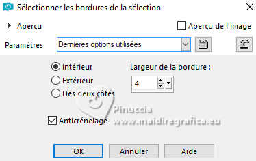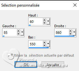 Pour traduire ce tutoriel j'ai utilisé PSPX9 et PSP2020, mais il peut également être exécuté avec les autres versions. Suivant la version utilisée, vous pouvez obtenir des résultats différents. Depuis la version X4, la fonction Image>Miroir a été remplacée par Image>Renverser horizontalement, et Image>Renverser avec Image>Renverser verticalement. Dans les versions X5 et X6, les fonctions ont été améliorées par la mise à disposition du menu Objets. Dans la nouvelle version X7, nous avons à nouveau Miroir/Renverser, mais avec autres différences. Voir plus les détails à ce sujet ici Certaines dénominations ont changées entre les versions de PSP. Les plus frequentes dénominations utilisées: ![]() Traduction en italien ici Vos versions ici![]() Nécessaire pour réaliser ce tutoriel: ![]() (les liens des sites des tubeuses ici) ![]() consulter, si nécessaire, ma section de filtre ici Filters Unlimited 2.0 ici ![]() ![]() Si vous voulez utiliser vos propres couleurs, n'hésitez pas à changer le mode et l'opacité des calques ![]() 1. Placer en avant plan la couleur #617188, et en arrière plan la couleur #ffffff. ![]() Ouvrir une nouvelle image transparente 950 x 600 pixels. ![]() 2. Sélections>Sélectionner tout. Ouvrir sneeuw foto.jpg ![]() Édition>Copier. Revenir sur votre travail et Édition>Coller dans la sélection. Sélections>Désélectionner tout. 4. Effets>Effets d'image>Mosaïque sans jointures, par défaut. ![]() 5. Réglage>Flou>Flou gaussien - radius 25. ![]() 6. Calques>Nouveau calque raster. Remplir le calque avec la couleur blanche d'arrière plan #ffffff.7. Effets>Modules Externes>Filters Unlimited 2.0 - Edge Square - Square Edge 05. ![]() 8. Effets>Effets 3D>Ombre portée, couleur noire. ![]() 9. Activer l'outil Sélection ![]() (peu importe le type de sélection, parce que avec la sélection personnalisée vous obtenez toujours un rectangle), cliquer sur Sélection personnalisée ![]() et setter ces paramètres. ![]() 10. Calques>Nouveau calque raster. Sélections>Modifier>Sélectionner les bordures de la sélection. ![]() Remplir la sélection avec la couleur d'avant plan #617188.11. Effets>Effets 3D>Biseautage intérieur. ![]() Sélections>Désélectionner tout. 12. Ouvrir deco-1 ![]() Édition>Copier. Revenir sur votre travail et Édition>Coller comme nouveau calque. Effets>Effets d'image>Décalage. ![]() 13. Vous positionner sur le calque Raster 3. Activer l'outil Baguette magique , tolérance et progressivité 0,et cliquer au centre du cadre pour le sélectionner. 14. Activer à nouveau l'image sneeuw foto et Édition>Copier. Calques>Nouveau calque raster. Revenir sur votre travail et Édition>Coller dans la sélection. Sélections>Désélectionner tout. 15. Ouvrir deco-2 ![]() Édition>Copier. Revenir sur votre travail et Édition>Coller comme nouveau calque. Calques>Agencer>Placer en haut de la pile. Effets>Effets d'image>Décalage. ![]() 16. Ouvrir Deco-3 ![]() Édition>Copier. Revenir sur votre travail et Édition>Coller comme nouveau calque. Effets>Effets d'image>Décalage. ![]() 17. Ouvrir Deco-4 ![]() Édition>Copier. Revenir sur votre travail et Édition>Coller comme nouveau calque. Effets>Effets d'image>Décalage. ![]() 18. Image>Ajouter des bordures, 6 pixels, simétrique, couleur #ffffff. Image>Ajouter des bordures, 1 pixel, symétrique, couleur #000000. Signer votre travail sur un nouveau calque. Calques>Fusionner>Tous et enregistrer en jpg. ![]() ![]() Si vous avez des problèmes, ou des doutes, ou vous trouvez un link modifié, ou seulement pour me dire que ce tutoriel vous a plu, vous pouvez m'écrire. |