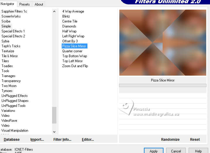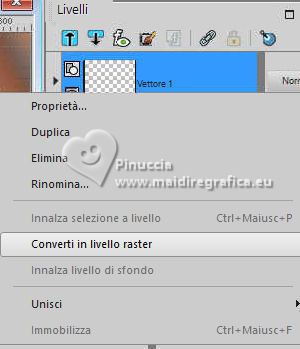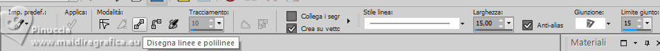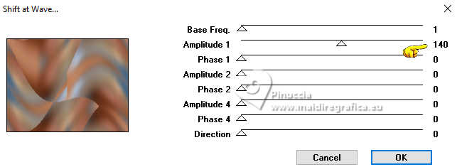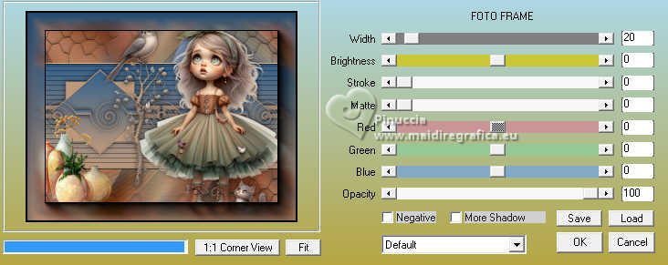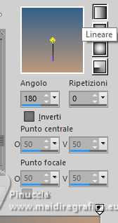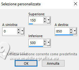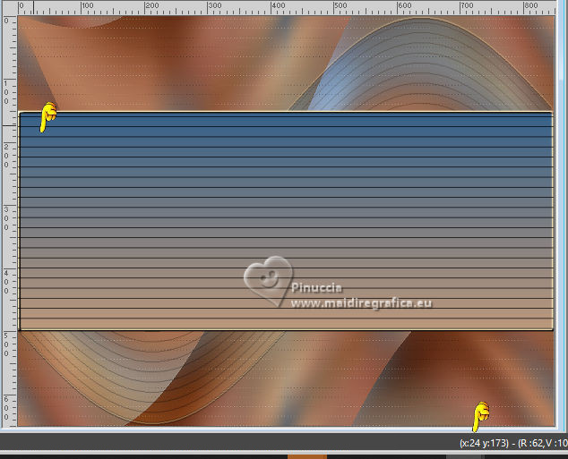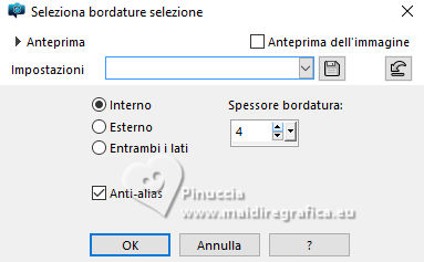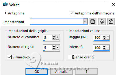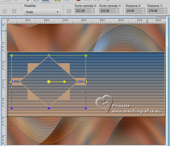 qui puoi trovare qualche risposta ai tuoi dubbi. Se l'argomento che ti interessa non è presente, ti prego di segnalarmelo. Per tradurre il tutorial ho usato PSPX8 e PSPX9, ma può essere eseguito con ogni versione di PSP. Dalla versione X4, il comando Immagine>Rifletti è stato sostituito con Immagine>Capovolgi in orizzontale, e il comando Immagine>Capovolgi con Immagine>Capovolgi in verticale. Nelle versioni X5 e X6, le funzioni sono state migliorate rendendo disponibile il menu Oggetti. Con la nuova versione X7, sono tornati Rifletti/Capovolgi, ma con nuove differenze Vedi la scheda sull'argomento qui traduzione in francese qui Le vostre versioni quiOccorrente: ![]() Per il tube grazie Renée (in questa pagina trovi i links ai siti dei creatori di tubes) Filtri: in caso di dubbi, ricorda di consultare la mia sezione filtri qui Filters Unlimited 2.0 qui Simple - Pizza Slice Mirror qui Mura's Seamless - Shift at Wave qui L&K's - L&K's Zitah qui Richard Rosenman - Scanlines qui AAA Frames - Foto Frame qui I filtri Factory Gallery si possono usare da soli o importati in Filters Unlimited (come fare vedi qui) Se un filtro fornito appare con questa icona ![]() se stai usando altri colori, sperimenta le modalità di miscelatura e opacità più adatte ai tuoi colori Nelle ultime versioni di PSP non c'è il gradiente di primo piano/sfondo (Corel_06_029) Puoi usare i gradienti delle versioni precedenti. Trovi qui i gradienti Corel X. ![]() Metti le forme predefinite McHT Shapes01 nella cartella Forme predefinite Imposta il colore di primo piano con #356089, e il colore di sfondo con #bd997c. ![]() Passa il colore di primo piano a Gradiente di primo piano/sfondo, stile Lineare. ![]() 1. Apri una nuova immagine trasparente 850 x 650 pixels. ![]() Riempi l'immagine trasparente con il gradiente.2. Selezione>Seleziona tutto. Apri il tube airam_ine-serie-554501 ![]() Modifica>Copia. Torna al tuo lavoro e vai a Modifica>Incolla nella selezione. Selezione>Deseleziona. 3. Effetti>Effetti di immagine>Motivo unico, con i settaggi standard. ![]() 4. Regola>Sfocatura>Sfocatura gaussiana - raggio 25. ![]() 5. Effetti>Plugins>Filters Unlimited 2.0. - Simple - Pizza Slice Mirror. ![]() 6. Effetti>Plugins>Mura's Seamless - Shift at Wave. ![]() 7. Effetti>Effetti di bordo>Aumenta. 8. Effetti>Plugins>L&K's - L&K's Zitah ![]() Regola>Messa a fuoco>Metti a fuoco. 9. Attiva lo strumento Selezione ![]() (non importa il tipo di selezione impostato, perchè con la selezione personalizzata si ottiene sempre un rettangolo) clicca sull'icona Selezione personalizzata ![]() e imposta i seguenti settaggi. ![]() 10. Livelli>Nuovo livello raster. Riempi il livello con il gradiente.Selezione>Modifica>Seleziona bordature selezione. ![]() 11. Livelli>Nuovo livello raster. Riempi il livello con il colore di sfondo.Effetti>Effetti 3D>Smusso a incasso. ![]() 12. Selezione>Deseleziona. Livelli>Unisci>Unisci giù. 13. Effetti>Plugins>Richard Rosenman - Scanlines ![]() 14. Livelli>Duplica. Effetti>Plugins>Mura's Seamless - Shift at Wave. ![]() Livelli>Disponi>Sposta giù. 15. Cambia la modalità di miscelatura di questo livello in Luce netta, e abbassa l'opacità al 36%. 16. Attiva nuovamente il livello superiore. Attiva lo strumento Forma predefinita ![]() Cerca e seleziona la forma Shape 23 con i seguenti settaggi ![]() attenzione, purtroppo le forme non sono in ordine alfabetico, per questo ti sembrerà che la forma non ci sia. E' necessario scorrere attentamente tutte le forme per trovarla. Punta il mouse al punto orizzontale X: 24 ![]() e traccia la forma fino al punto verticale Y: 249 ![]() Clicca con il tasto destro del mouse sul livello vettore e Converti in livello Raster ![]() Tasto K per attivare lo strumento Puntatore ![]() Posizione X: 24,00 - Posizione Y: 170,00. ![]() Tasto M per deselezionare lo strumento. 17. Attiva lo strumento Bacchetta magica ![]() ![]() Clicca al centro della forma per selezionarla. ![]() Riempi la selezione con il gradiente.Selezione>Deseleziona. 18. Livelli>Duplica. Immagine>Rifletti>Rifletti orizzontalmente. Livelli>Unisci>Unisci giù. Effetti>Effetti 3D>Sfalsa ombra, colore nero. ![]() 19. Attiva lo strumento Penna ![]() Disegna linee e polilinee, crea su vettore, stile linea Pieno, larghezza 12/15 (per me 15) br> ![]() Tieni premuto il tasto shift (maiuscola) e traccia una linea orizzonale al centro ![]() Tasto destro del mouse sul livello vettore e Converti in livello Raster . ![]() 20. Effetti>Effetti di distorsione>Spirali. ![]() Effetti>Effetti 3D>Sfalsa ombra, con i settaggi precedenti. 21. Regola>Messa a fuoco>Metti a fuoco. (eventualmente per accentuare il risultato: Livelli>Duplica. Livelli>Unisci>Unisci giù) Oggetti>Allinea>Centra nella tela. 22. Apri il tube deco-1 ![]() Modifica>Copia. Torna al tuo lavoro e vai a Modifica>Incolla come nuovo livello. 23. Apri il tube sier-pot ![]() Modifica>Copia. Torna al tuo lavoro e vai a Modifica>Incolla come nuovo livello. Immagine>Ridimensiona, all'80%, tutti i livelli non selezionato. Sposta il tube in basso a sinistra.24. Apri il tube Renee-Tubes-Cage-aux-oiseaux-Image8 ![]() Modifica>Copia. Torna al tuo lavoro e vai a Modifica>Incolla come nuovo livello. Immagine>Ridimensiona, al 65%, tutti i livelli non selezionato. Immagine>Rifletti>Rifletti orizzontalmente. Sposta il tube a destraEffetti>Effetti 3D>Sfalsa ombra, colore nero. ![]() 25. Selezione>Seleziona tutto. Immagine>Aggiungi bordatura, 20 pixels, simmetriche, colore bianco. Selezione>Inverti. Riempi con il gradiente.Selezione>Deseleziona. 26. Effetti>Plugins>AAA Frames - Foto Frame. ![]() 27. Firma il tuo lavoro su un nuovo livello. Livelli>Unisci>Unisci tutto e salva in formato jpg. Per i tubes di questo esempio grazie Tatty Things ![]() ![]() Se hai problemi o dubbi, o trovi un link non funzionante, o anche soltanto per un saluto, scrivimi. |