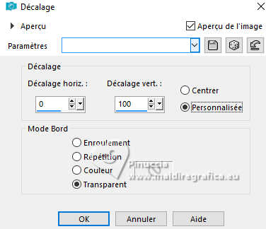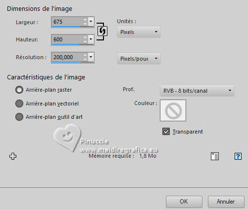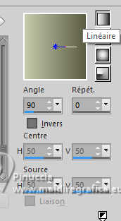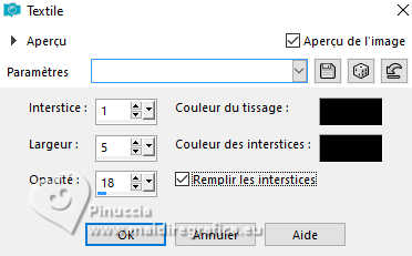 Pour traduire ce tutoriel j'ai utilisé PSPX9, mais il peut également être exécuté avec les autres versions. Suivant la version utilisée, vous pouvez obtenir des résultats différents. Depuis la version X4, la fonction Image>Miroir a été remplacée par Image>Renverser horizontalement, et Image>Renverser avec Image>Renverser verticalement. Dans les versions X5 et X6, les fonctions ont été améliorées par la mise à disposition du menu Objets. Dans la nouvelle version X7, nous avons à nouveau Miroir/Renverser, mais avec autres différences. Voir plus les détails à ce sujet ici Certaines dénominations ont changées entre les versions de PSP. Les plus frequentes dénominations utilisées: ![]() Traduction en italien ici Vos versions iciNécessaire pour réaliser ce tutoriel: ![]() (les liens des sites des tubeuses ici) Modules Externes consulter, si nécessaire, ma section de filtre ici Filters Unlimited 2.0 ici VM Extravaganza - Ray Transmission ici Filtres VM Extravaganza peuvent être utilisés seuls ou importés dans Filters Unlimited. voir comment le faire ici). Si un filtre est fourni avec cette icône, ![]() Si vous voulez utiliser vos propres couleurs, n'hésitez pas à changer le mode et l'opacité des calques ![]() Placer en avant plan la couleur #c6cbad, et en arrière plan la couleur #5b5c43. ![]() Préparer en avant plan un dégradé de premier plan/arrière plan, Style Linéaire. ![]() Pour commencer, placer en avant plan la Couleur. (finalement, le dégradé ne sera pas utilisé) 1. Ouvrir une nouvelle image transparente 675 x 600 pixels. ![]() Remplir l'image transparente avec la couleur claire d'avant plan.Calques>Dupliquer. 2. Effets>Modules Externes>Filters Unlimited 2.0 - VM Extravaganza, Ray Transmission, par défaut. ![]() 3. Effets>Modules Externes>Filters Unlimited 2.0 - Paper textures - Canvas fine. ![]() 4. Réduire l'opacité de ce calque à 42%. 5. Ouvrir deco-1 ![]() Édition>Copier. Revenir sur votre travail et Édition>Coller comme nouveau calque. 6. Activer l'outil Baguette magique ![]() ![]() et cliquer dans le cercles en haut à droite et en bas à gauche pour les sélectionner. ![]() Calques>Nouveau calque raster. Remplir le calque avec la couleur claire.Effets>Effets de textures>Textile - les deux couleurs: noir. ![]() Effets>Effets 3D>Ombre portée, couleur noire. ![]() Sélections>Désélectionner tout. 7. Vous positionner sur le calque Raster 2 (le tube deco-1) Activer à nouveau l'outil Baguette Magique ![]() ![]() et cliquer dans les cercles en haut à gauche et en bas à droite pour les sélectionner. ![]() Sélections>Modifier>Contracter - 5 pixels. Effets>Effets de textures>Stores, couleur claire d'avant plan. ![]() Effets>Effets 3D>Ombre portée, couleur noire. ![]() Sélections>Désélectionner tout. 8. Vous positionner sur le calque du haut de la pile. Ouvrir Deco-2 ![]() Édition>Copier. Revenir sur votre travail et Édition>Coller comme nouveau calque. Effets>Effets d'image>Décalage. ![]() 9. Ouvrir pintereart-b0e1 ![]() Édition>Copier. Revenir sur votre travail et Édition>Coller comme nouveau calque. Objets>Aligner>Bas. Effets>Effets 3D>Ombre portée, couleur noire. ![]() 10. Image>Ajouter des bordures, 10 pixels, symétrique, couleur foncée. Signer votre travail sur un nouveau calque. Calques>Fusionner>Tous et enregistrer en jpg. Pour le tube de cette version merci Renée ![]() ![]() Si vous avez des problèmes, ou des doutes, ou vous trouvez un link modifié, ou seulement pour me dire que ce tutoriel vous a plu, vous pouvez m'écrire. |