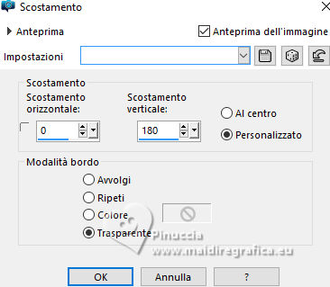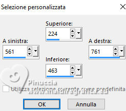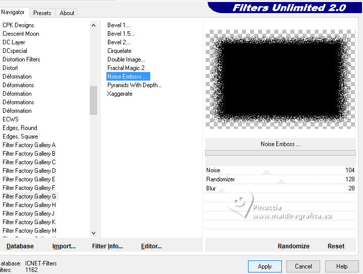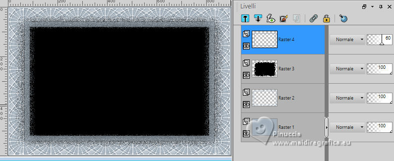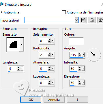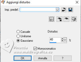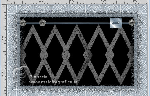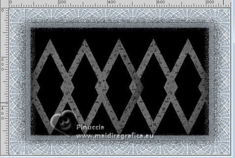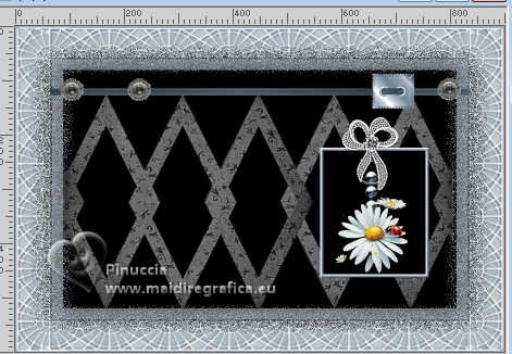 qui puoi trovare qualche risposta ai tuoi dubbi. Se l'argomento che ti interessa non è presente, ti prego di segnalarmelo. Per tradurre il tutorial ho usato PSPX9, ma può essere eseguito con ogni versione di PSP. Dalla versione X4, il comando Immagine>Rifletti è stato sostituito con Immagine>Capovolgi in orizzontale, e il comando Immagine>Capovolgi con Immagine>Capovolgi in verticale. Nelle versioni X5 e X6, le funzioni sono state migliorate rendendo disponibile il menu Oggetti. Con la nuova versione X7, sono tornati Rifletti/Capovolgi, ma con nuove differenze Vedi la scheda sull'argomento qui traduzione in francese qui Le vostre versioni quiOccorrente: ![]() (in questa pagina trovi i links ai siti dei creatori di tubes) Filtri: in caso di dubbi, ricorda di consultare la mia sezione filtri qui Filters Unlimited 2.0 qui Filter Factory Gallery G - Noise Emboss qui I filtri Factory Gallery si possono usare da soli o importati in Filters Unlimited (come fare vedi qui) Se un filtro fornito appare con questa icona ![]() se stai usando altri colori, sperimenta le modalità di miscelatura e opacità più adatte ai tuoi colori ![]() Imposta il colore di primo piano con #a3b0bb, e il colore di sfondo con #000000 ![]() 1. Apri una nuova immagine trasparente 900 x 600 pixels. ![]() Riempi l'immagine trasparente con il colore di primo piano #a3b0bb.2. Livelli>Nuovo livello raster. Selezione>Seleziona tutto. 3. Apri il tube Kantenframe ![]() Modifica>Copia. Torna al tuo lavoro e vai a Modifica>Incolla nella selezione. Selezione>Deseleziona. 4. Attiva lo strumento Bacchetta magica , sfumatura e tolleranza 0,![]() Clicca al centro della cornice per selezionarla. 5. Livelli>Nuovo livello raster. Riempi il livello con il colore nero di sfondo.6. Livelli>Nuovo livello raster. Riempi il livello con il colore di primo piano #a3b0bb.7. Selezione>Modifica>Contrai - 20 pixels. Premi sulla tastiera il tasto CANC ![]() Abbassa l'opacità di questo livello al 60%. Selezione>Deseleziona. 8. Attiva il livello sottostante (il livello nero) Effetti>Plugins>Filters Unlimited 2.0 - Filter Factory Gallery G - Noise Emboss. ![]() 9. Regola>Aggiungi/Rimuovi disturbo>Aggiungi disturbo. ![]() Attiva il livello superiore. ![]() 10. Apri il tube deco-1-12-2025 ![]() Modifica>Copia. Torna al tuo lavoro e vai a Modifica>Incolla come nuovo livello. Posiziona correttamente il tube.![]() 11. Apri il tube Band ![]() Modifica>Copia. Torna al tuo lavoro e vai a Modifica>Incolla come nuovo livello. 12. Effetti>Effetti di immagine>Scostamento. ![]() ![]() 13. Livelli>Nuovo livello raster. Attiva lo strumento Selezione ![]() (non importa il tipo di selezione impostato, perchè con la selezione personalizzata si ottiene sempre un rettangolo) clicca sull'icona Selezione personalizzata ![]() e imposta i seguenti settaggi. ![]() Riempi la selezione con il colore nero.Mantieni selezionato. 14. Livelli>Nuovo livello raster. Riempi con il colore chiaro di primo piano.Selezione>Modifica>Contrai - 6 pixels. Premi sulla tastiera il tasto CANC ![]() Selezione>Deseleziona. 15. Effetti>Effetti 3D>Smusso a incasso. ![]() 16. Apri deco-2 ![]() Modifica>Copia. Torna al tuo lavoro e vai a Modifica>Incolla come nuovo livello. Posiziona il tube sulla cornice.![]() 17. Apri il tube ai56nm89 ![]() Modifica>Copia. Torna al tuo lavoro e vai a Modifica>Incolla come nuovo livello. Sposta il tube nell'angolo in basso a sinistra.18. Se vuoi, decora il lavoro a tuo piacimento. Seguendo la versione finale di Mieke, ho usato delle margherite sullo sfondo nero della cornice e sulla banda in alto ![]() ho aggiunto nel materiale le due margherite che ho utilizzato per il mio esempio 19. Immagine>Aggiungi bordatura, 10 pixels, simmetriche, colore nero. 20. Firma il tuo lavoro su un nuovo livello. Livelli>Unisci>Unisci tutto e salva in formato jpg. Per i tubes di questo esempio grazie Tatty Things ![]() ![]() Se hai problemi o dubbi, o trovi un link non funzionante, o anche soltanto per un saluto, scrivimi. |