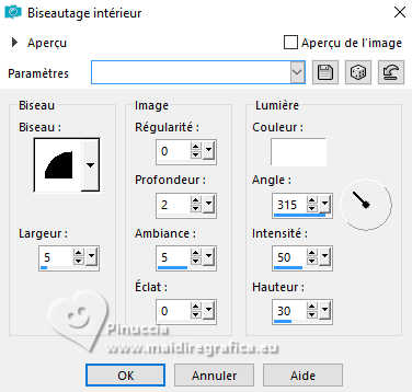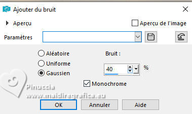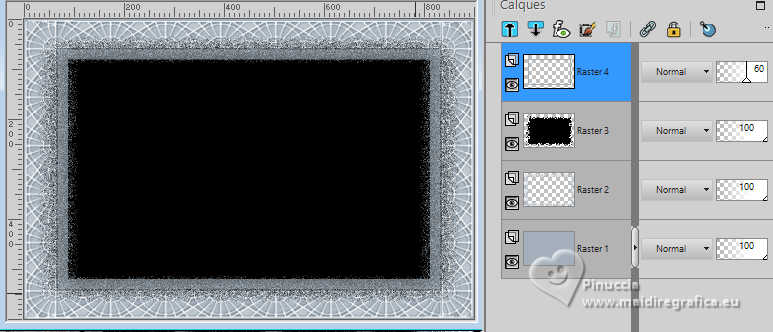 Pour traduire ce tutoriel j'ai utilisé PSPX9, mais il peut également être exécuté avec les autres versions. Suivant la version utilisée, vous pouvez obtenir des résultats différents. Depuis la version X4, la fonction Image>Miroir a été remplacée par Image>Renverser horizontalement, et Image>Renverser avec Image>Renverser verticalement. Dans les versions X5 et X6, les fonctions ont été améliorées par la mise à disposition du menu Objets. Dans la nouvelle version X7, nous avons à nouveau Miroir/Renverser, mais avec autres différences. Voir plus les détails à ce sujet ici Certaines dénominations ont changées entre les versions de PSP. Les plus frequentes dénominations utilisées: ![]() Traduction en italien ici Vos versions iciNécessaire pour réaliser ce tutoriel: ![]() (les liens des sites des tubeuses ici) Modules Externes consulter, si nécessaire, ma section de filtre ici Filters Unlimited 2.0 ici Filter Factory Gallery G - Noise Emboss ici Filtres Factory Gallery peuvent être utilisés seuls ou importés dans Filters Unlimited. voir comment le faire ici). Si un filtre est fourni avec cette icône, ![]() Si vous voulez utiliser vos propres couleurs, n'hésitez pas à changer le mode et l'opacité des calques ![]() Placer en avant plan la couleur #a3b0bb, et en arrière plan la couleur #000000 ![]() 1. Ouvrir une nouvelle image transparente 900 x 600 pixels. ![]() Remplir l'image transparent avec la couleur d'avant plan.2. Calques>Nouveau calque raster. Sélections>Sélectionner tout. 3. Ouvrir le tube Kantenframe ![]() Édition>Copier. Revenir sur votre travail et Édition>Coller dans la sélection. Sélections>Désélectionner tout. 4. Activer l'outil Baguette magique , tolérance et progressivité 0,![]() Cliquer au centre du cadre pour le sélectionner. 5. Calques>Nouveau calque raster. Remplir le calque avec la couleur noire d'arrière plan.6. Calques>Nouveau calque raster. Remplir le calque avec la couleur d'avant plan #a3b0bb.7. Sélections>Modifier>Contracter - 20 pixels. Prsser CANC sur le clavier ![]() Réduire l'opacité de ce calque à 60%. Sélections>Désélectionner tout. 8. Vous positionner sur le calque de dessous (le calque noir). Effets>Modules Externes>Filters Unlimited 2.0 - Filter Factory Gallery G - Noise Emboss. ![]() 9. Réglage>Ajouter/Supprimer du bruit>Ajouter du bruit. ![]() Vous positionner sur le calque du haut de la pile. ![]() 10. Ouvrir le tube deco-1-12-2025 ![]() Édition>Copier. Revenir sur votre travail et Édition>Coller comme nouveau calque. Positionner bien le tube.![]() 11. Ouvrir le tube Band ![]() Édition>Copier. Revenir sur votre travail et Édition>Coller comme nouveau calque. 12. Effets>Effets d'image>Décalage. ![]() ![]() 13. Calques>Nouveau calque raster. Activer l'outil Sélection ![]() (peu importe le type de sélection, parce que avec la sélection personnalisée vous obtenez toujours un rectangle), cliquer sur Sélection personnalisée ![]() et setter ces paramètres. ![]() Remplir la sélection avec la couleur noire.Garder sélectionné. 14. Calques>Nouveau calque raster. Remplir avec la couleur claire d'avant plan.Sélections>Modifier>Contracter - 6 pixels. Presser CANC sur le clavier ![]() Sélections>Désélectionner tout. 15. Effets>Effets 3D>Biseautage intérieur. ![]() 16. Ouvrir deco-2 ![]() Édition>Copier. Revenir sur votre travail et Édition>Coller comme nouveau calque. Positionner le tube sur le cadre.![]() 17. Ouvrir le tube ai56nm89 ![]() Édition>Copier. Revenir sur votre travail et Édition>Coller comme nouveau calque. Déplacer le tube dans le coin en bas à gauche.18. Si vous voulez, décorez le travail à votre goût. Suite à la version finale de Mieke, j'ai utilisé des marguerites sur le fond noir du cadre et sur la bande ![]() J'ai ajouté les deux marguerites utilisées pour mon exemple dans le matériel (2 calques) 19. Image>Ajouter des bordures, 10 pixels, symétrique, couleur noire. 20. Signer votre travail sur un nouveau calque. Calques>Fusionner>Tous et enregistrer en jpg. Pour les tubes de cette version merci Tatty Things ![]() ![]() Si vous avez des problèmes, ou des doutes, ou vous trouvez un link modifié, ou seulement pour me dire que ce tutoriel vous a plu, vous pouvez m'écrire. |
